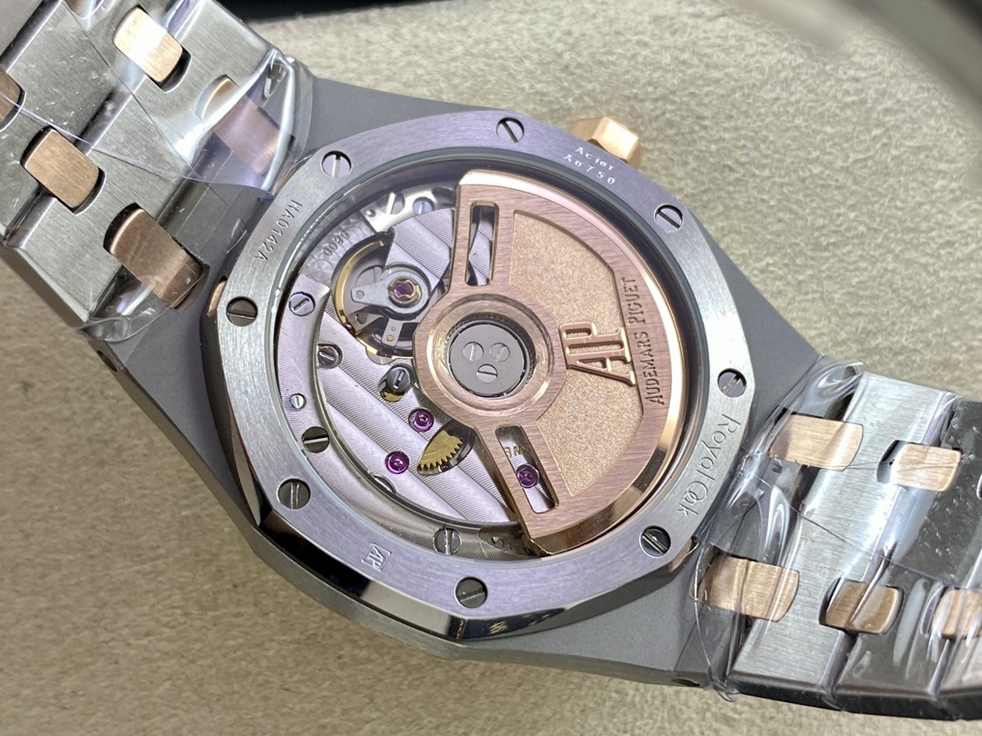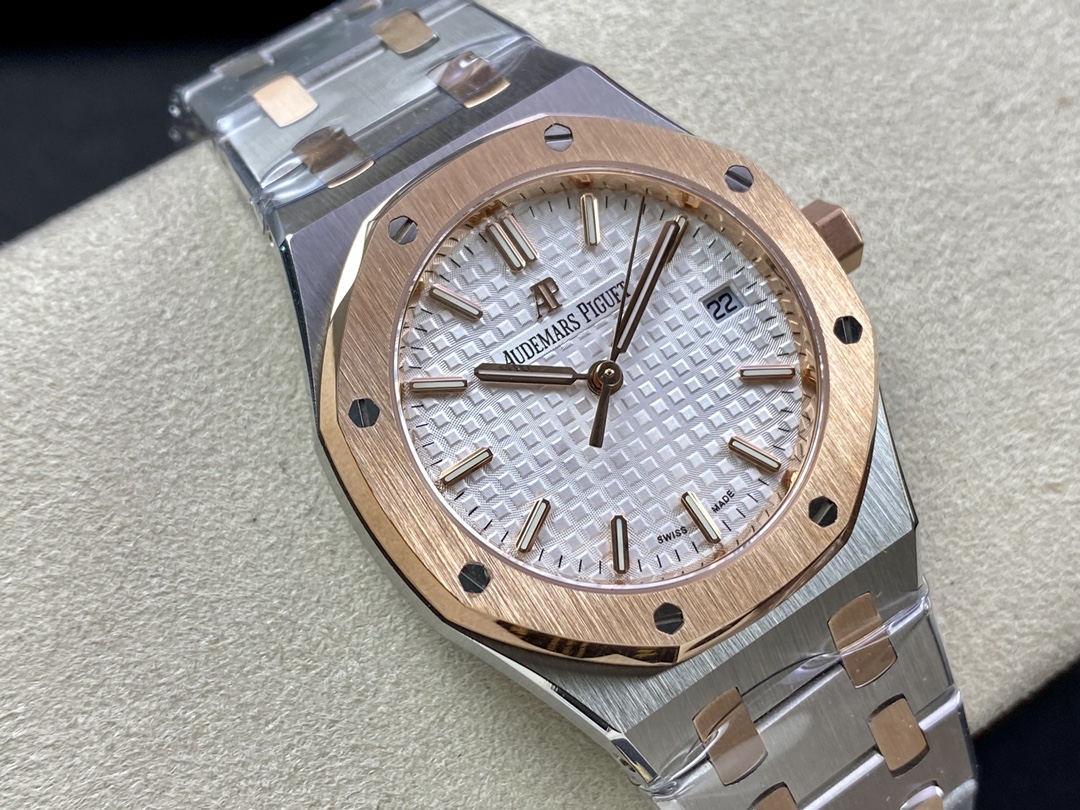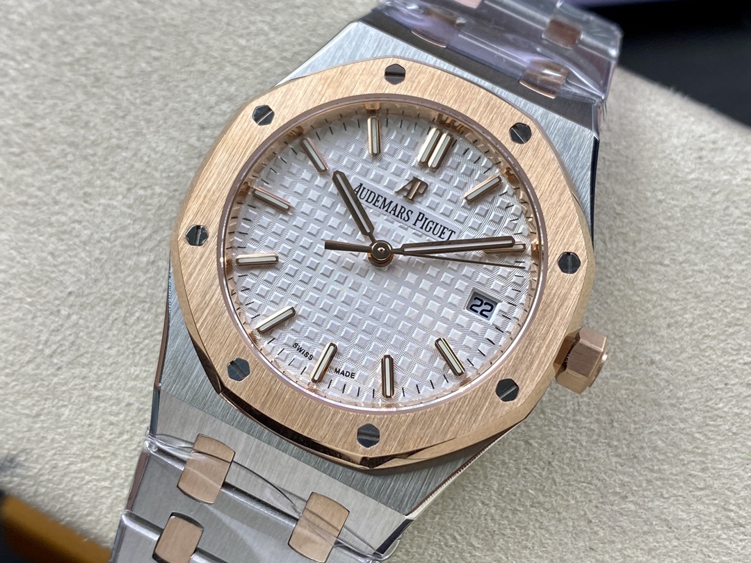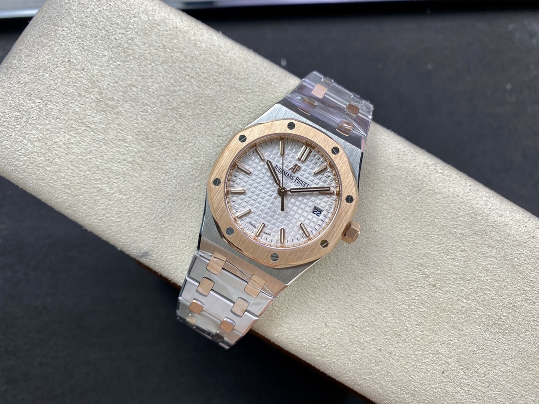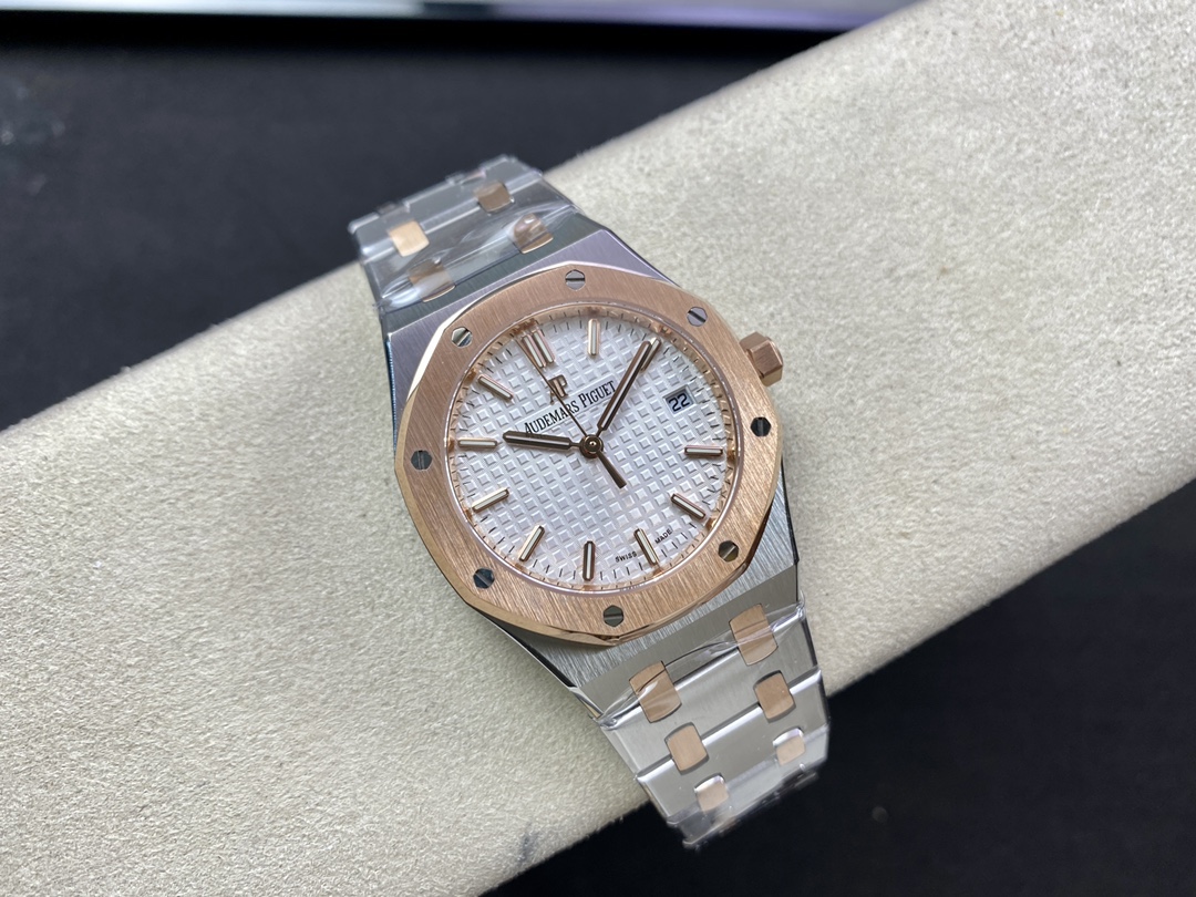 8F愛彼機械女錶77350 77351型號直徑34mm的皇家橡樹系列自動上鏈腕表,以全新錶殼尺寸再現這一傳奇系列的前衛風格,並為纖細手腕的佩戴者演繹出別樣的優雅格調。 全新腕表均搭載9015改Calibre 5800自動上鏈機芯,採用為該款式特別設計的玫瑰金金自動擺陀。