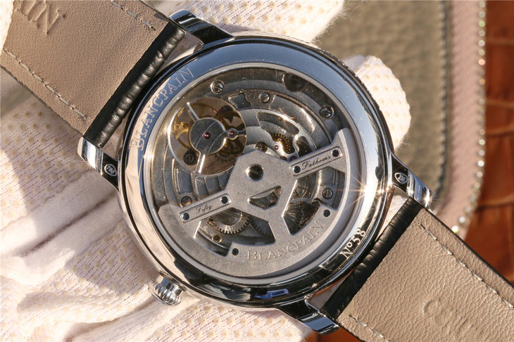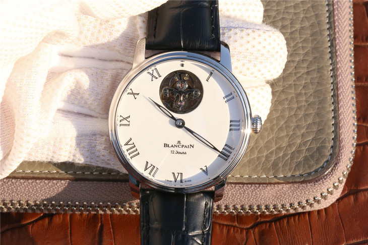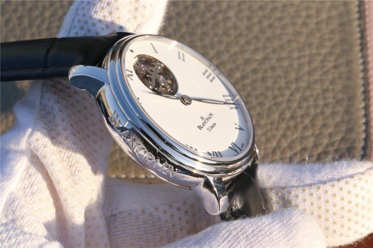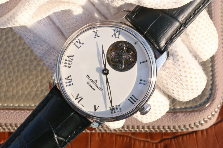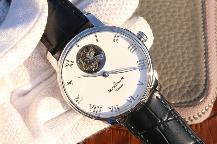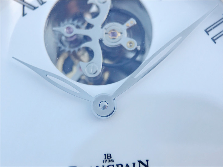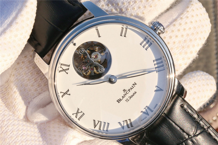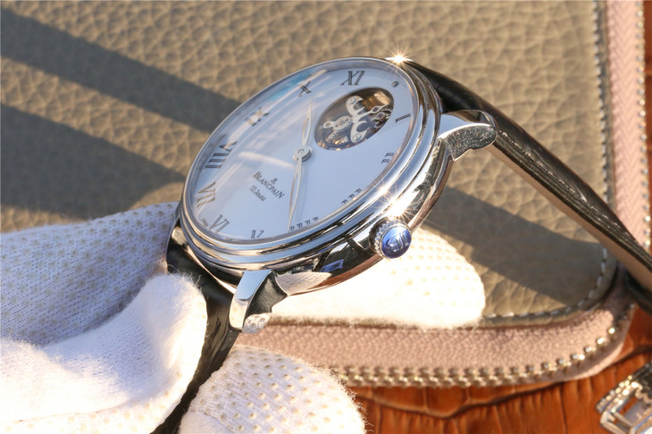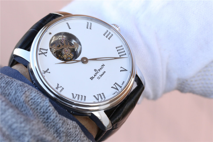 寶珀 經典系列66228自動真 陀飛輪 腕表。腕表尺寸42mm。前後均採用藍寶水晶玻璃鏡面,透過12點鐘位置的加大浮動陀飛輪框架,可以從錶盤上一覽平衡擺輪和擒縱輪的全貌,感受機械之美。陀飛輪每分鐘旋轉運行一周(360度),以此抵消分散重力對於機械零件的影響,從而提高腕表走時精准度。錶盤和時標刻度皆採用琺瑯工藝,華麗亮澤,搭配鏤空柳葉形指針輕盈優雅。整體高檔大氣,卓越經典。