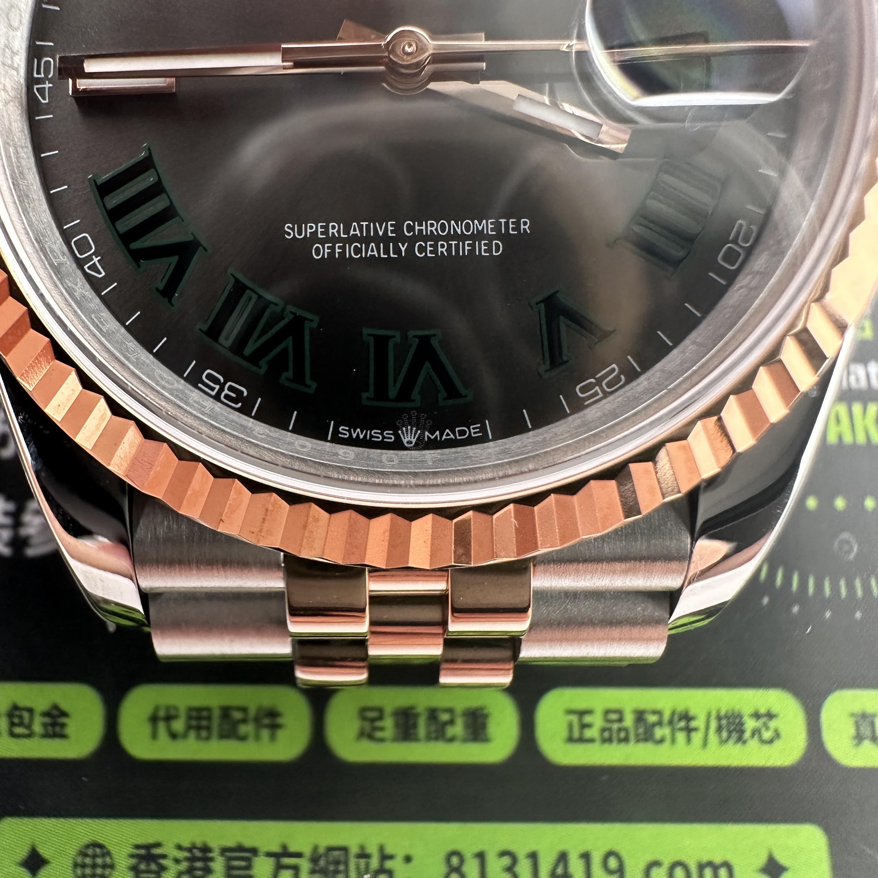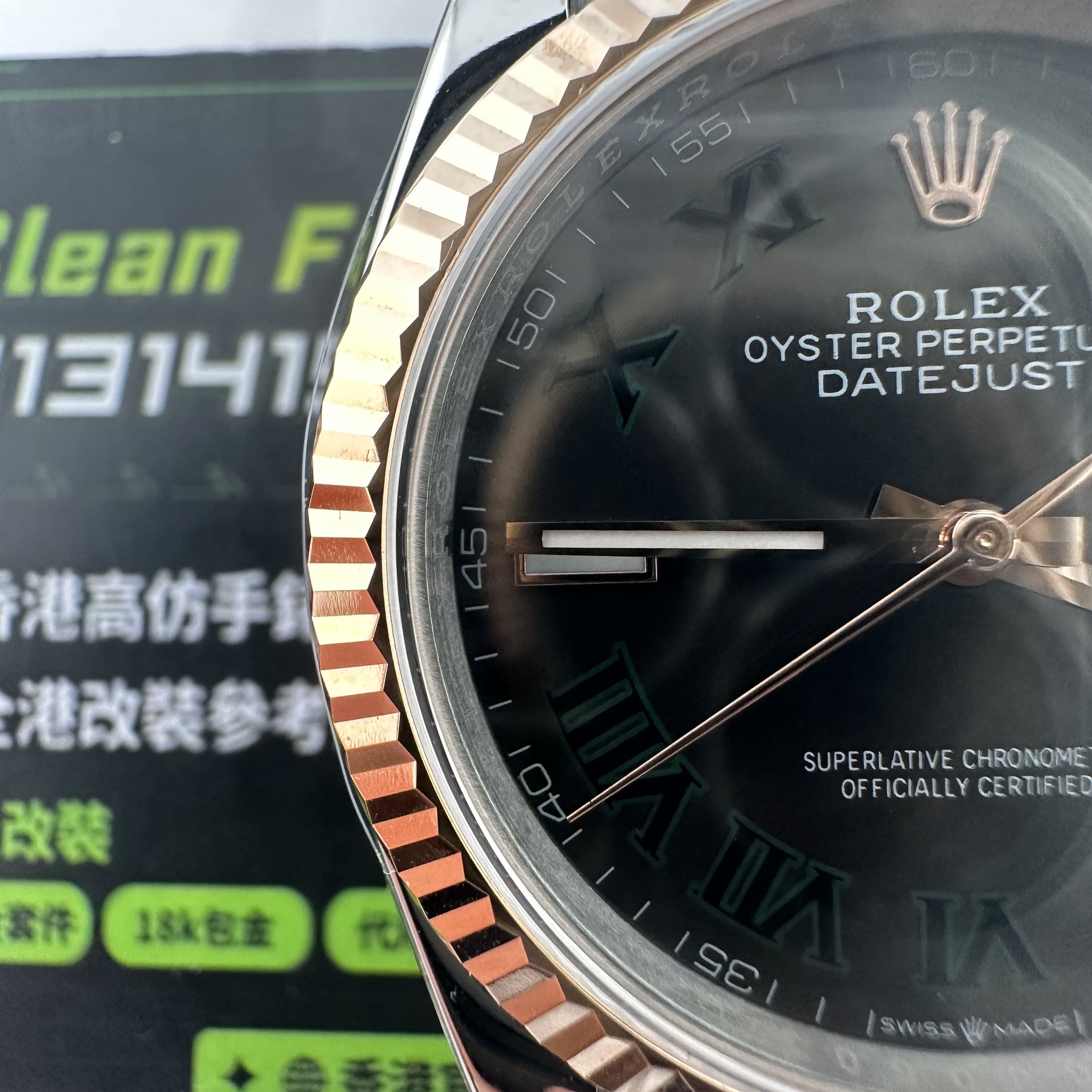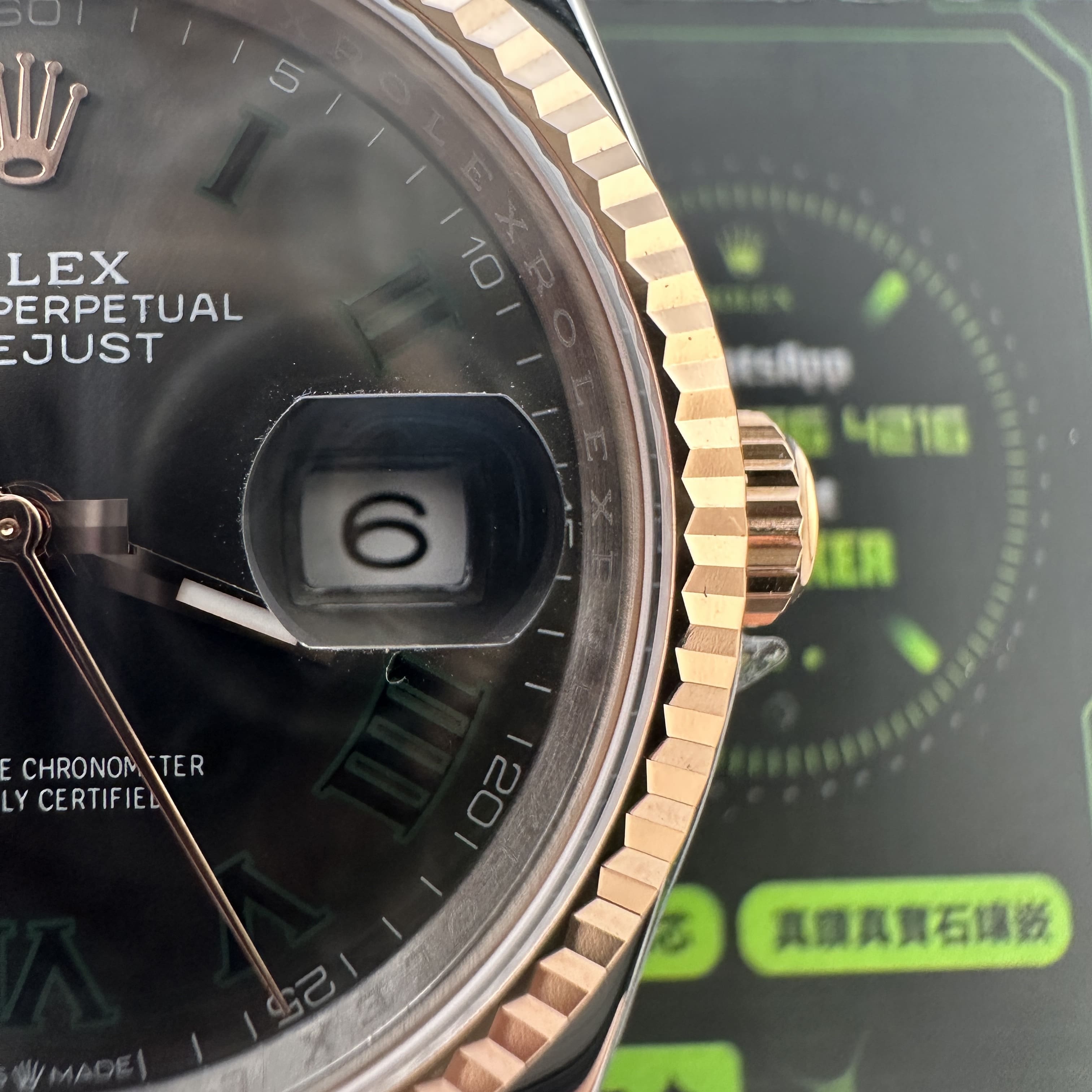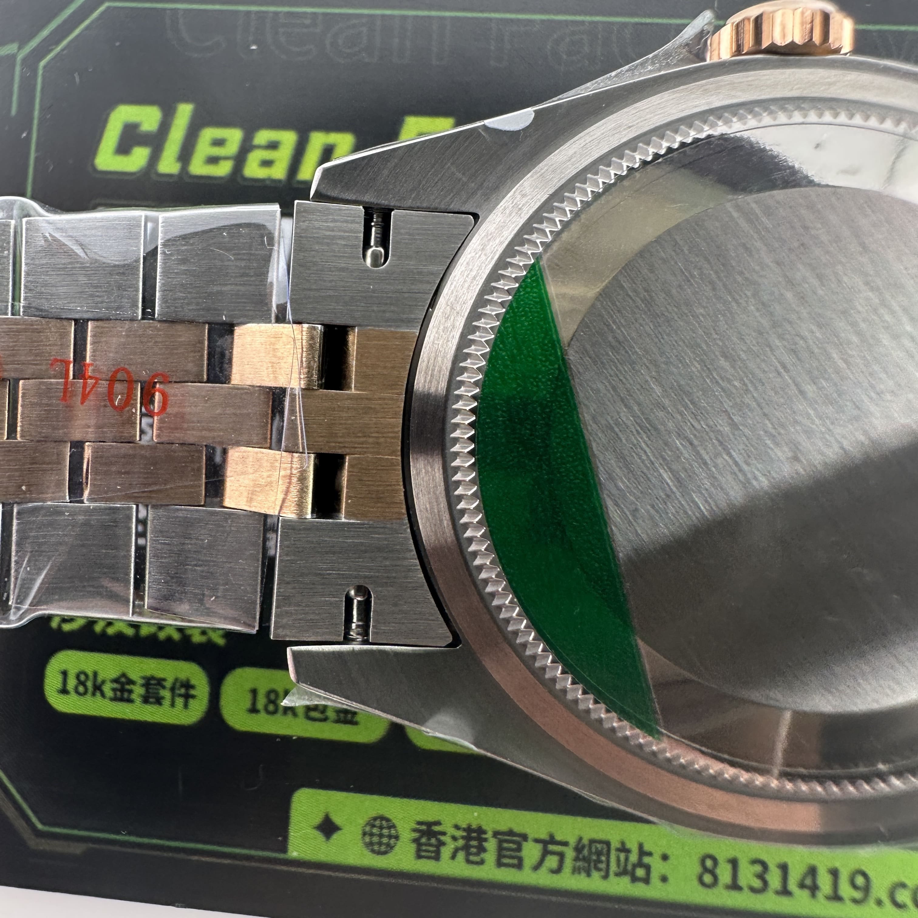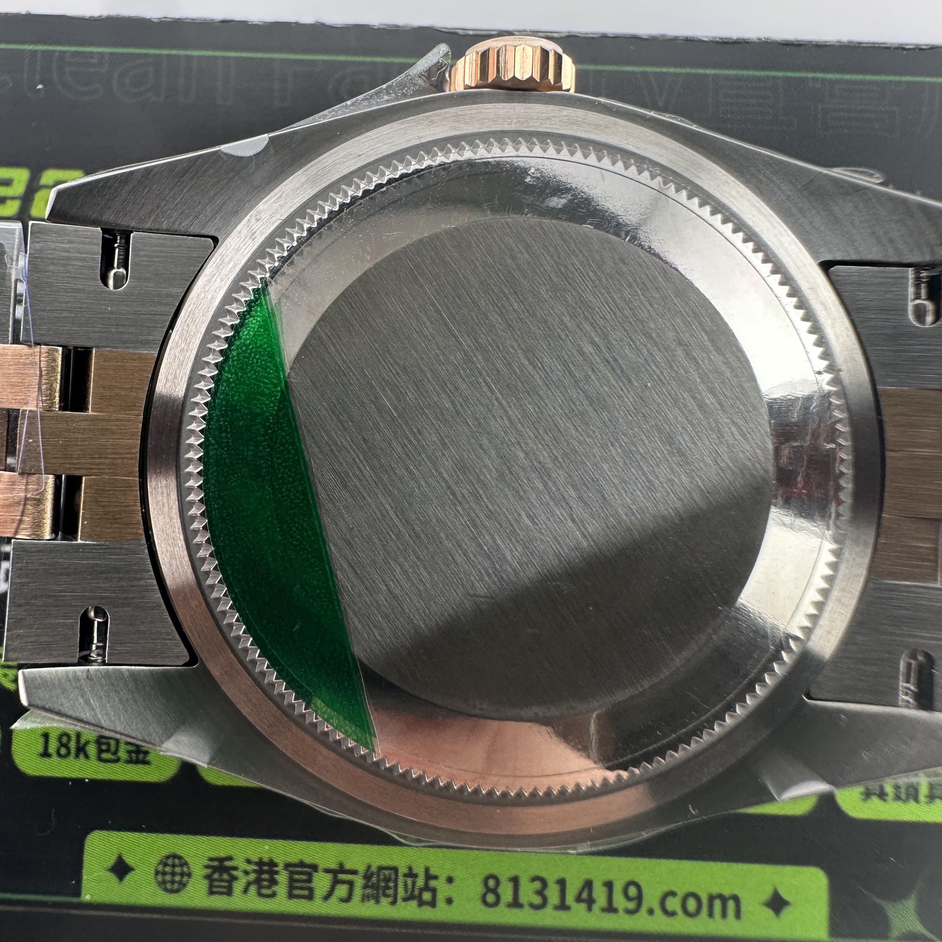 這隻A+廠日誌採用904L精鋼材質打造,外觀K金色澤採用電鍍金工藝完成製作,是一種間玫瑰金效果.圈口部分依舊採用了狗牙齒圈口,通過電鍍效果齒寸的閃度比較明顯.盤面部分是標誌性的綠蘿馬時間辨識刻度,同時綠蘿馬刻度也被成為溫佈頓,是一種網球文化的簡稱.機芯部分A+廠勞力士搭載了以丹東機芯為基礎改同步原版3235機芯.穩定性不錯,走時誤差小.