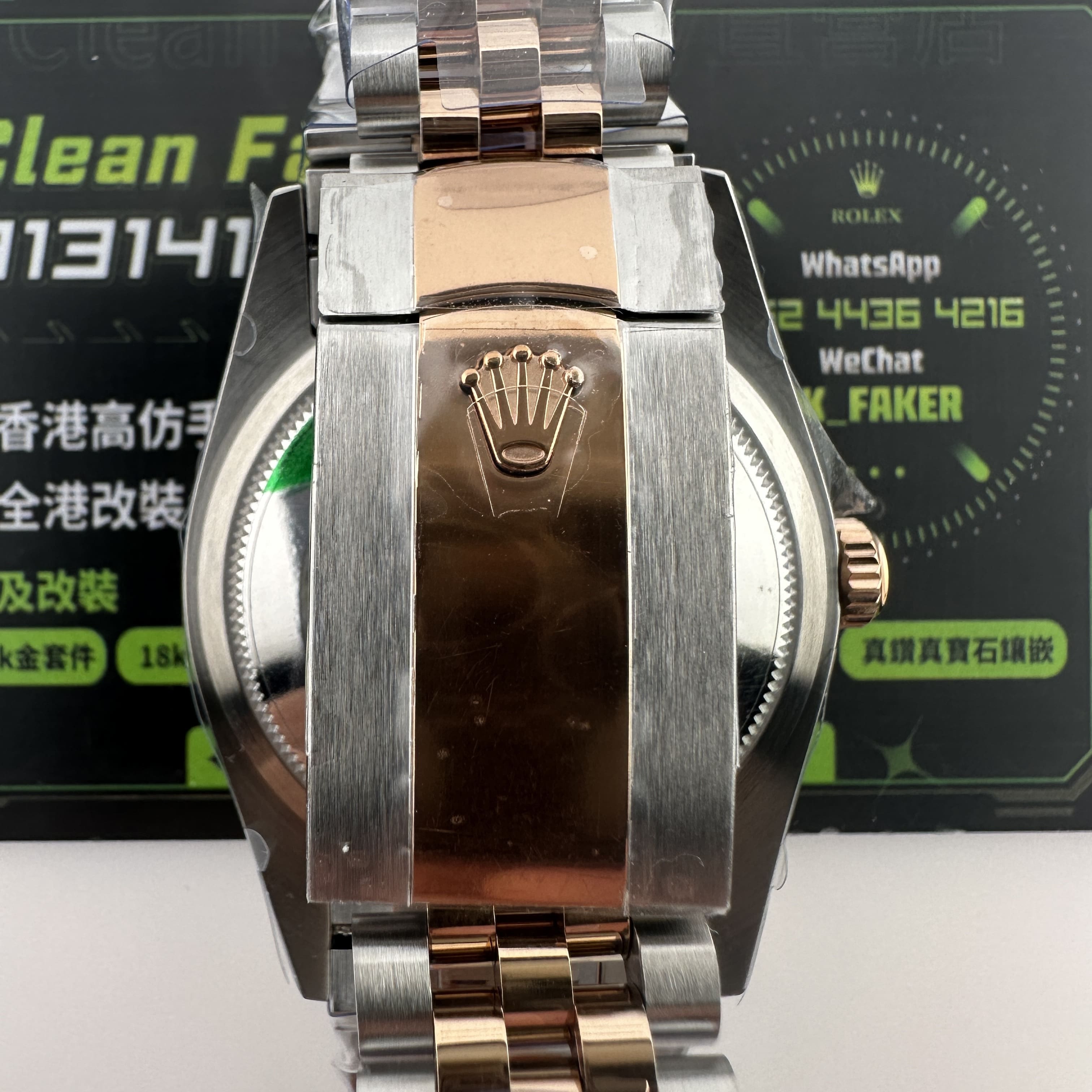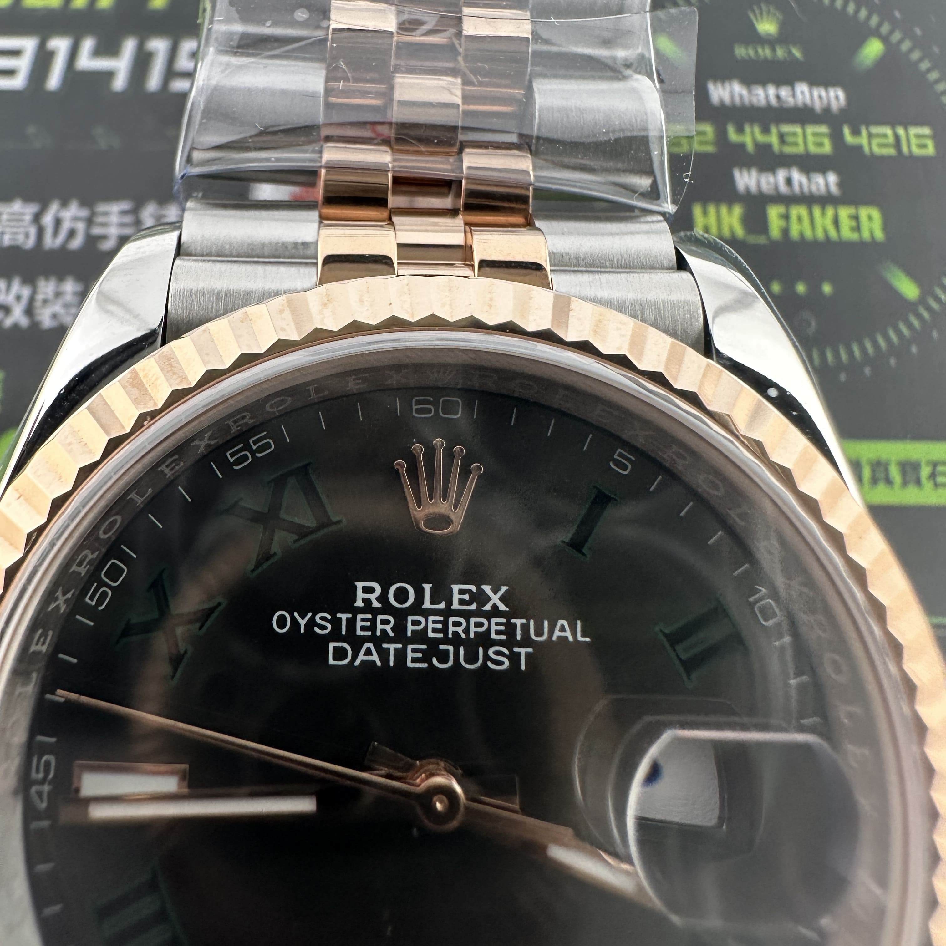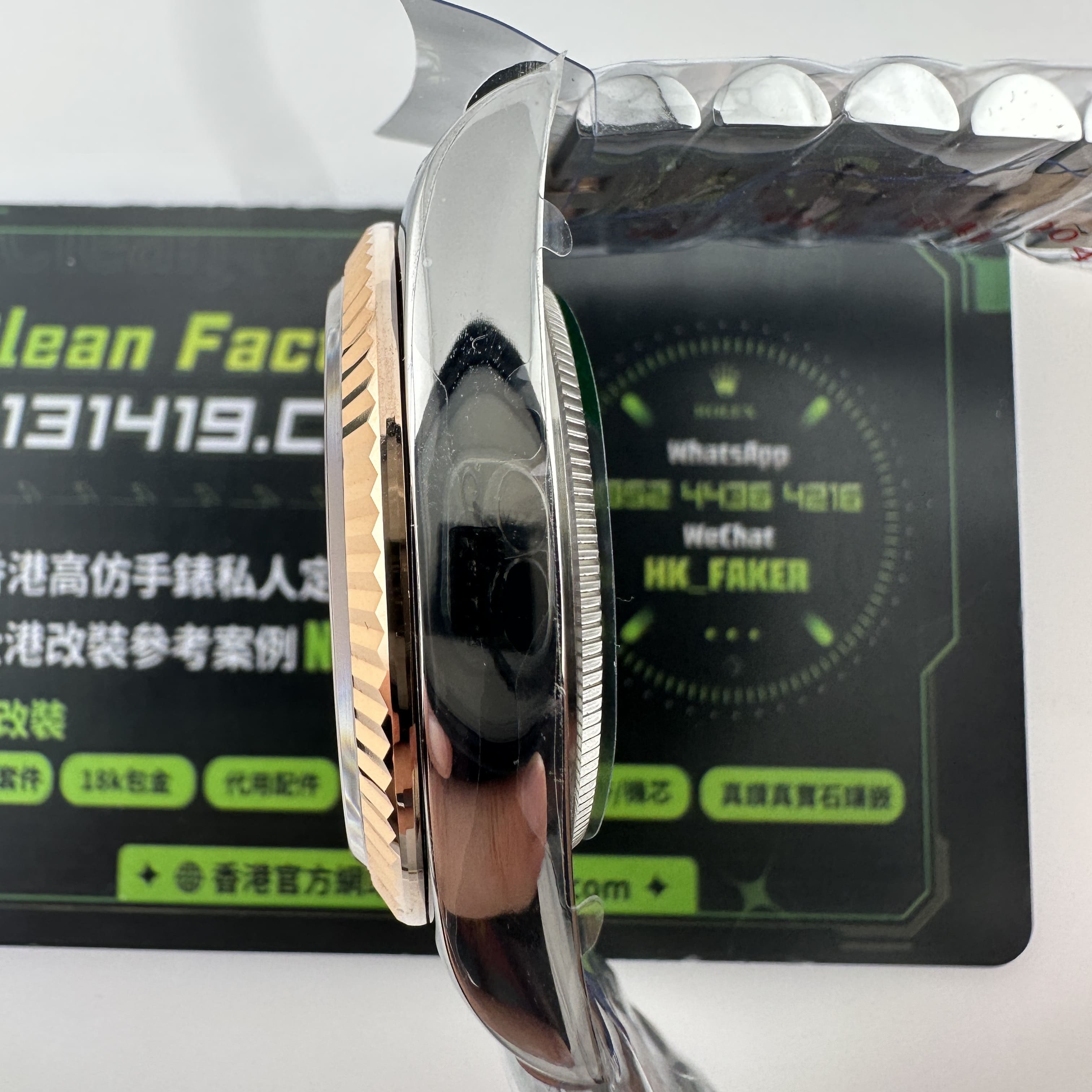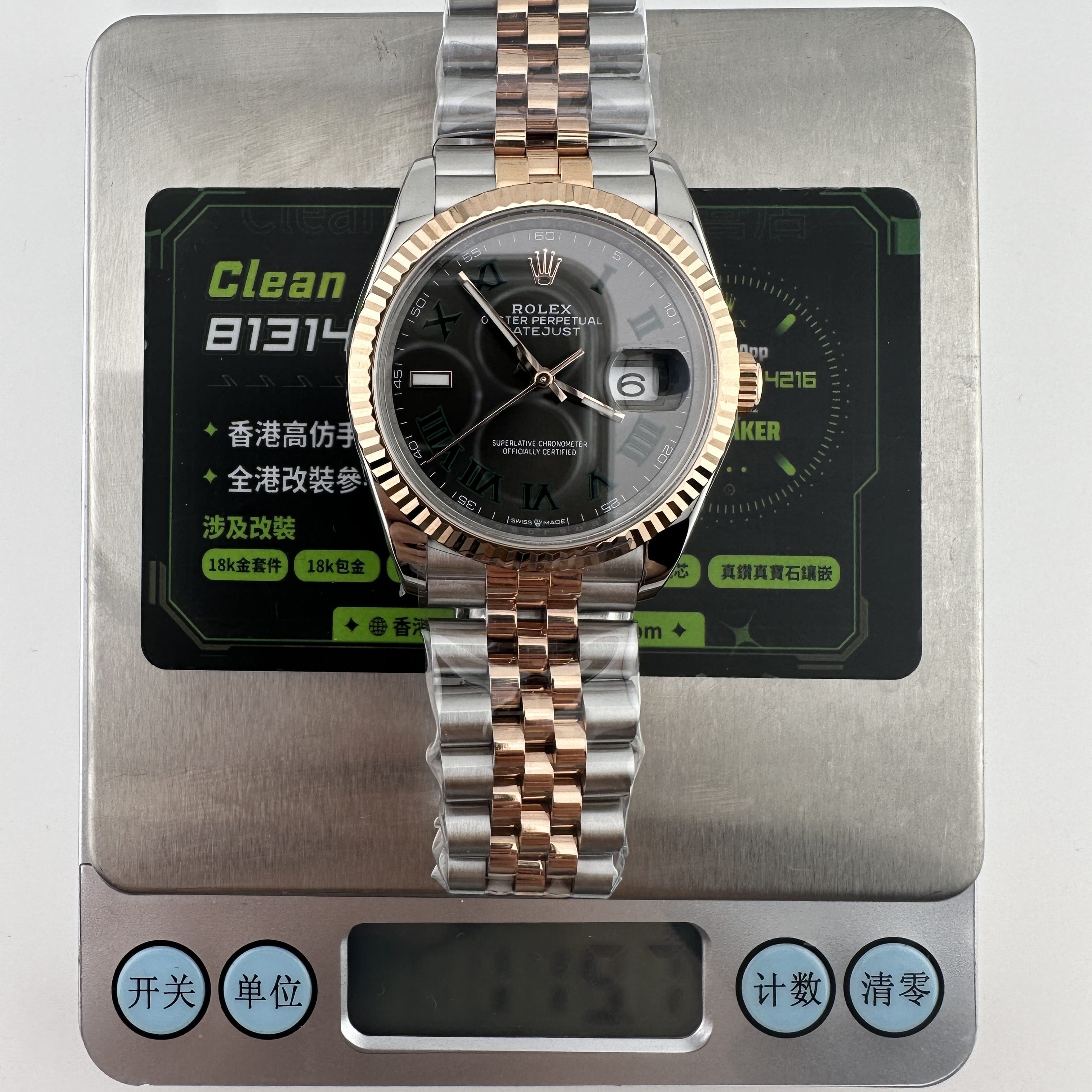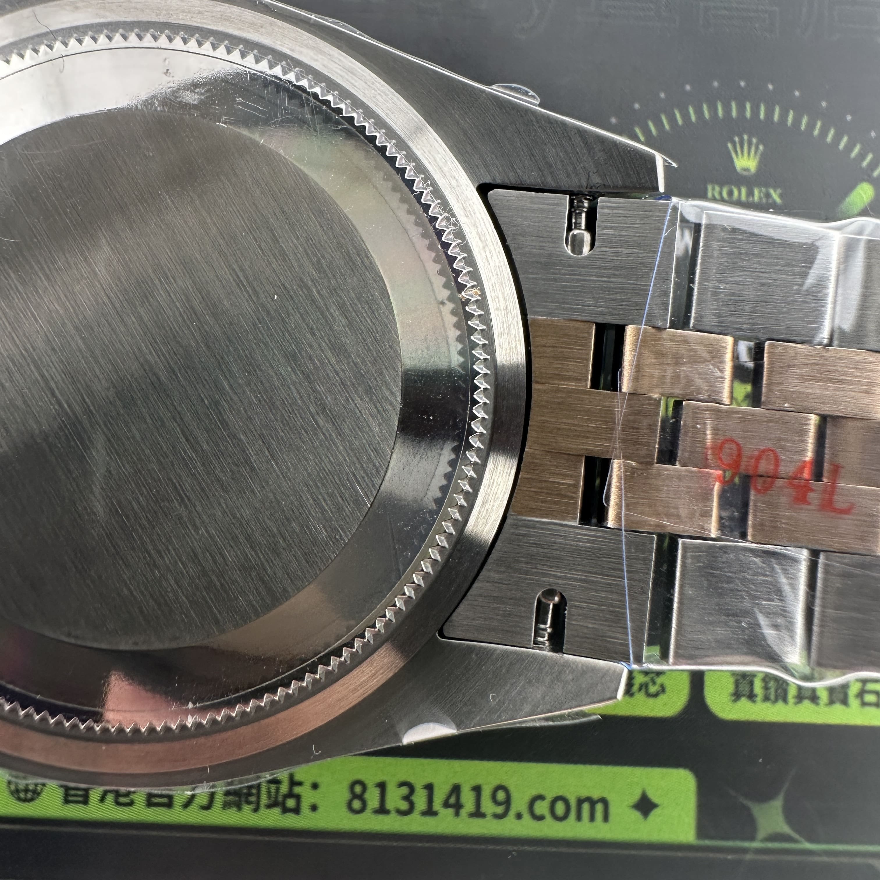 這隻A+廠日誌採用904L精鋼材質打造,外觀K金色澤採用電鍍金工藝完成製作,是一種間玫瑰金效果.圈口部分依舊採用了狗牙齒圈口,通過電鍍效果齒寸的閃度比較明顯.盤面部分是標誌性的綠蘿馬時間辨識刻度,同時綠蘿馬刻度也被成為溫佈頓,是一種網球文化的簡稱.機芯部分A+廠勞力士搭載了以丹東機芯為基礎改同步原版3235機芯.穩定性不錯,走時誤差小.