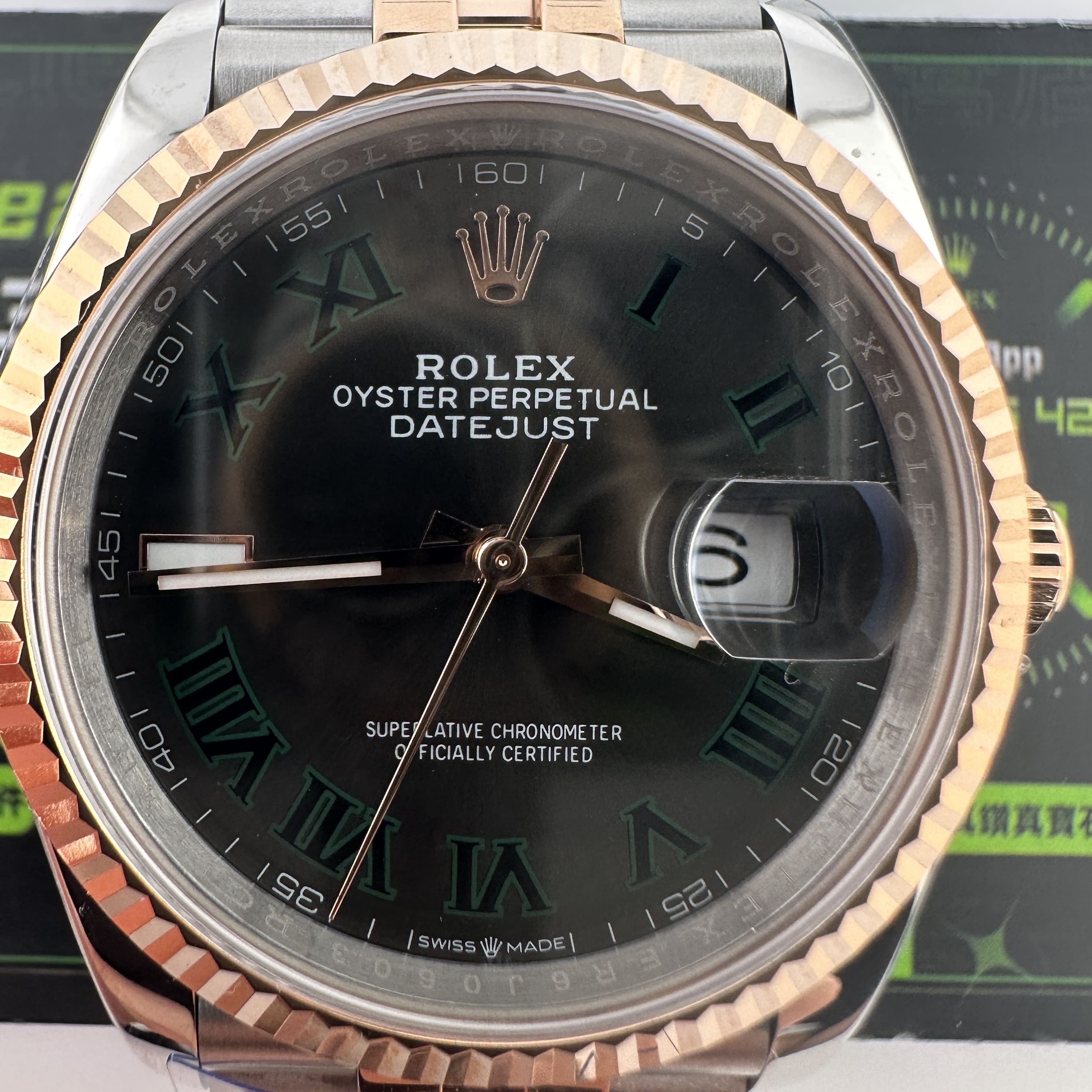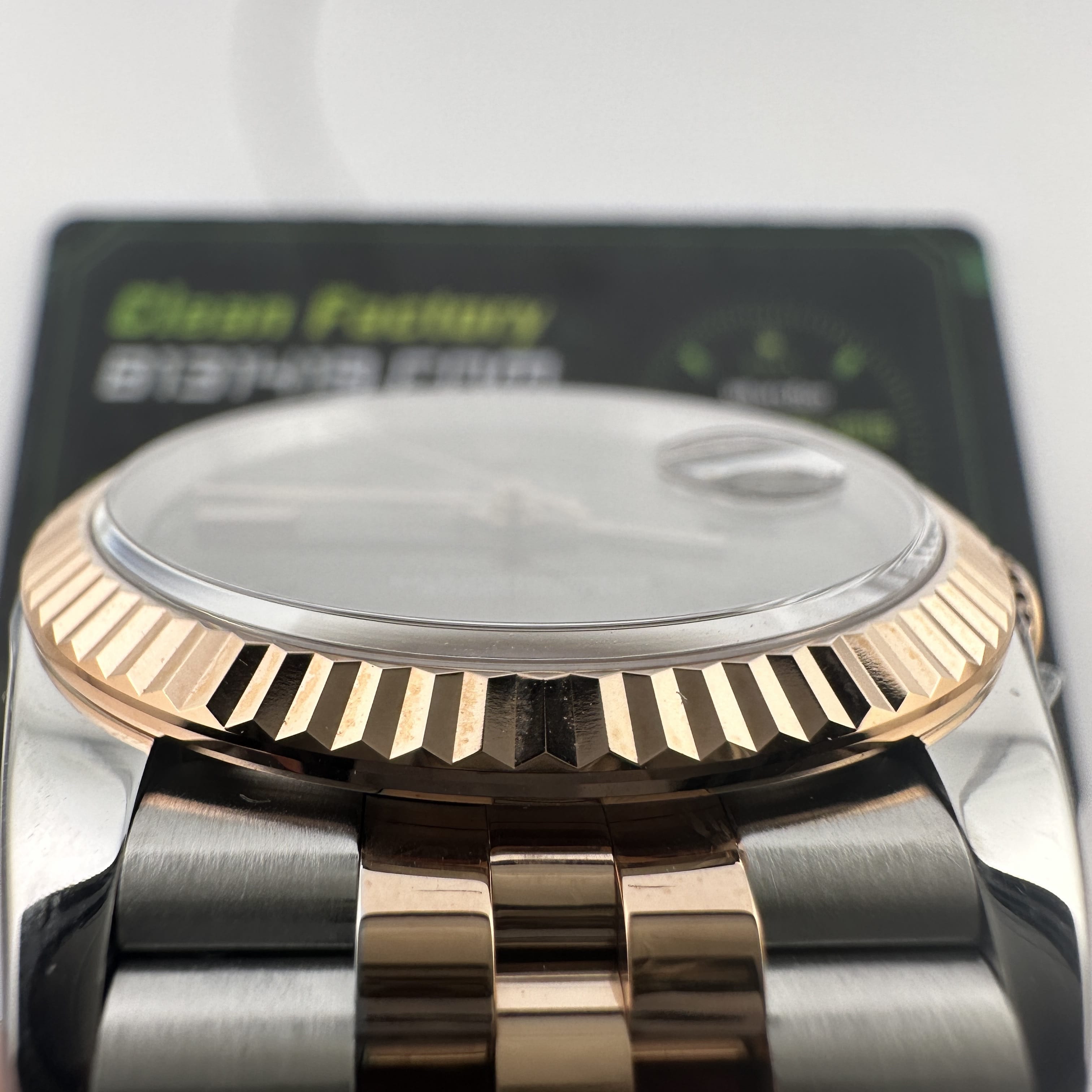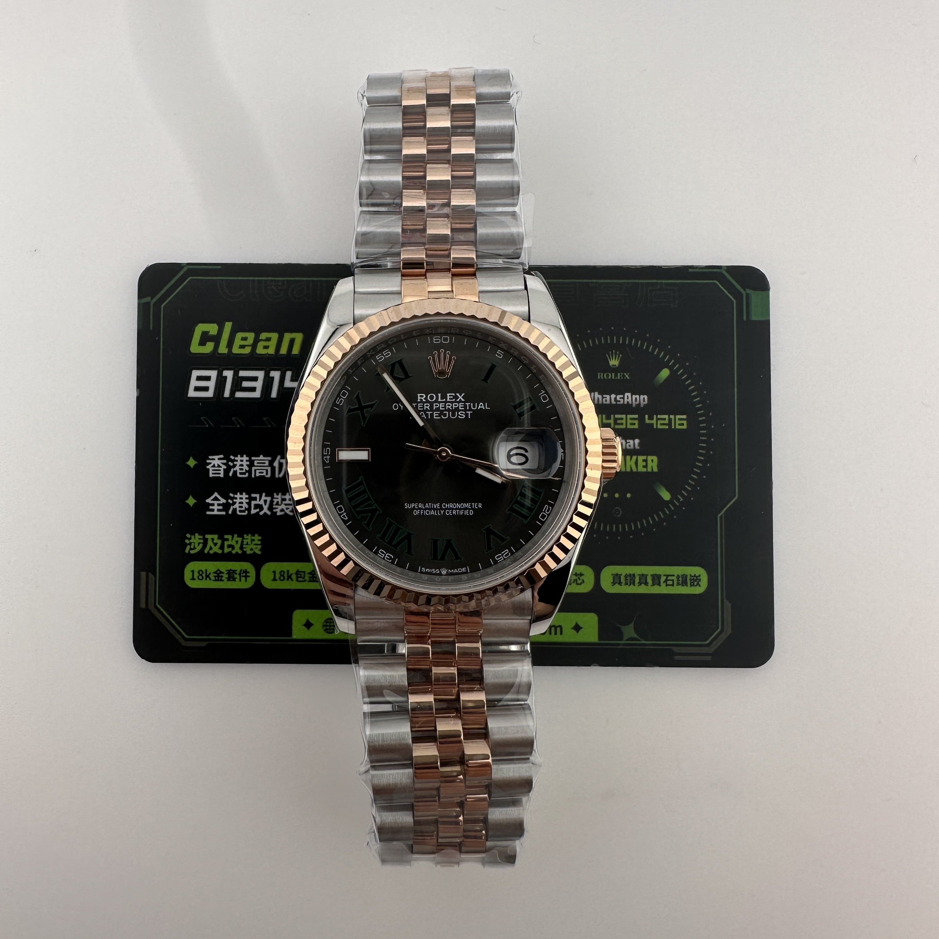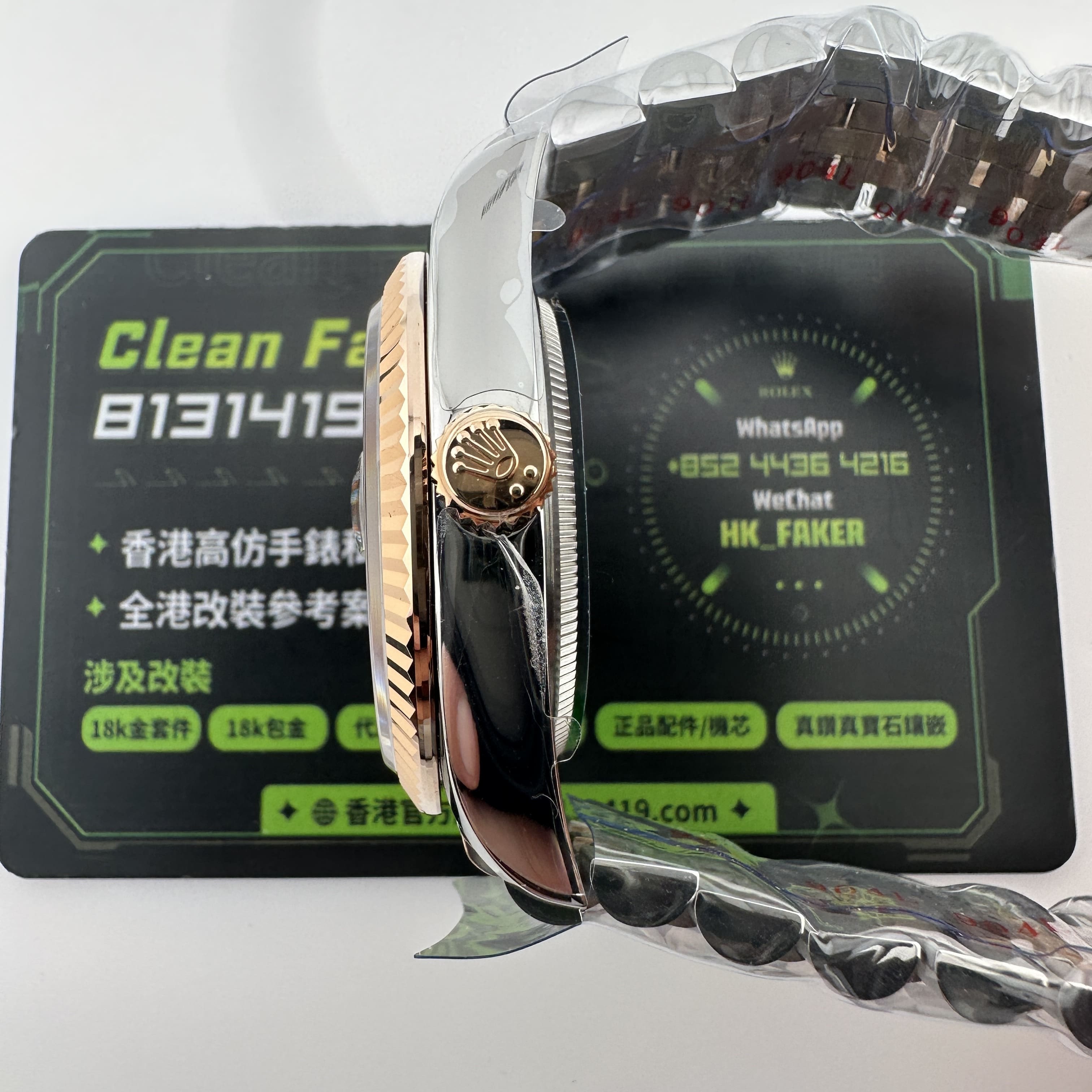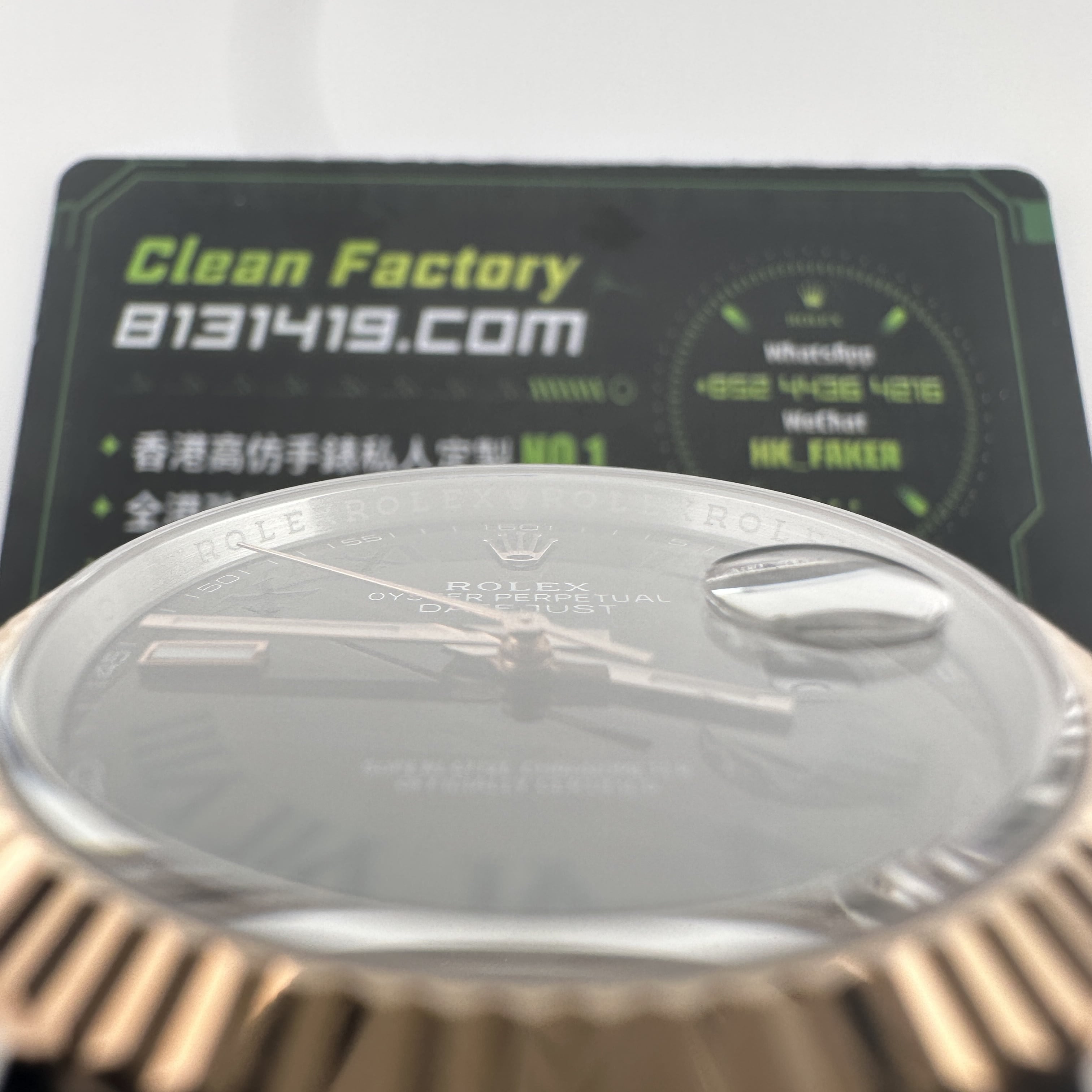 這隻A+廠日誌採用904L精鋼材質打造,外觀K金色澤採用電鍍金工藝完成製作,是一種間玫瑰金效果.圈口部分依舊採用了狗牙齒圈口,通過電鍍效果齒寸的閃度比較明顯.盤面部分是標誌性的綠蘿馬時間辨識刻度,同時綠蘿馬刻度也被成為溫佈頓,是一種網球文化的簡稱.機芯部分A+廠勞力士搭載了以丹東機芯為基礎改同步原版3235機芯.穩定性不錯,走時誤差小.
