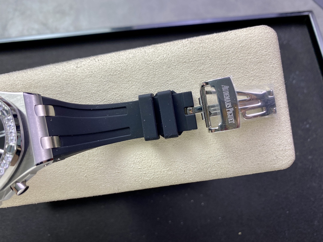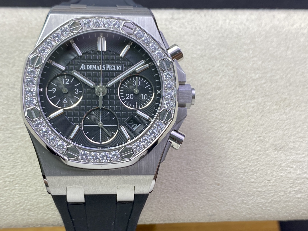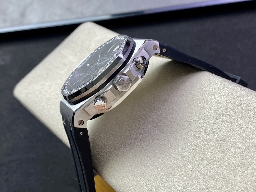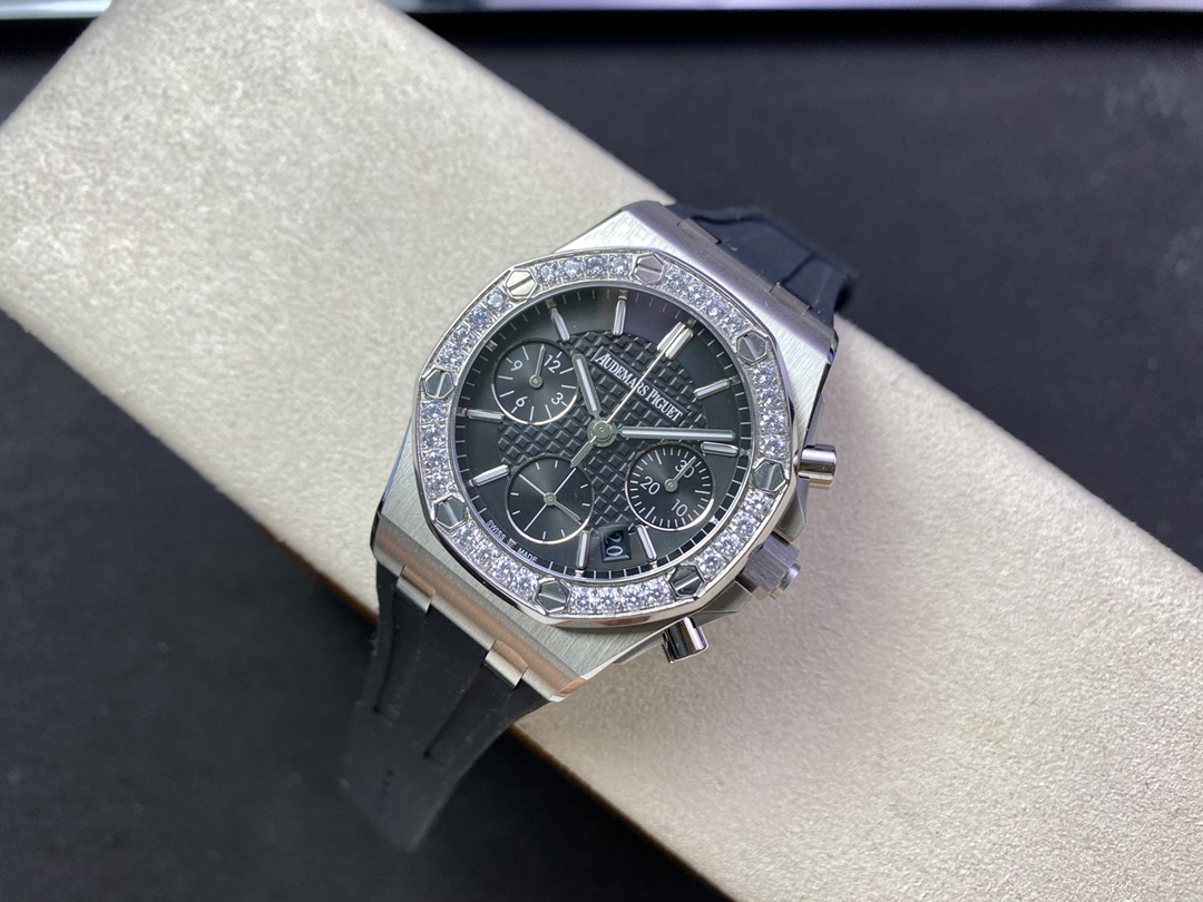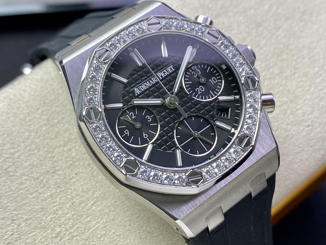 新款AP愛彼Audemars Piguet皇家橡樹女款多功能計時機械腕表專櫃尺寸37mm【圈口】圈口採用進口鑽石原裝鑲嵌手法【把頭】錶冠採用六邊形精鋼材質, 頂端採用拉絲打磨科技【機芯】7750改原裝機芯6字比特小秒功能與原裝一致【錶鏡】錶鏡選用進口藍寶石玻璃鏡面【錶殼】採用進口316精鋼錶殼【錶帶】搭配進口開模氟橡膠錶帶【錶扣】原裝折疊扣【頭粒】頭粒設計與專櫃一致可以微調佩戴更佳貼手舒適女神必備經過多道工序的打磨和磨砂處理, 終把AP特有的八角型錶圈表達出棱角分明的線條