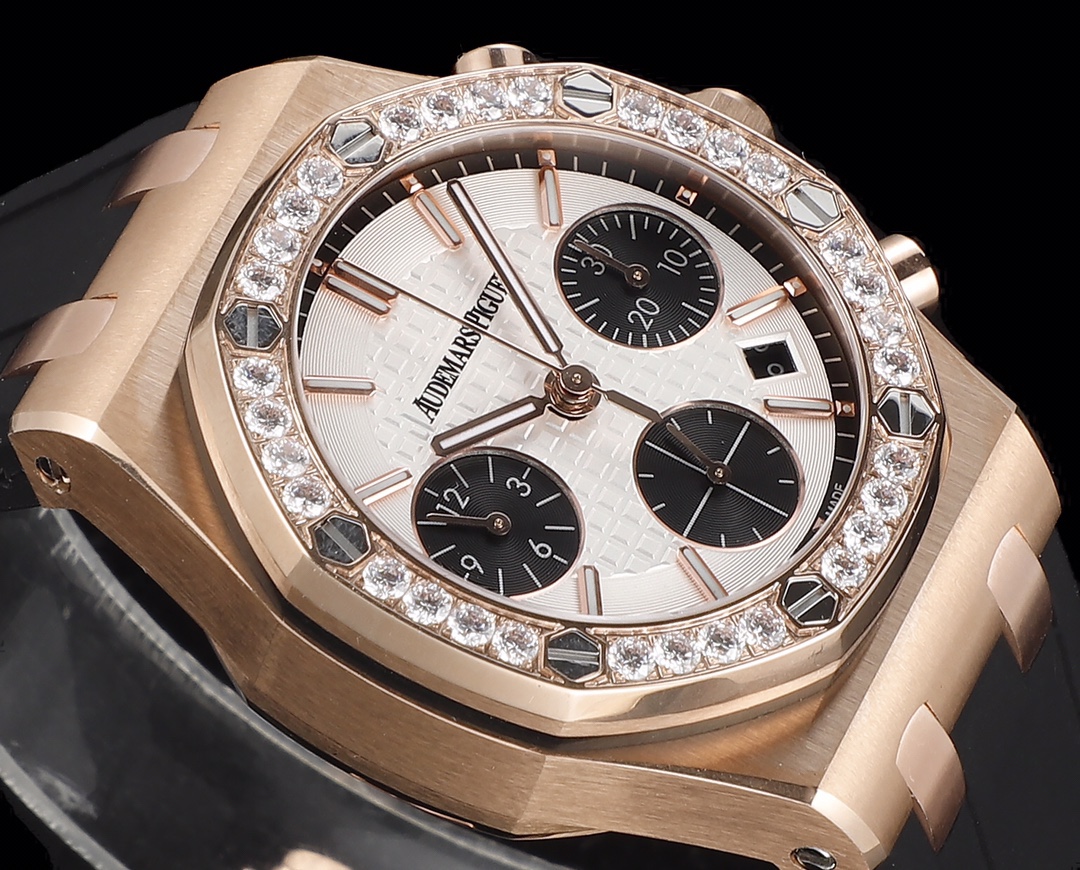 新款AP愛彼Audemars Piguet皇家橡樹女款多功能計時機械腕表專櫃尺寸37mm【圈口】圈口採用進口鑽石原裝鑲嵌手法【把頭】錶冠採用六邊形精鋼材質, 頂端採用拉絲打磨科技【機芯】7750改原裝機芯6字比特小秒功能與原裝一致【錶鏡】錶鏡選用進口藍寶石玻璃鏡面【錶殼】採用進口316精鋼錶殼【錶帶】搭配進口開模氟橡膠錶帶【錶扣】原裝折疊扣【頭粒】頭粒設計與專櫃一致可以微調佩戴更佳貼手舒適女神必備經過多道工序的打磨和磨砂處理, 終把AP特有的八角型錶圈表達出棱角分明的線條