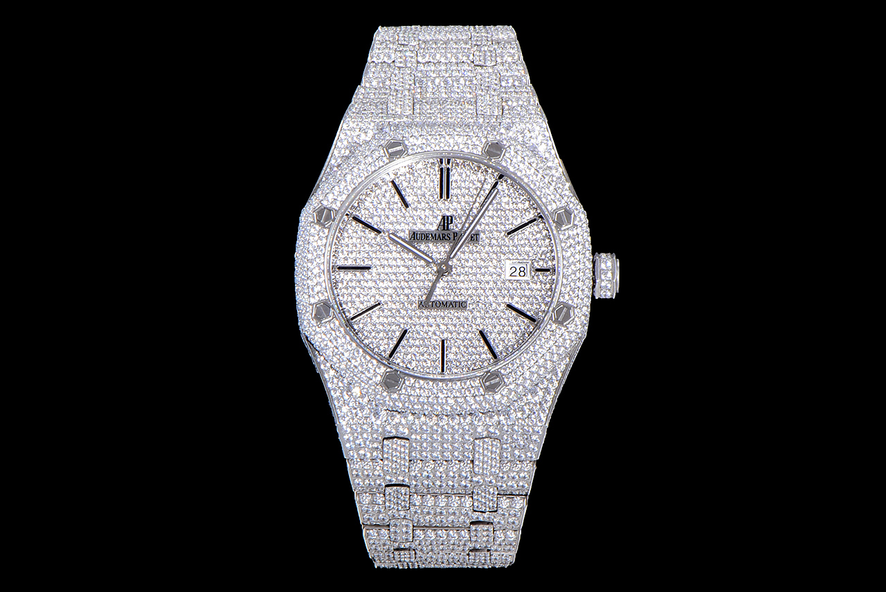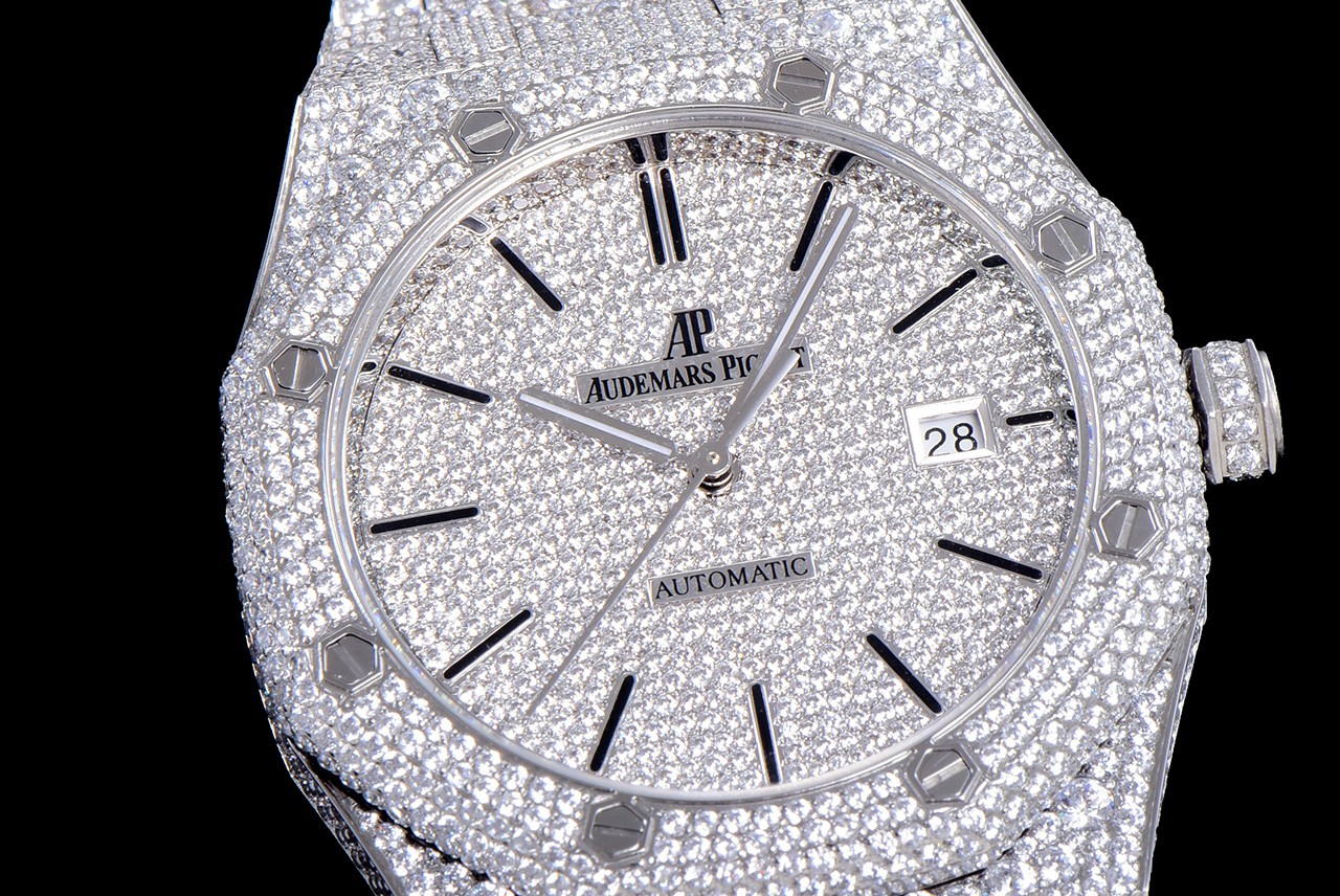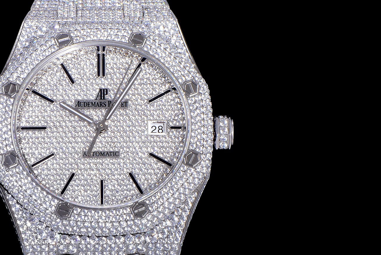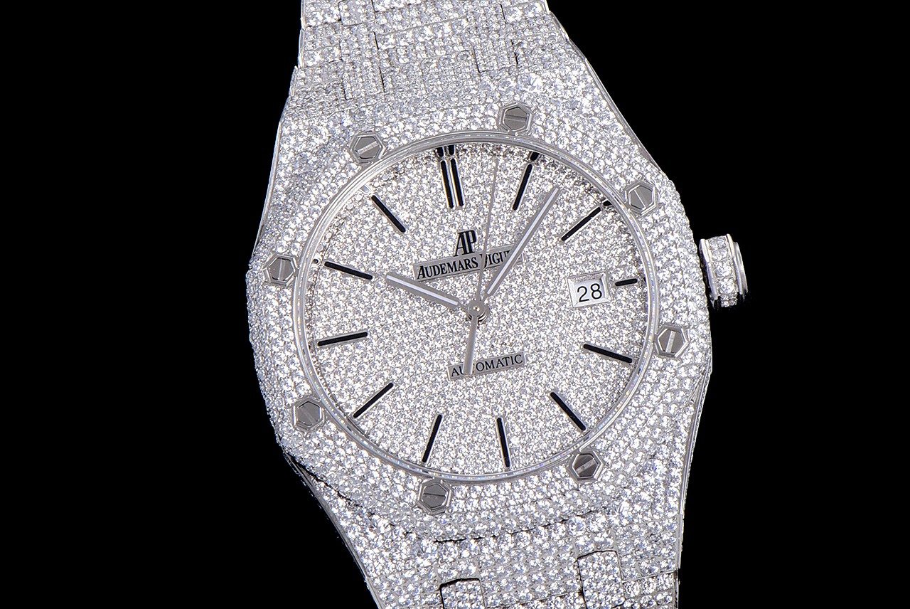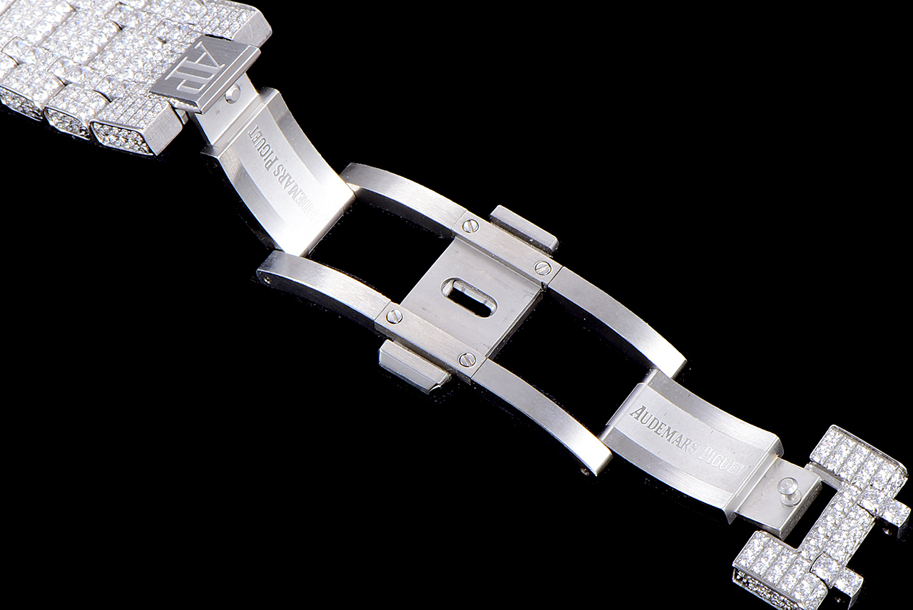 歷經重重工藝,終於大功告成!整表密集鑲滿最頂級的施華洛世奇美鉆,包括鋼帶側邊也是滿鑲鉆,嘗試了無數次的加工工藝,追求奢華至極的無敵質感!不惜一切的成本,終於打造出目前最豪華的15400滿天星。秒殺其它現有版本的細節和做工!