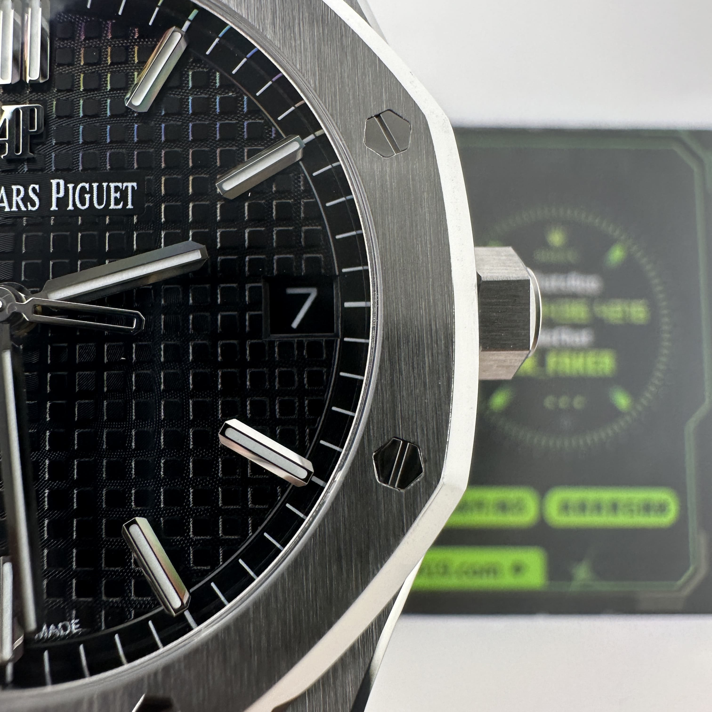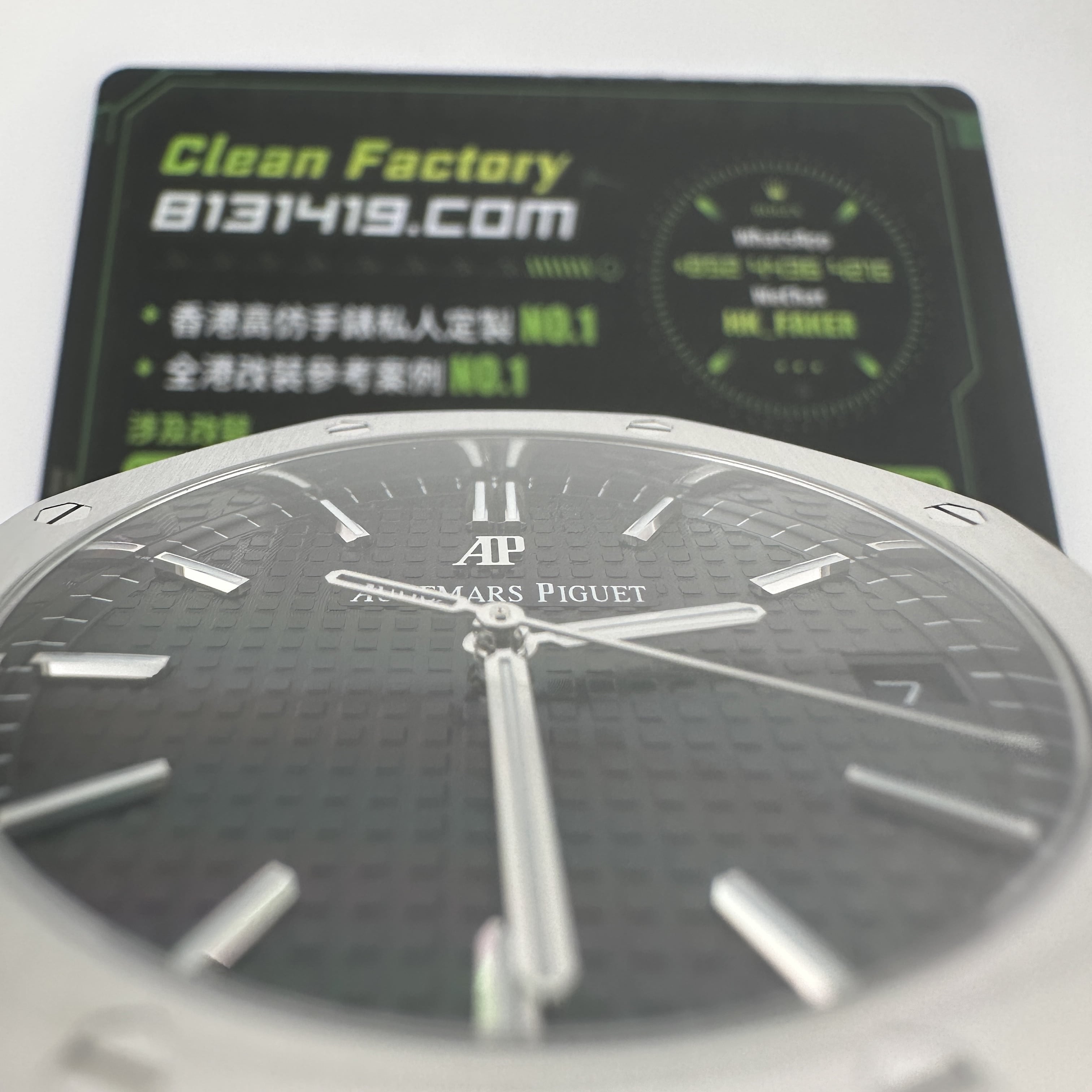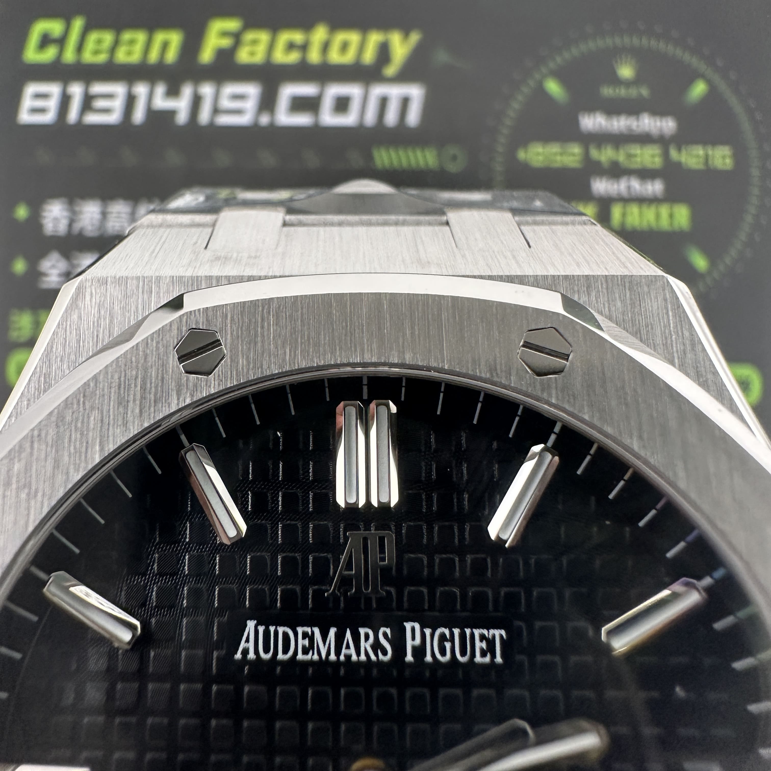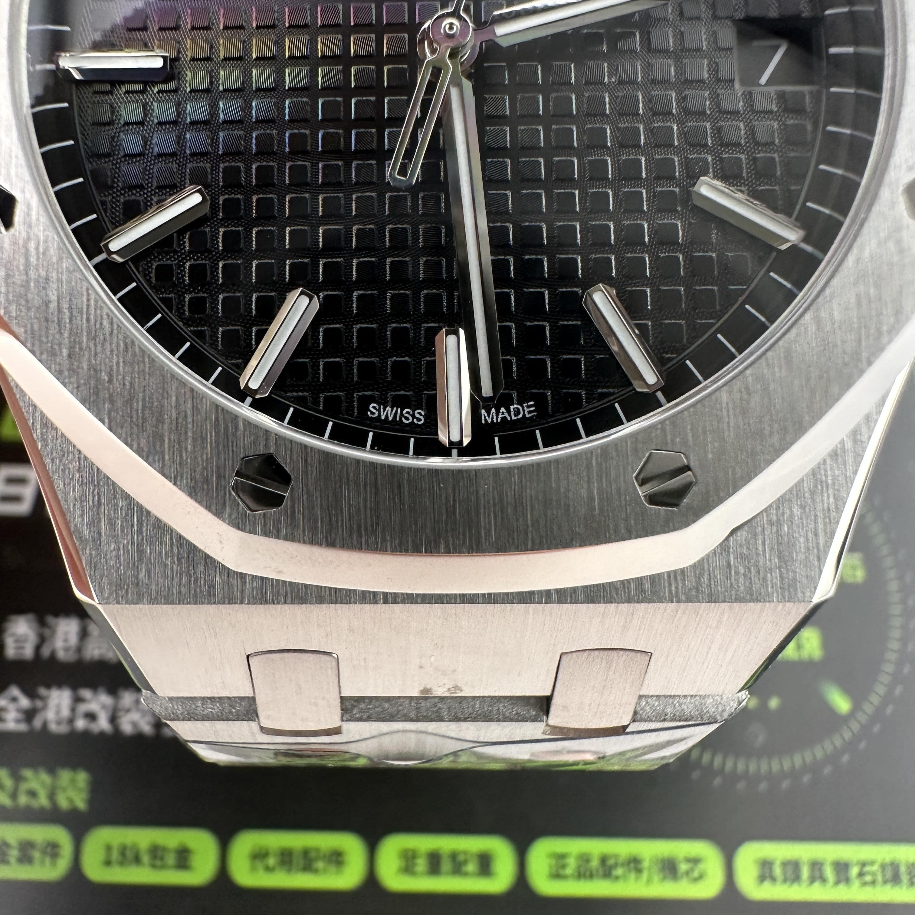 APS廠15500是黑色錶盤,尺寸41mm,厚薄度10.4mm,外觀構造是採用316L精鋼材質打造,圈口經過拋光打磨,而錶殼與錶帶部分是採用了拉絲工藝,兩種製作工藝APS廠1:1復刻還原.圈口依舊是AP非常經典的八邊形架構,並且配置8枚螺絲固定與裝飾,一直都是AP腕錶辨識度最高的圈口之一.錶盤則是餅乾紋配置三大指針與日曆,整體的效果看上去沉穩,並且大氣,加上41mm尺寸範圍是屬於黃金尺寸比例,適合大部分消費者男士.
