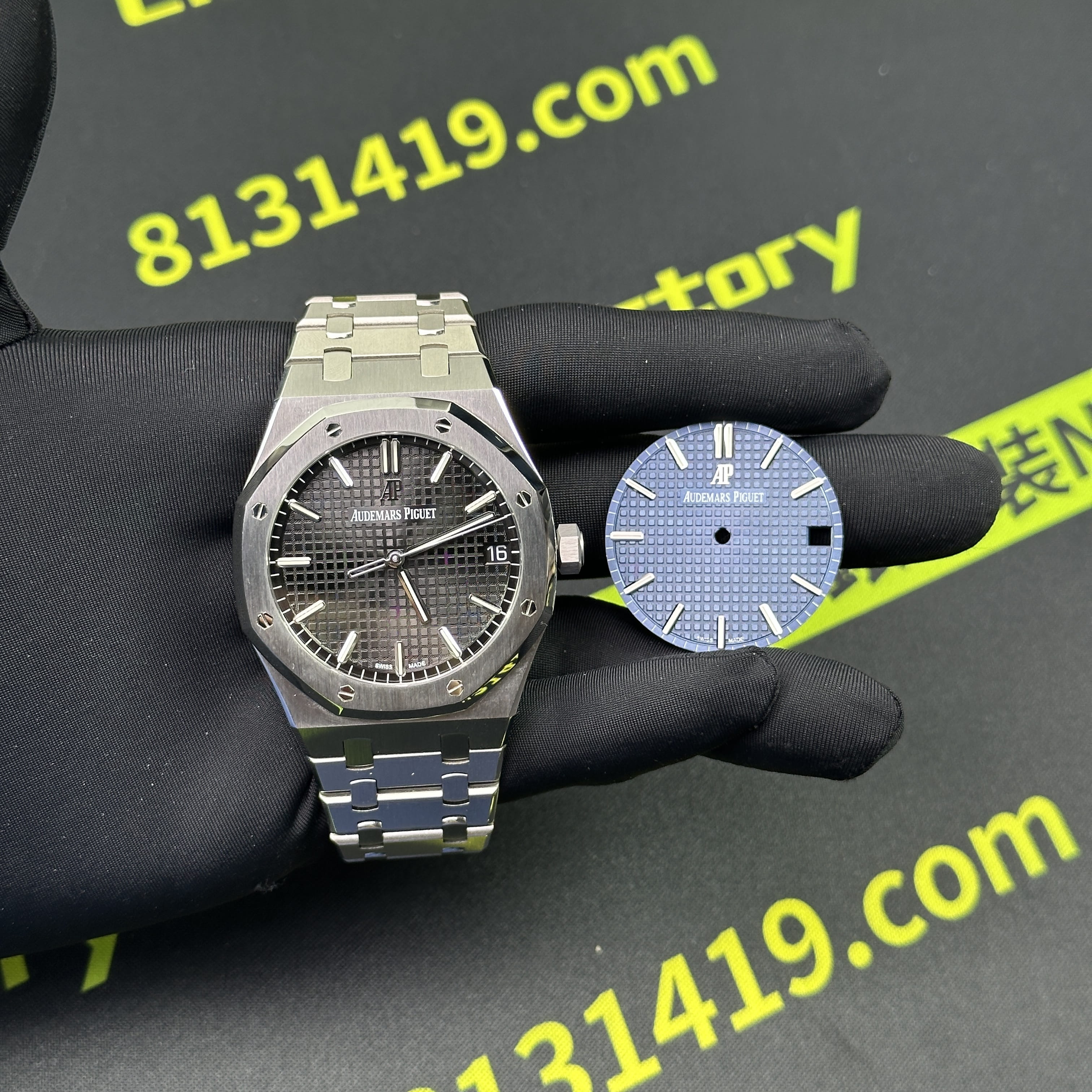 而APS廠15500私人訂製部分主要涉及到錶友選擇了藍盤15500,後續是直接改裝升級滿配黑色盤面套件,其中就有升級代用級別的盤面,放射紋理更加自然,且是隨波逐流的視覺感,APS廠15500改裝升級後對比原版是達到了更加接近原版無色差的做工.其次是塗層的字面部分,大小,弧度,深度,間隔距離都有涉及到對應的細節處理.除此之外APS廠15500滿配改裝除了可以升級黑色錶盤之外,藍色,以及灰色等等盤面均可實現改裝代用盤面的選擇.