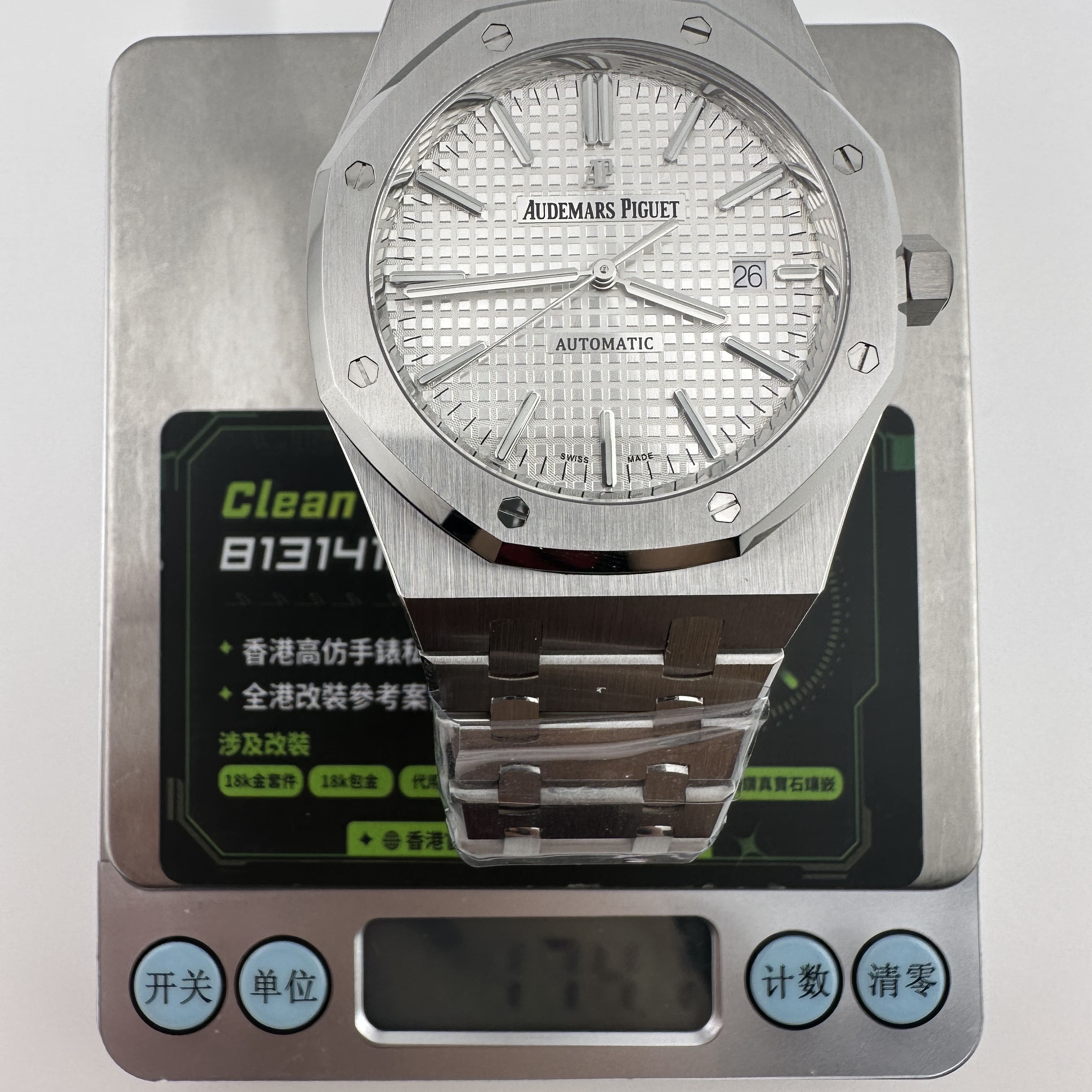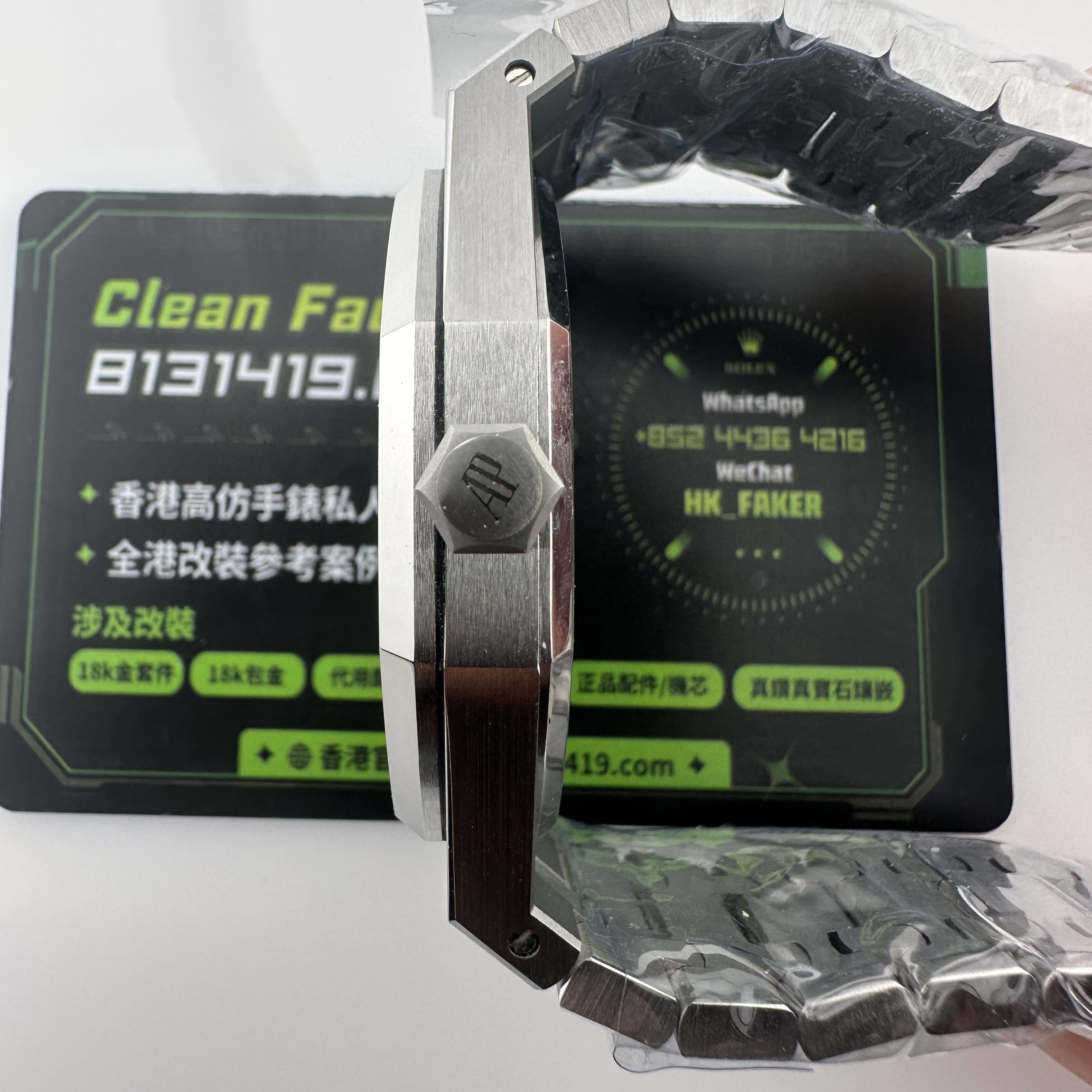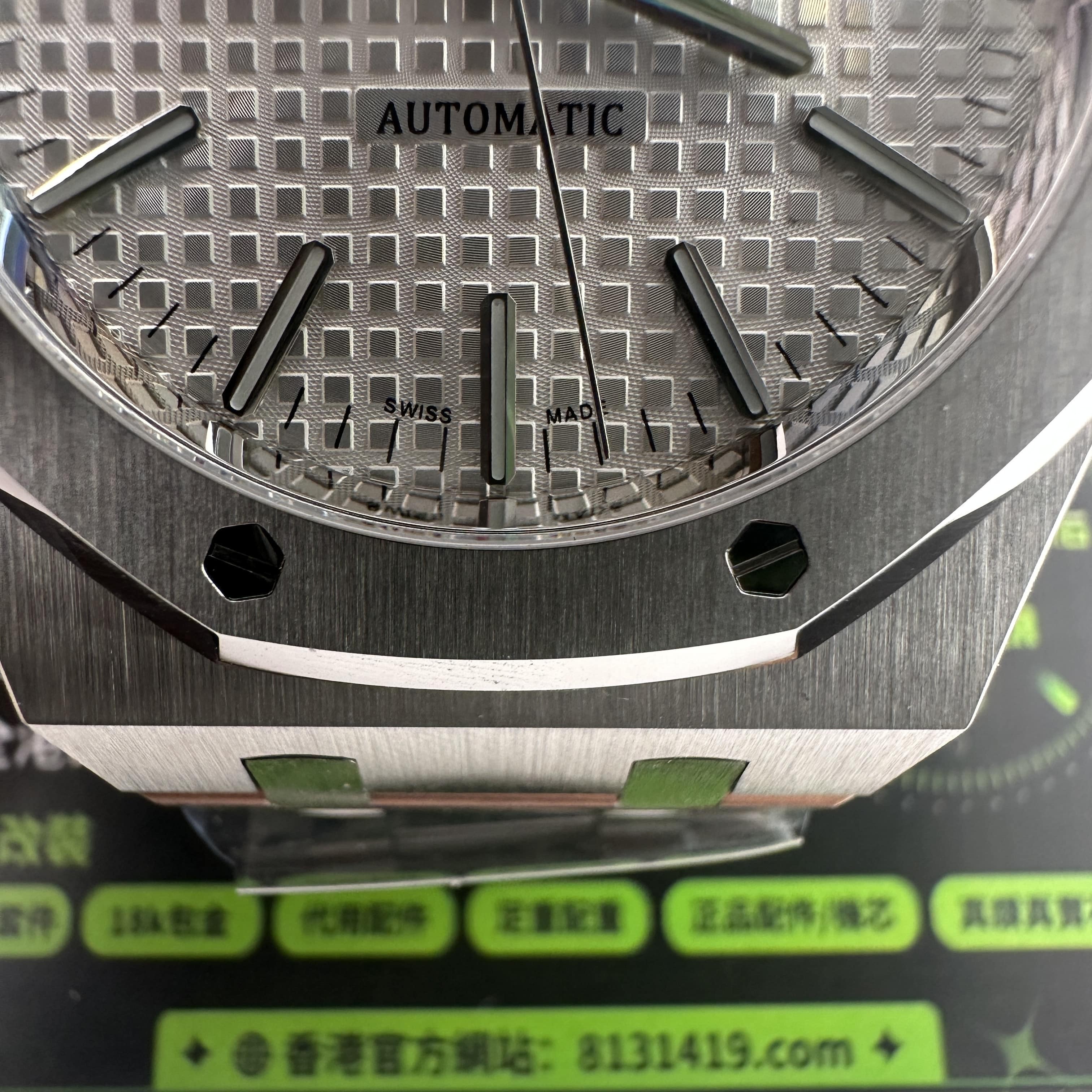 APS廠愛彼根據原版1:1打造而成,使用316L精鋼材質,整錶克重174克,手感部分已經達到原版級別.經典的八邊形圈口涉及,切割面與拋光面足以證明APS廠頂級製作工藝呈現.銀白色錶盤作為純色面與黑色錶盤同樣形成"杜絕一眼假".黑白配色很難看出是否存在色差.同時高仿市面上也配備了錶盤,指針,中軸,日曆,玻璃滿配改裝案例,主要針對高仿愛彼15400以及其他錶款存在的盤面細節處理不對版進行復原.機芯配置了一體3120機芯,走時誤差標準,性能穩定.