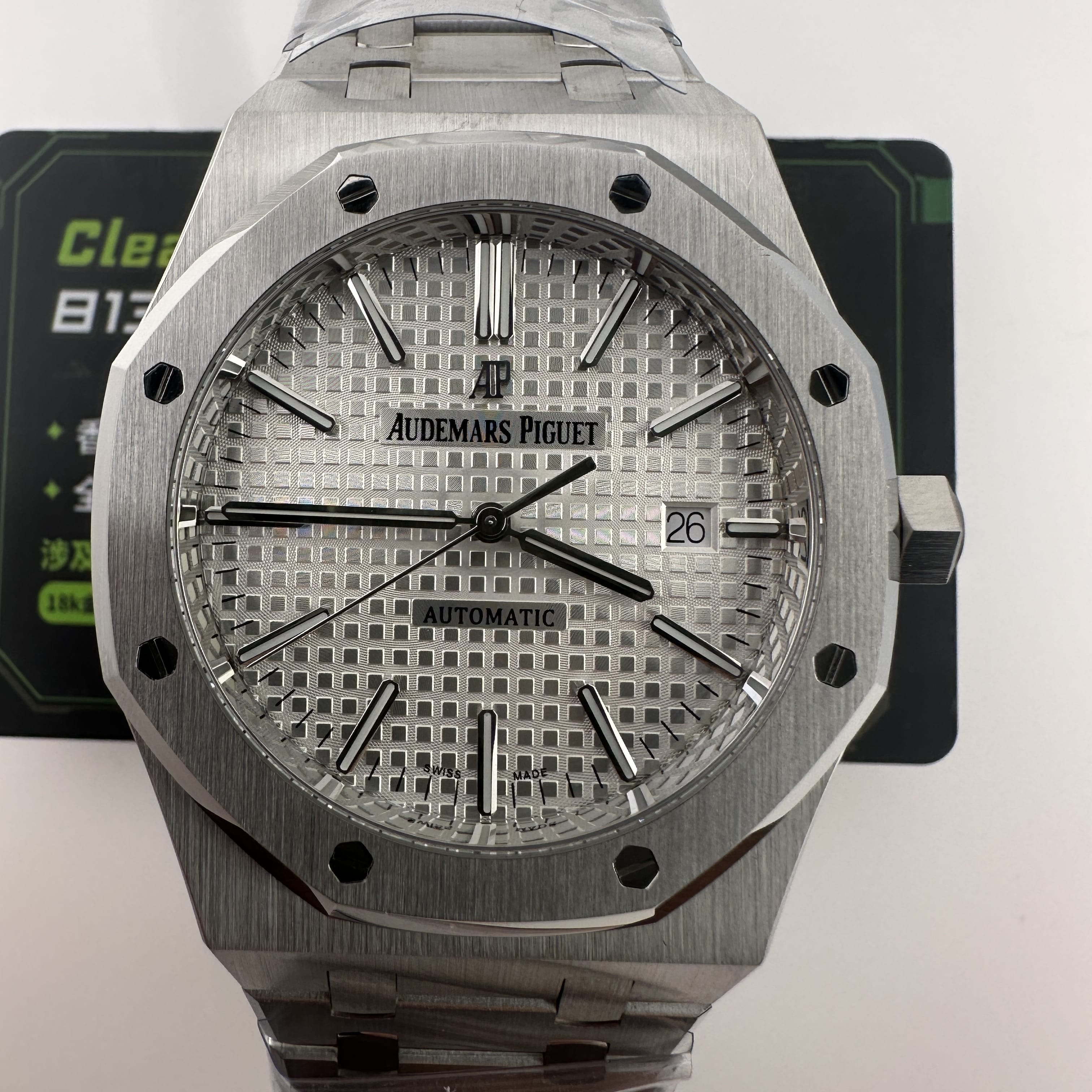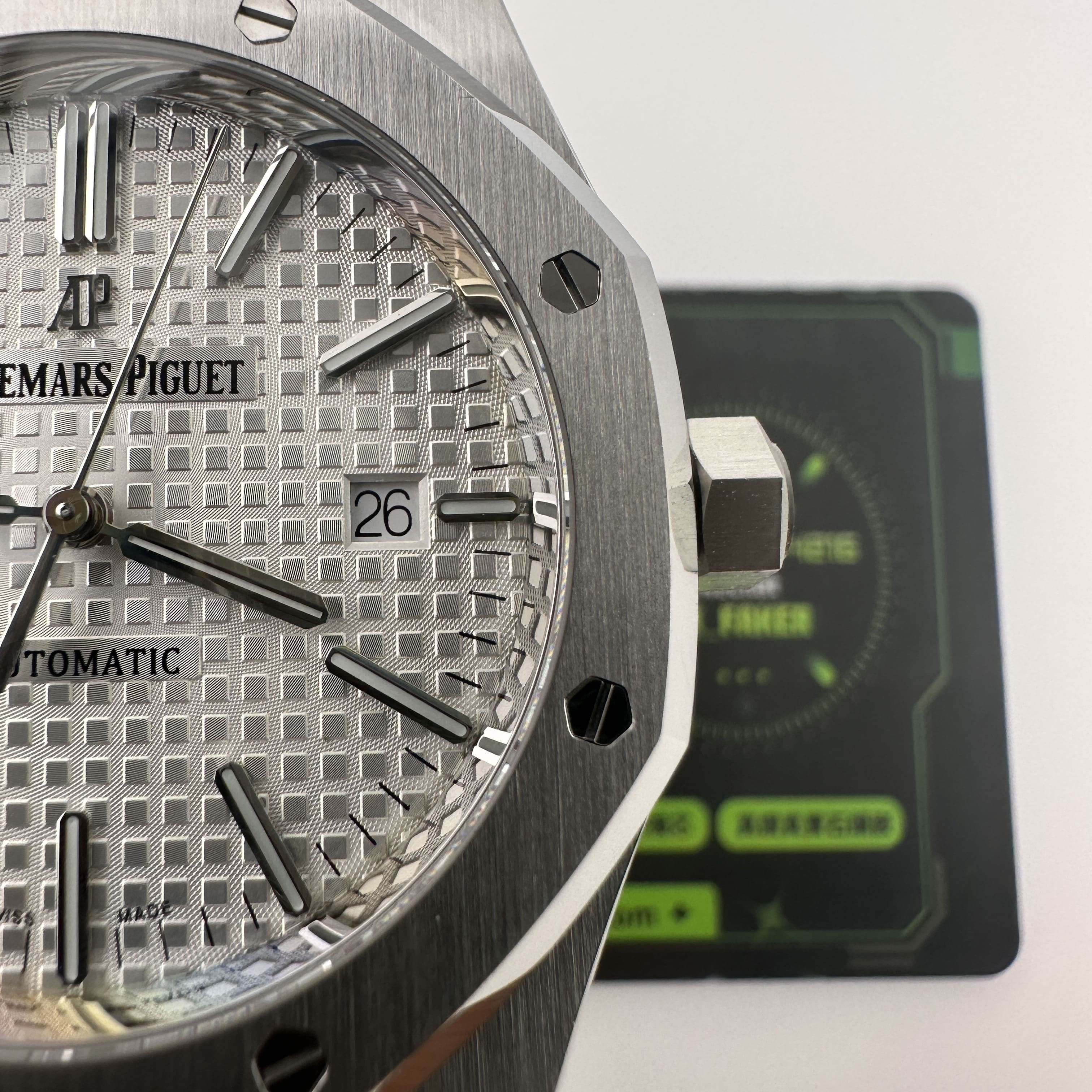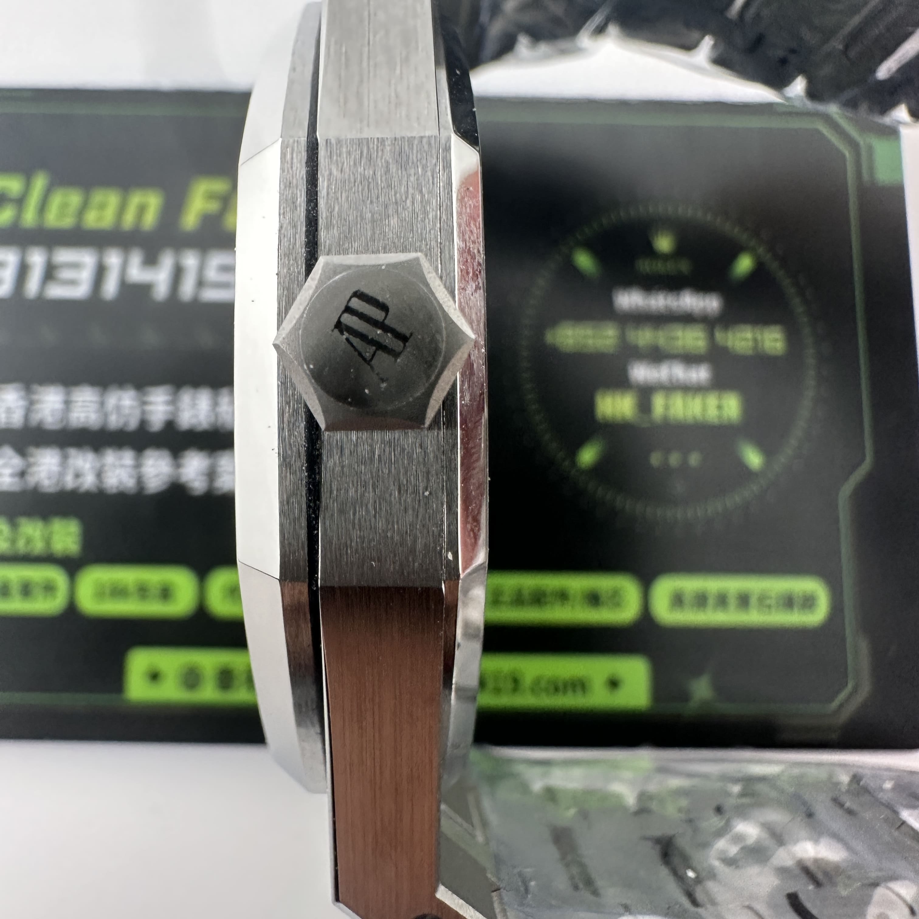 APS廠愛彼根據原版1:1打造而成,使用316L精鋼材質,整錶克重174克,手感部分已經達到原版級別.經典的八邊形圈口涉及,切割面與拋光面足以證明APS廠頂級製作工藝呈現.銀白色錶盤作為純色面與黑色錶盤同樣形成"杜絕一眼假".黑白配色很難看出是否存在色差.同時高仿市面上也配備了錶盤,指針,中軸,日曆,玻璃滿配改裝案例,主要針對高仿愛彼15400以及其他錶款存在的盤面細節處理不對版進行復原.機芯配置了一體3120機芯,走時誤差標準,性能穩定.