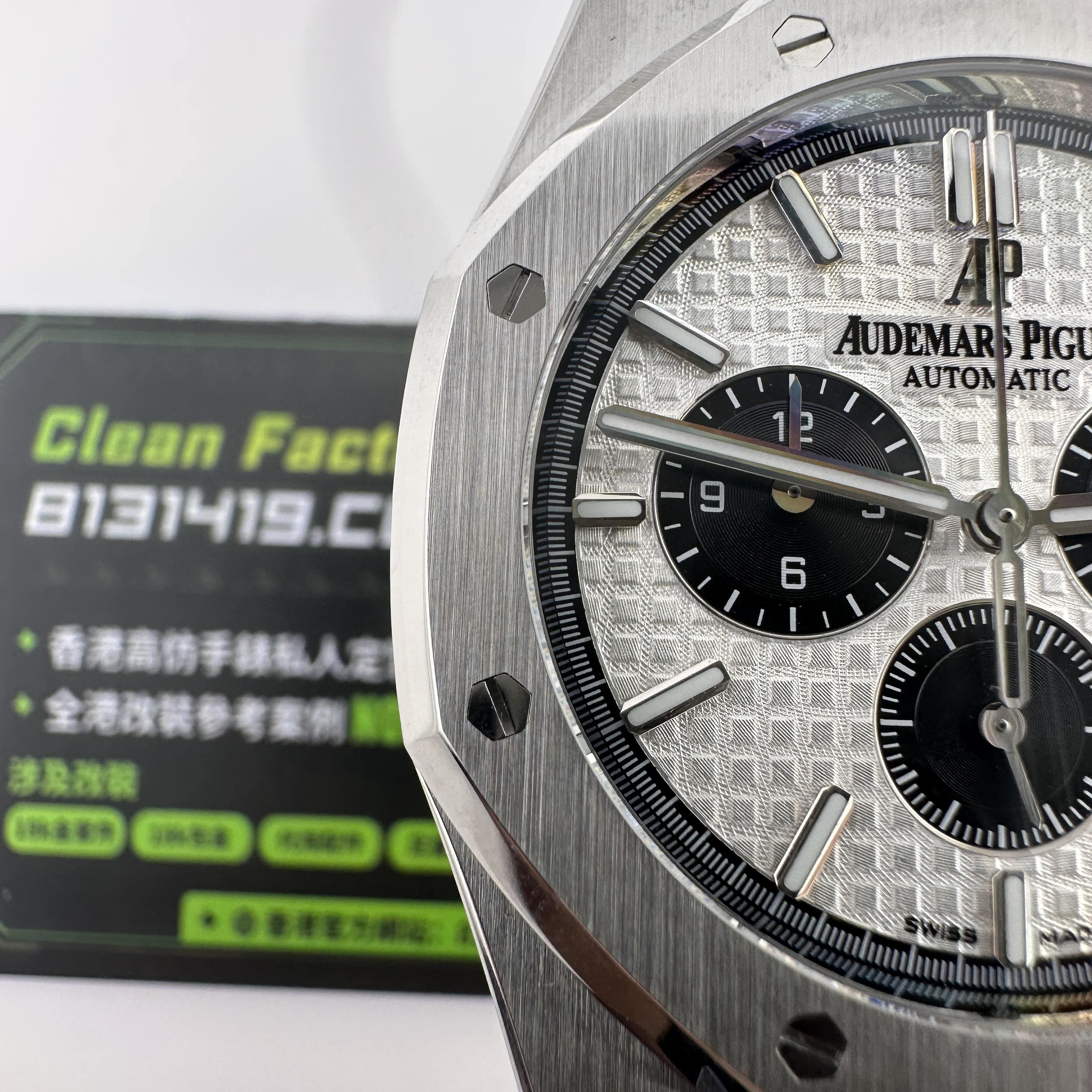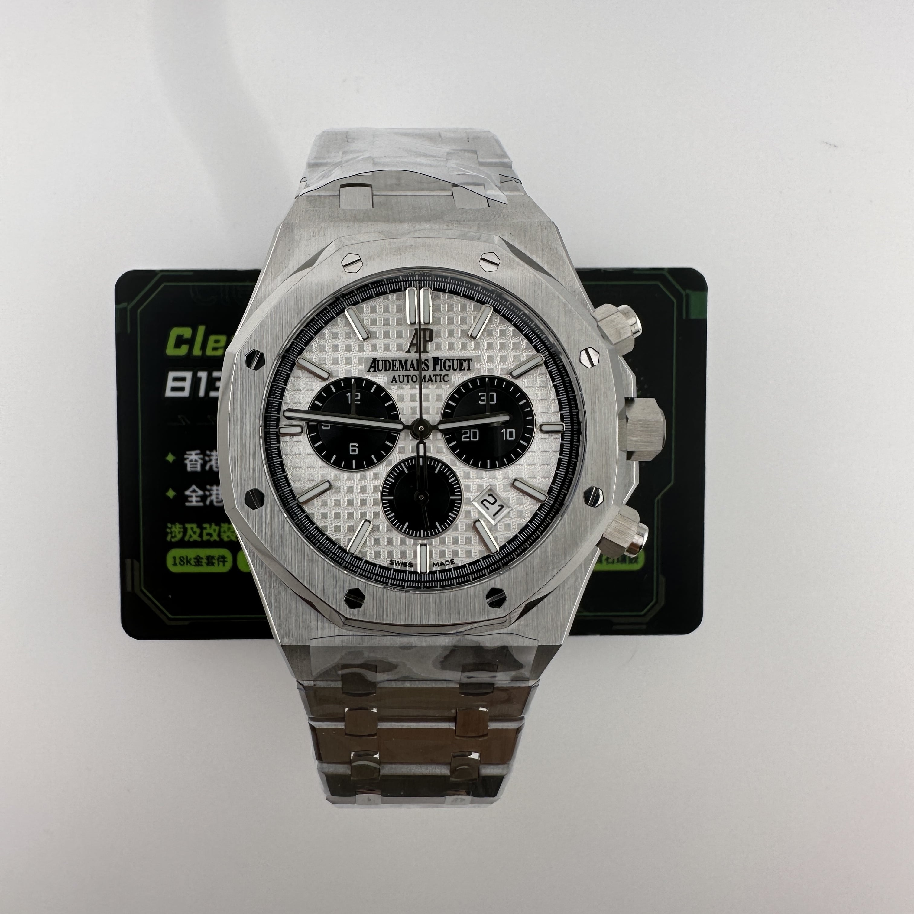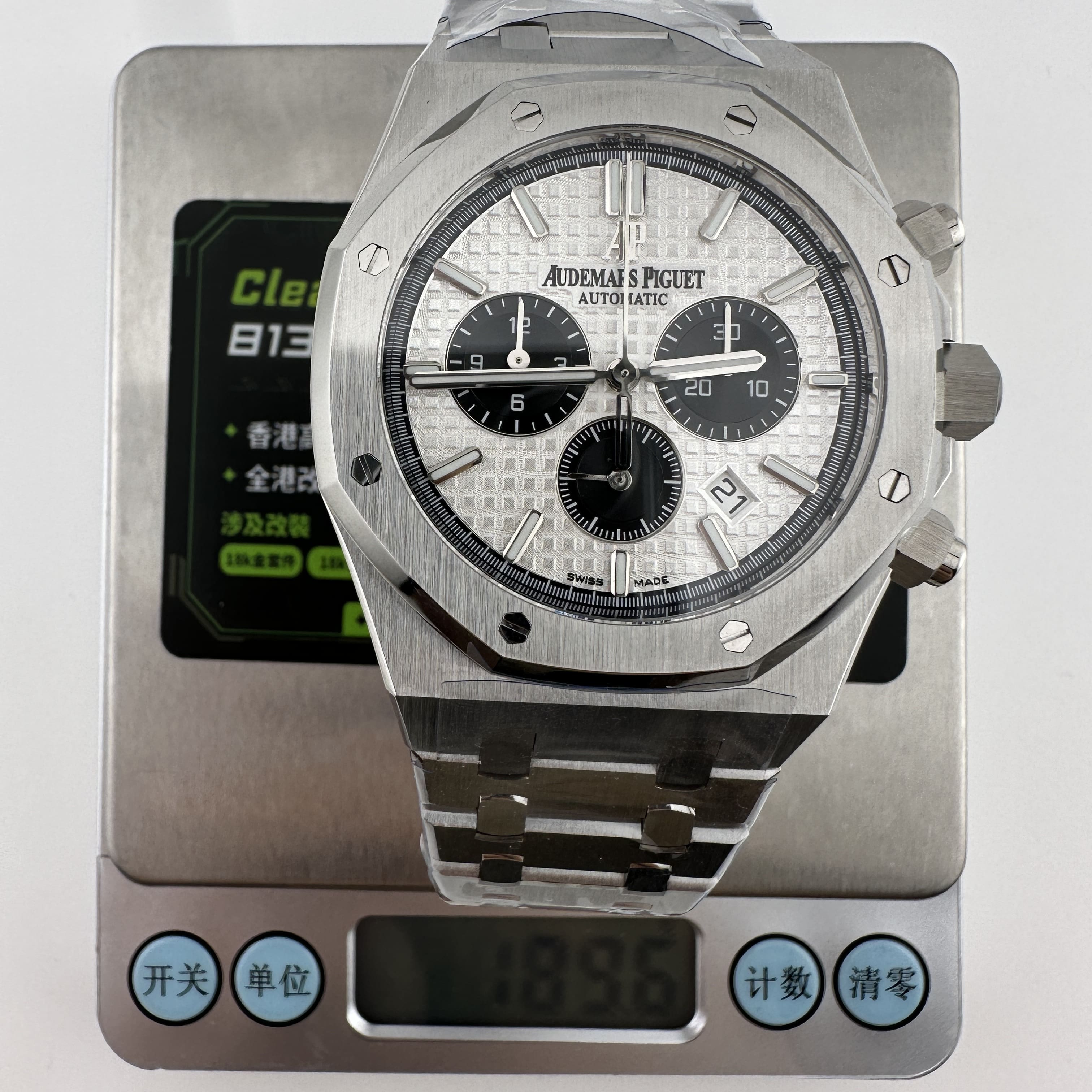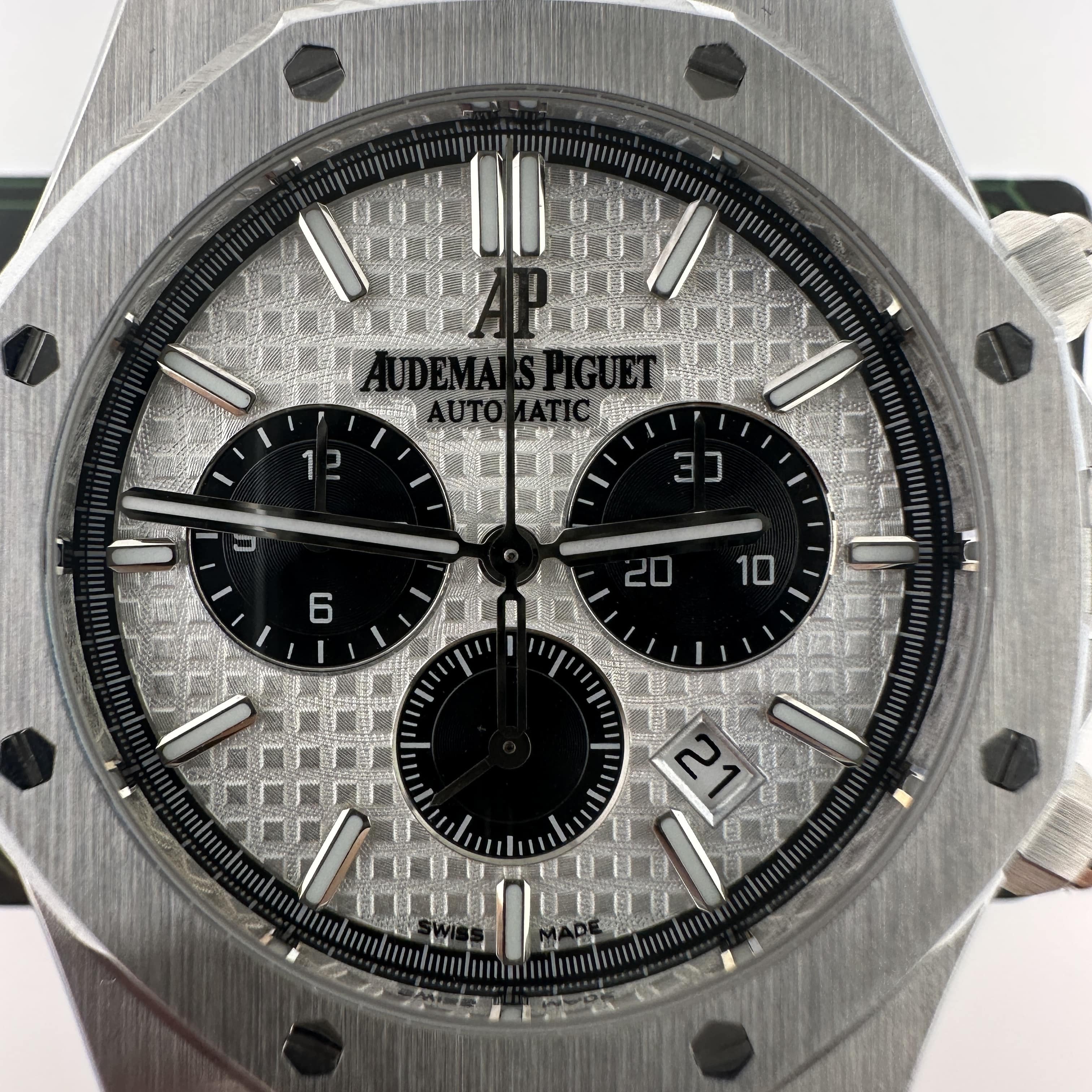 APW廠推出的AP愛彼皇家橡樹系列26331ST白熊貓,整錶尺寸41mm,錶殼做到了同步原版11mm厚薄度,對於一款精鋼腕錶做到同步原版厚薄度的工藝極其針對復刻技術的含金量!原裝正品採用316L精鋼材質打造而成,APW廠也是使用到316L精鋼打造1:1規格復原!26331熊貓款式的簡稱是通過盤面內部設有3個黑色小小錶盤,分別代表了計時功能,秒針顯示,而白色的錶盤搭配黑色的計時小圈,形成鮮明的對比.