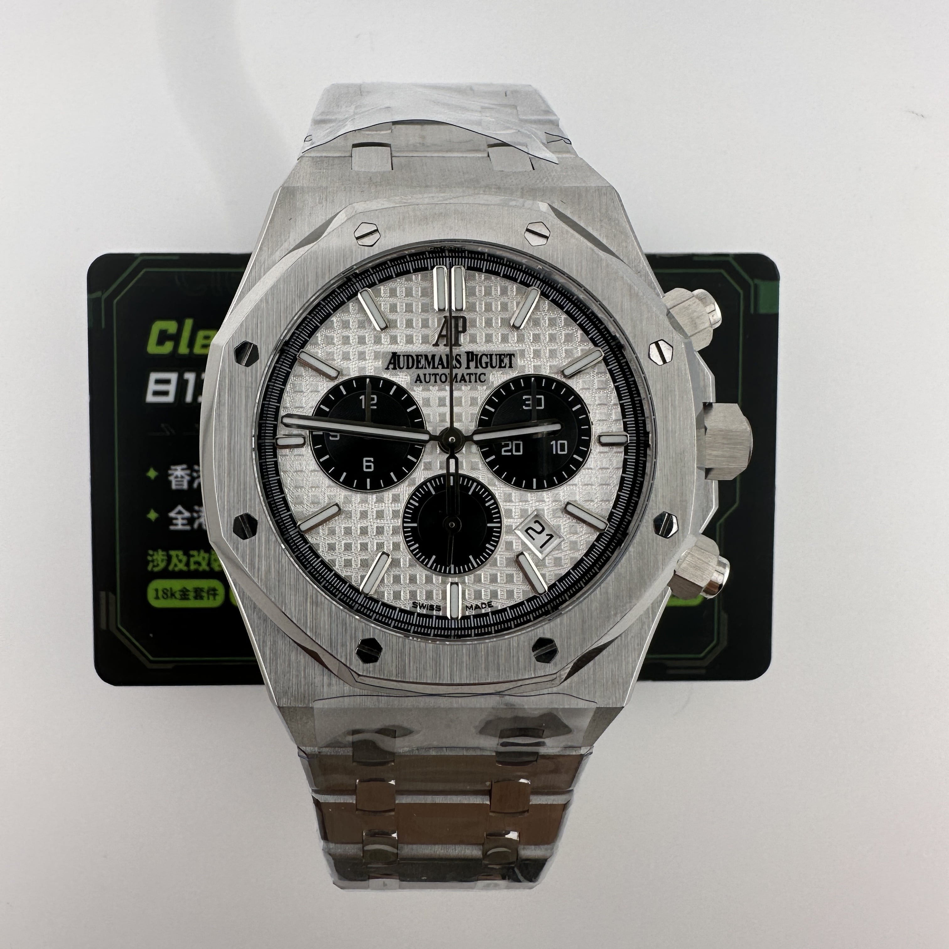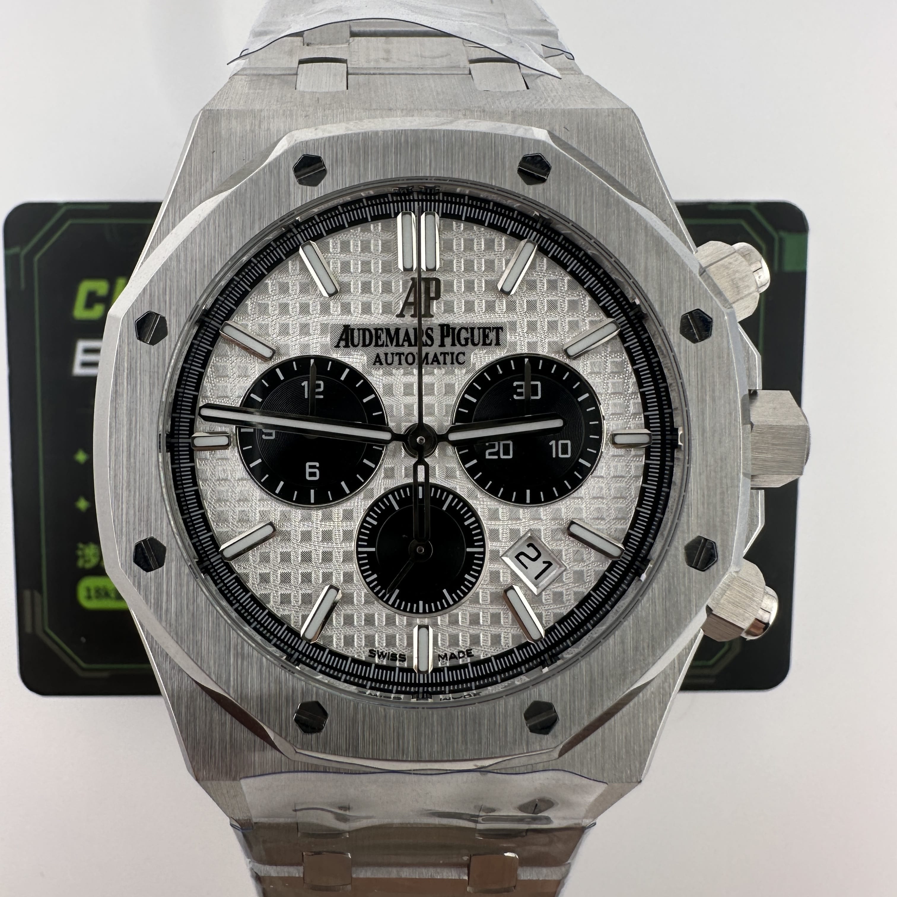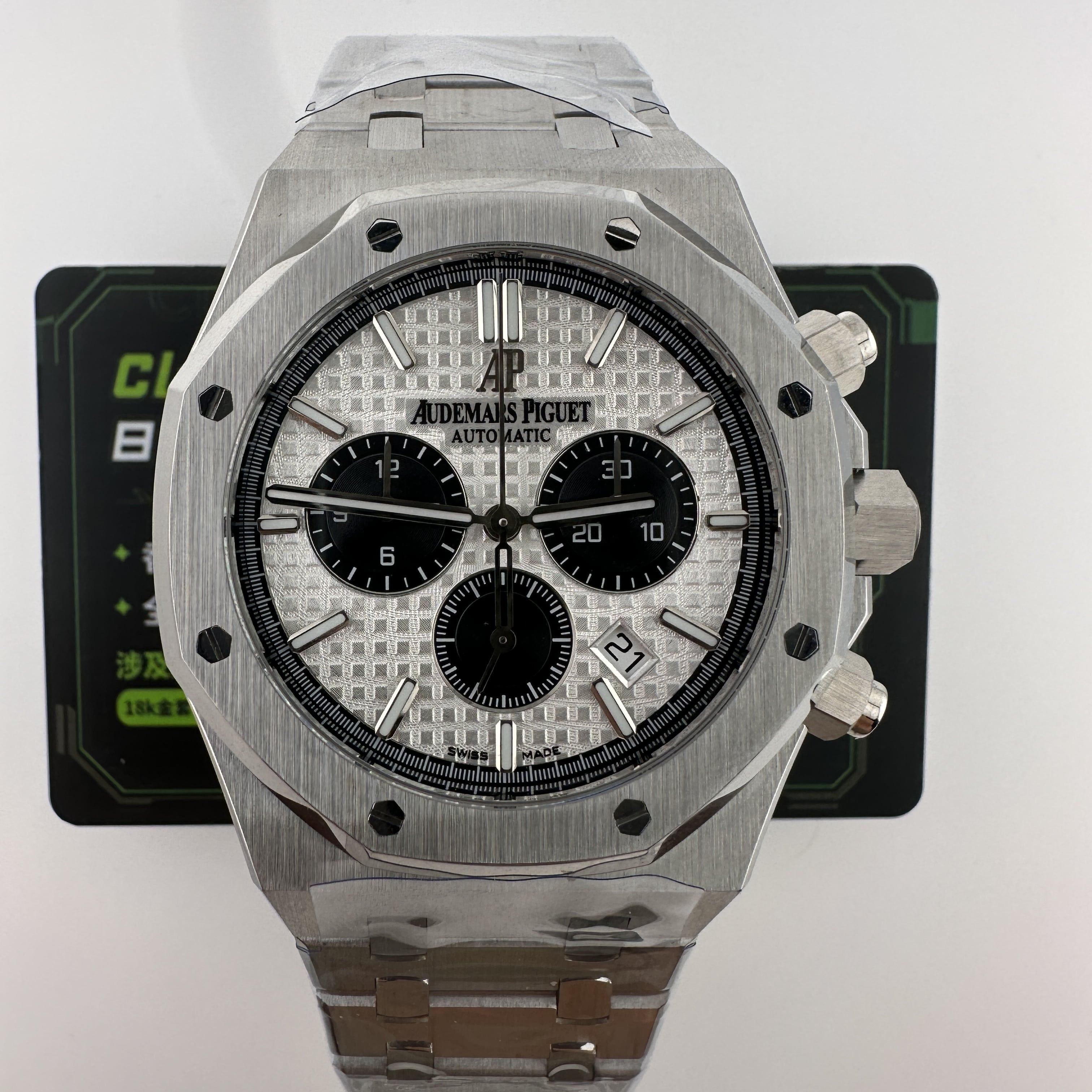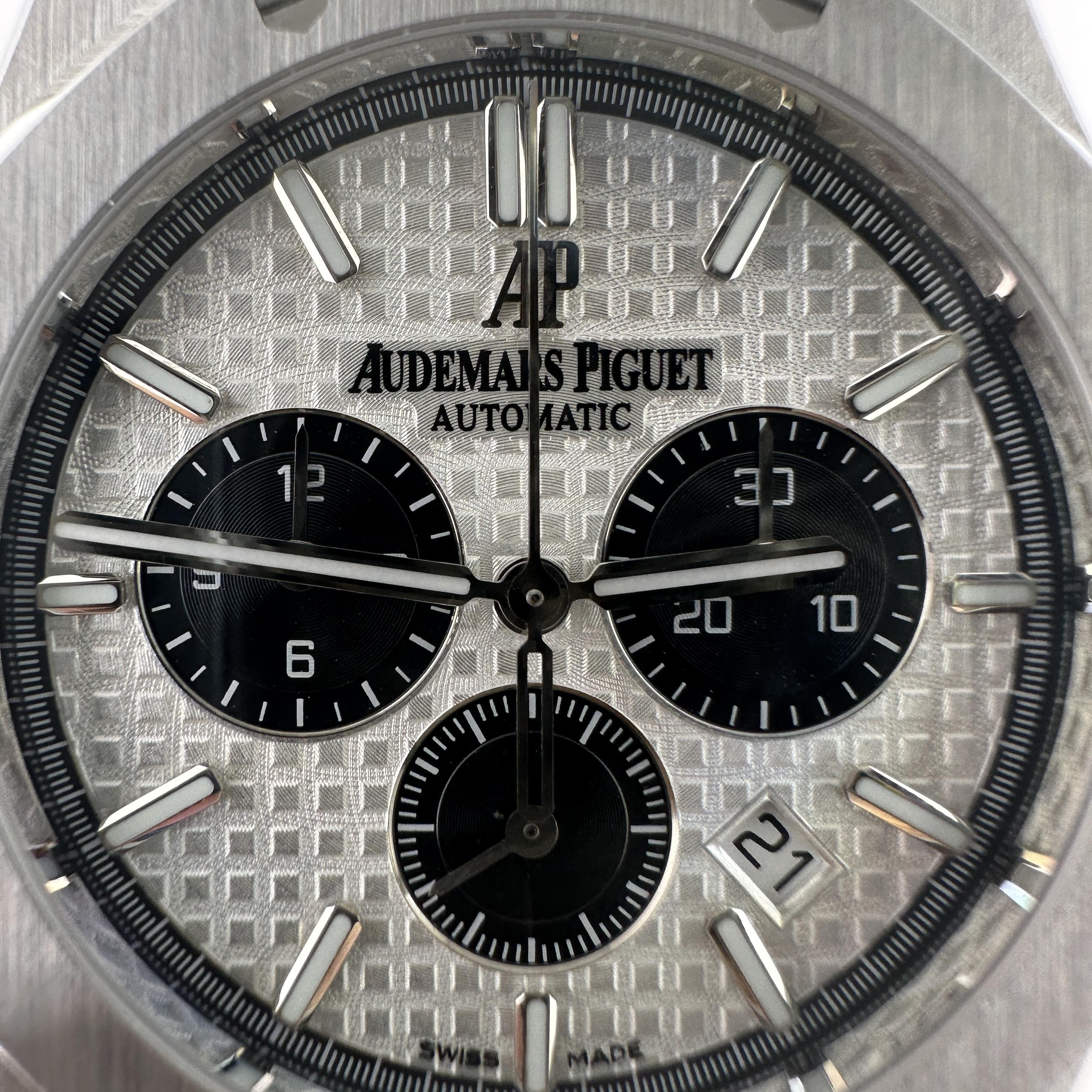 APW廠推出的AP愛彼皇家橡樹系列26331ST白熊貓,整錶尺寸41mm,錶殼做到了同步原版11mm厚薄度,對於一款精鋼腕錶做到同步原版厚薄度的工藝極其針對復刻技術的含金量!原裝正品採用316L精鋼材質打造而成,APW廠也是使用到316L精鋼打造1:1規格復原!26331熊貓款式的簡稱是通過盤面內部設有3個黑色小小錶盤,分別代表了計時功能,秒針顯示,而白色的錶盤搭配黑色的計時小圈,形成鮮明的對比.