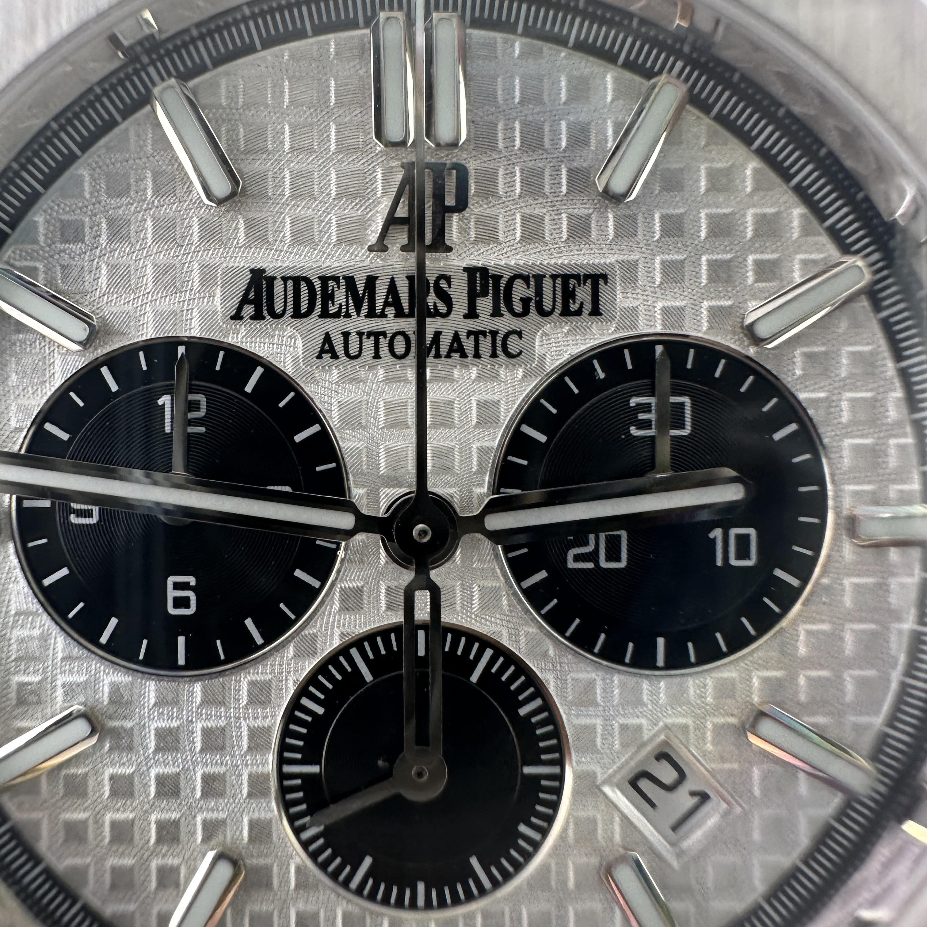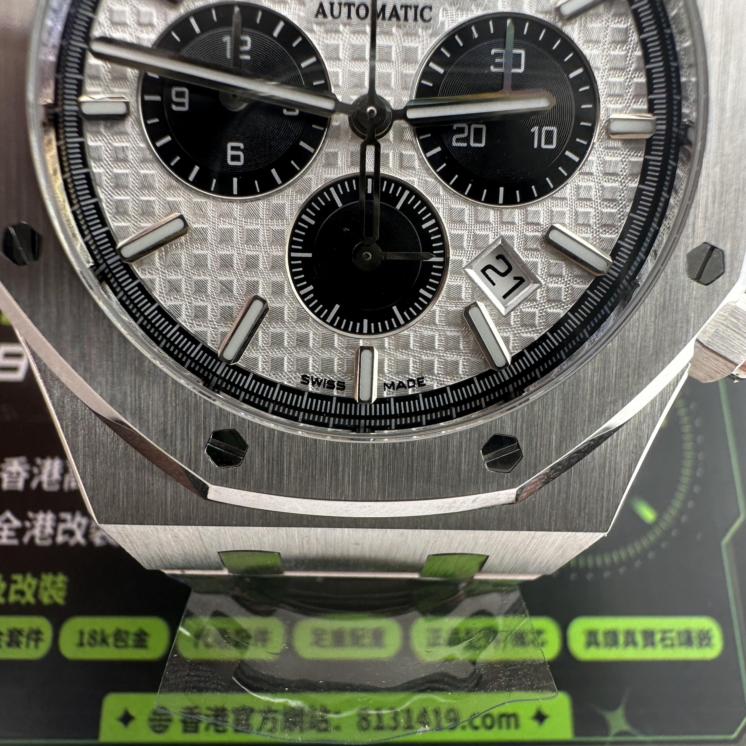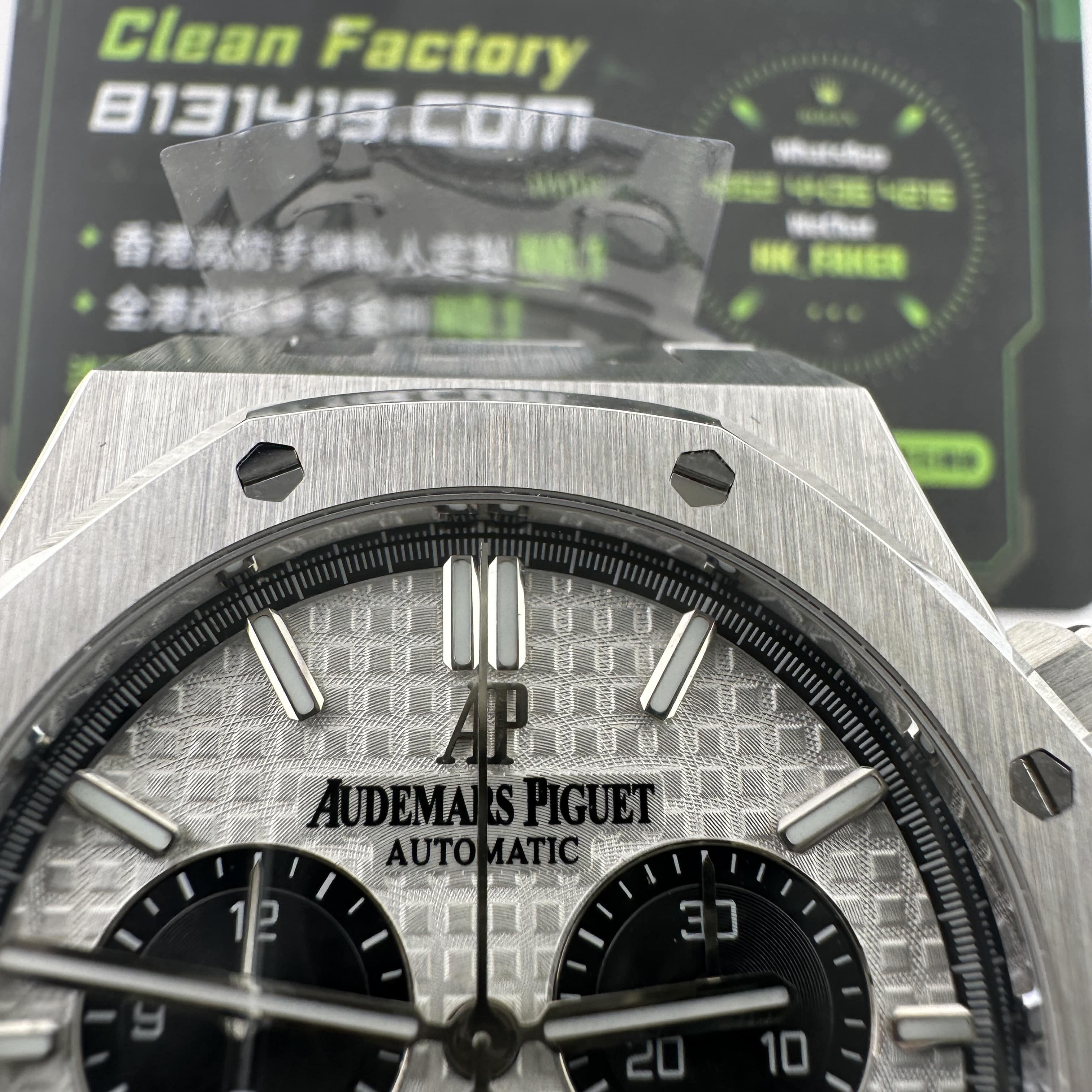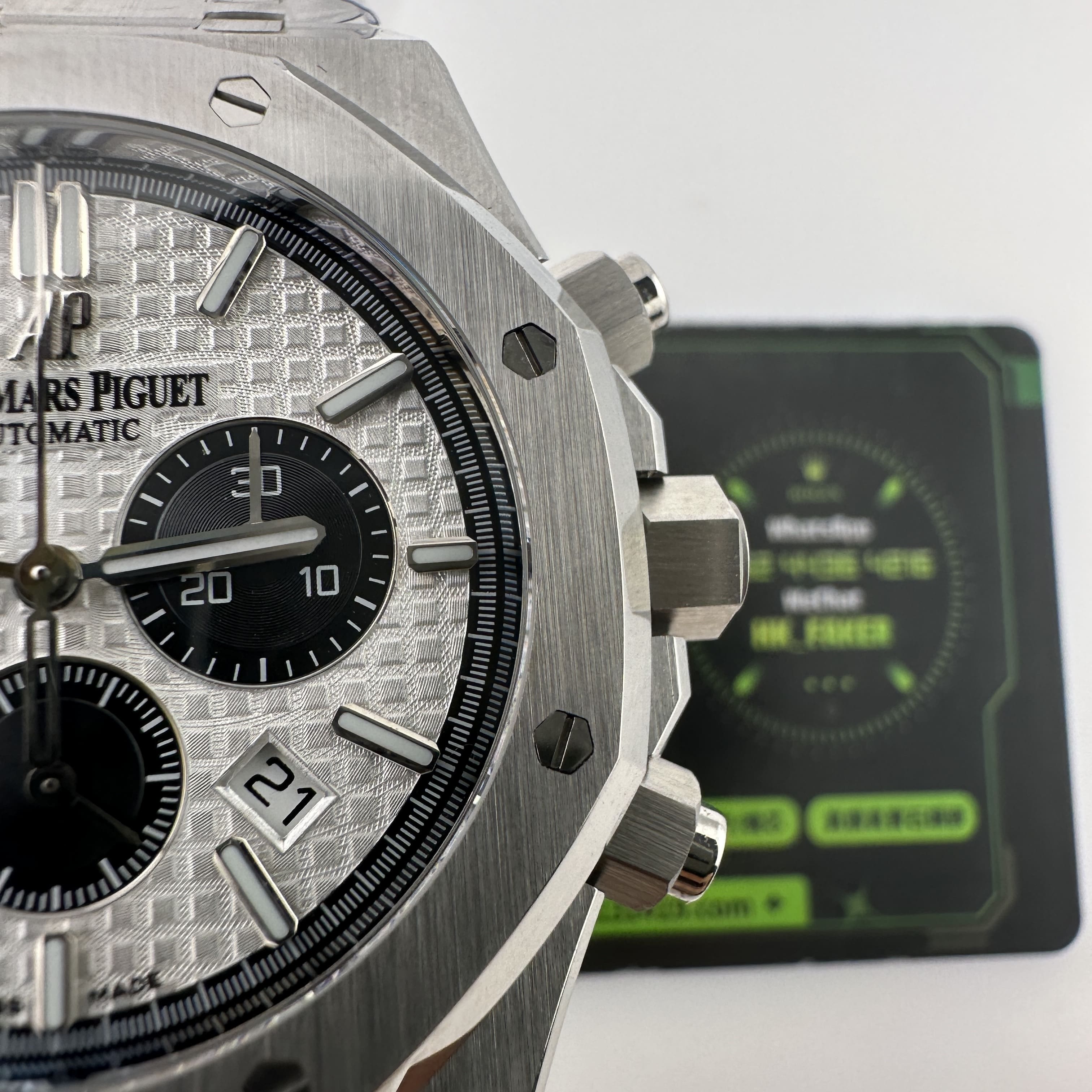 APW廠推出的AP愛彼皇家橡樹系列26331ST白熊貓,整錶尺寸41mm,錶殼做到了同步原版11mm厚薄度,對於一款精鋼腕錶做到同步原版厚薄度的工藝極其針對復刻技術的含金量!原裝正品採用316L精鋼材質打造而成,APW廠也是使用到316L精鋼打造1:1規格復原!26331熊貓款式的簡稱是通過盤面內部設有3個黑色小小錶盤,分別代表了計時功能,秒針顯示,而白色的錶盤搭配黑色的計時小圈,形成鮮明的對比.