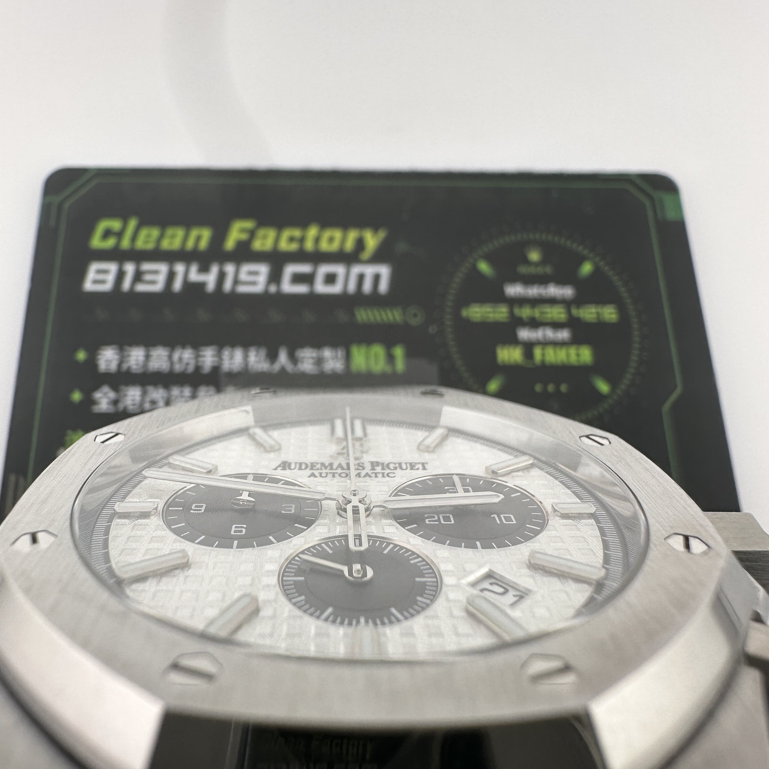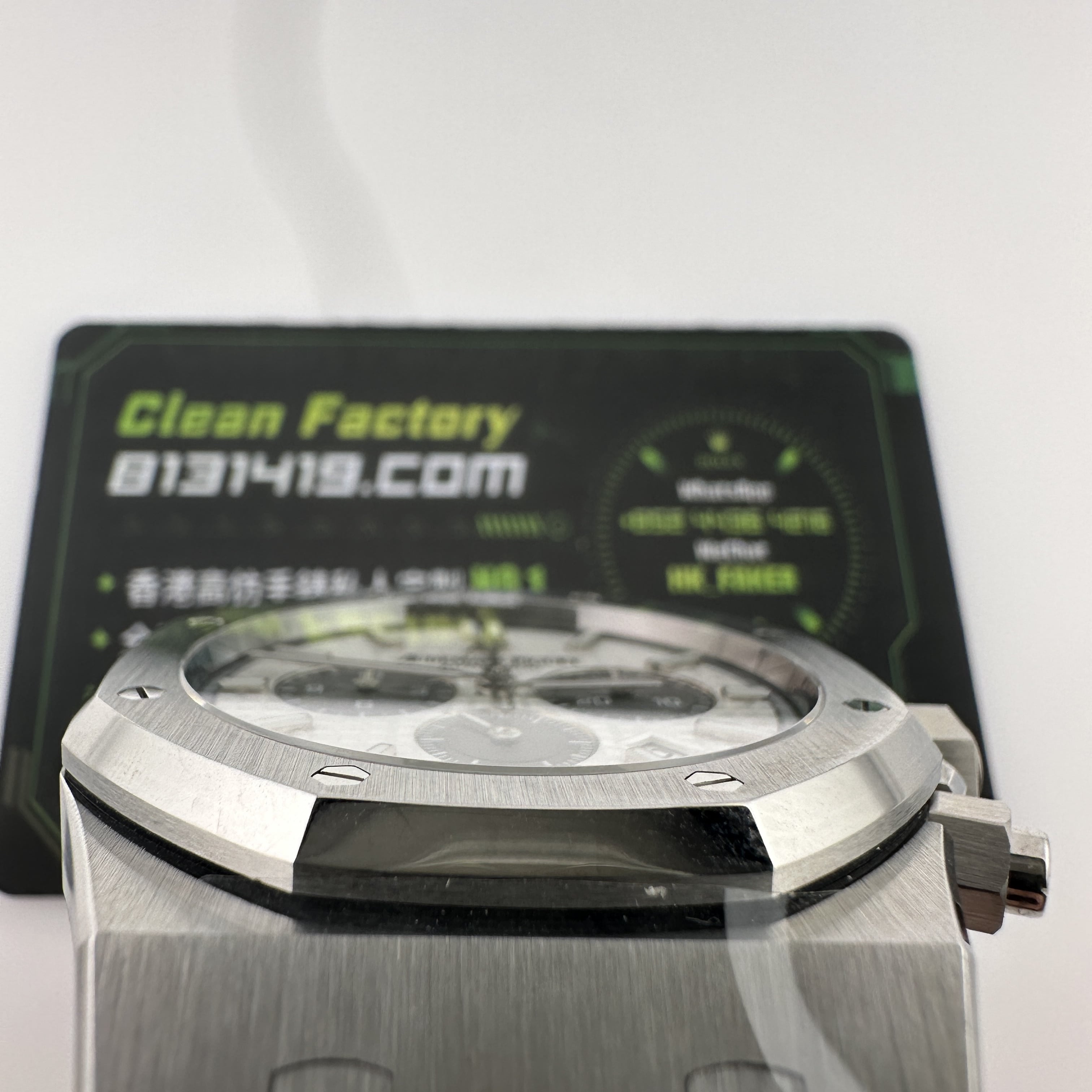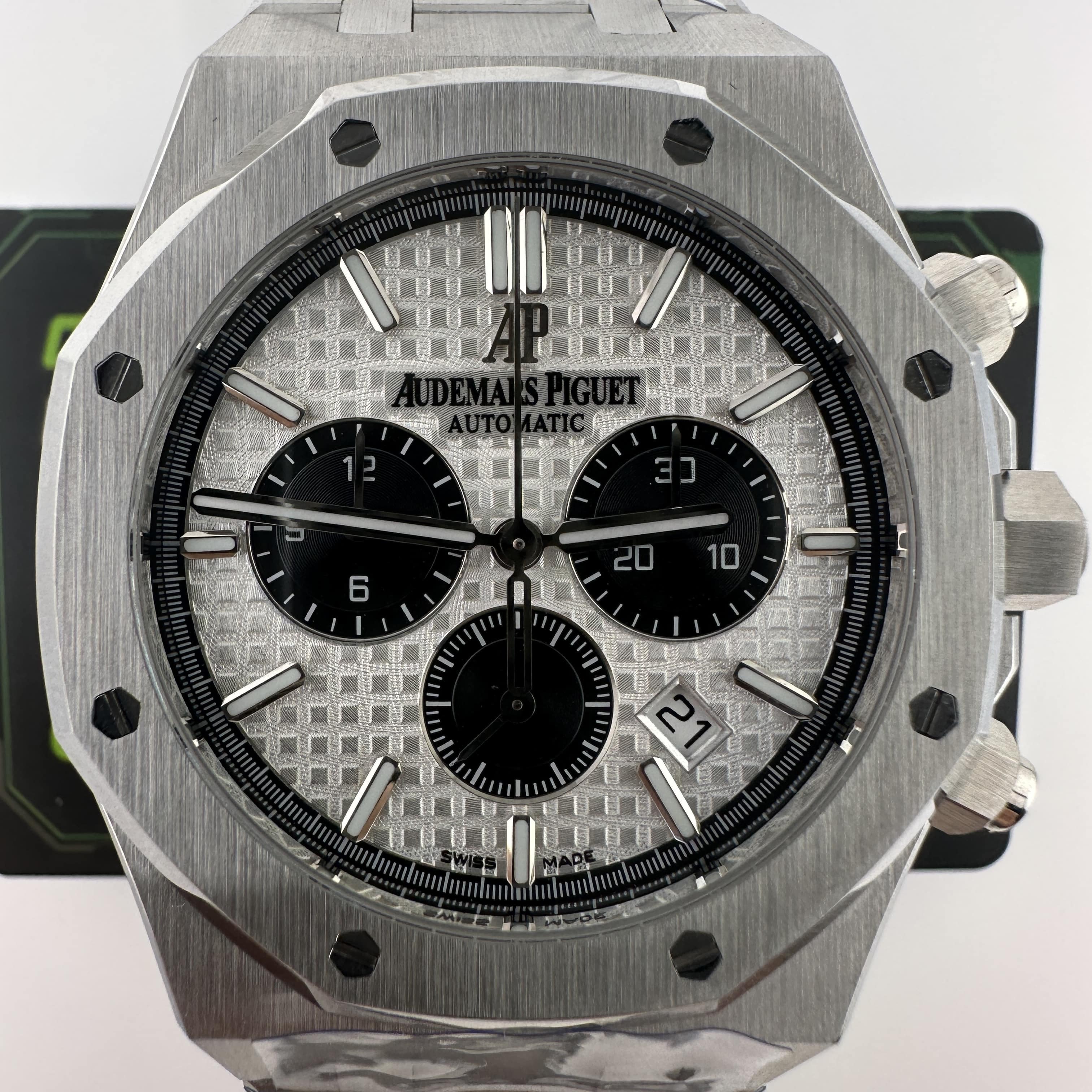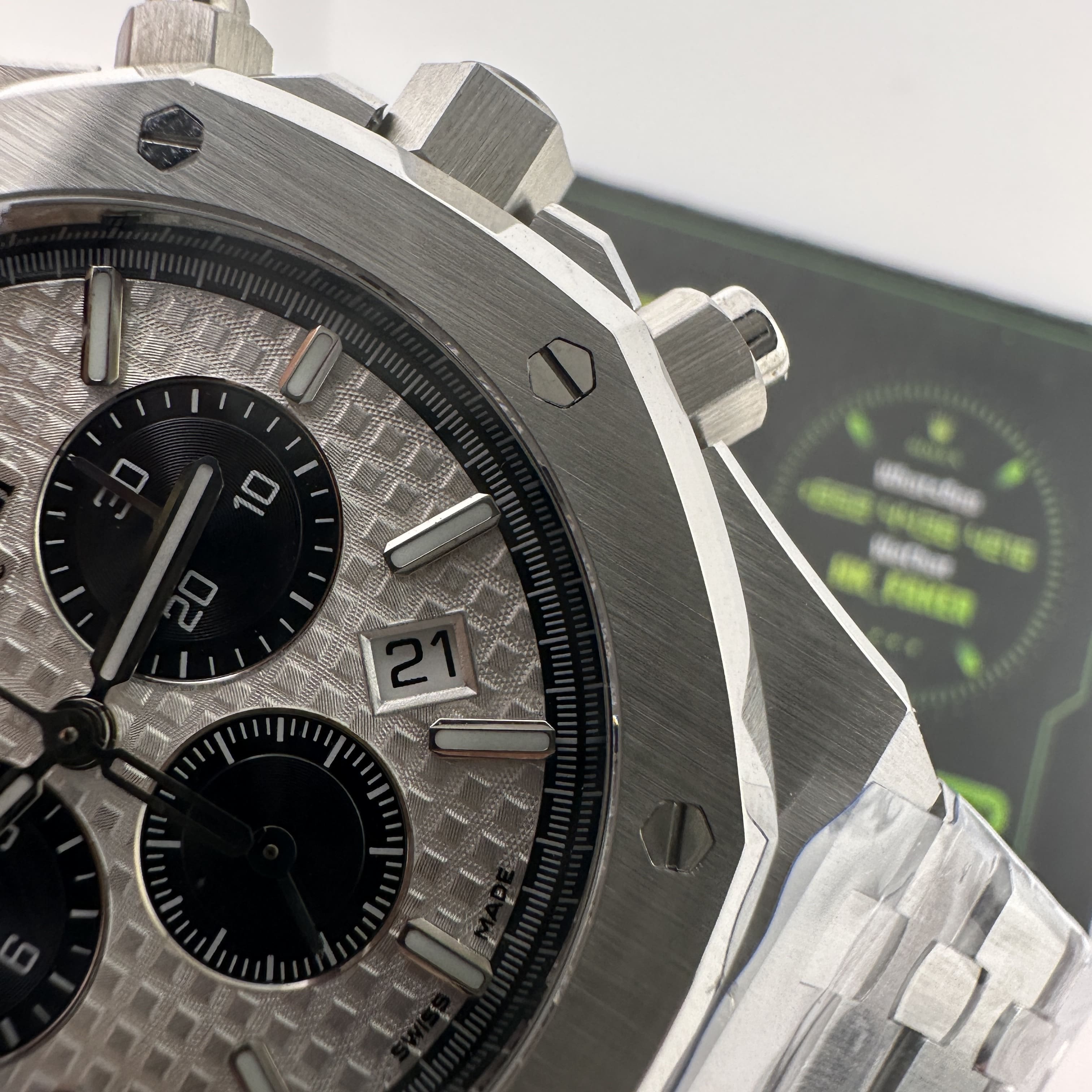 APW廠推出的AP愛彼皇家橡樹系列26331ST白熊貓,整錶尺寸41mm,錶殼做到了同步原版11mm厚薄度,對於一款精鋼腕錶做到同步原版厚薄度的工藝極其針對復刻技術的含金量!原裝正品採用316L精鋼材質打造而成,APW廠也是使用到316L精鋼打造1:1規格復原!26331熊貓款式的簡稱是通過盤面內部設有3個黑色小小錶盤,分別代表了計時功能,秒針顯示,而白色的錶盤搭配黑色的計時小圈,形成鮮明的對比.