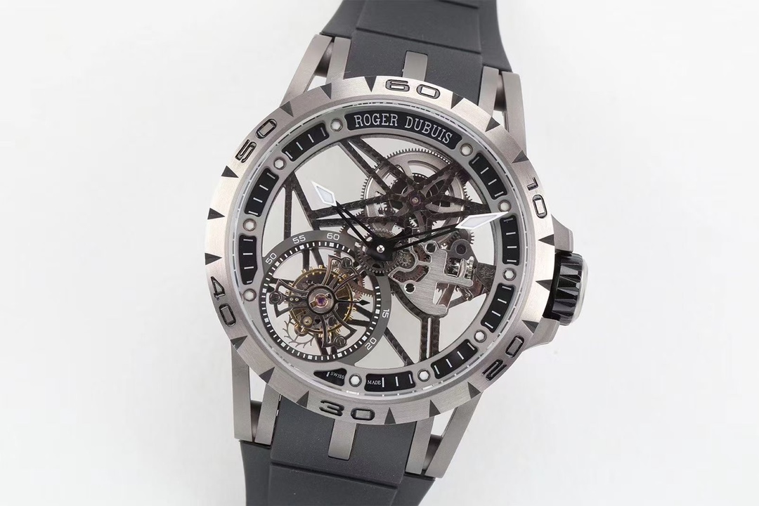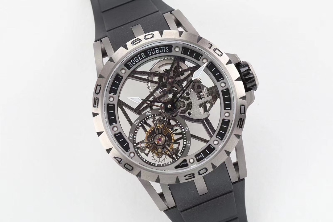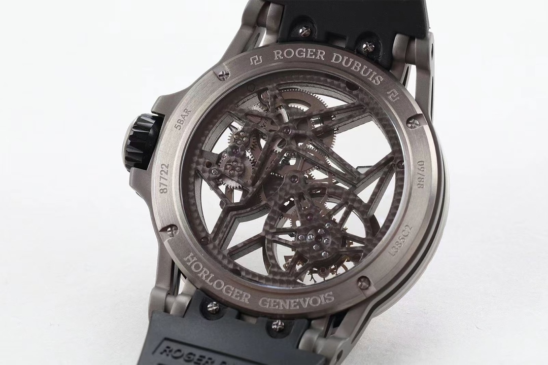 3.錶盤:採用了鏤空錶盤,夜光刻度,黑色DLC塗層鈦合金的秒盤印有黑色分鐘圈和Roger Dubuis(羅傑杜彼)字樣。 指針覆有夜光塗層,讀時簡單明瞭。