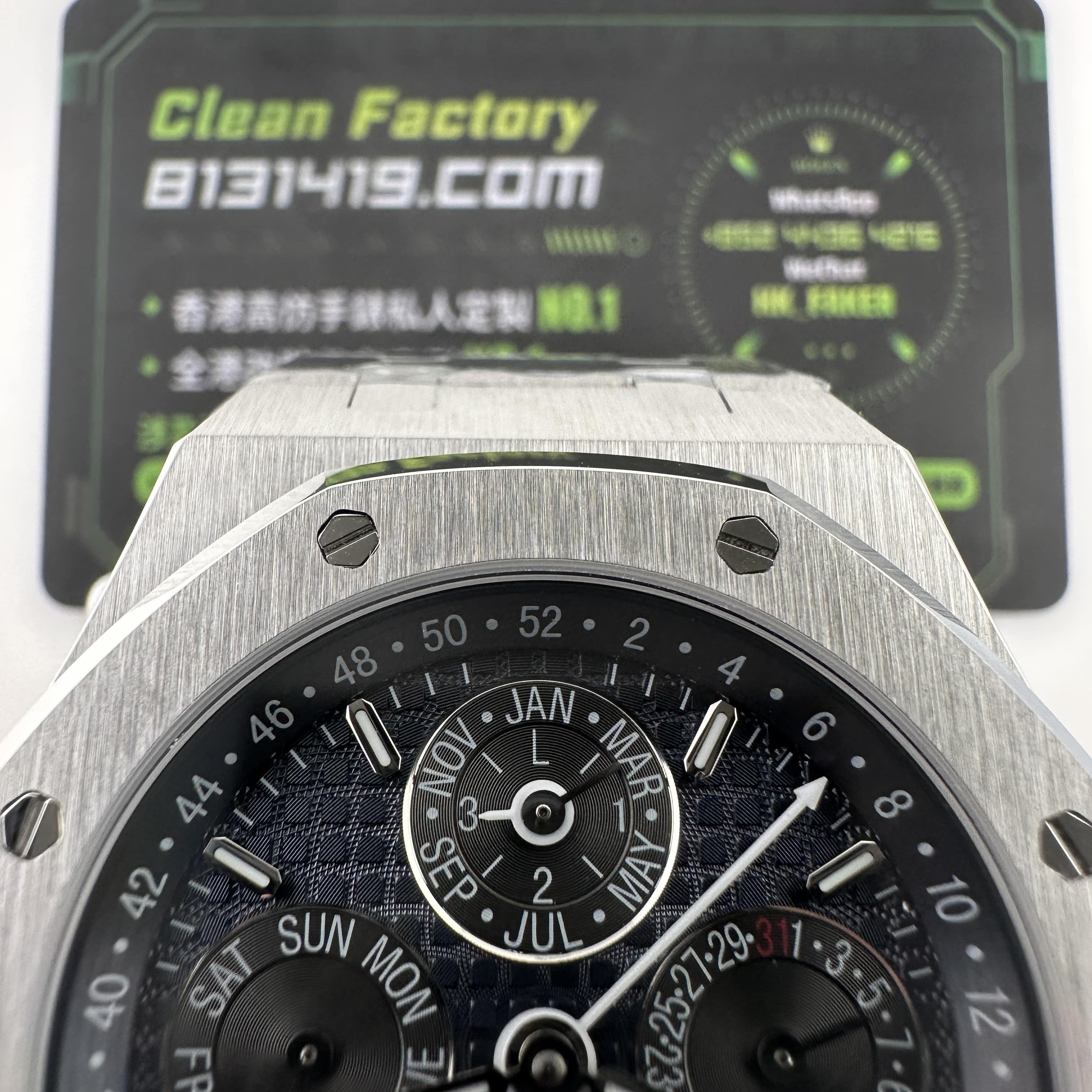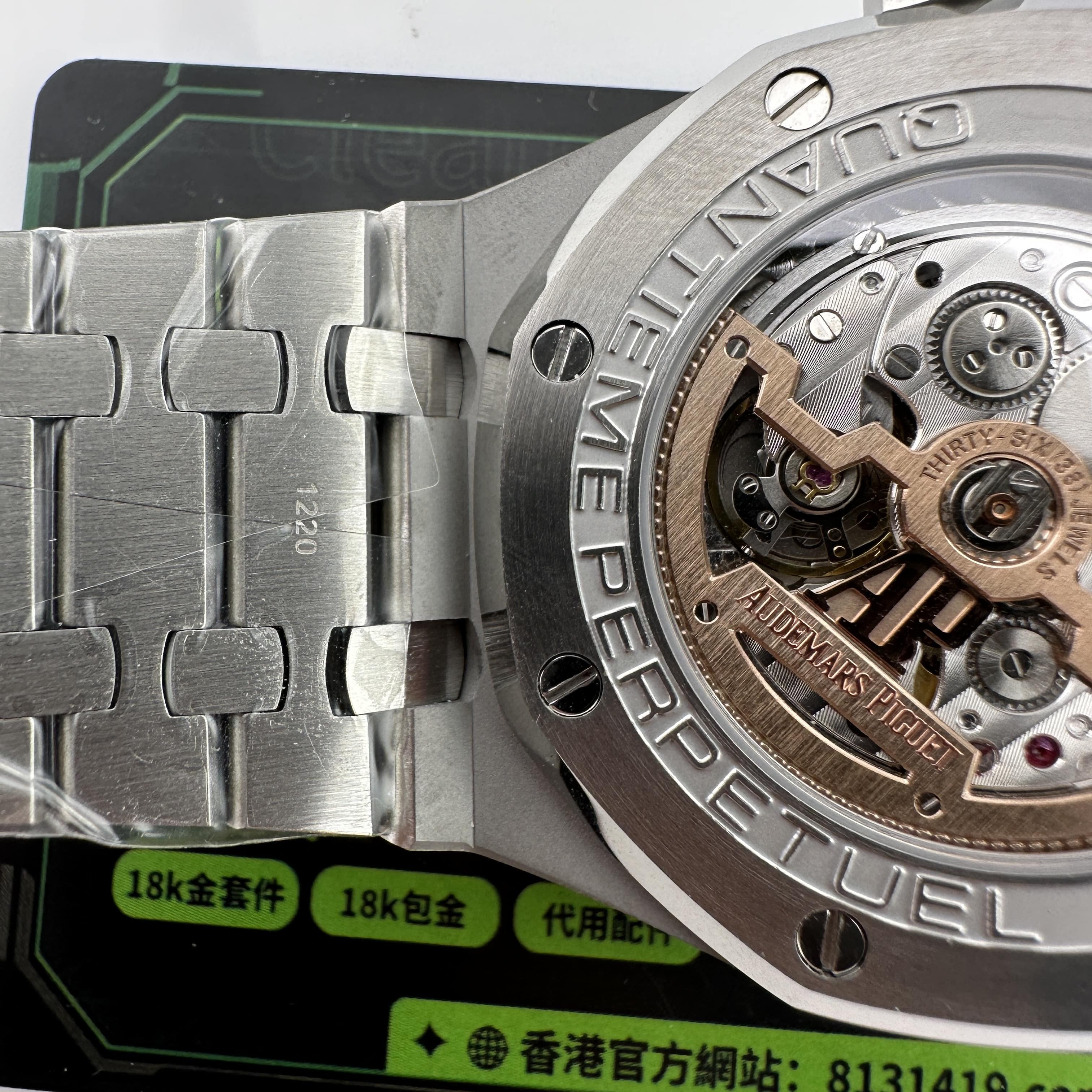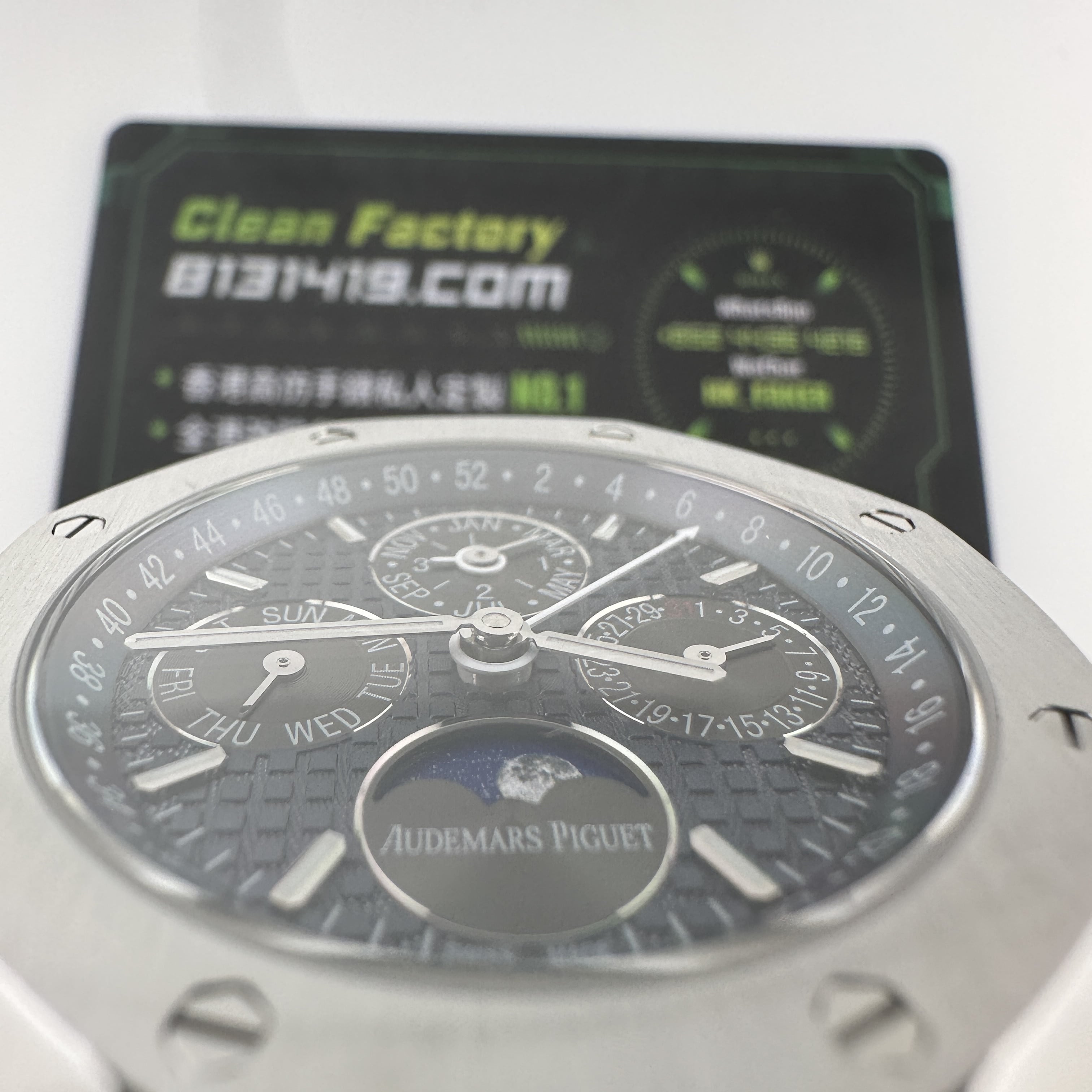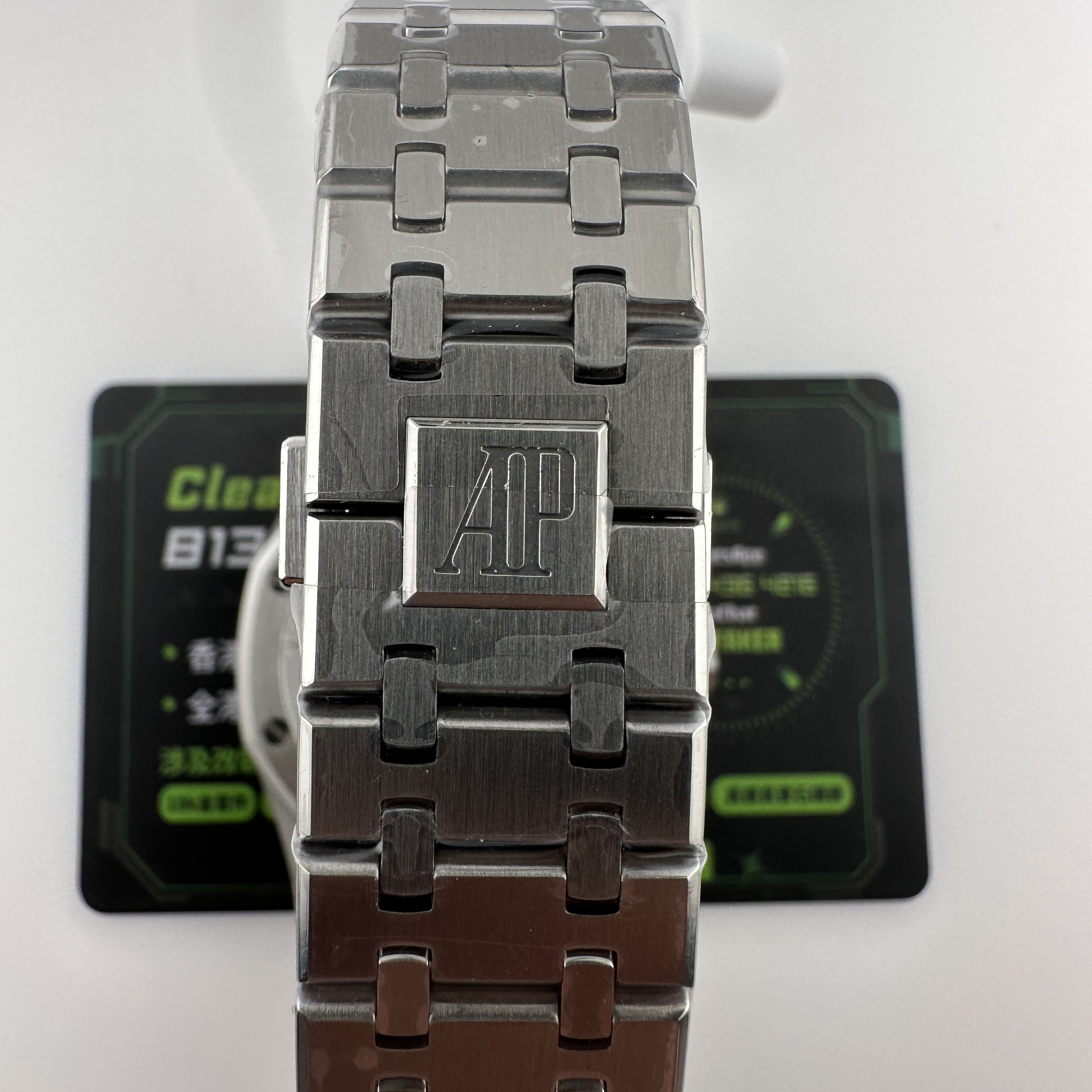 外觀構造是AP穿搭經典的八邊形塑造,BBS廠外觀精度打磨,拋光,錶殼部分以及錶帶部分是拉絲工藝,每一處拉絲類似無縫銜接的狀態,也表達了BBS廠26574萬年曆腕錶的性價比,看似便宜的錶款之一,但工藝層面上依舊是沿用標準的生產線製作而成.包括錶扣內部的噴砂工藝,BBS廠也是做到了對應的磨砂質感,與其他廠家不同的是BBS廠使用訂製版本的機芯就可以做到百分百全功能還原的狀態.