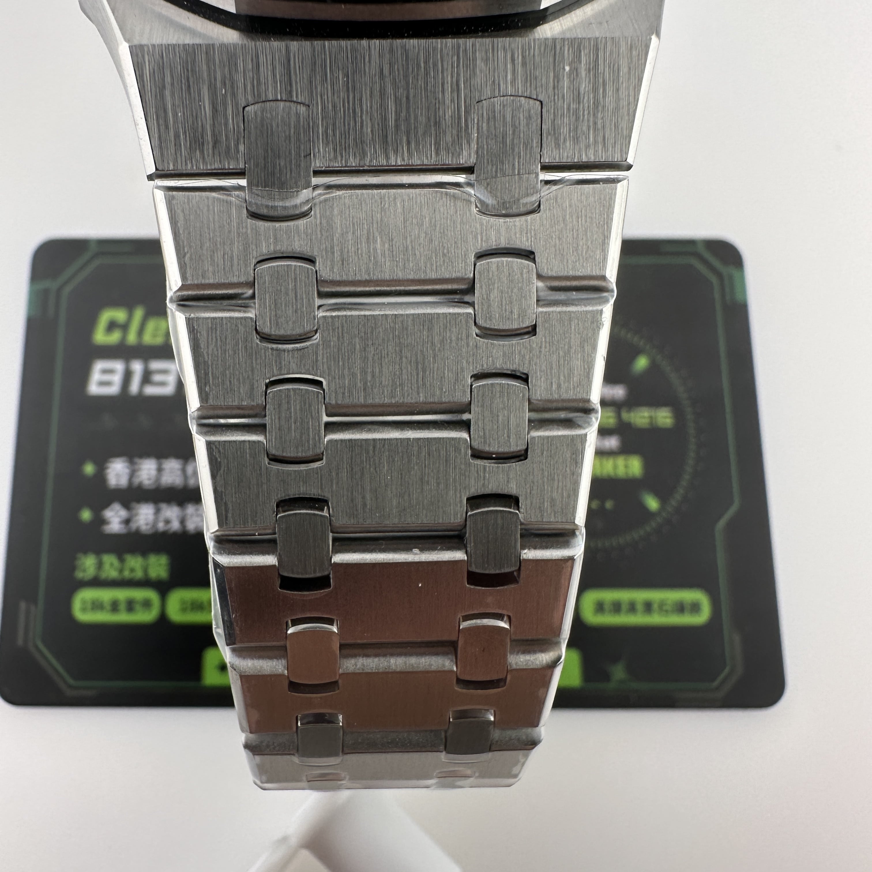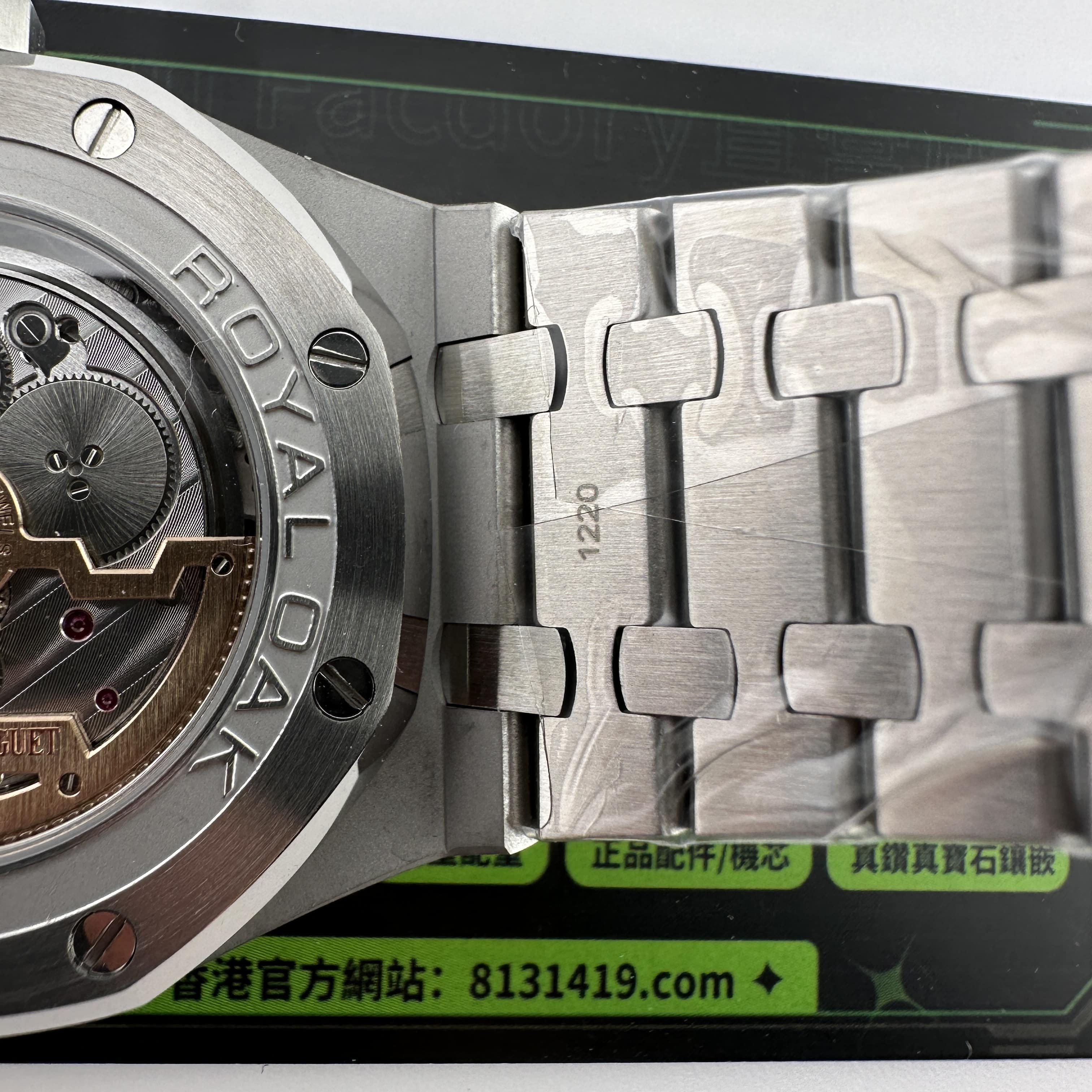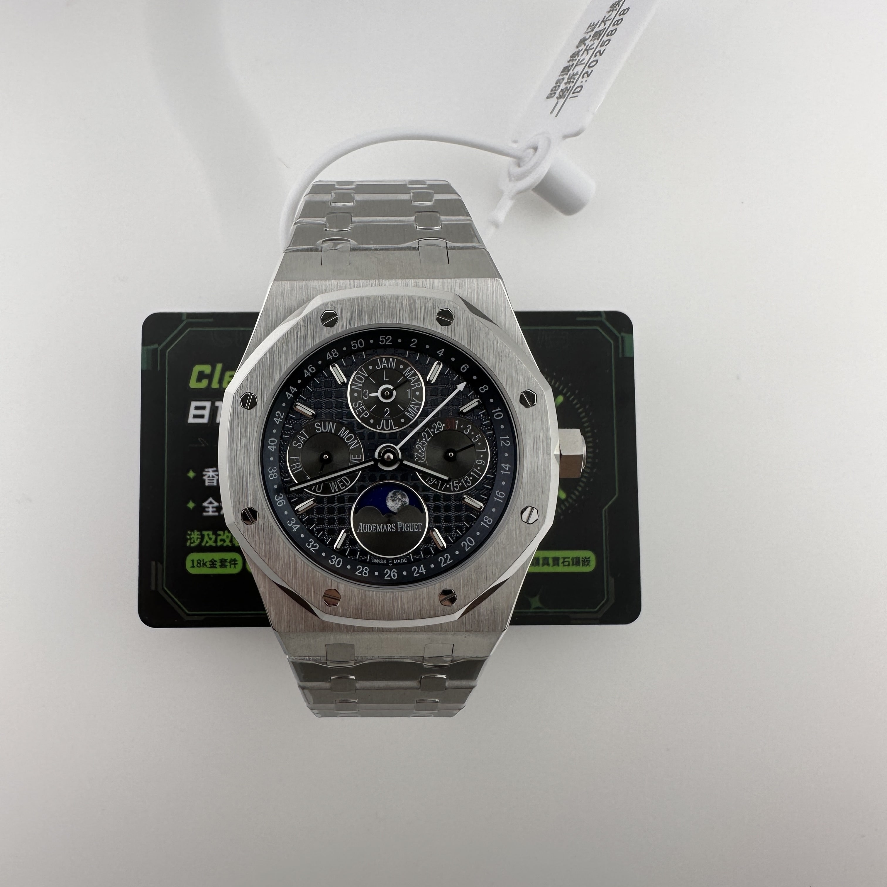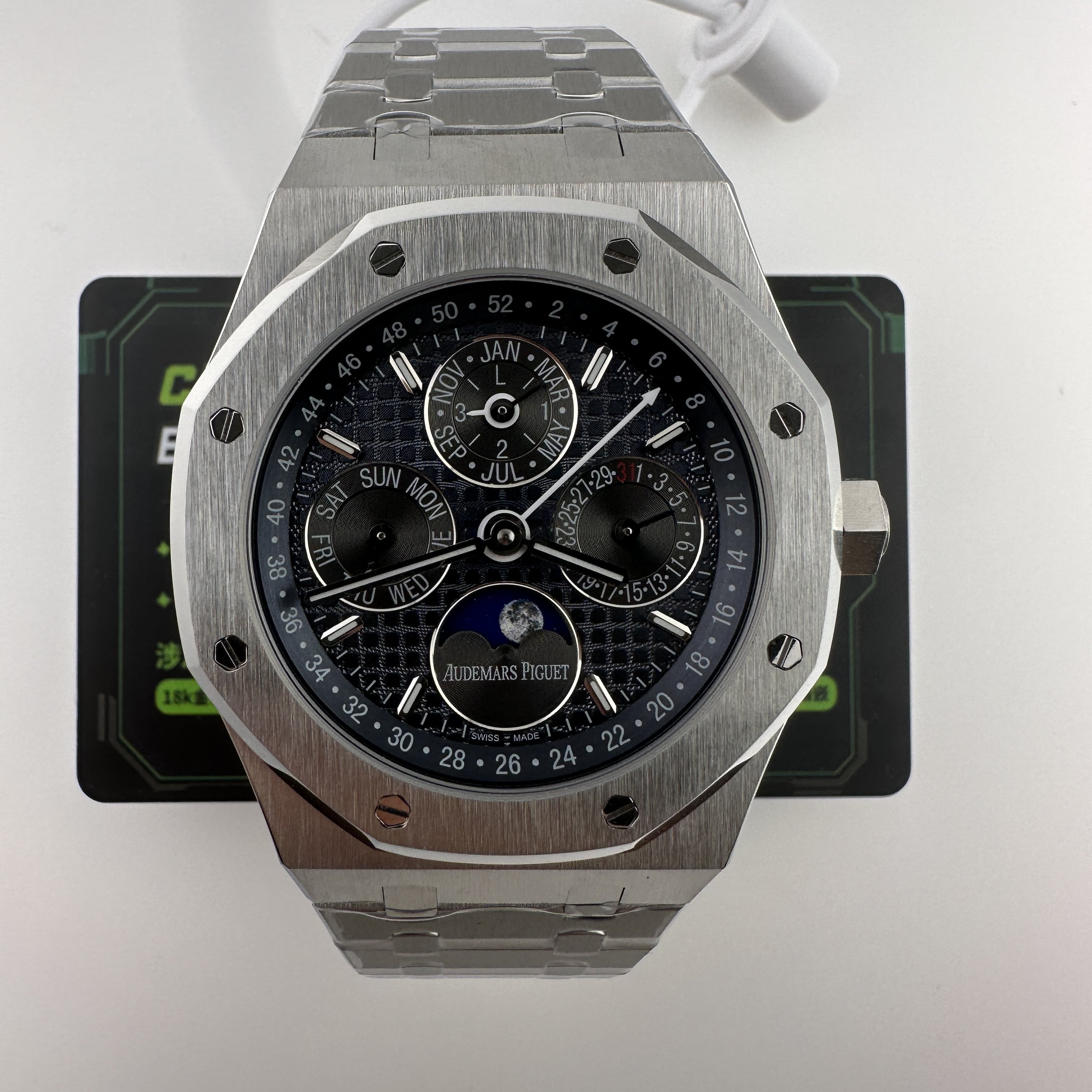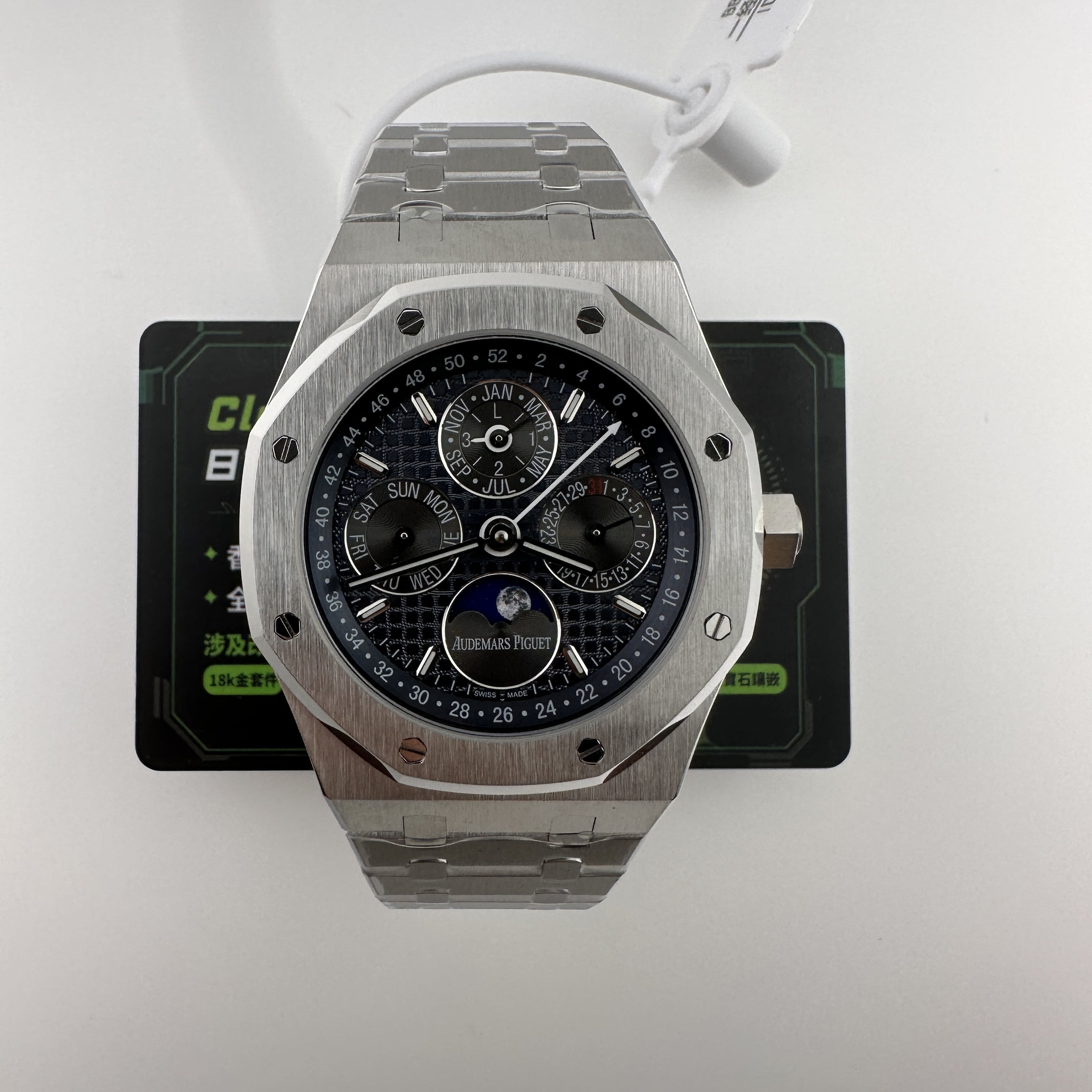 外觀構造是AP穿搭經典的八邊形塑造,BBS廠外觀精度打磨,拋光,錶殼部分以及錶帶部分是拉絲工藝,每一處拉絲類似無縫銜接的狀態,也表達了BBS廠26574萬年曆腕錶的性價比,看似便宜的錶款之一,但工藝層面上依舊是沿用標準的生產線製作而成.包括錶扣內部的噴砂工藝,BBS廠也是做到了對應的磨砂質感,與其他廠家不同的是BBS廠使用訂製版本的機芯就可以做到百分百全功能還原的狀態.