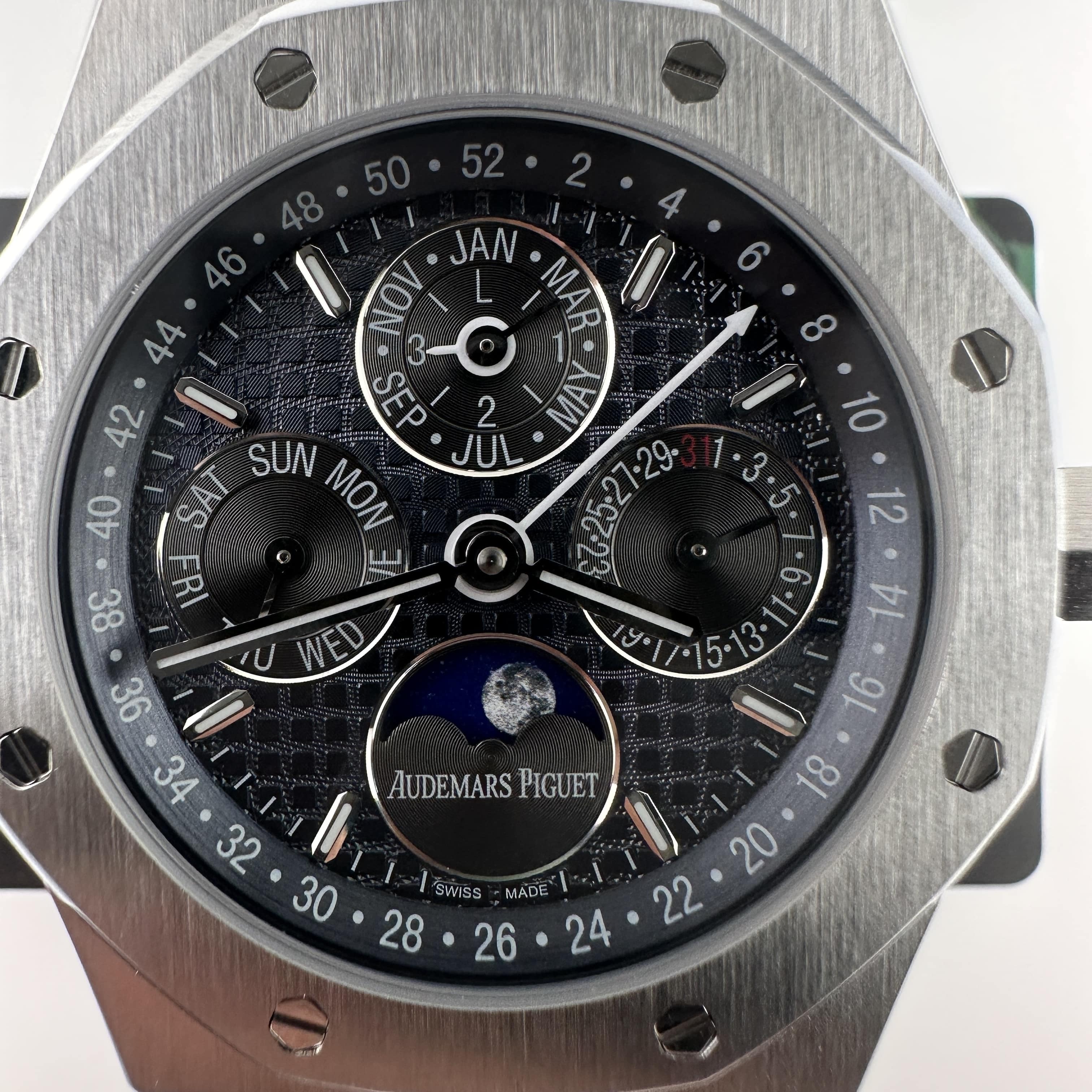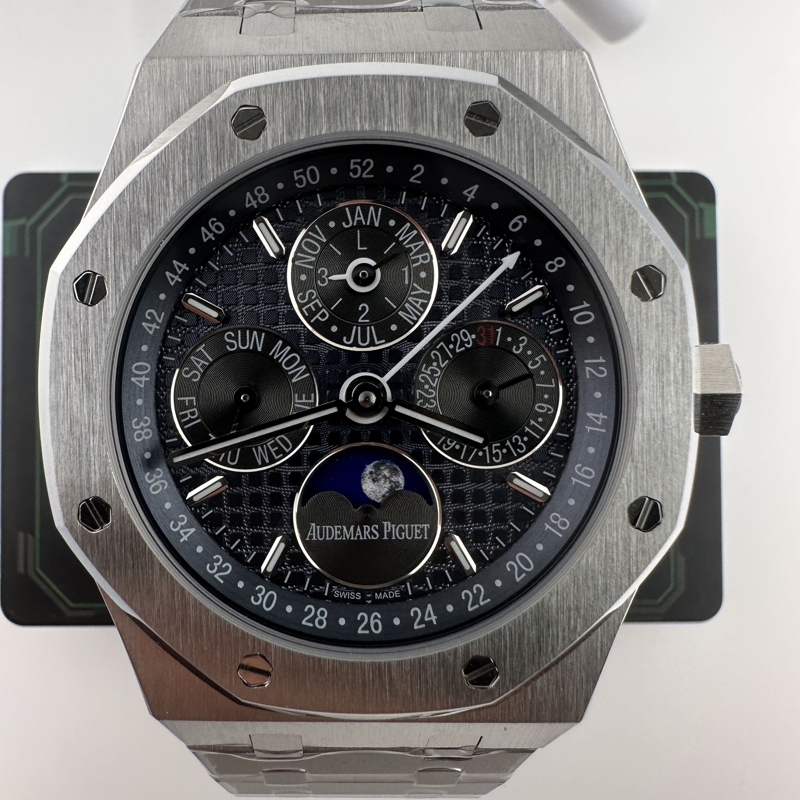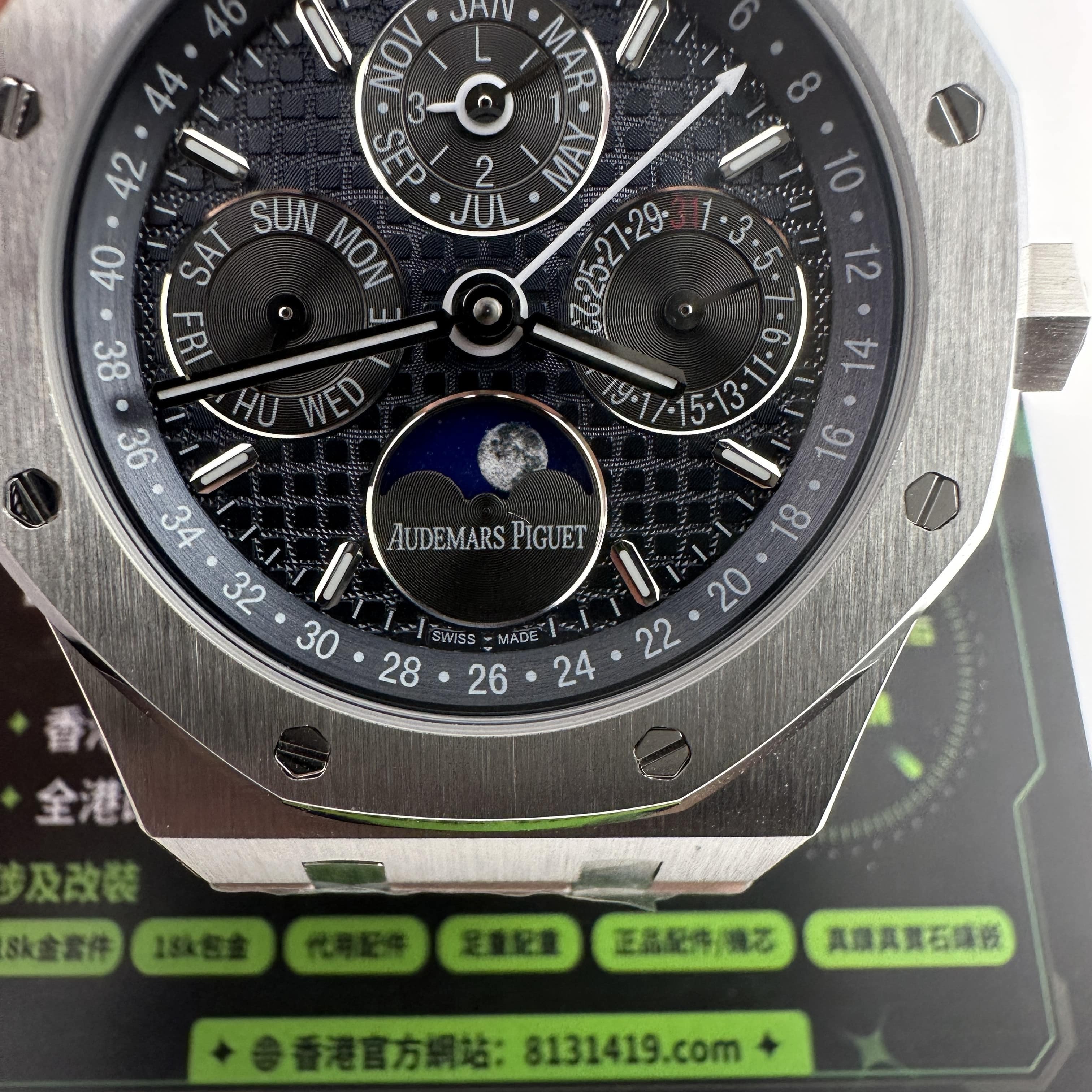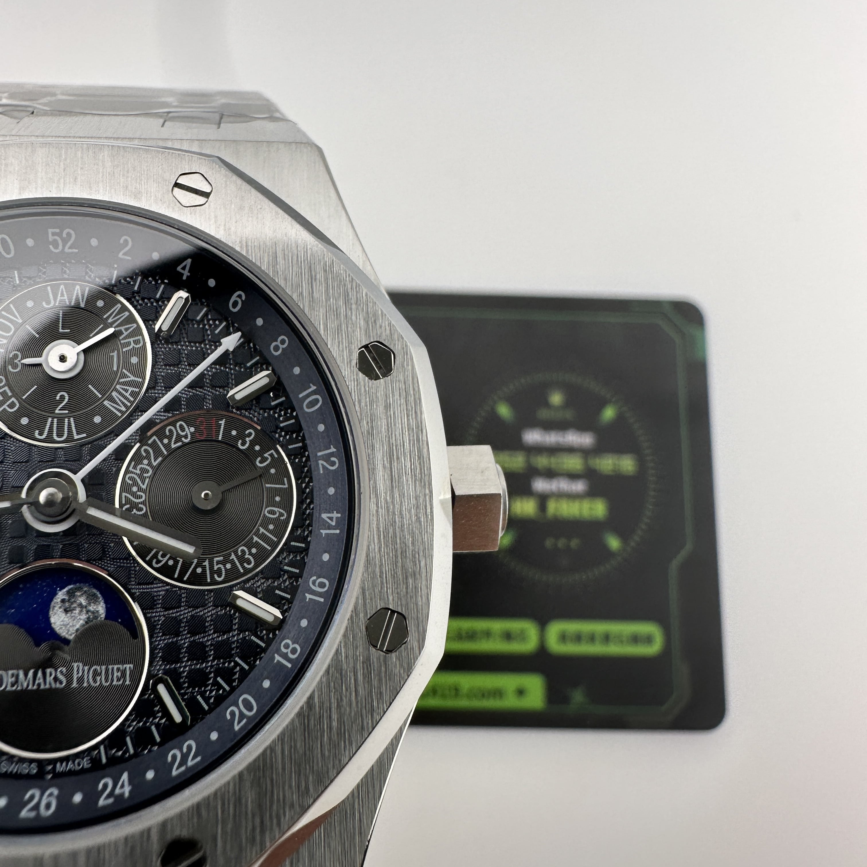 外觀構造是AP穿搭經典的八邊形塑造,BBS廠外觀精度打磨,拋光,錶殼部分以及錶帶部分是拉絲工藝,每一處拉絲類似無縫銜接的狀態,也表達了BBS廠26574萬年曆腕錶的性價比,看似便宜的錶款之一,但工藝層面上依舊是沿用標準的生產線製作而成.包括錶扣內部的噴砂工藝,BBS廠也是做到了對應的磨砂質感,與其他廠家不同的是BBS廠使用訂製版本的機芯就可以做到百分百全功能還原的狀態.