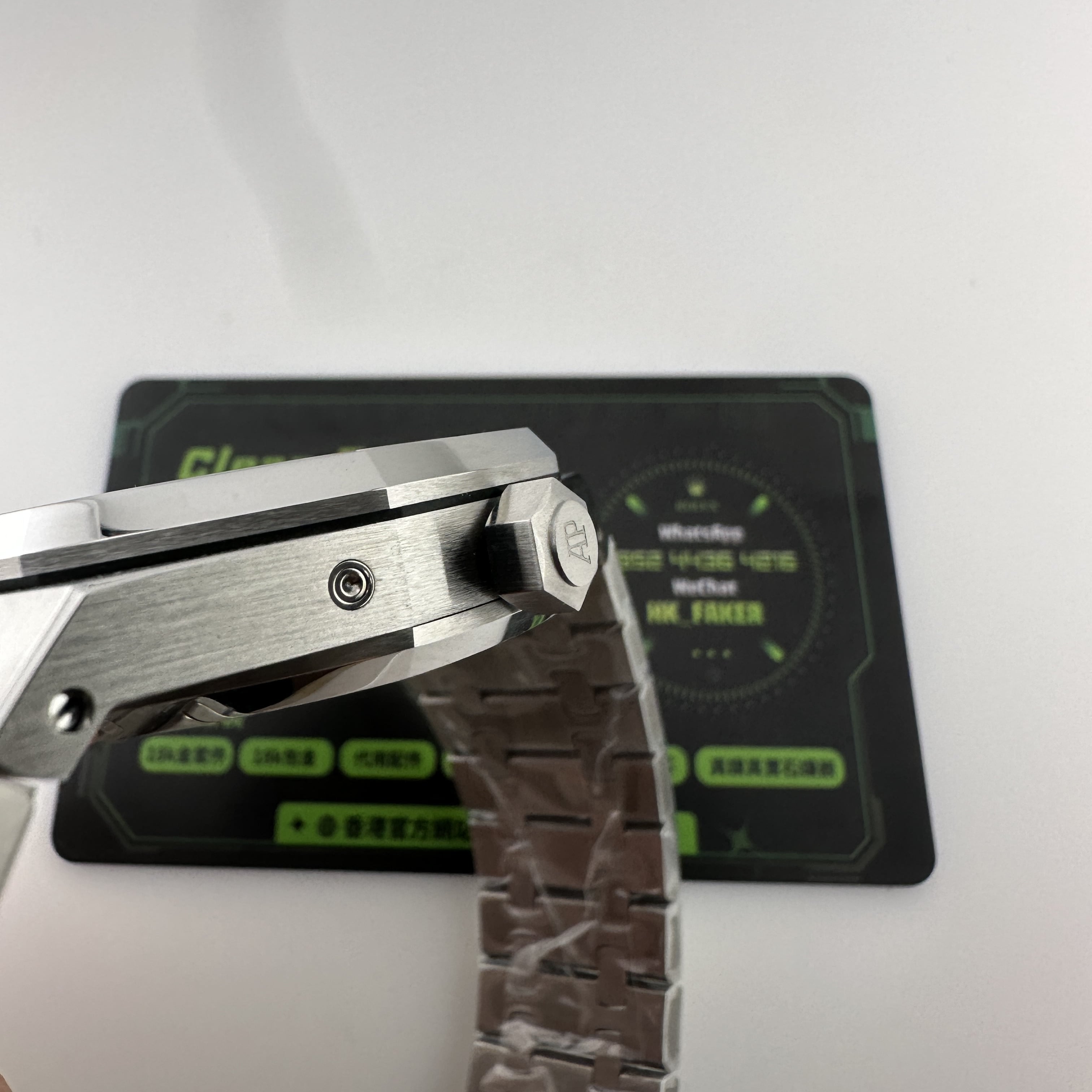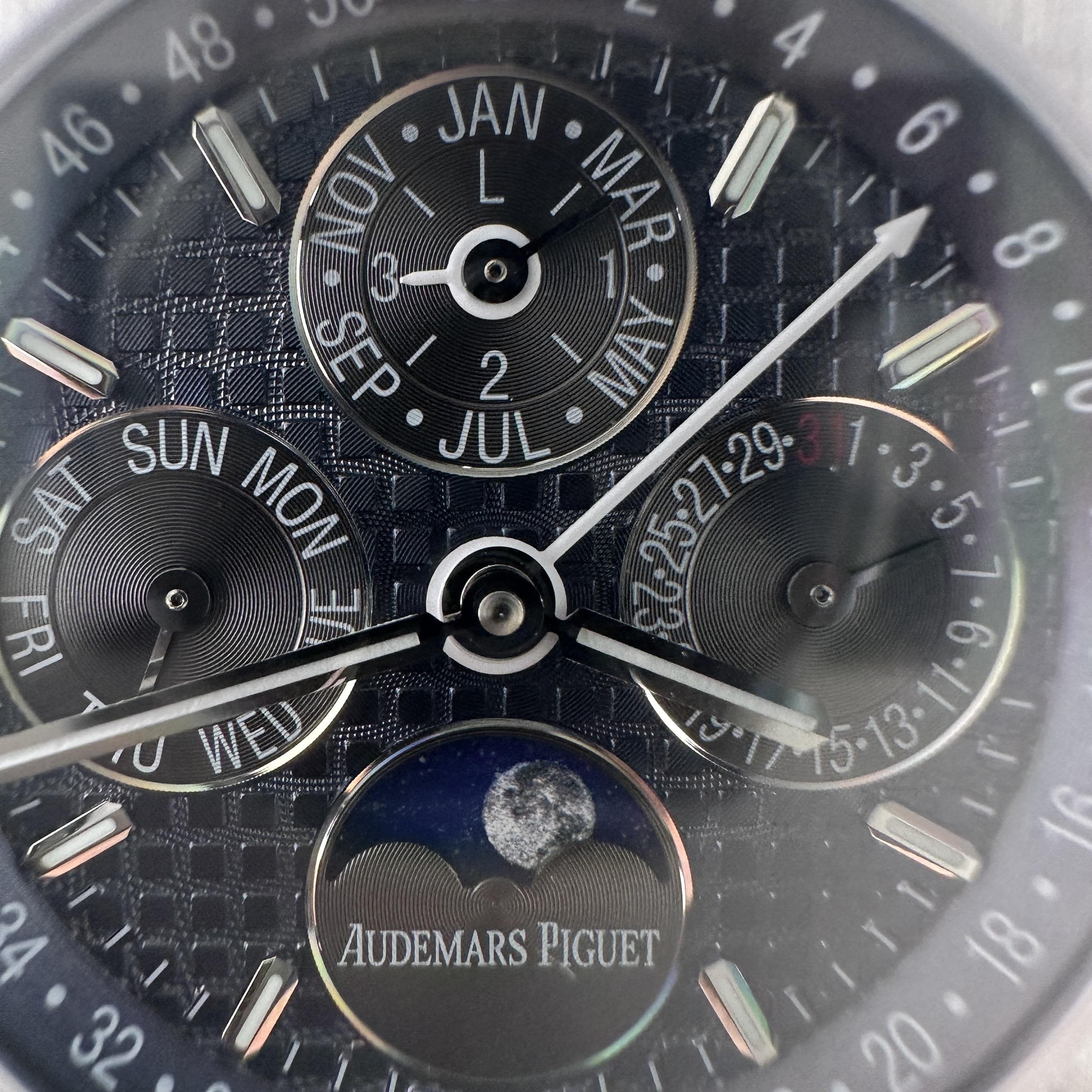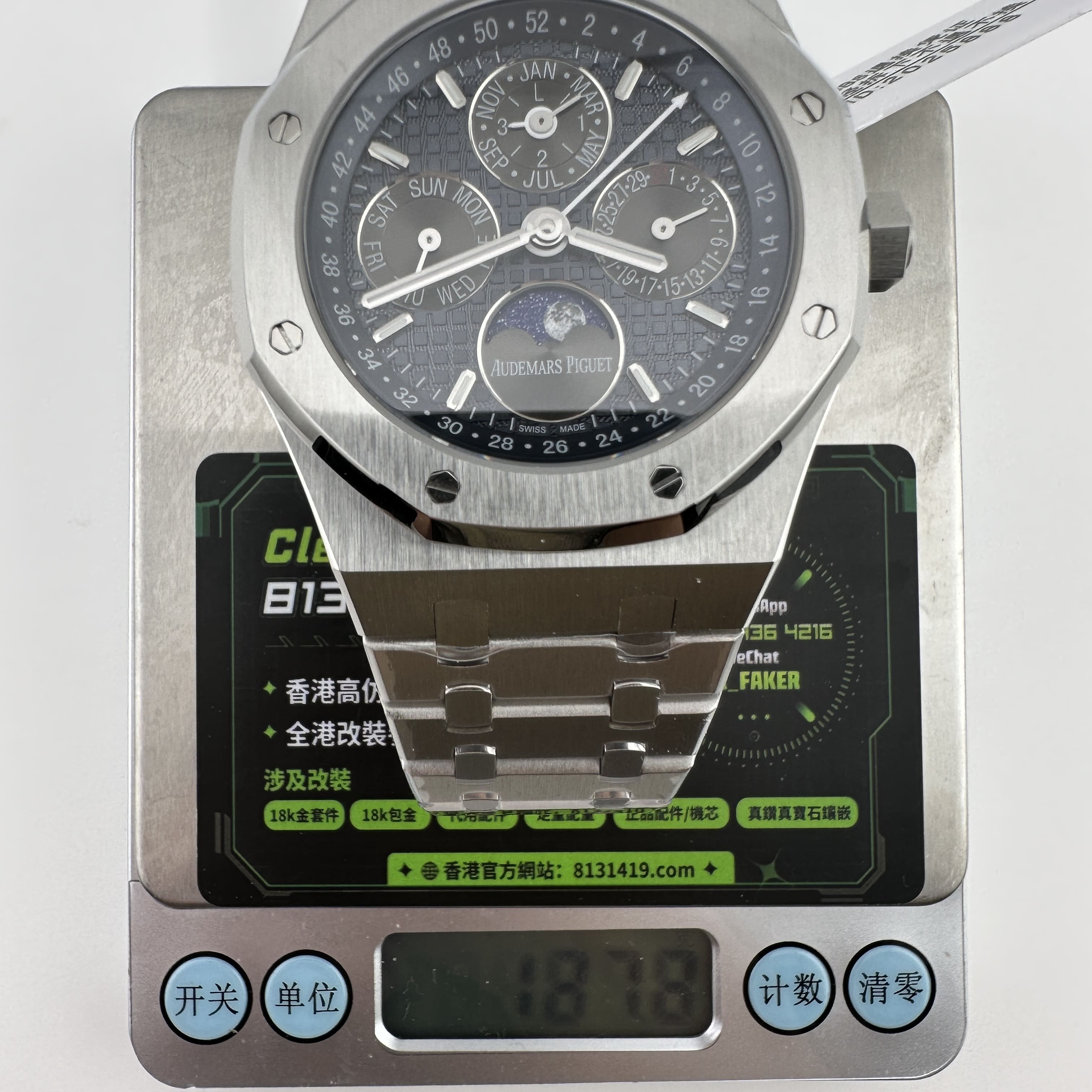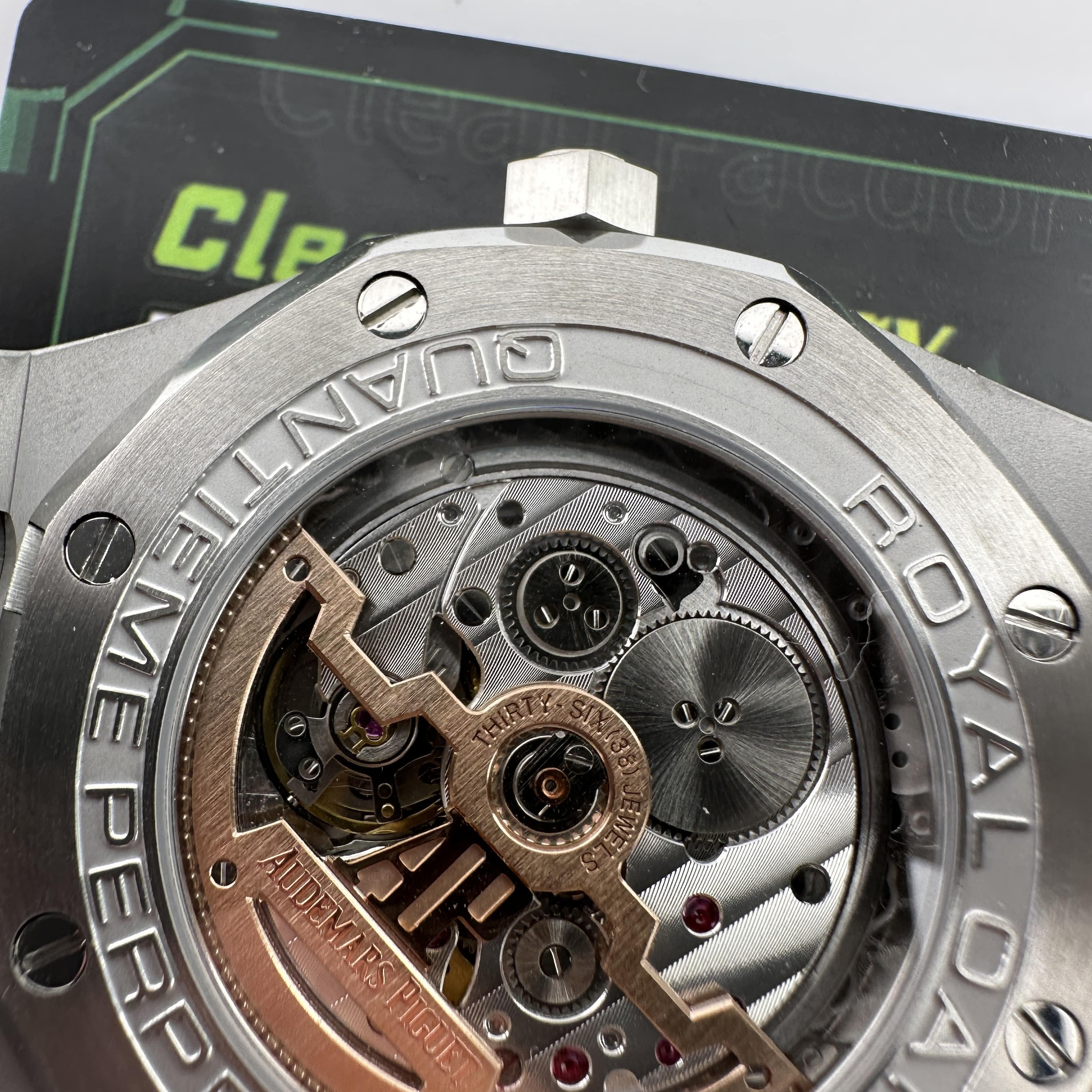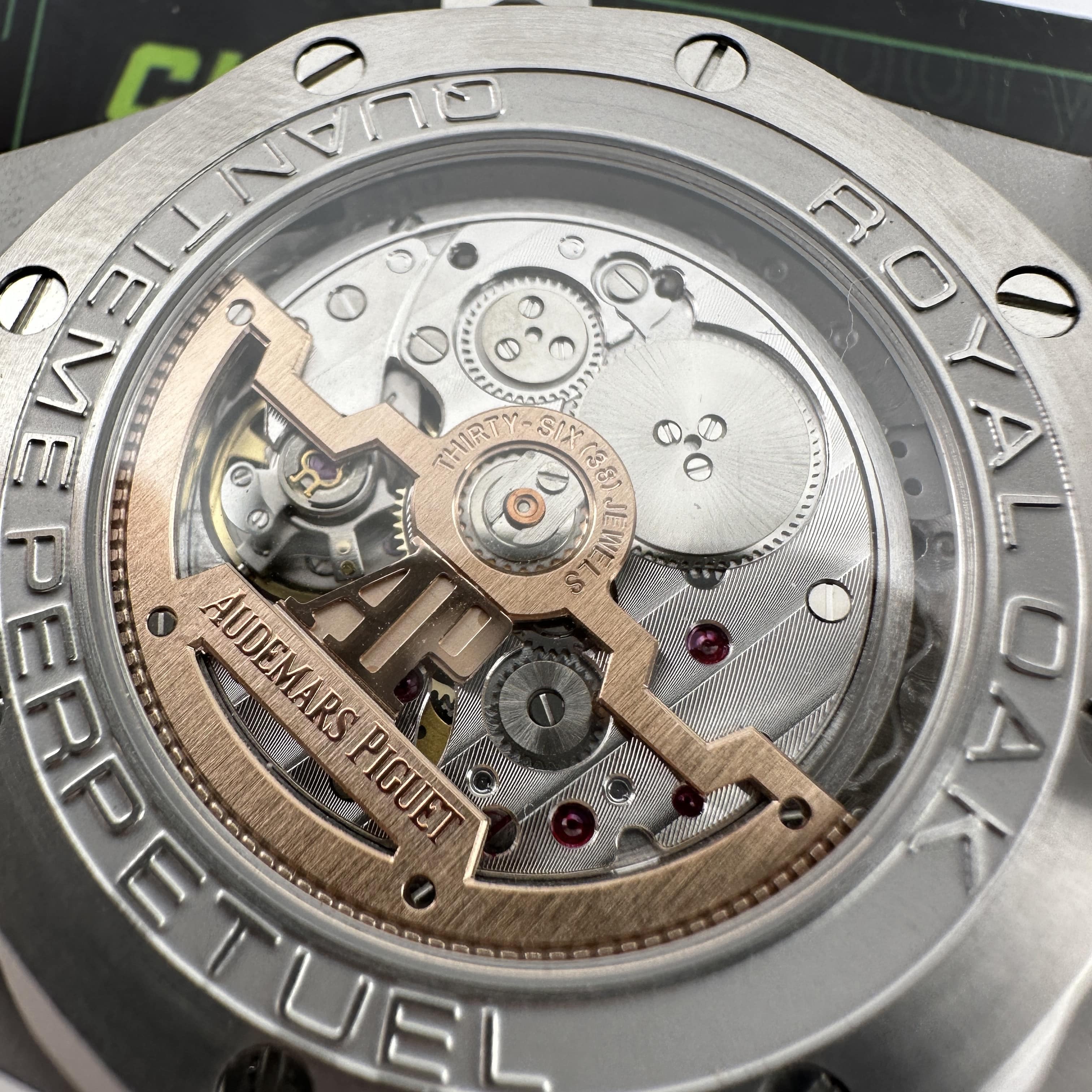 外觀構造是AP穿搭經典的八邊形塑造,BBS廠外觀精度打磨,拋光,錶殼部分以及錶帶部分是拉絲工藝,每一處拉絲類似無縫銜接的狀態,也表達了BBS廠26574萬年曆腕錶的性價比,看似便宜的錶款之一,但工藝層面上依舊是沿用標準的生產線製作而成.包括錶扣內部的噴砂工藝,BBS廠也是做到了對應的磨砂質感,與其他廠家不同的是BBS廠使用訂製版本的機芯就可以做到百分百全功能還原的狀態.