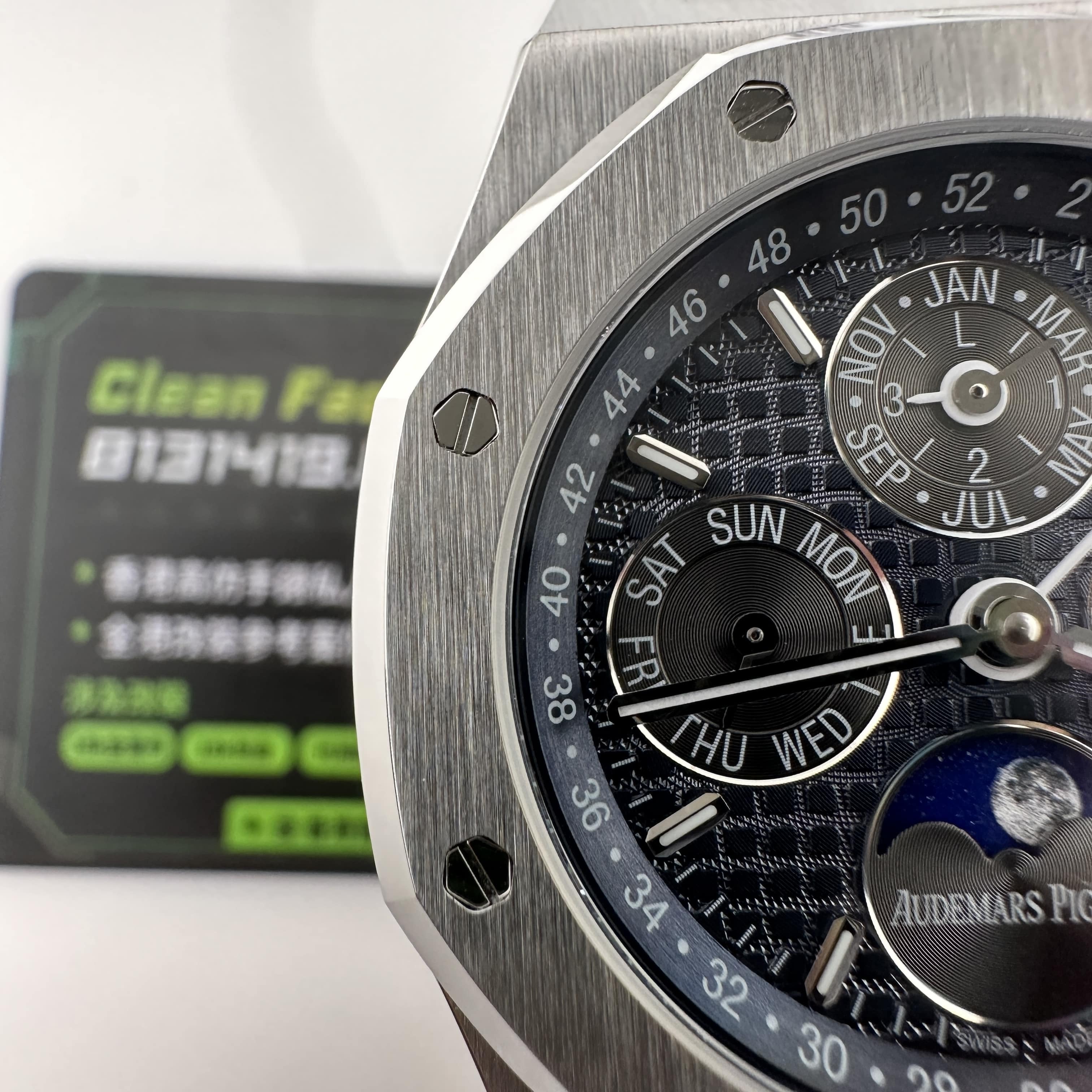 BBS廠高仿AP26574萬年曆鈦金屬版本全面推出藍灰色盤面,這張盤面的復原度也是作為BBS廠獨家牌面之一!主要原因是盤面色差小,並且功能層面上均是百分百還原.餅乾紋的構造搭配了藍色錶盤,而三個計時小圈則是使用了灰色系設計.每一個小圈的構造BBS廠26574鈦金屬灰藍盤做到了對應位置標準,間隔距離吻合,與條丁構造,指針長短度,印刷字面的清晰,都是彰顯了高仿AP26574萬年曆的頂級水準