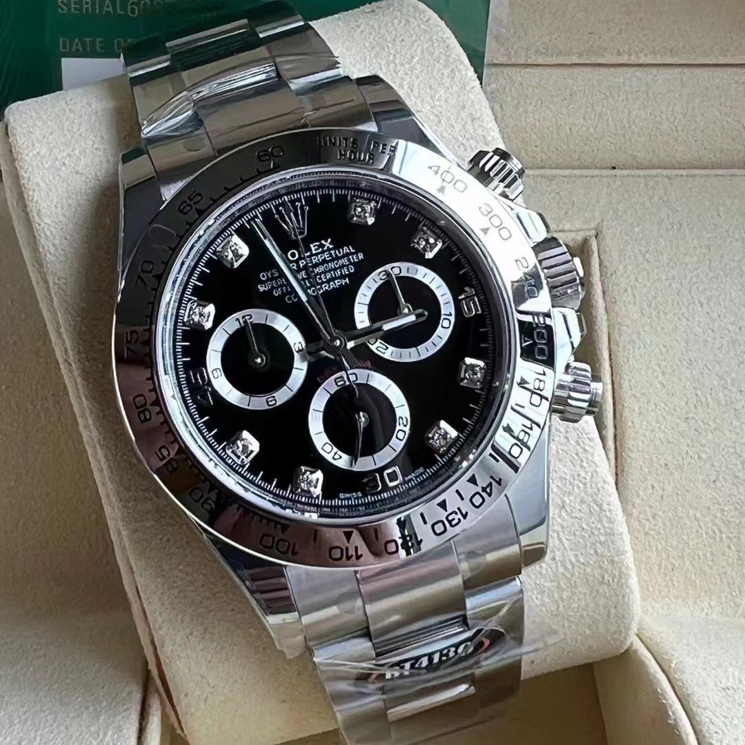 然後是三個計時小圈的放射紋,也是整張錶盤的放射紋路最佳的效果表現.黑與銀之間透露低調與奢華的感覺.就非常符合我們每一位錶友佩戴起來的氣質,如果你不喜歡你都不會多看它一眼,對吧! 錶殼部分的拋光是呈現反光的狀態,就整錶你看上去的感覺,反射出來的反光角度是很高級的.再與錶帶銜接的部分處使用三段式頭粒組成,錶帶是AR代工廠錶帶,都是沒有問題的復刻配件.也許會有錶友問到,為什麼指針和錶帶會用其他廠的配件? 要明白一點在復刻市面上你的配件能夠成為代用級別,已經就是最接近原裝正品的配件. 然後錶扣的皇冠做了倒角打磨,開合的質感也比較有手感,內部的刻度字面清晰,工整.搭載丹東4130機芯,蓄力續航擁有72小時.