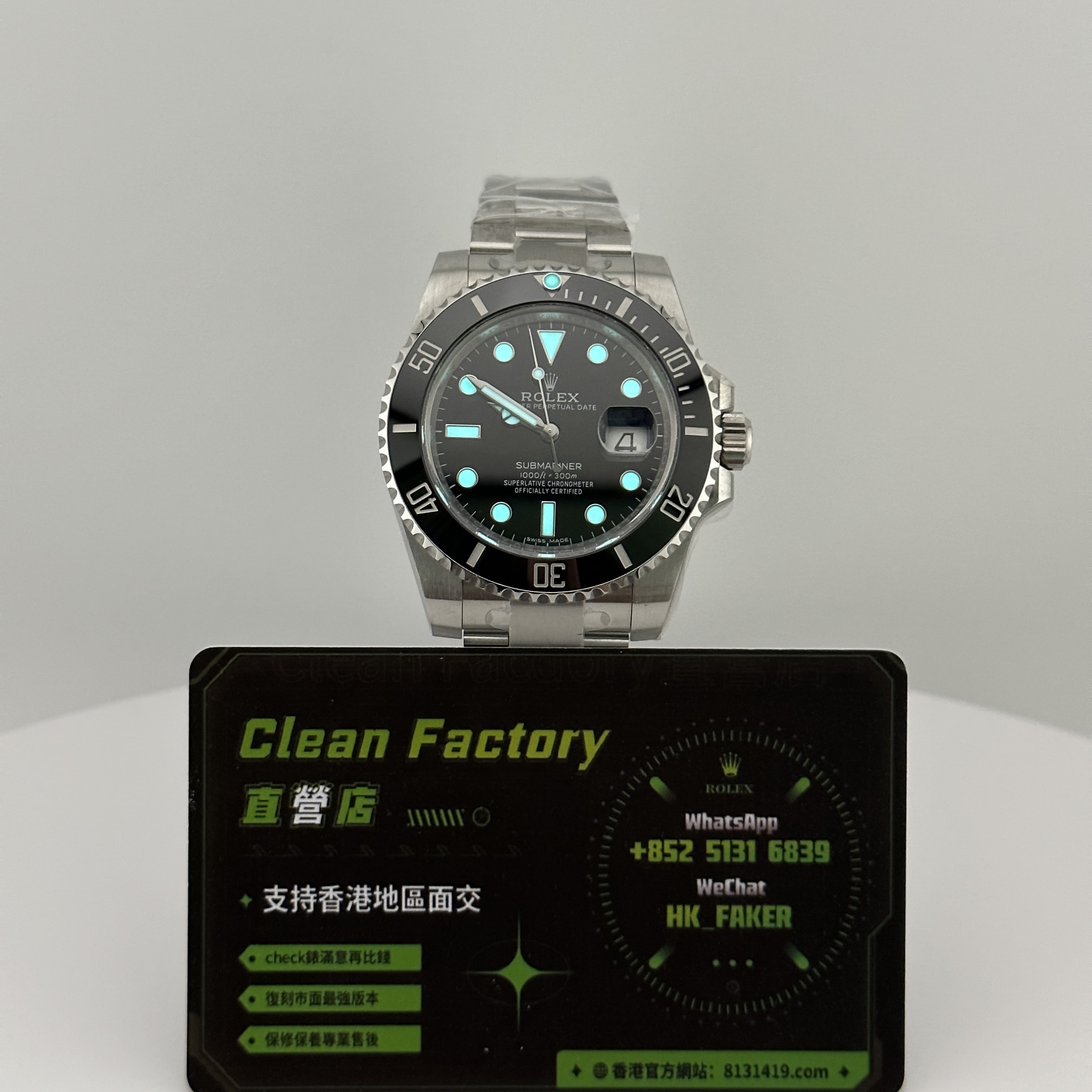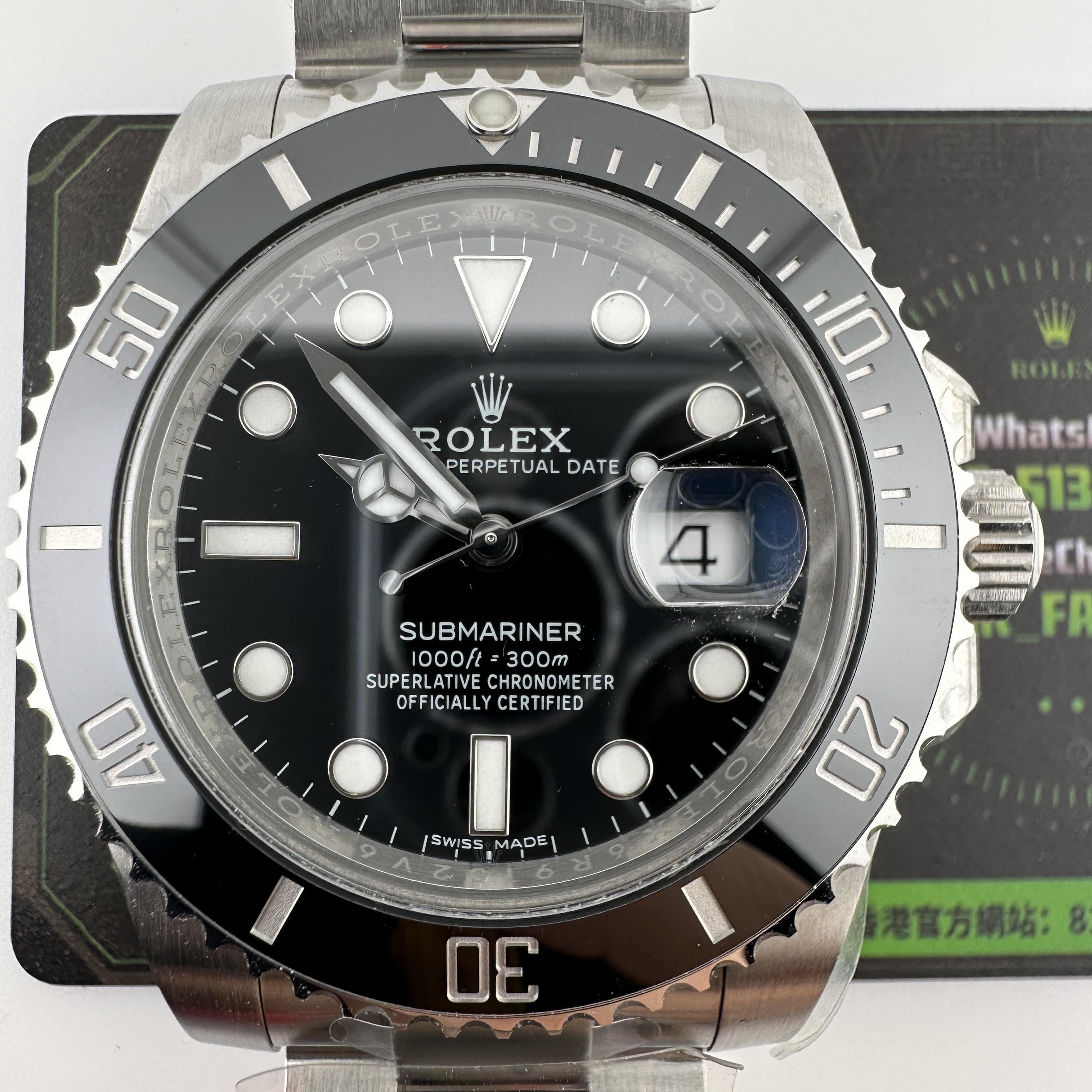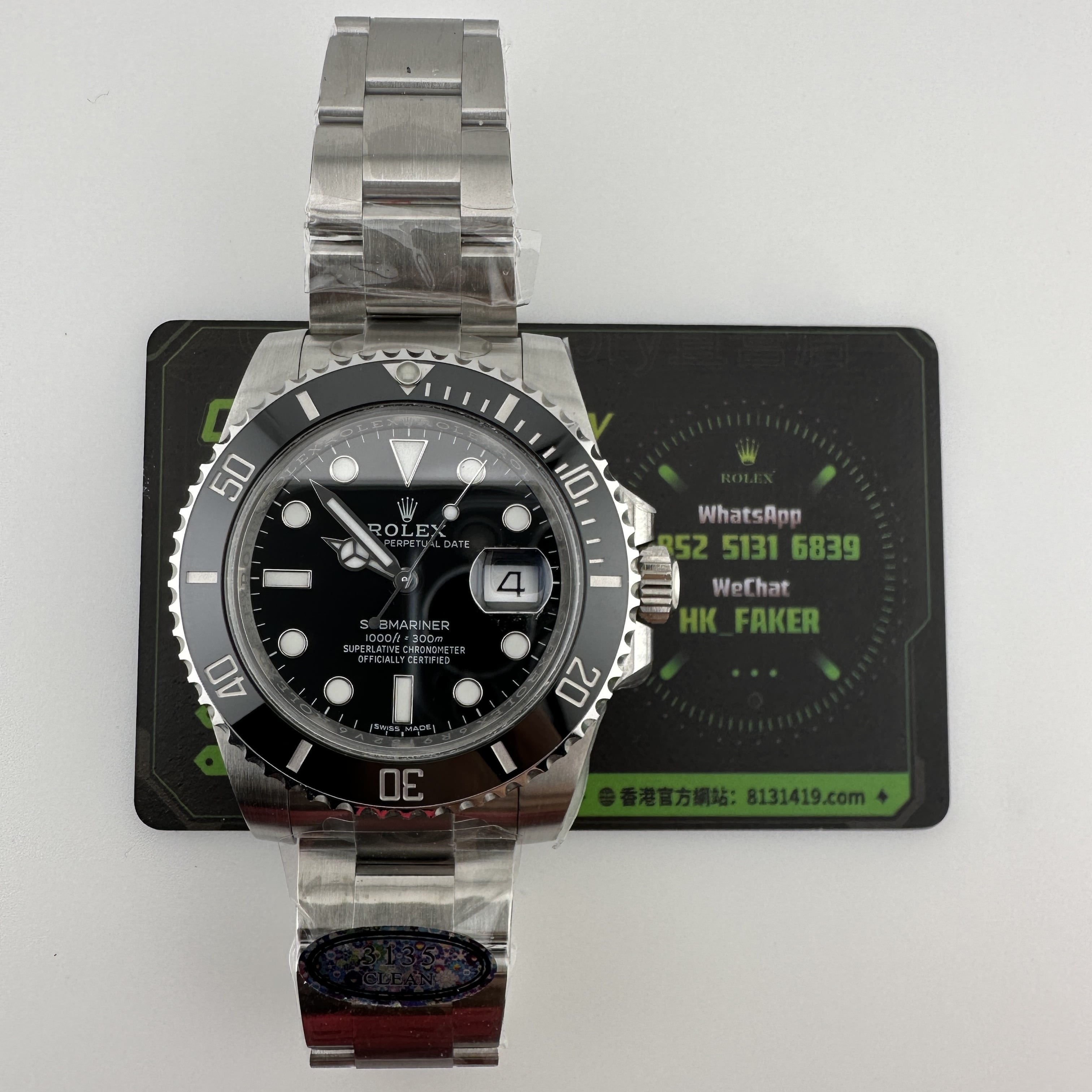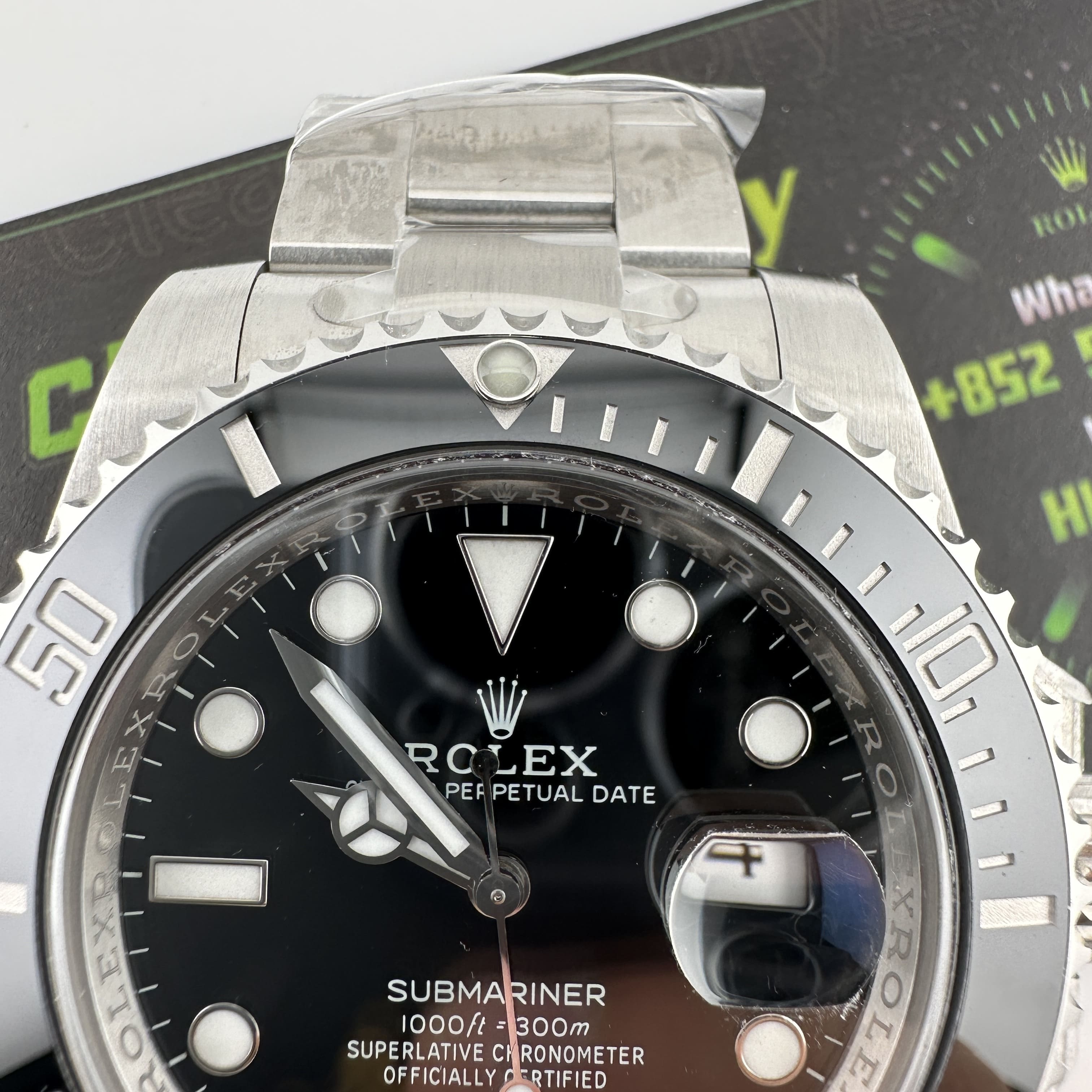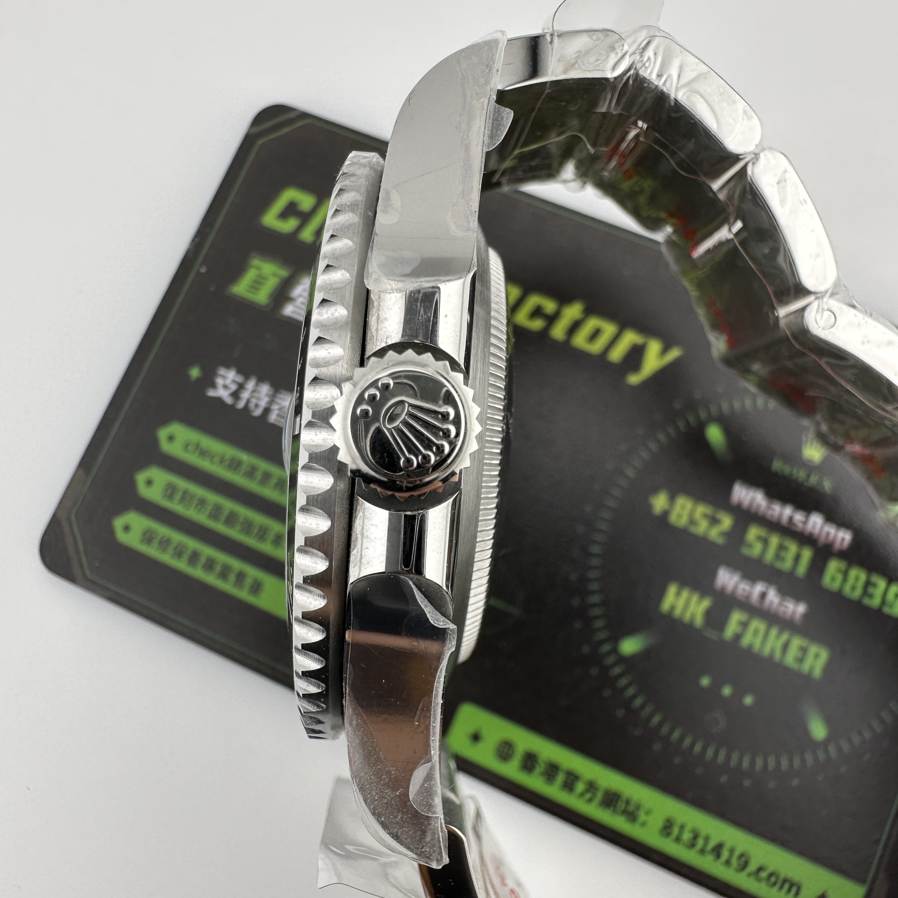黑面錶盤無色差表現,圓點刻度與倒三角金屬包邊做了圓角打磨,呈現的邊緣金屬內置填充立體感十足.油性印刷白色字面,Clean廠黑水鬼做工色值對版字面清晰工整無毛邊毛刺.實心指針與中軸打磨後的細膩感完美極致.中軸中心點鏤空狀態,凸起的形狀弧度與正品一致.藍水晶鏡片放大日曆部分2.5倍,每一個字面對比原版無誤差才會上機使用.錶殼與錶帶之間銜接拉絲工藝絲滑流暢無斷鋼.Clean廠水鬼使用了AR廠代工廠錶帶,代用級別基本同步正品錶帶.機芯方面C廠黑水鬼配備了丹東3135機芯.