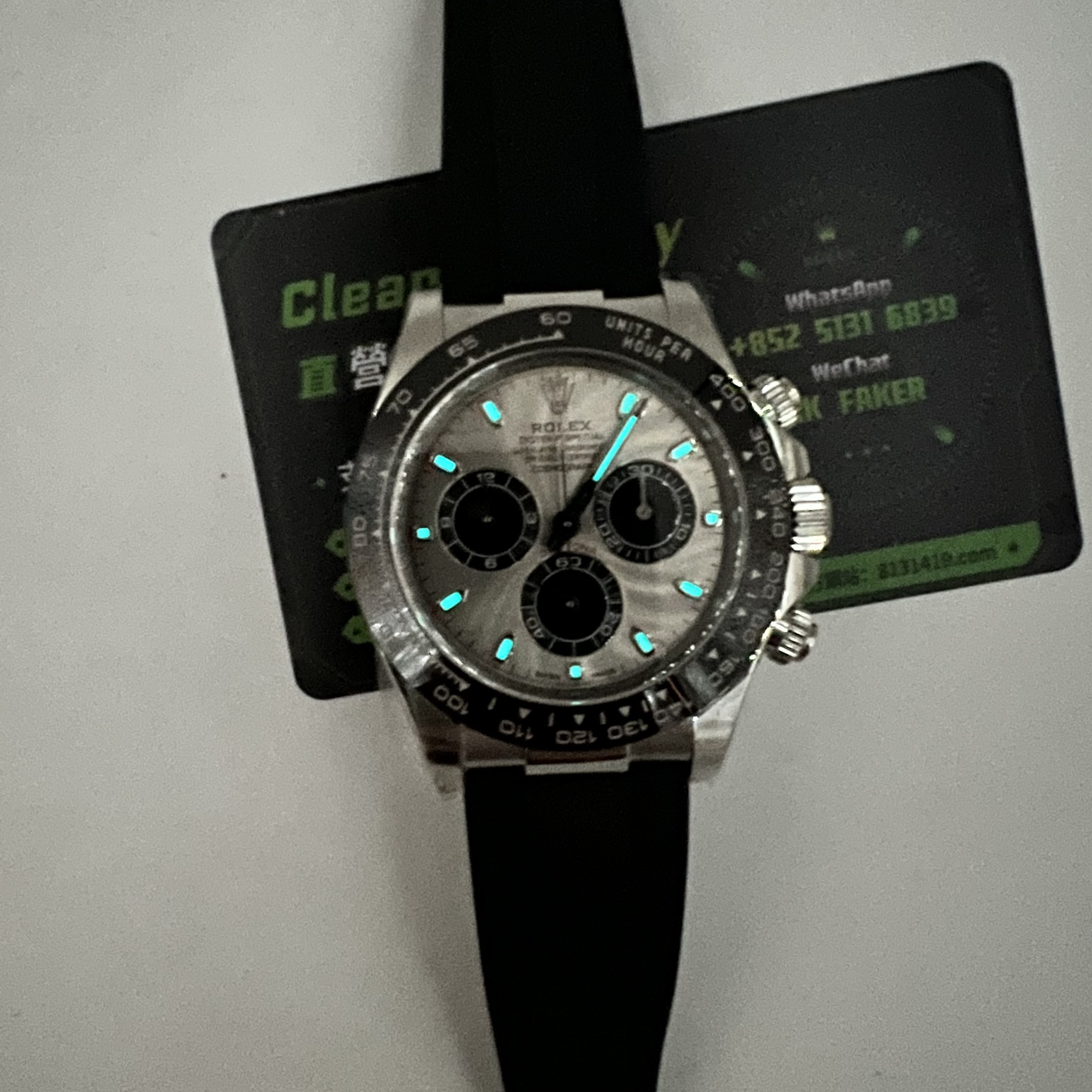 時間顯示刻度條丁做了包邊處理,倒角打磨,所以看上去的立體感和圓潤是百分百有的,12點皇冠LOGO做了拋光,亮度也是可以.錶盤的字面是油性印刷,就不是普通的粘貼工藝.指針部分的話,實心中軸經過打磨,就還是一如既往的細膩,不虧是Clean廠水泥灰的做工.夜光效果就是刻度條丁和指針部分,C廠勞力士全部復刻錶使用到的夜光填充都是瑞金原版進口的,這一點沒有任何毛病.然後就是3個計時小圈了,也是地通拿唯一的精髓,同步原版一致的計時功能,必須搭載4130機芯,而C廠地通拿則是裝置了丹東4130機芯,不僅比普通的4130機芯穩定,在續航動力方面更是高達72小時.膠帶款地通拿,C廠也做了升級,改用記憶鋼片內置膠帶,同步原版還能提供舒適度.請認準Clean廠香港官網直營店!打造高品質一比一高端復刻.