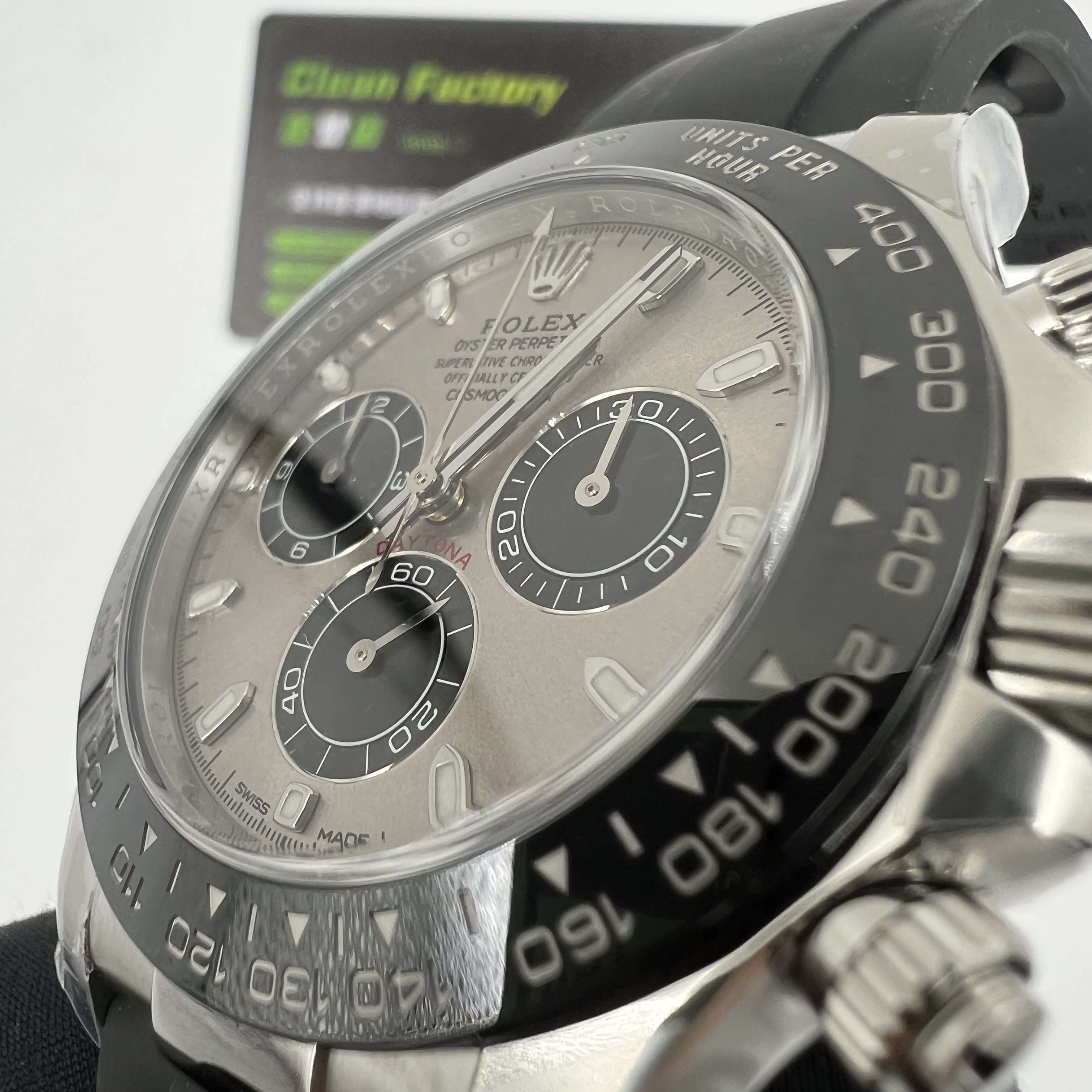 Clean廠官方全新推出的勞力士膠帶地通拿m116519-0027,尺寸40MM,厚度12.2,完美復刻原版尺寸.在C廠地通拿V3當中,這一隻高仿Daytona更多錶友喜歡叫水泥灰或者是太空灰,由於外觀的高顏值和冷灰色的錶盤造就了這幾年在正品二級市場或者是高仿市面上都是非常熱門的款式.首先原裝正品是18K白金材質,而C廠水泥灰則是使用到了904L精鋼材質打造,在外觀的色值,鋼與白金是不存在任何色差的.包括Clean廠所使用到PVD電鍍工藝,在外觀錶殼上的還原是非常OK的.錶殼4個角做了倒角打磨,側面採用拋光工藝,亮度和拉絲都是非常明顯的.