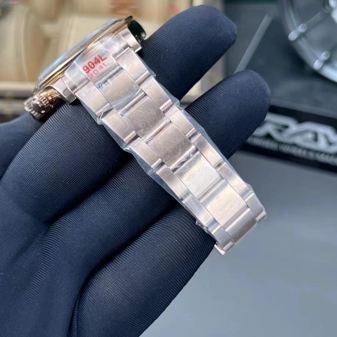 這一隻勞力士地通拿m116505玫瑰金是經過鎢鋼材質進行配重的款式,在某種意義上可能大部分都對鎢鋼或者其他配重比較陌生.所使用到的材質是對比K金含量的密度,達成一致或者差不多的密度才能夠使用到配重地通拿上.並且還需要的是無毒無害的材質.可以看到這一隻經過改裝配重後的地通拿完全是達到了223克左右的重量,已經是最接近原版的克重,也可以說是同步的狀態了.另外還使用了Clean廠的錶盤和指針,應用到這些頂級配件再加上配重,完全是一隻頂級的復刻錶.特別是機芯搭載了Clean廠地通拿所使用到的丹東4130機芯,動力蓄能72小時,完全對版原裝正品.