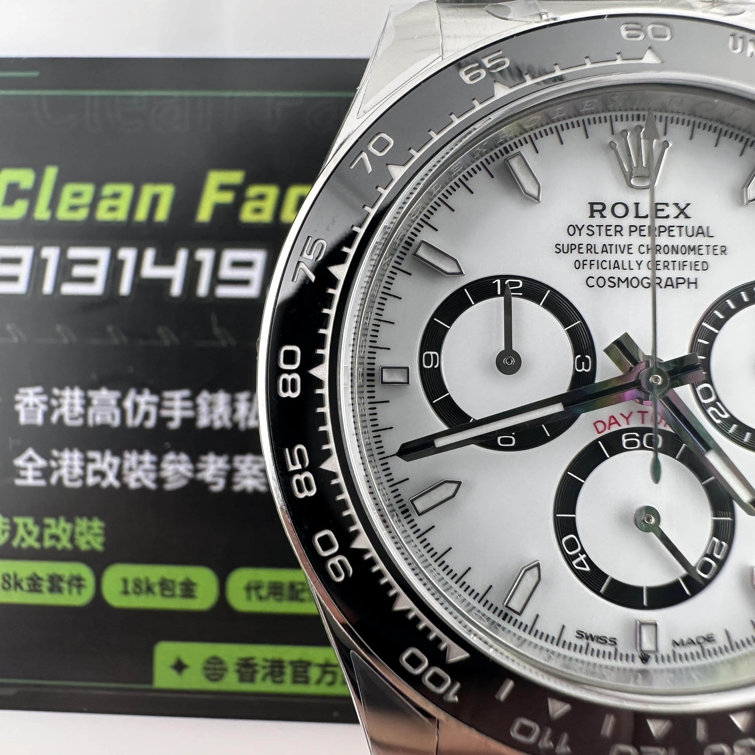 CLEAN PLUS廠熊貓優點是圈口,小編認為C PLUS廠熊貓地對比其他廠家最大的優點就是圈口刻度字面是做到接近原版品質.對比其他廠家出現的瑕疵,倒三角不對版,刻度字體字面比較大或者是比較小都會涉及到缺陷.而CLEAN PLUS廠126500以及其他高仿地通拿配置了陶瓷圈口和鋼圈口其做工確實是得到了眾多測評人士和錶友們的認可.CLEAN PLUS廠地通拿不僅圈口做到完善狀態,而錶盤的色差也是做到了最低色差狀態.就以這一隻白熊貓地通拿作為參考,奶色的盤面搭配黑色的三個眼睛,其中白色的色澤並非全白,也並非白黃狀態,是一種純淨自然的奶白色才是符合原版熊貓的盤面