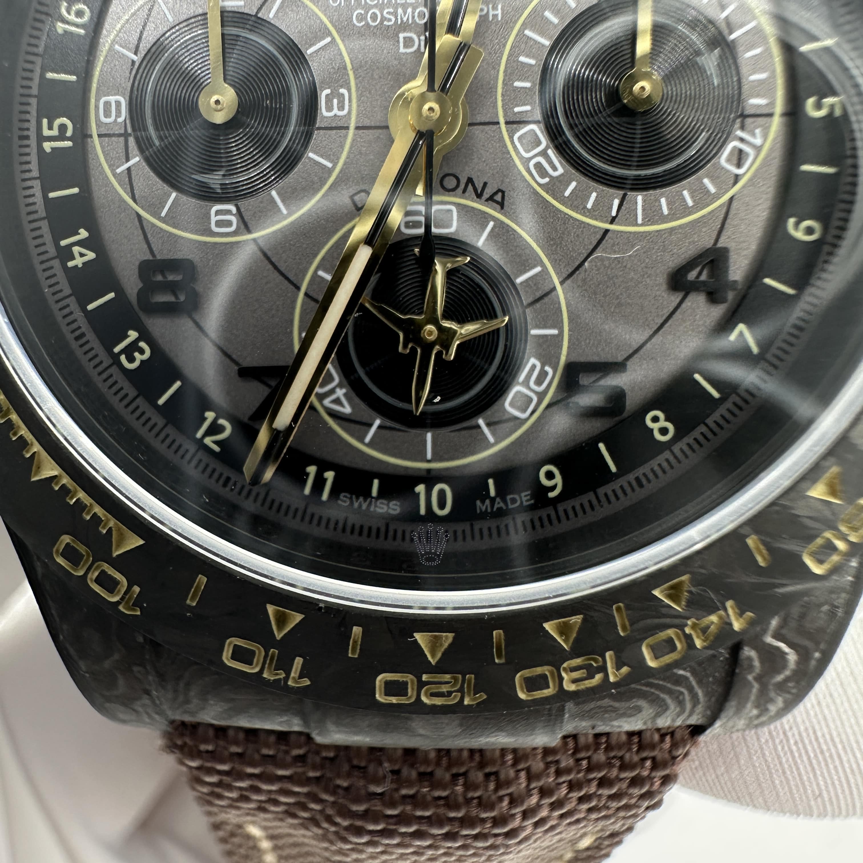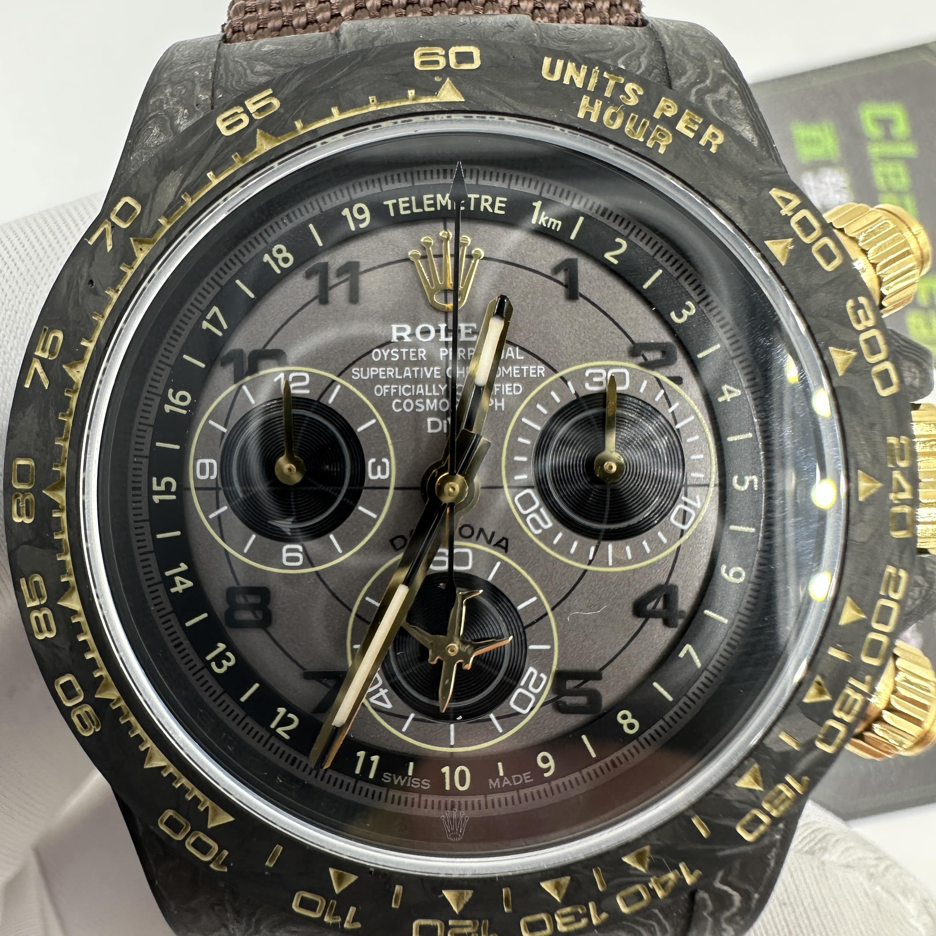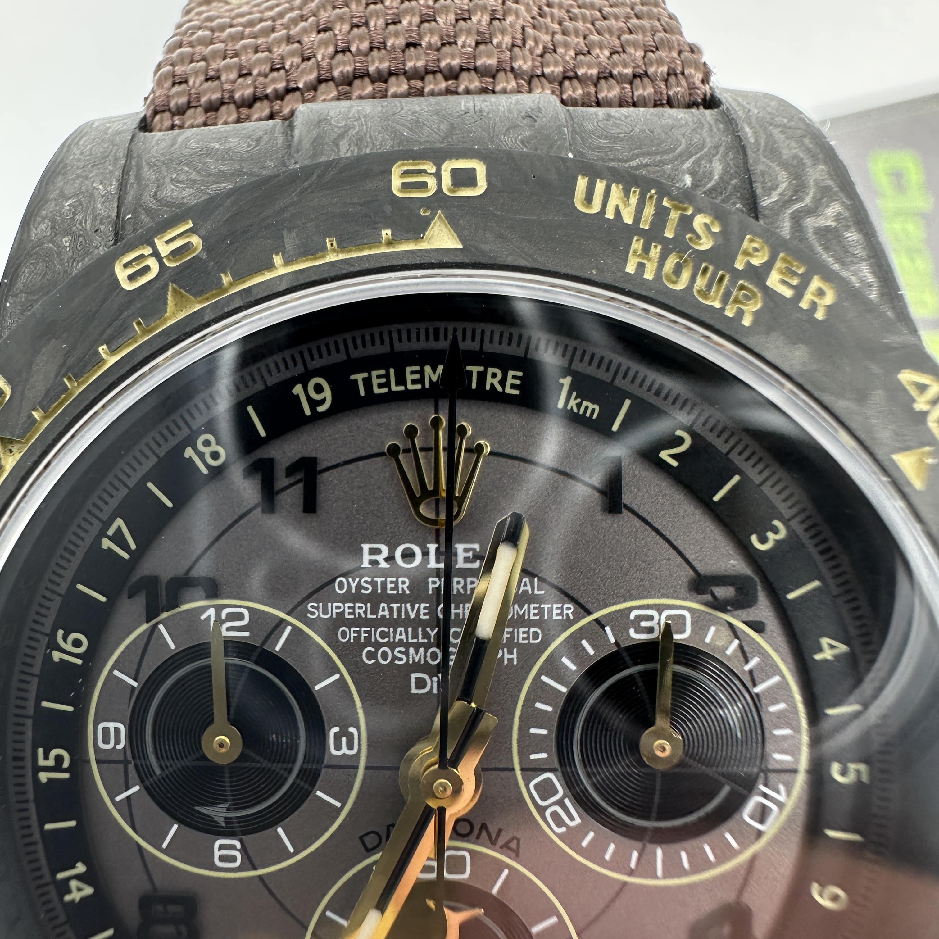 DIW廠高仿手錶是以勞力士地通拿作為復刻主打產品,其中就包含了原裝正品碳纖維地通拿款式.大部分錶友不了解碳纖維材質地通拿是以比利時DIW腕錶改裝公司出品的私人定製款.主要材質就是以碳纖維材質進行相繼打造40mm尺寸錶殼,由於錶殼的紋理紋路比較特別,而且充滿個性化,從此就受到了眾多錶友的愛戴.除此之外這一隻高仿Daytona錶扣均可定製,甚至針對錶帶部分也是隨機匹配,可根據個人的款式進行選擇.針織錶帶配備魔術貼錶扣,方便快捷.