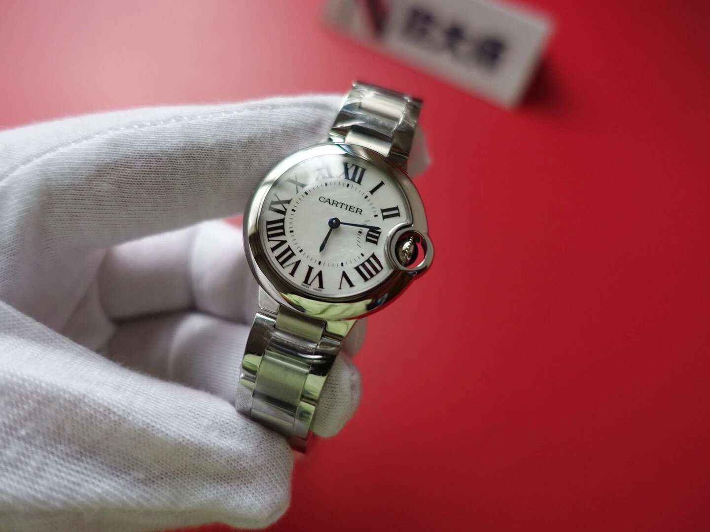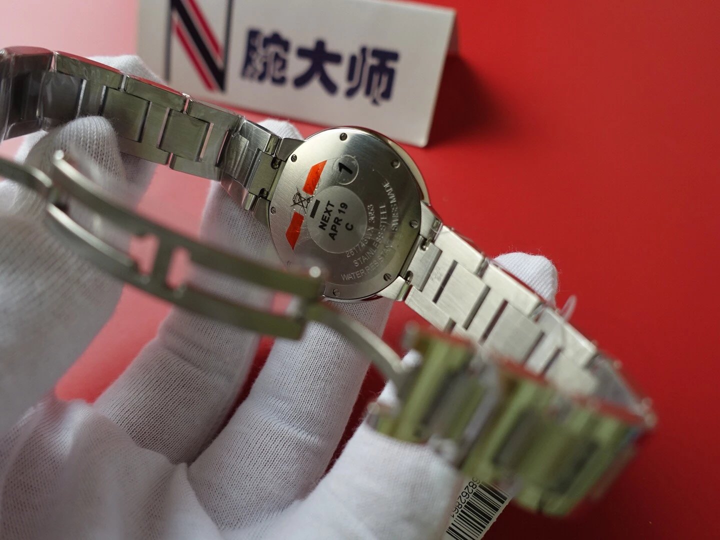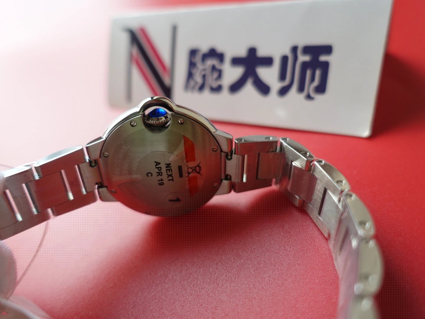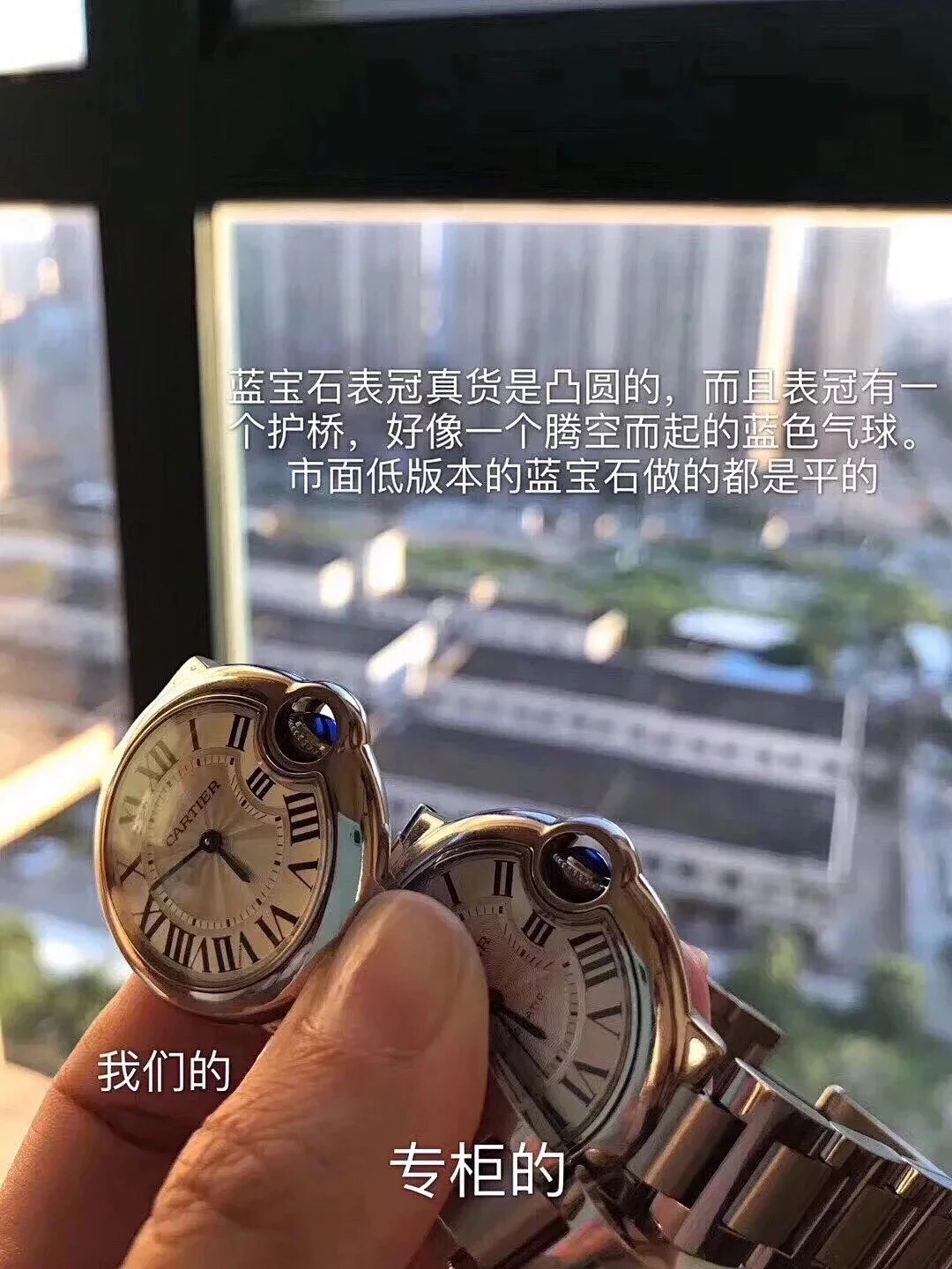 這個是石英版本的??機械錶盤多一行“automatic”字母。這個細節自己查一下專櫃官網就很清楚。機械表容易停,時間不准,石英表適合懶人們,也沒什麼售後問題。我們都知道卡地亞藍氣球