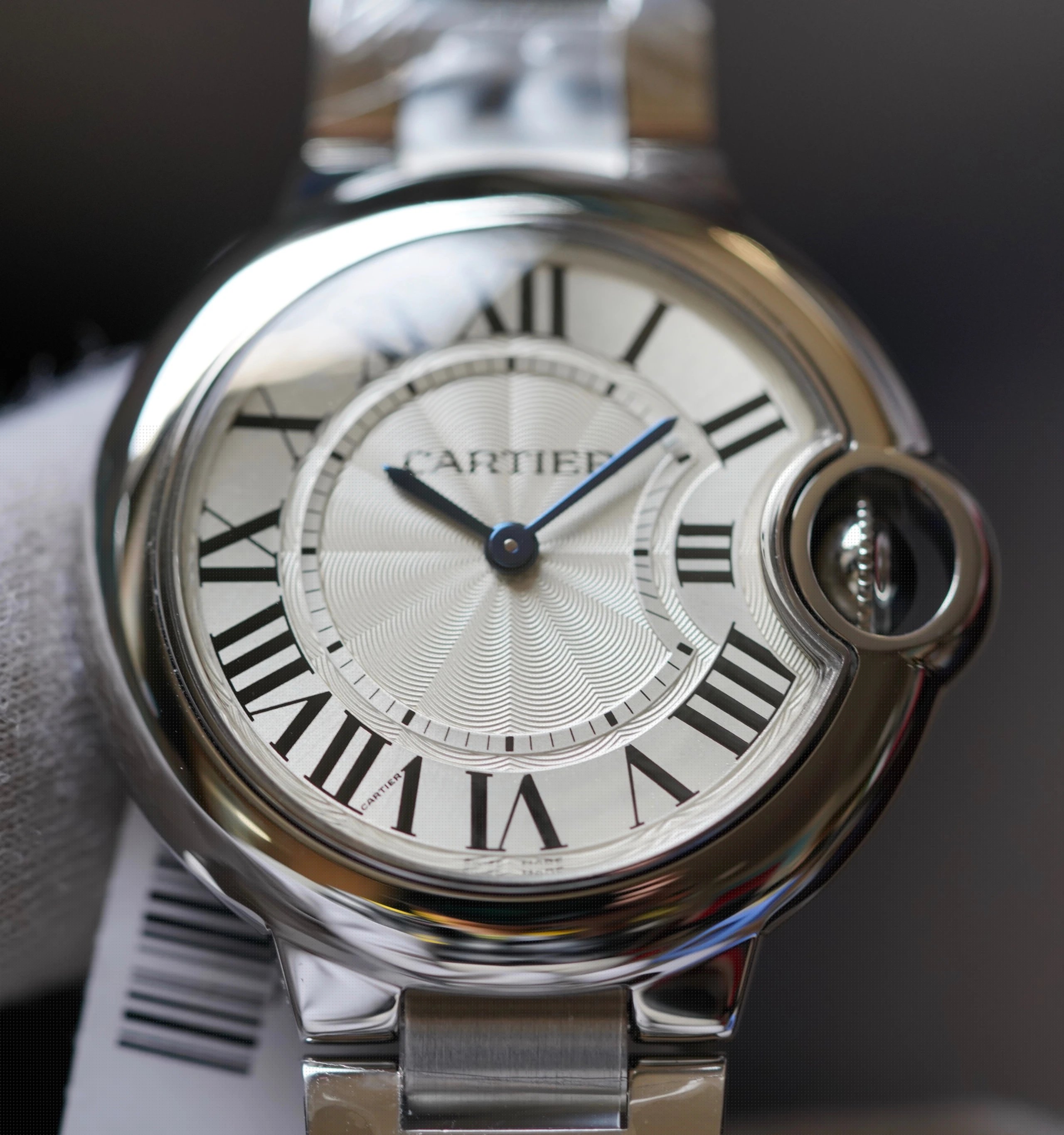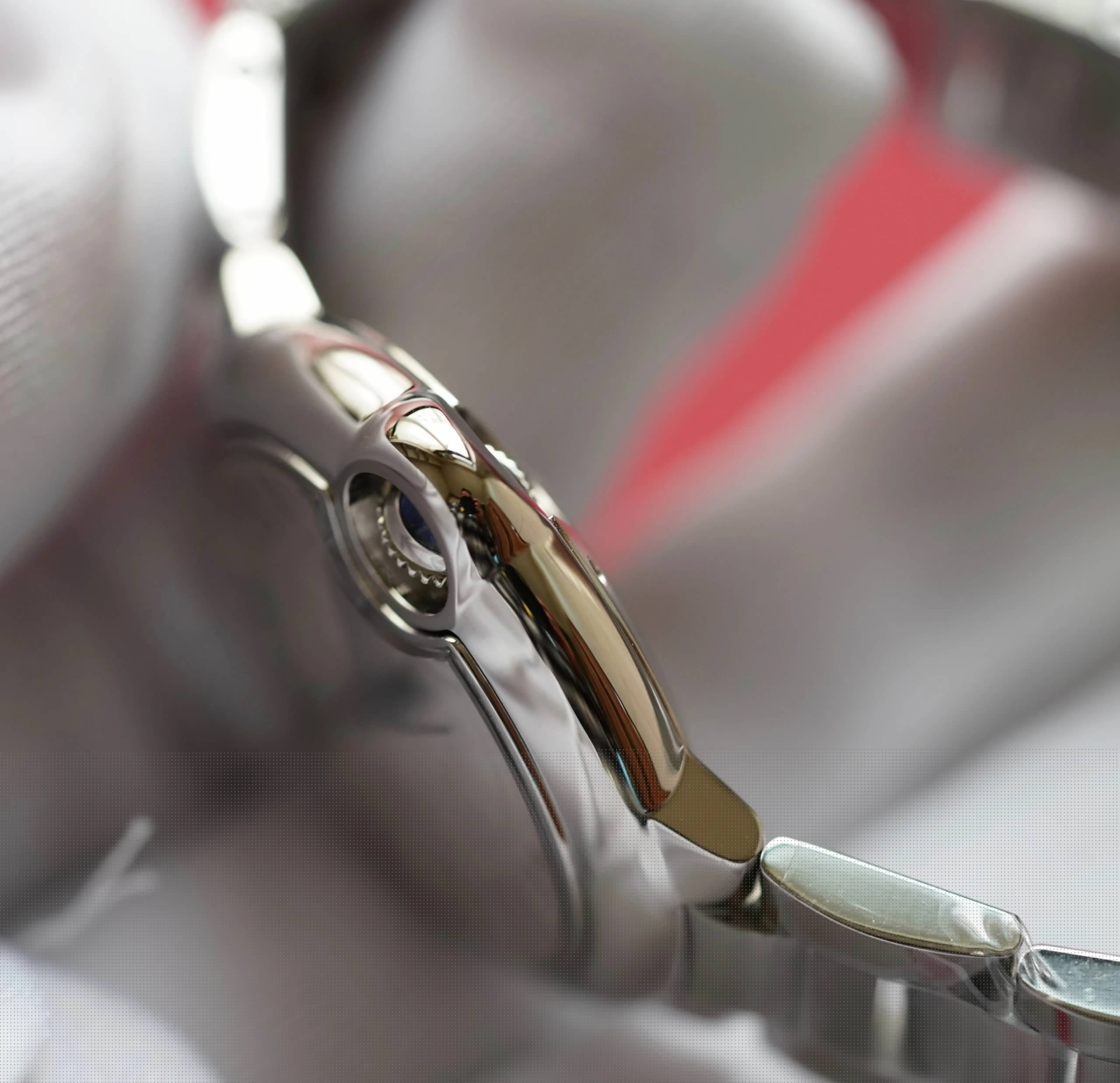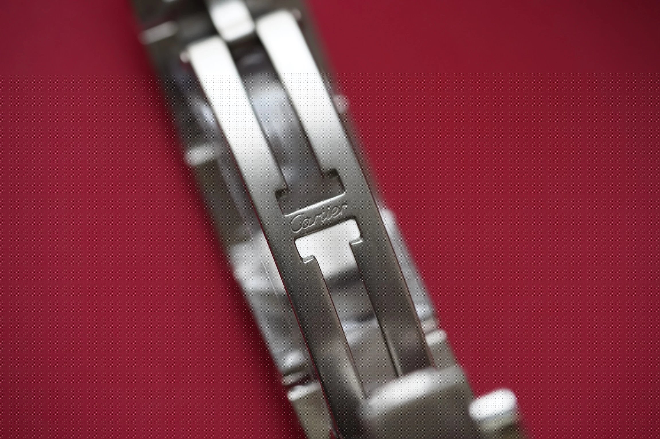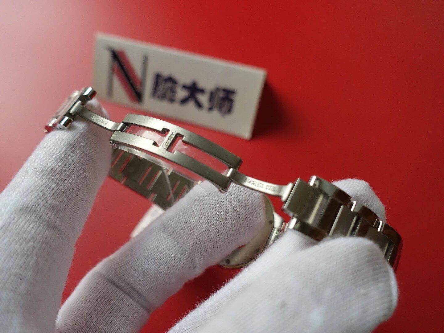 盤面做工:可以非常清晰的看到字面,羅馬數字刻度使用的是油壓工藝,刻度飽滿,清晰、黑亮、凸起的、立體感非常贊!所有的刻度,都沒有任何位置的偏差。7點位置有一極小斜印的“CARTIER”字母,這最能考察藍氣球的印刷水準了,工藝水準非常高!