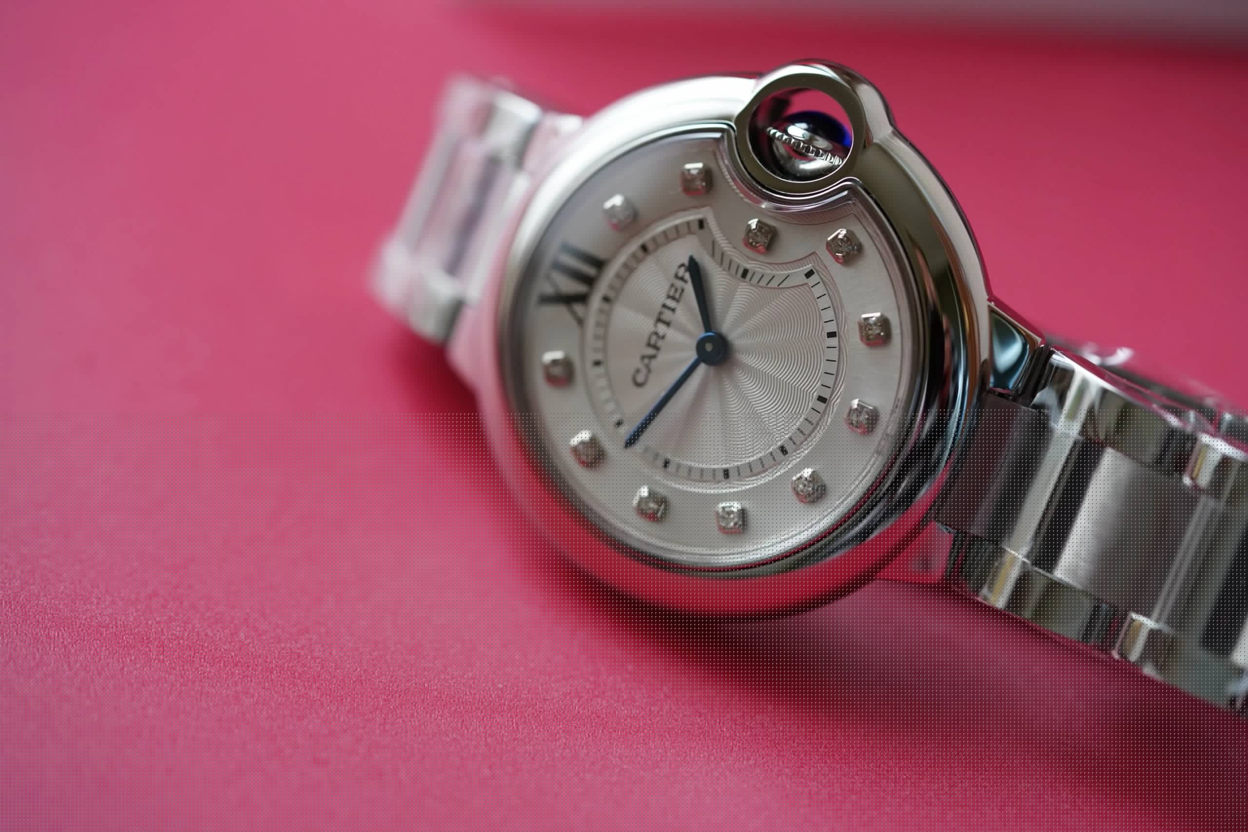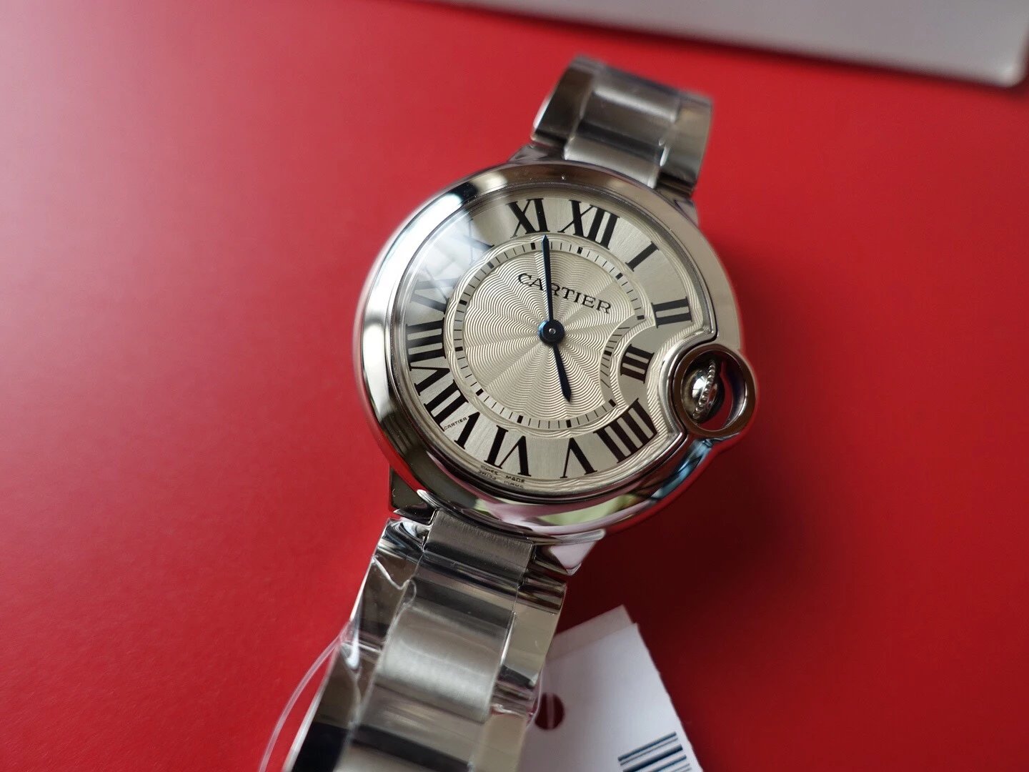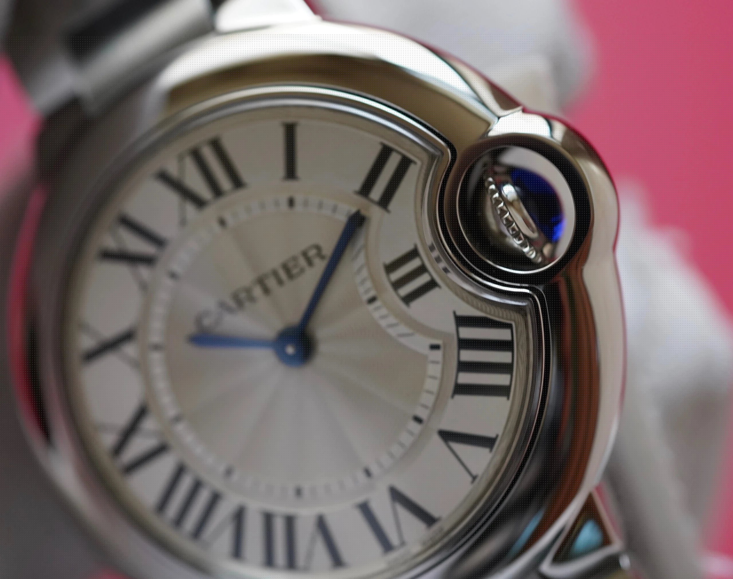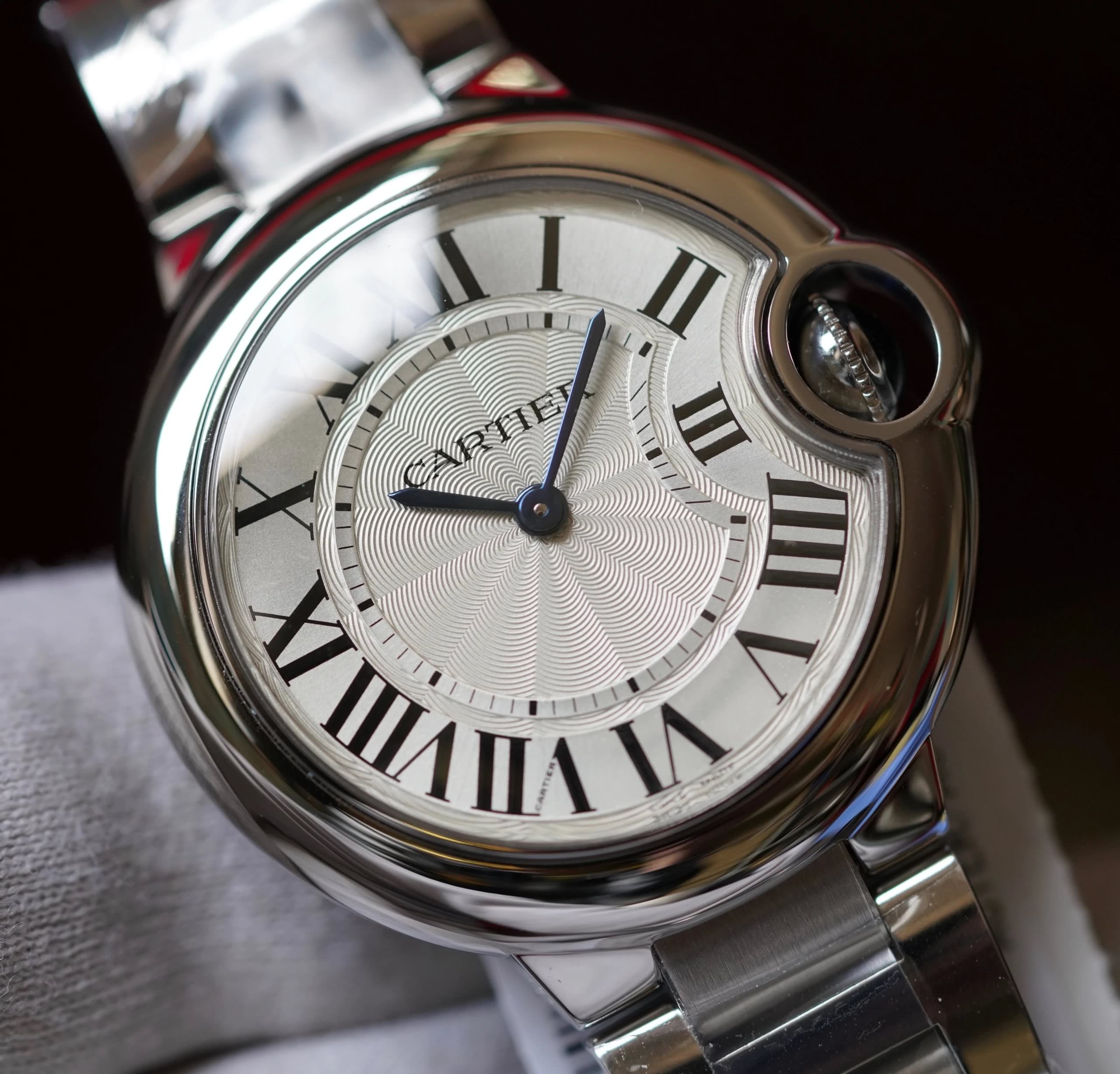 盤面做工:可以非常清晰的看到字面,羅馬數字刻度使用的是油壓工藝,刻度飽滿,清晰、黑亮、凸起的、立體感非常贊!所有的刻度,都沒有任何位置的偏差。7點位置有一極小斜印的“CARTIER”字母,這最能考察藍氣球的印刷水準了,工藝水準非常高!