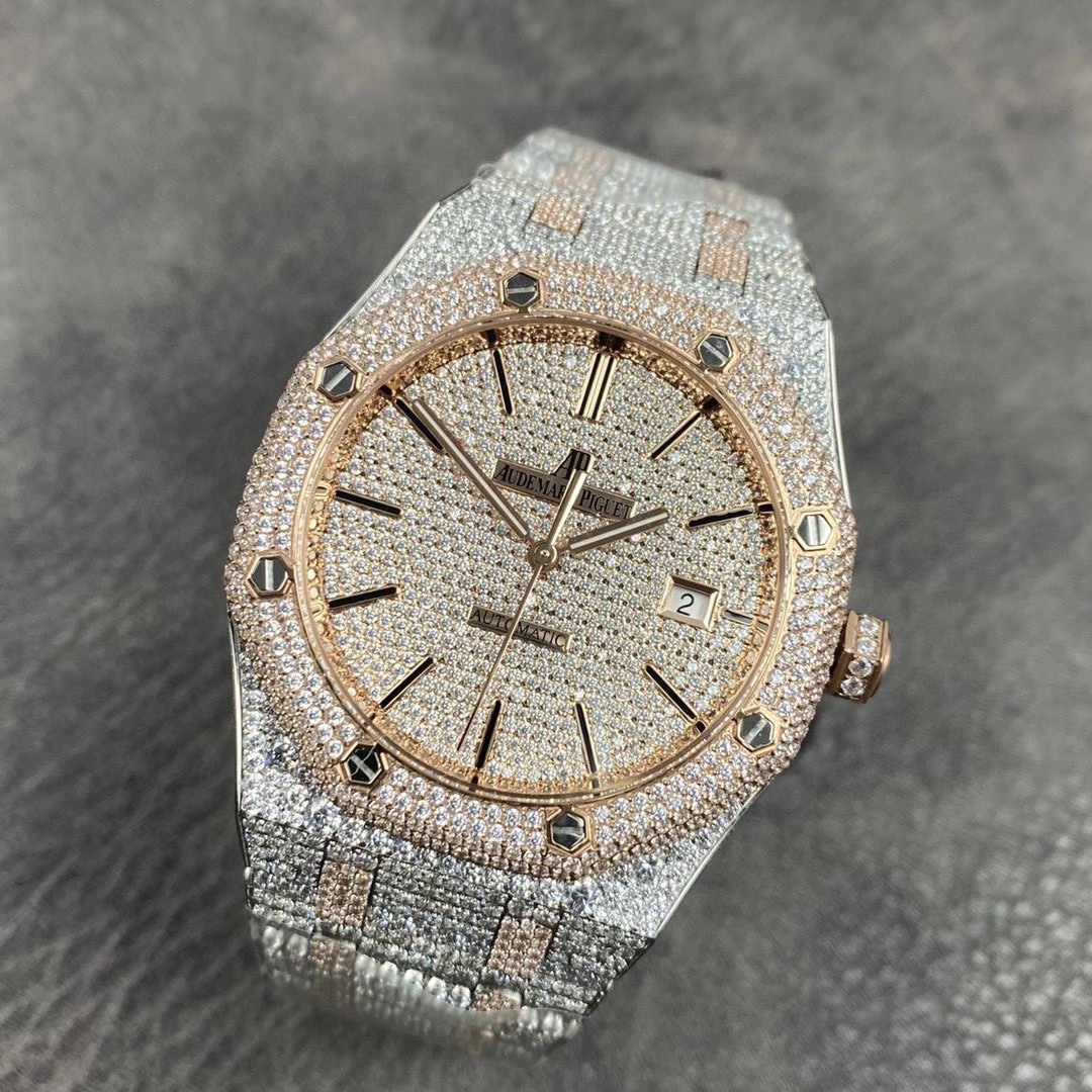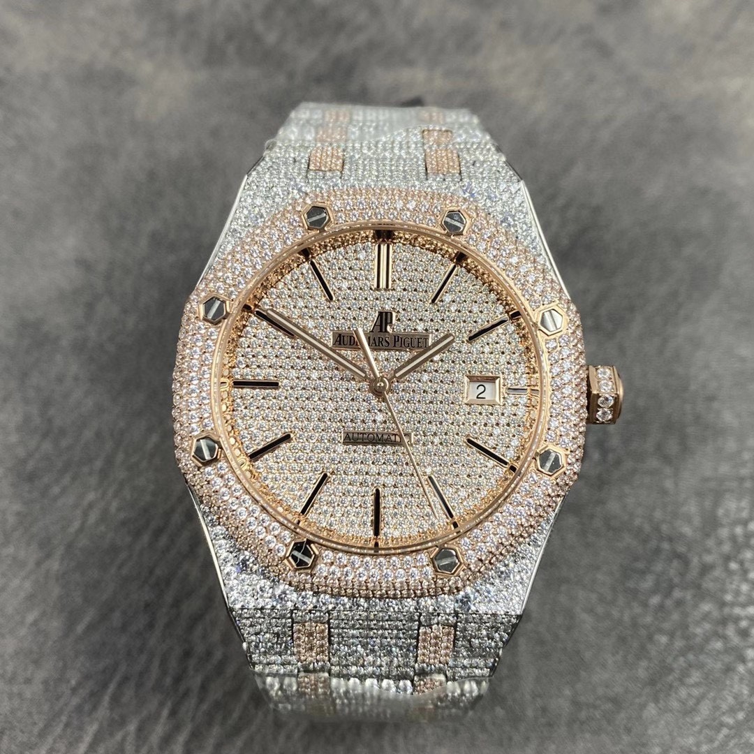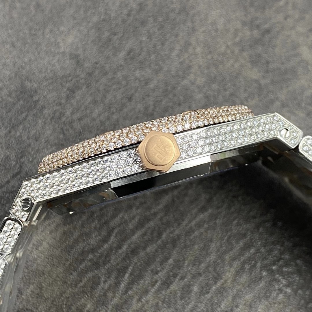 震撼來襲!皇家橡樹15400滿天星系列少量到貨! 歷經重重工藝,終於大功告成!整表密集鑲滿最頂級的施華洛世奇美鑽,包括鋼帶側邊也是滿鑲鑽,嘗試了無數次的加工工藝,追求奢華至極的無敵質感!不惜一切的成本,終於打造出目前最豪華的15400滿天星。秒殺其他現有版本的細節和做工! 表頭尺寸41mm,機芯採用9015改CAL.3120機芯。 讓每個人體驗滿天星的奢華! 歡迎品鑒!