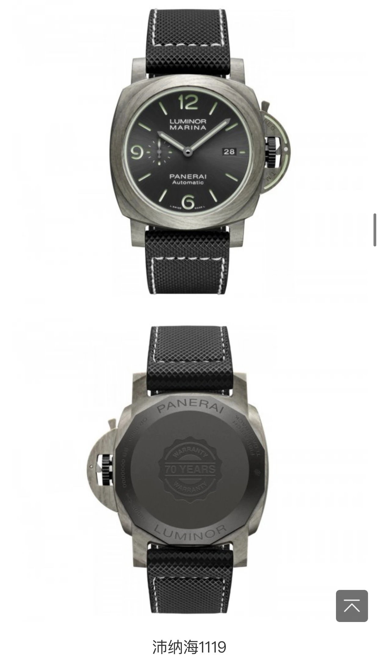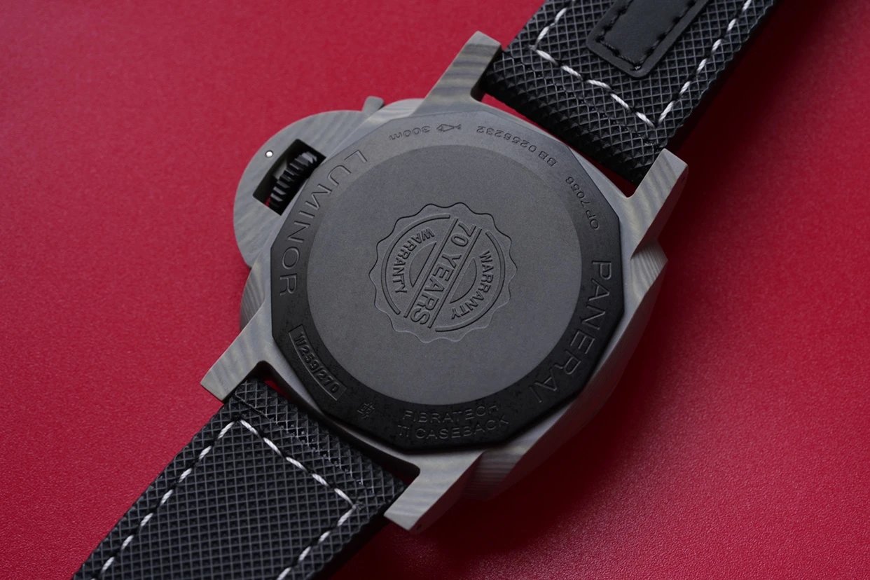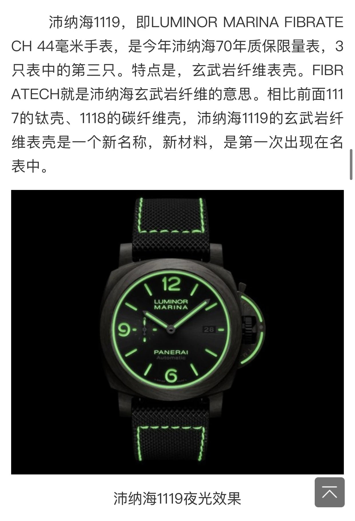 玄武岩纖維的意思。玄武岩纖維,就是把玄武岩材料融化,然後通過拉伸,形成纖維束。玄武岩纖維聽著挺“高深”,其實現在在航空發動機、汽車、攝影器材中,都有應用,因為玄武岩纖維的強度是不銹鋼的6倍,並且很輕。這次,沛納海把玄武岩纖維用在了名表當中。沛納海1119的玄武岩纖維表殼是淺灰色,明顯比1118的碳纖維顏色淺。