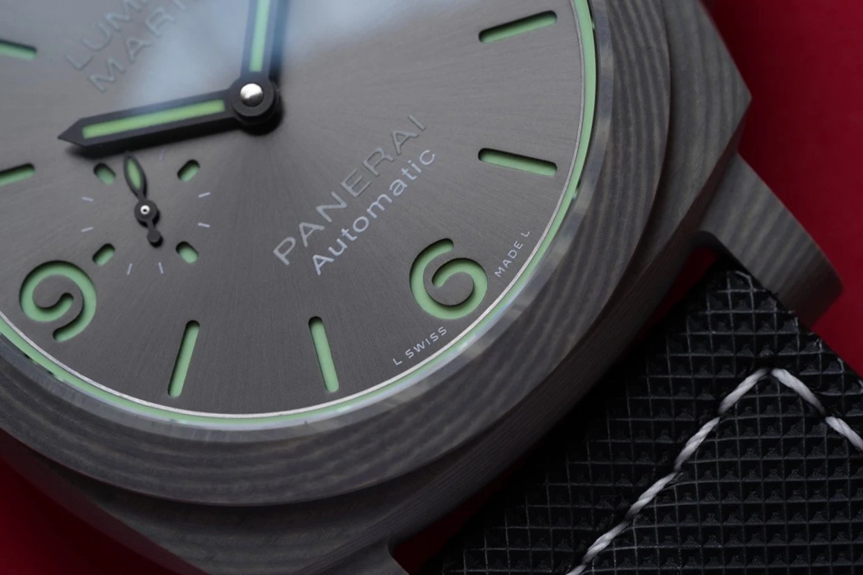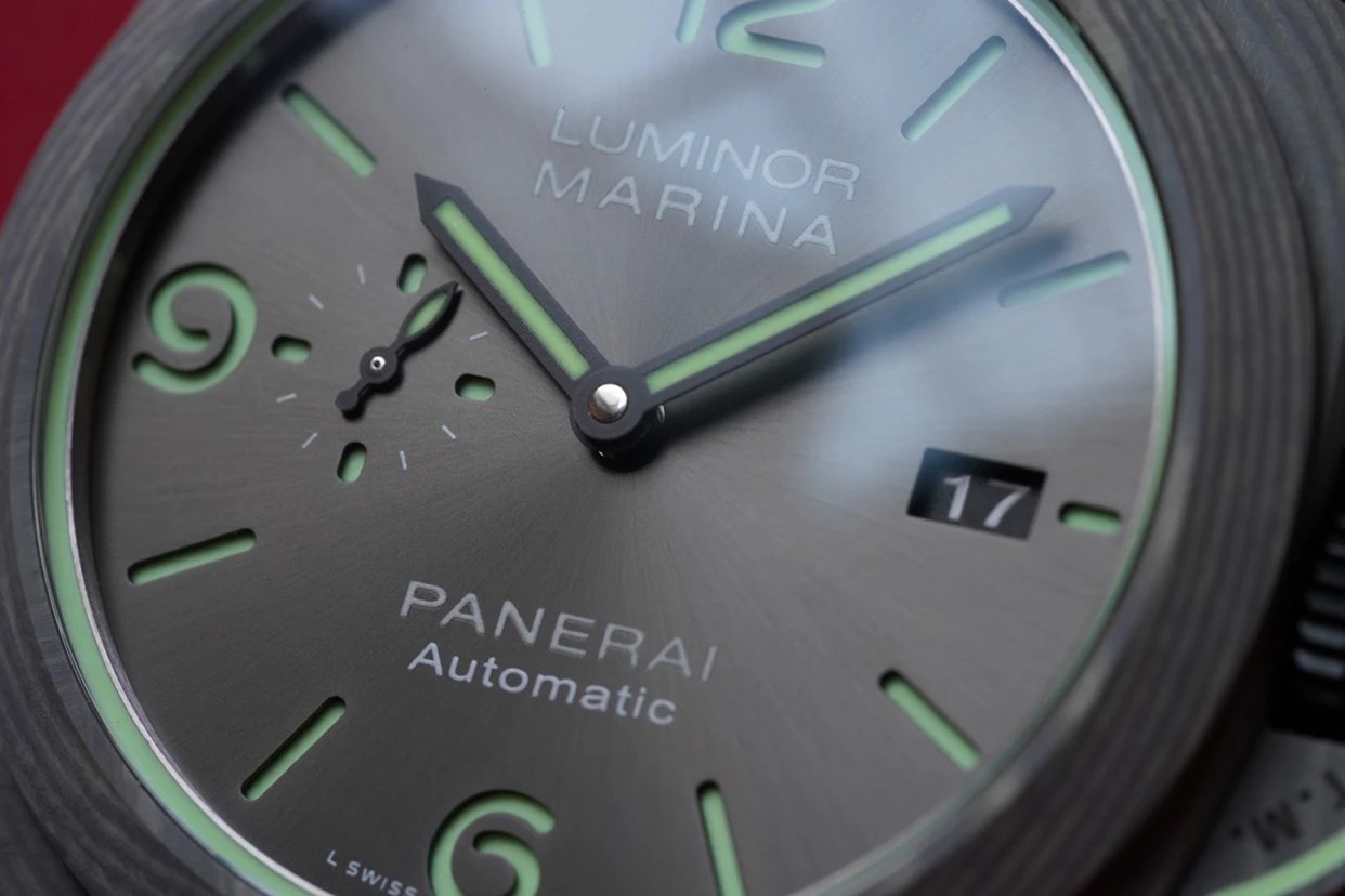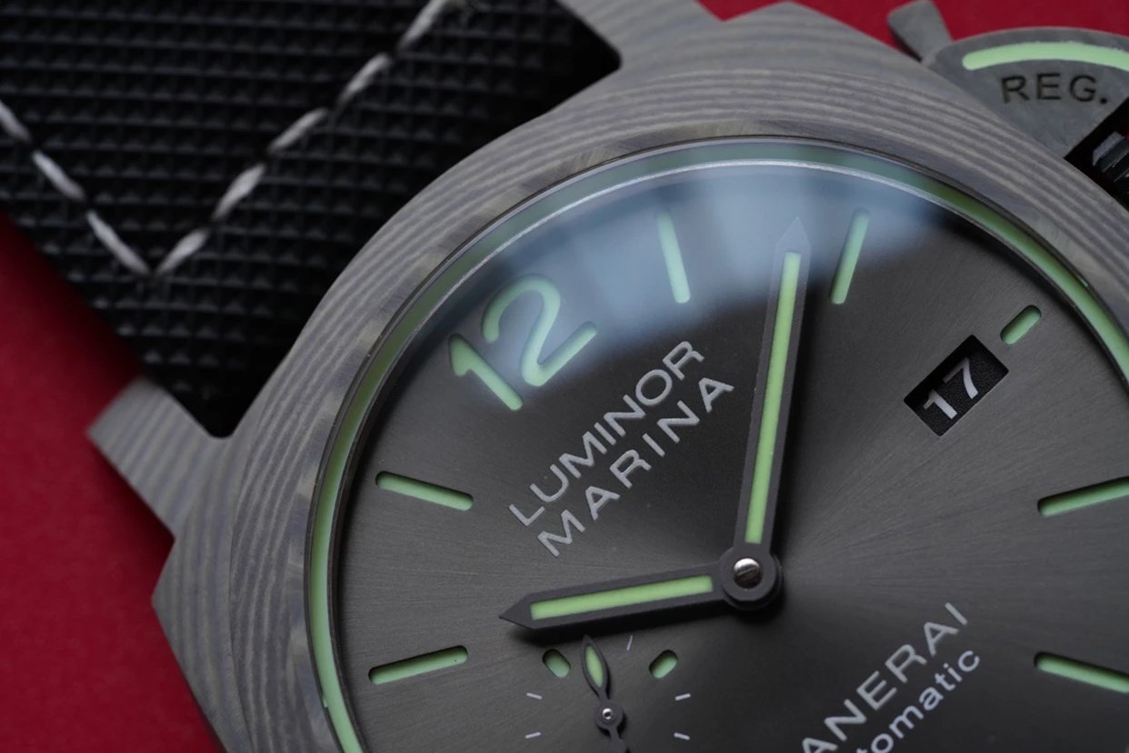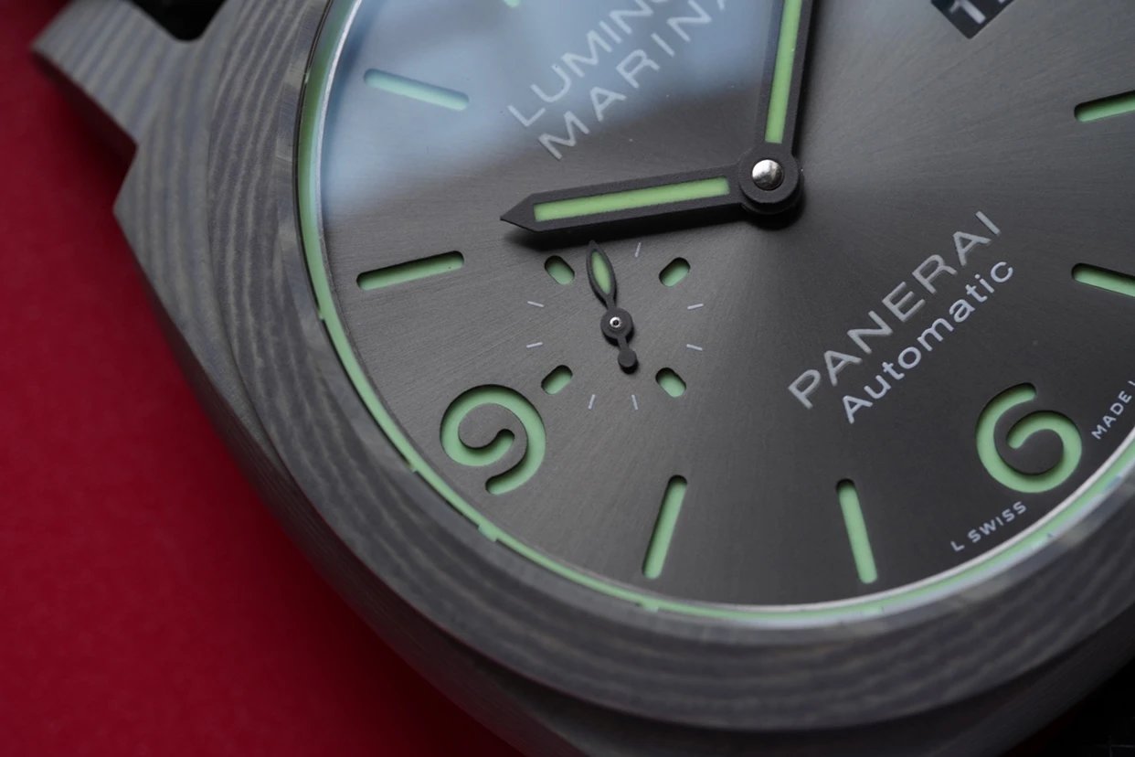 盤面採用黑色陽光放射紋,12點和6點位置飾有沛納海品牌標識以及腕表所屬系列。盤面佈置也非常合理,日曆盤面設置在3點鐘位置,小秒盤設置在9點鐘位置,相互呼應,整體大氣且又不失優雅的觀賞美感。中央安置了劍型指針,所有時標刻度和指針全部採用了綠色夜光Super-LumiNova材質填充,6、9、12點位阿拉伯數字立體感十足,彰顯大氣!條形時標做工立體,同時也有夜光塗層。