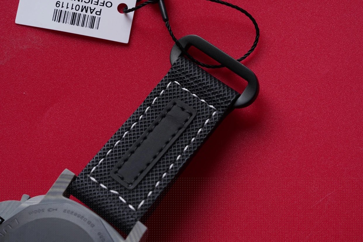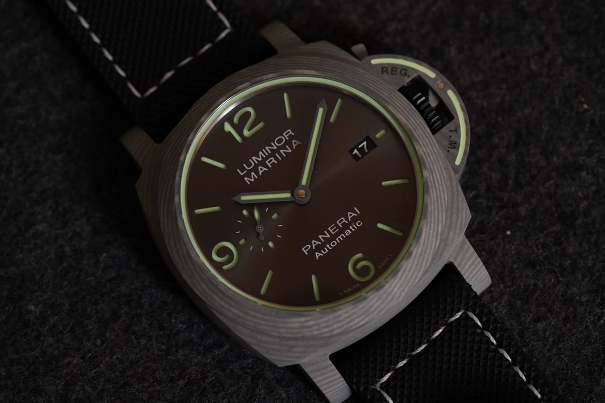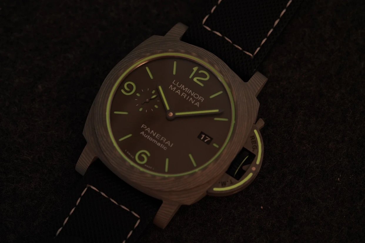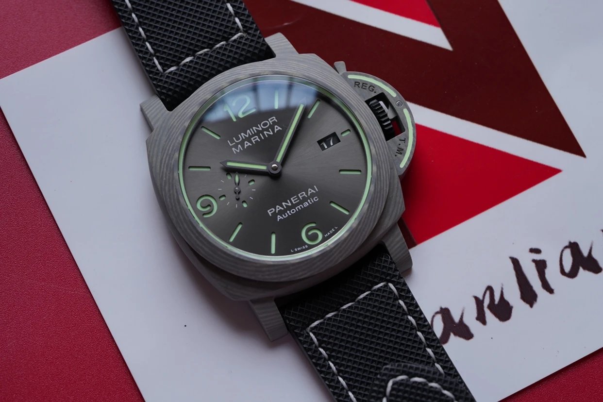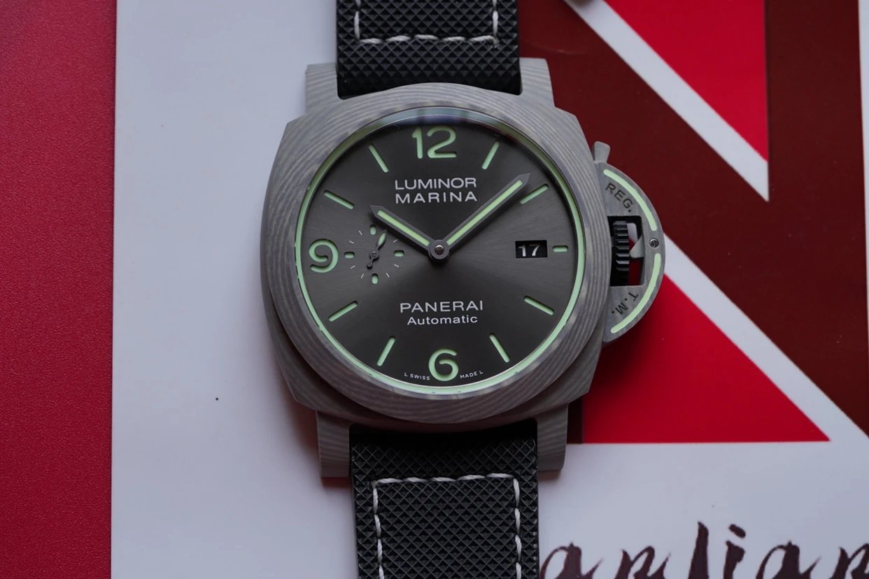 盤面採用黑色陽光放射紋,12點和6點位置飾有沛納海品牌標識以及腕表所屬系列。盤面佈置也非常合理,日曆盤面設置在3點鐘位置,小秒盤設置在9點鐘位置,相互呼應,整體大氣且又不失優雅的觀賞美感。中央安置了劍型指針,所有時標刻度和指針全部採用了綠色夜光Super-LumiNova材質填充,6、9、12點位阿拉伯數字立體感十足,彰顯大氣!條形時標做工立體,同時也有夜光塗層。