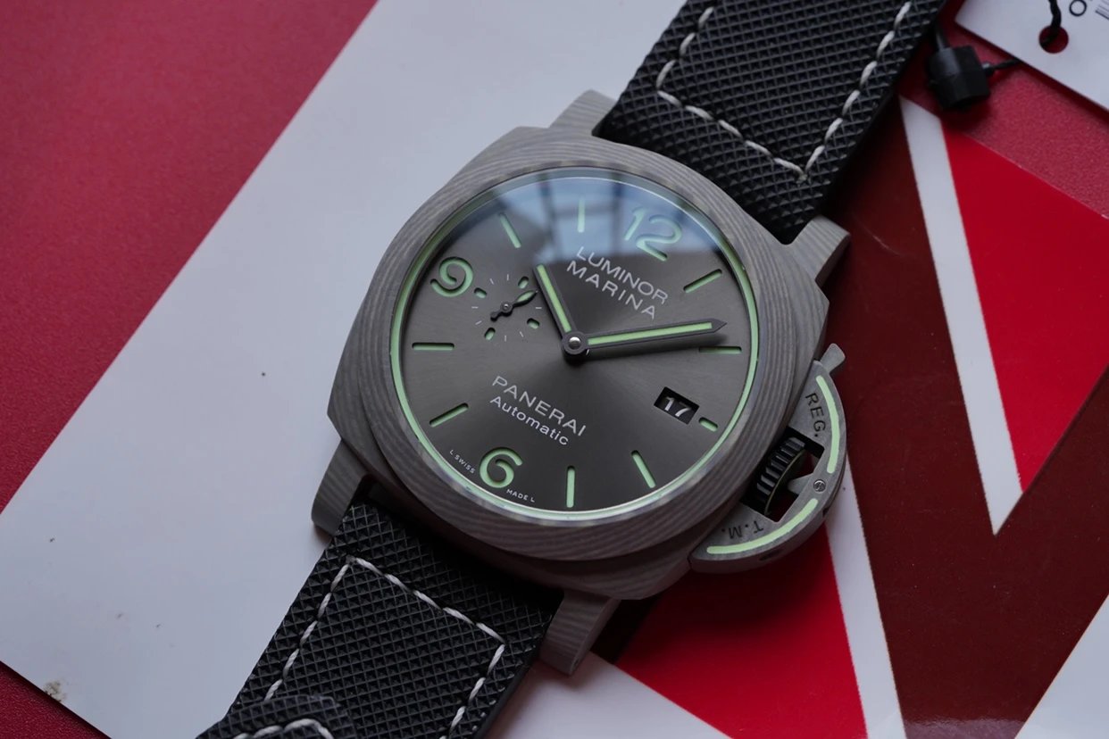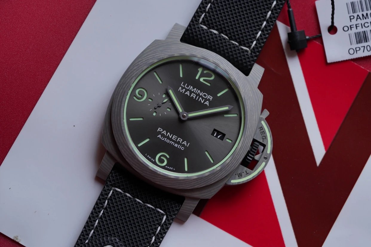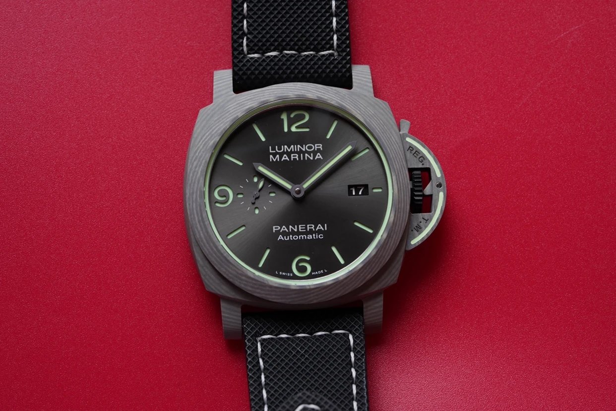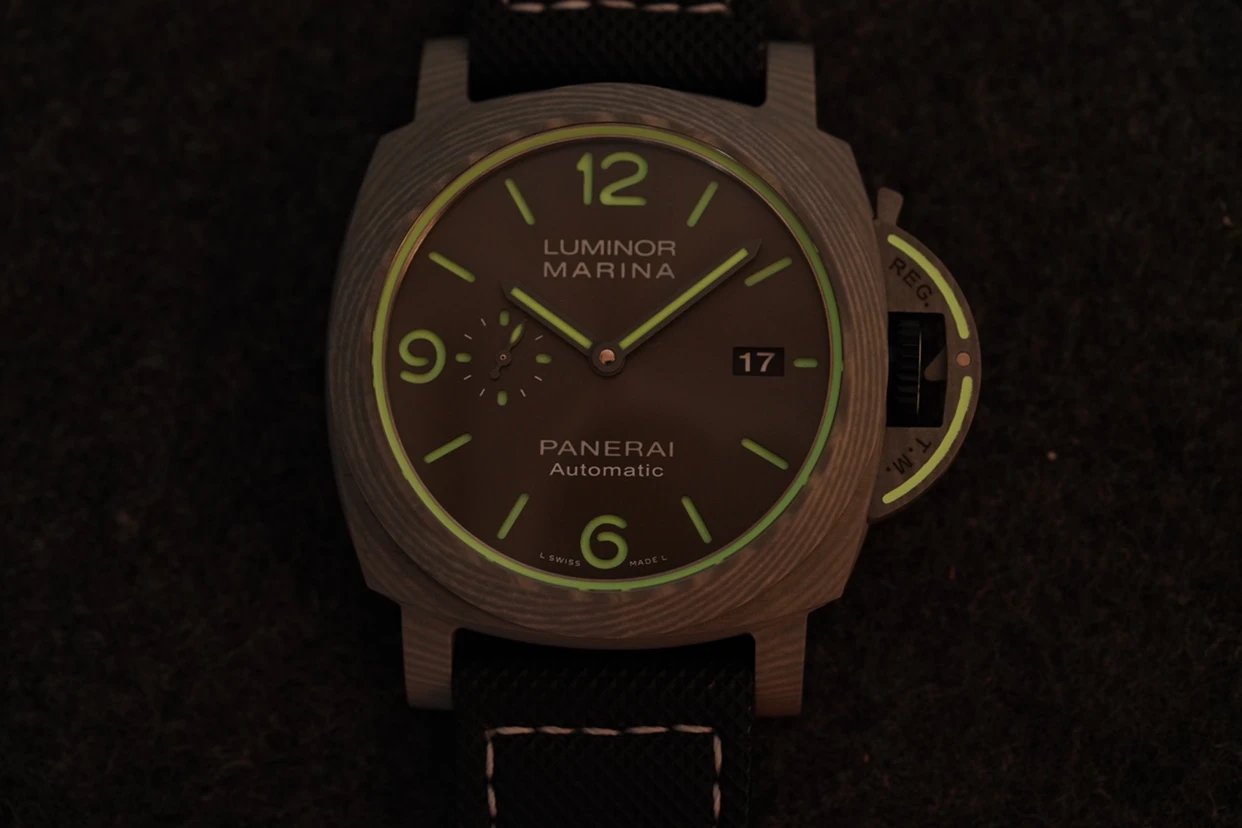 盤面採用黑色陽光放射紋,12點和6點位置飾有沛納海品牌標識以及腕表所屬系列。盤面佈置也非常合理,日曆盤面設置在3點鐘位置,小秒盤設置在9點鐘位置,相互呼應,整體大氣且又不失優雅的觀賞美感。中央安置了劍型指針,所有時標刻度和指針全部採用了綠色夜光Super-LumiNova材質填充,6、9、12點位阿拉伯數字立體感十足,彰顯大氣!條形時標做工立體,同時也有夜光塗層。