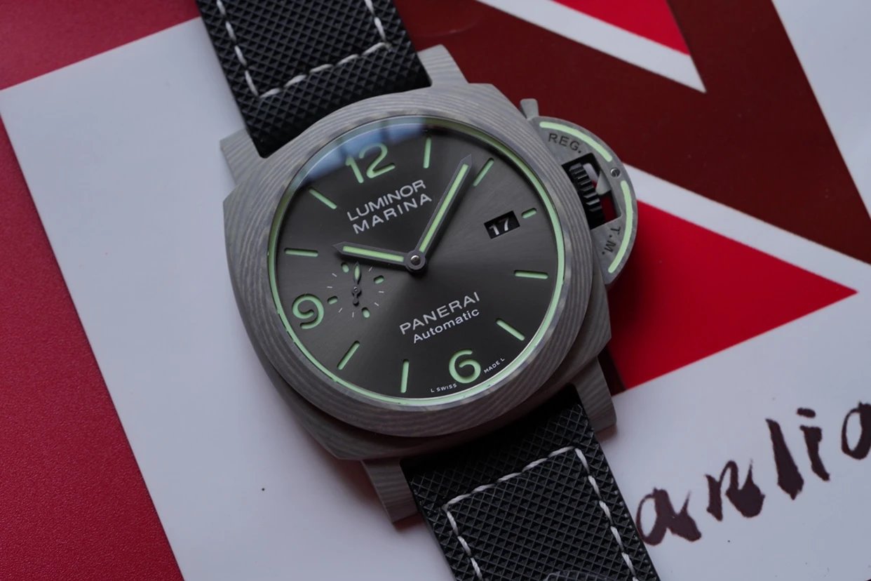 1119廬米諾系列腕表,直徑44mm,採用玄武岩纖維材質表殼,表鏡採用微拱的藍寶石水晶玻璃鏡面,純黑色盤面中點綴覆有夜光塗層的綠色刻度,經典的柱狀時標與阿拉伯數字穿插,呈現出一抹優雅的味道。