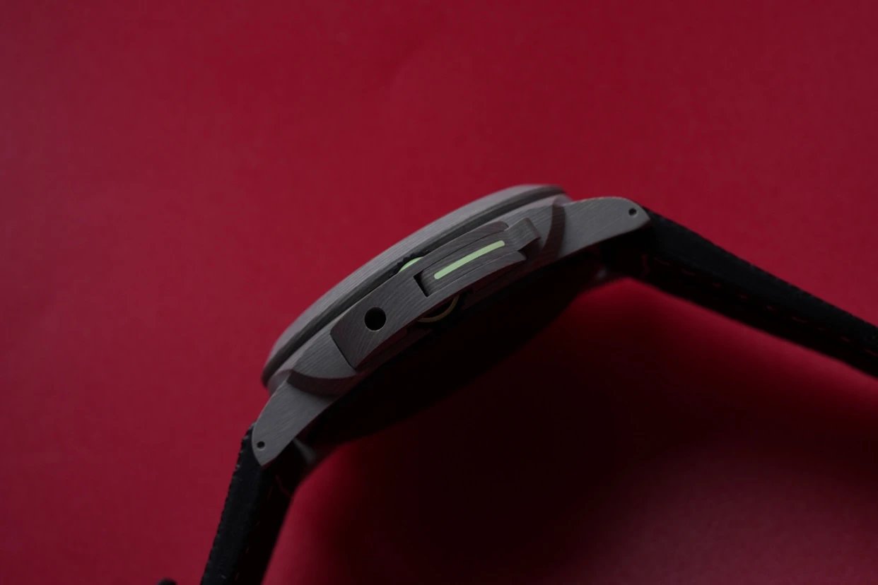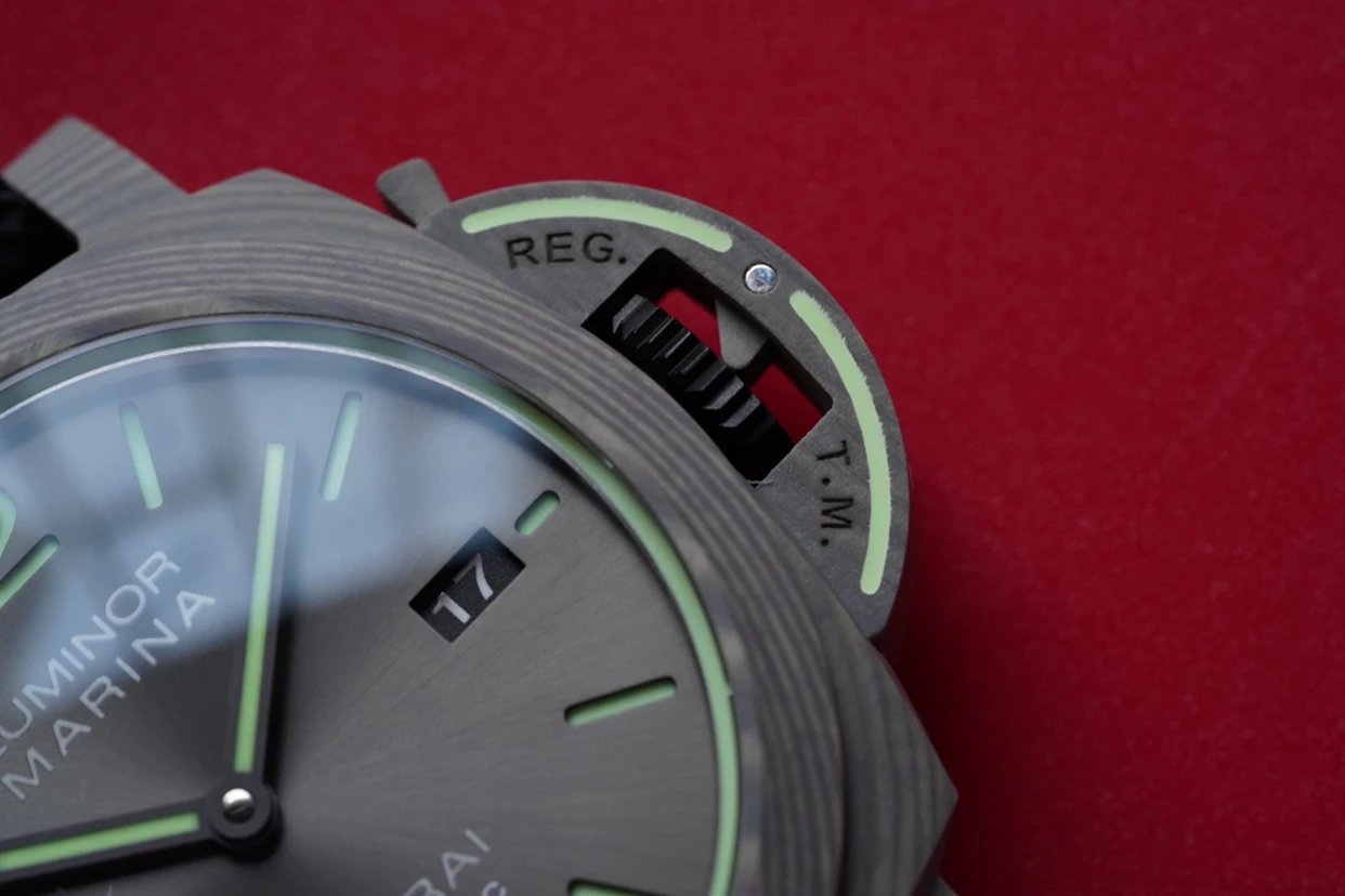 表冠採用沛納海Luminor1950系列一貫的設計,外側以加壓杠杆保護,算是整個鐘錶界獨樹一幟的設計了,表冠為圓形,上鏈表冠飾有鋸齒,方便佩戴者把握與調校,側面還設有拱形的護橋,不僅個性獨特,而且可以時刻呵護著表冠。
