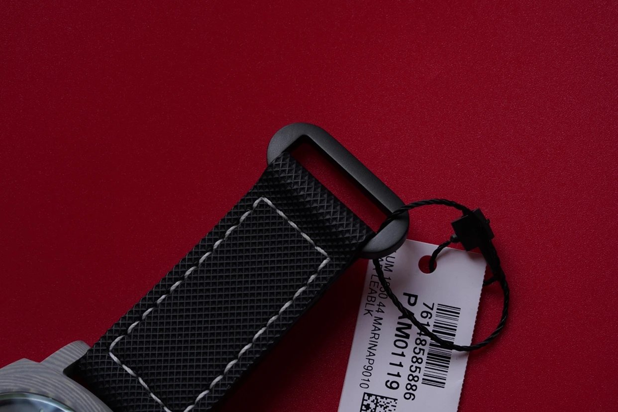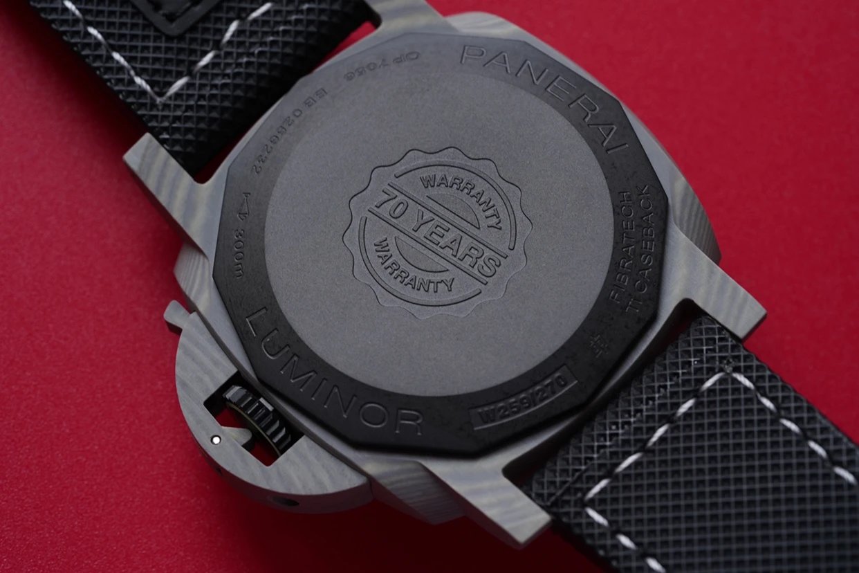 沛納海1119腕表採用的密底設計,底蓋上鏤刻有70年質保標誌。機芯搭載的是訂制的P9000機芯,採用雙發盒雙向上鏈設計,動儲能力強大,同時具有通過快調時針調整日曆功能,而不能單獨直接調整日曆。