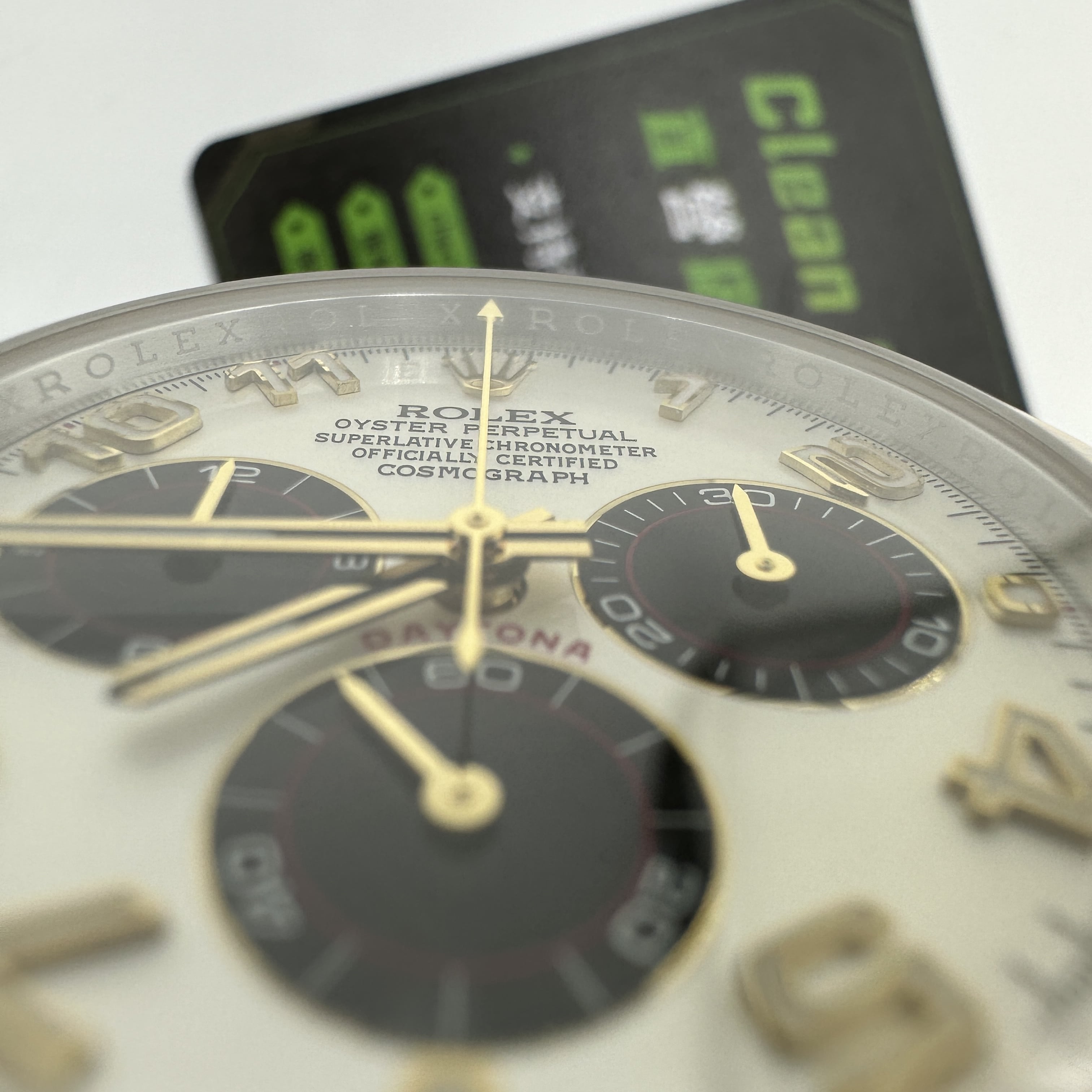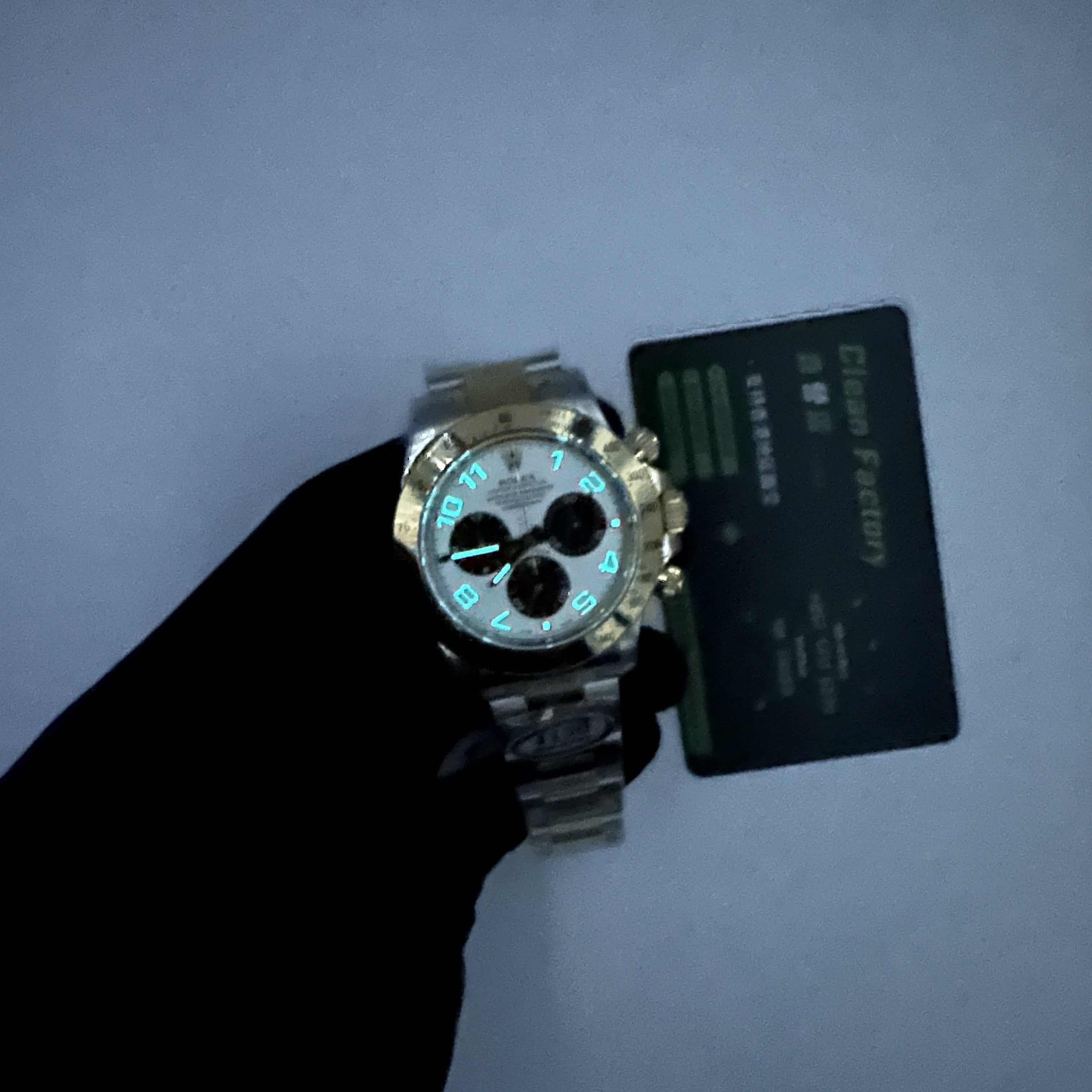 C廠Daytona以V3版本作為當前高仿市面上最頂級配置工藝,詮釋了精益求精與高端機芯配置的結合還原度達到原版比例.這一隻C廠熊貓地通拿是間金款式,與其他熊貓款式不同的是,時間顯示刻度使用了阿拉伯數字,每一個數字使用刻模工藝還原,內置夜光填充,夜光的效果是非常飽和且飽和的視覺感.這也是C廠地通拿評價中最中肯的熱議話題之一,使用瑞士進口夜光源材質填充.