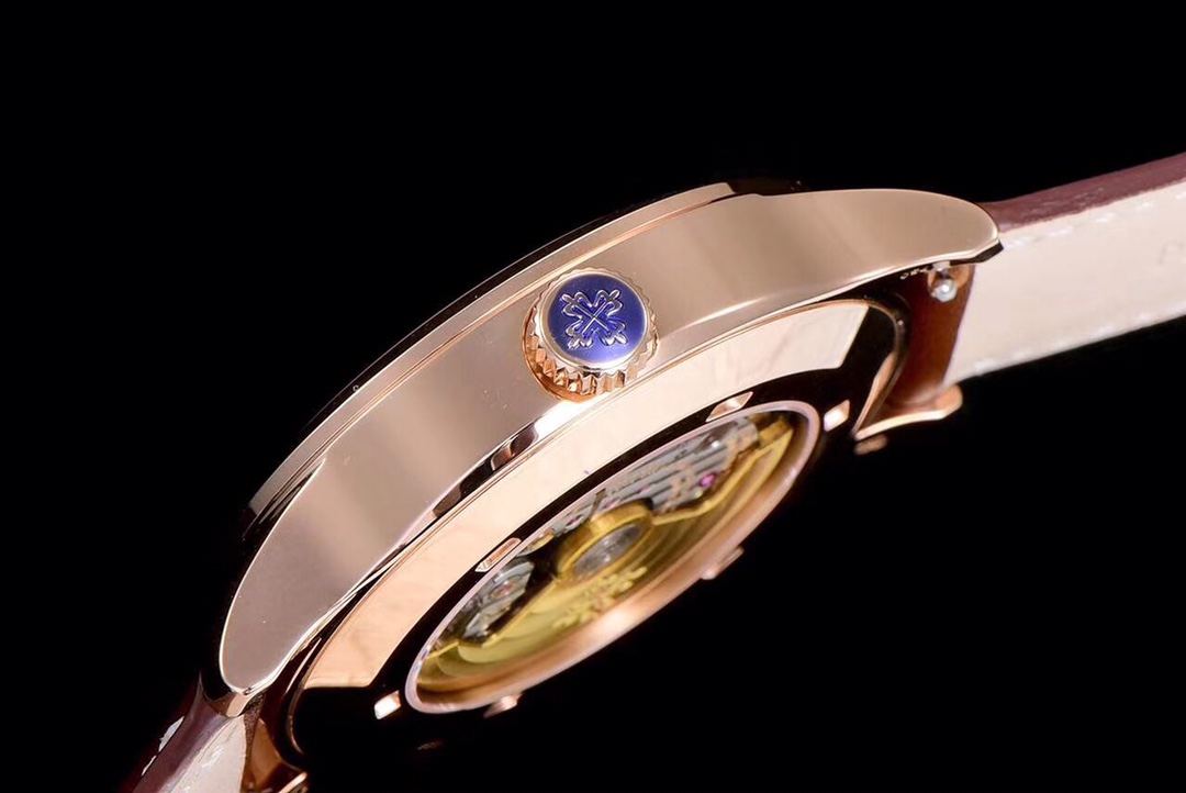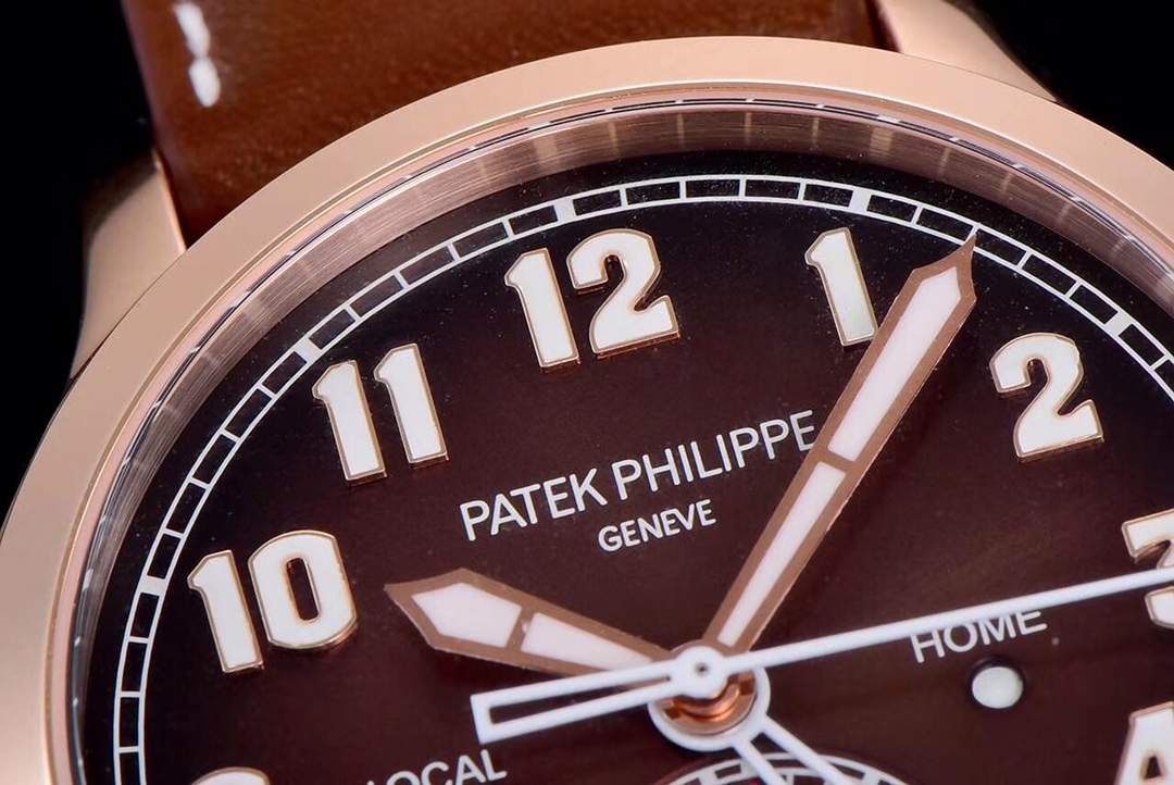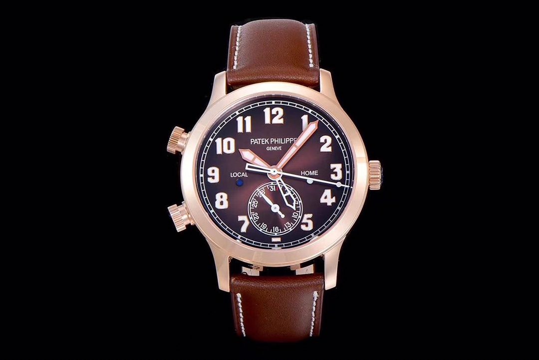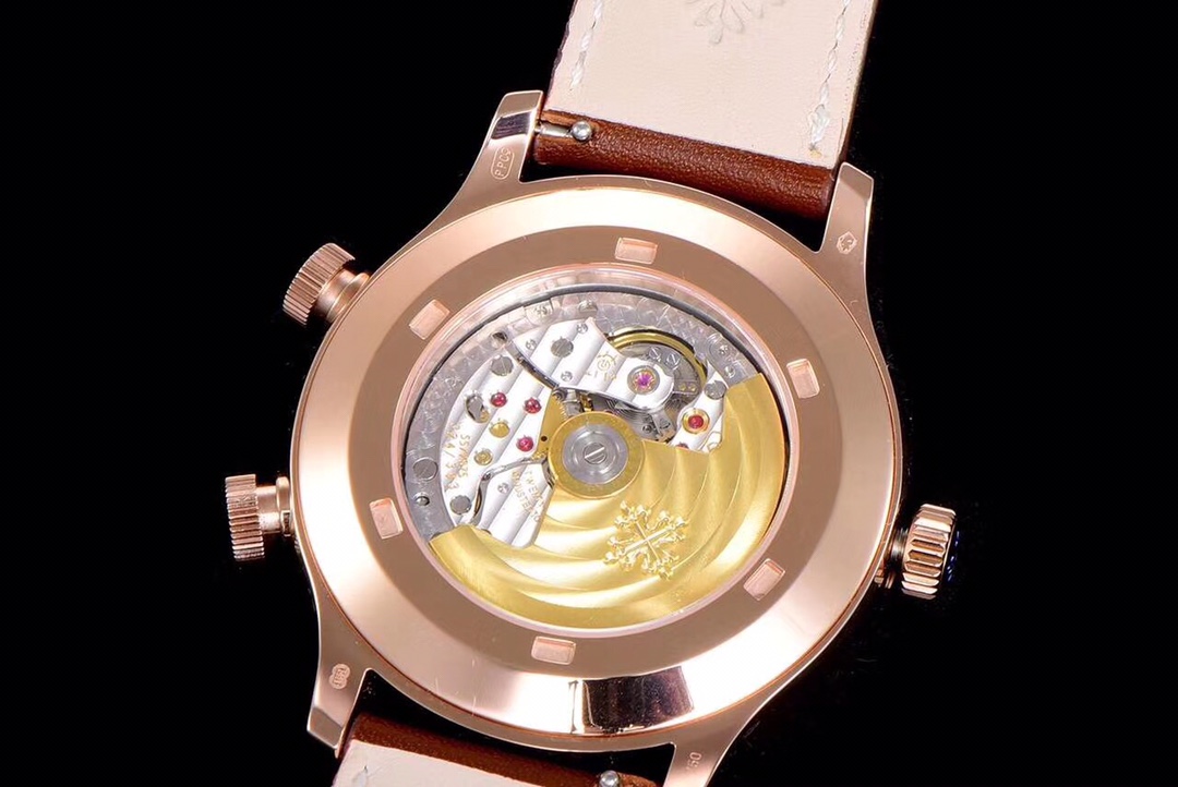 GR工廠最新V2升級版PP百達時區功能ref.5524 Calatrava飛行家旅行時間腕表系列”V2”技術特點:1.陞級最新同正品一致的皮帶與錶扣。 2.改良V1版本八和十字比特把頭不良問題。 3.修正V1版本玻璃倒影問題陞級為雙面高通透頂級玻璃。 4.優化機芯主夾板字體更為細緻替換最新換代甲板鴿子血紅寶石實現最接近正品的工藝。” GR工廠”恭迎錶迷品鑒