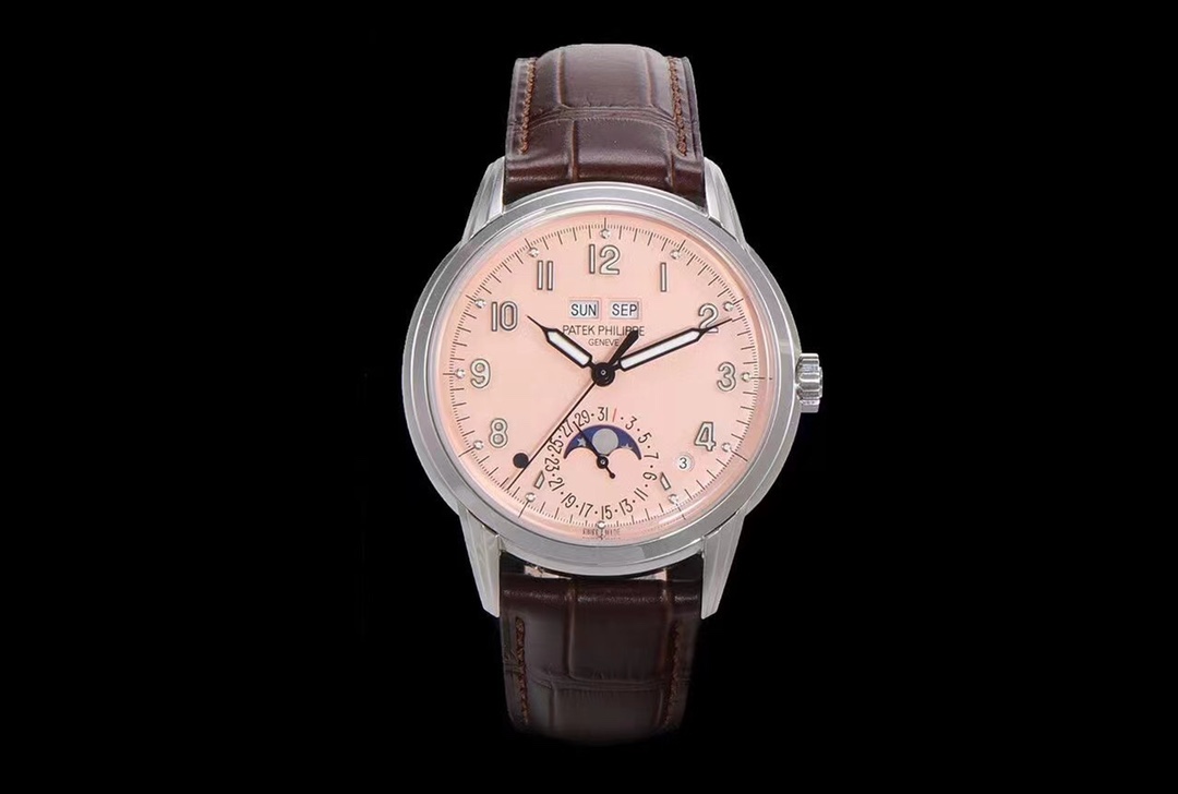 GR重金打造經典時計——百達翡麗5320G-001超級複雜功能時計直徑40毫米一體衝壓成型的雙層式精鋼錶殼,致敬了經典的設計語言奶油色的錶盤營造復古氛圍,錶盤邊緣刻印有密分秒數刻度,配金質阿拉伯數字及五分鐘凸圓刻度字釘,更有立體感。 時分指針以巴頓式設計為基礎,配以尖長的針尖,這特色造型是呼應了1950年代Ref. 1463計時碼表的指針。 錶盤6點位置是月相顯示和日期分撥。 在日期的右邊有閏年訓示,而對左邊有一個日/夜指示燈。 所有的萬年曆標誌都很好,一眼就能讀懂。 內裡搭置了仿324 S Q自動上鏈機芯,是324自動上條傳奇機芯的精裝版本。 機芯夾板橋經倒角,邊緣作細意打磨,主夾板飾以魚鱗紋,而夾板則綴以日內瓦波紋,夾板表面有包金雕刻,螺絲凹槽經打磨和倒角,連鑽孔亦同樣經打磨處理。 搭配朱古力啡色牛皮錶帶,進一步帶出復古氣息。 經典氣息滿滿,歡迎錶友品鑒