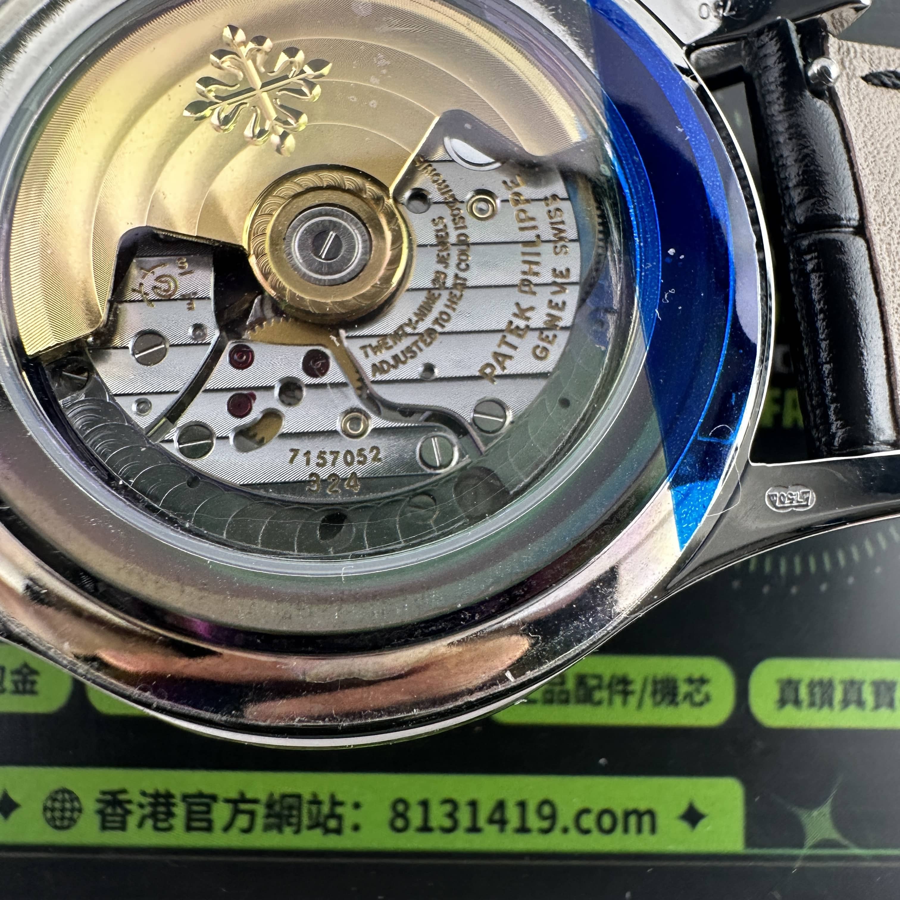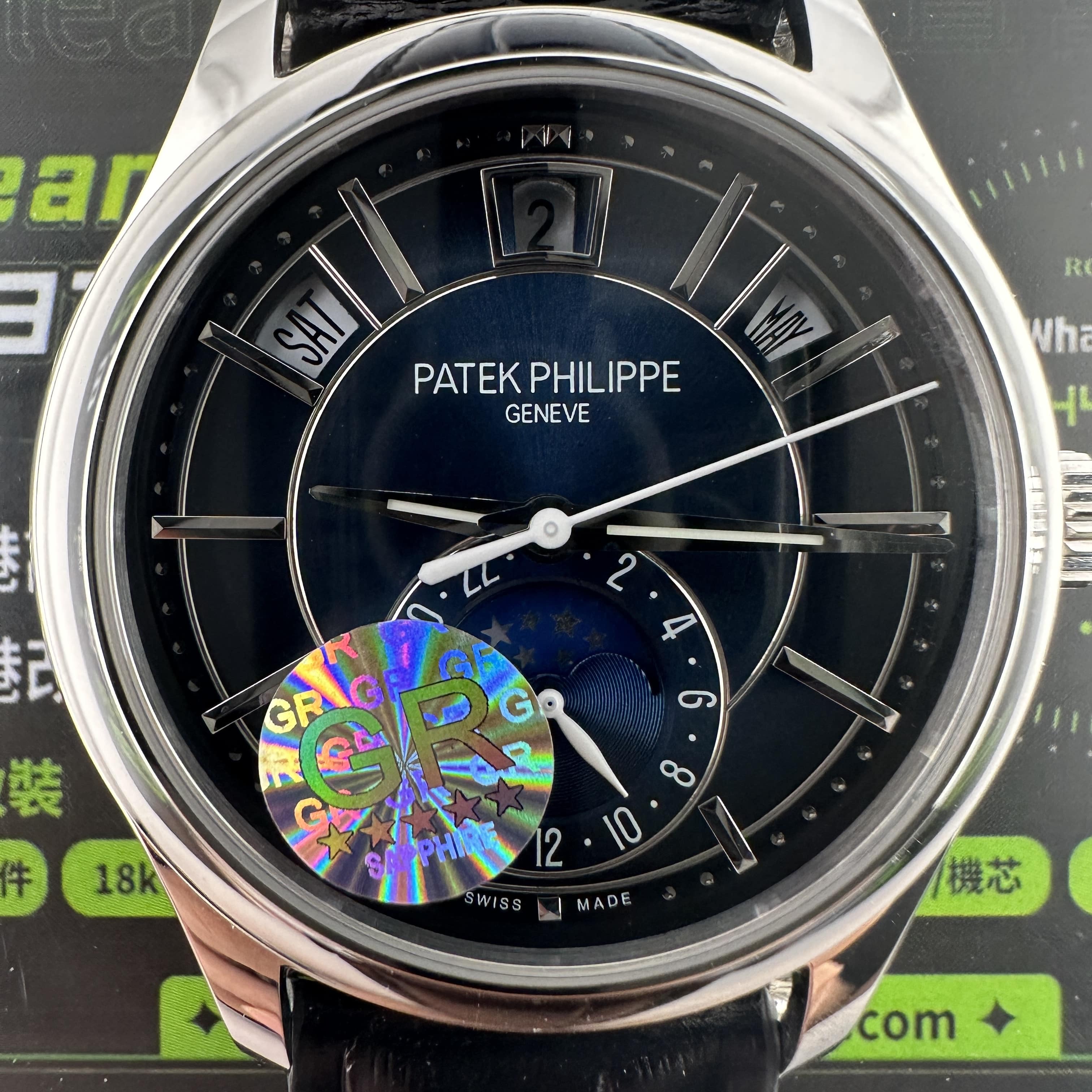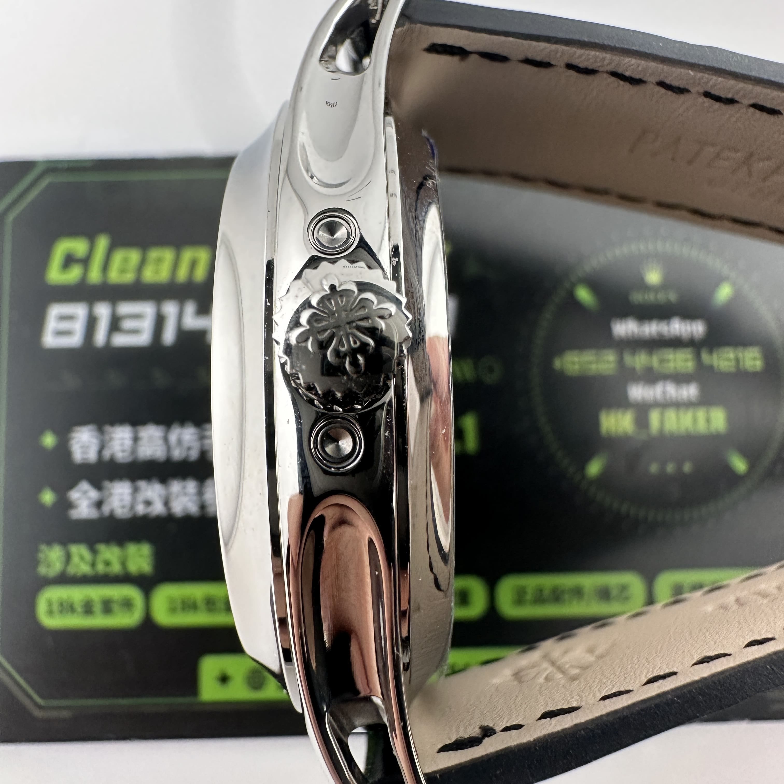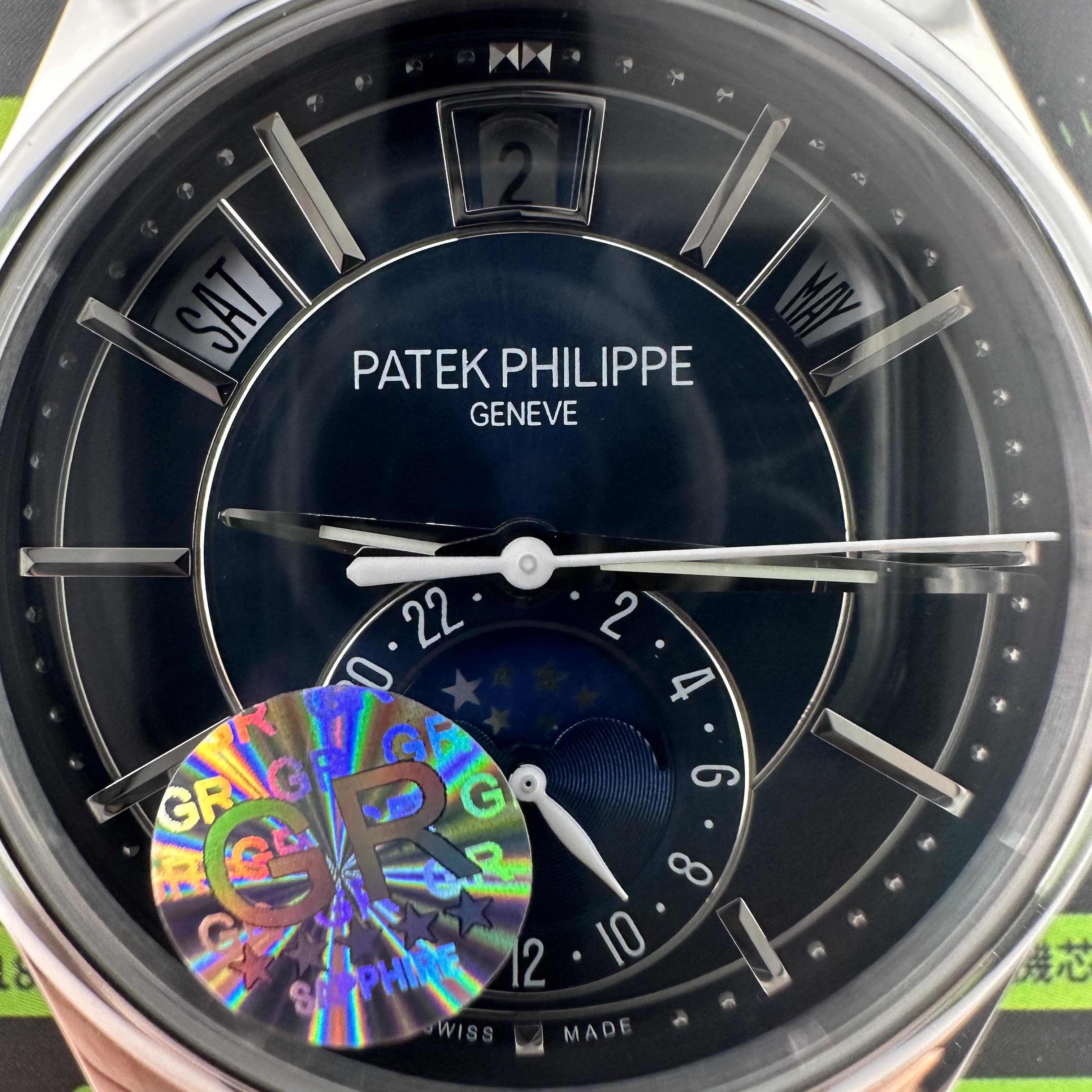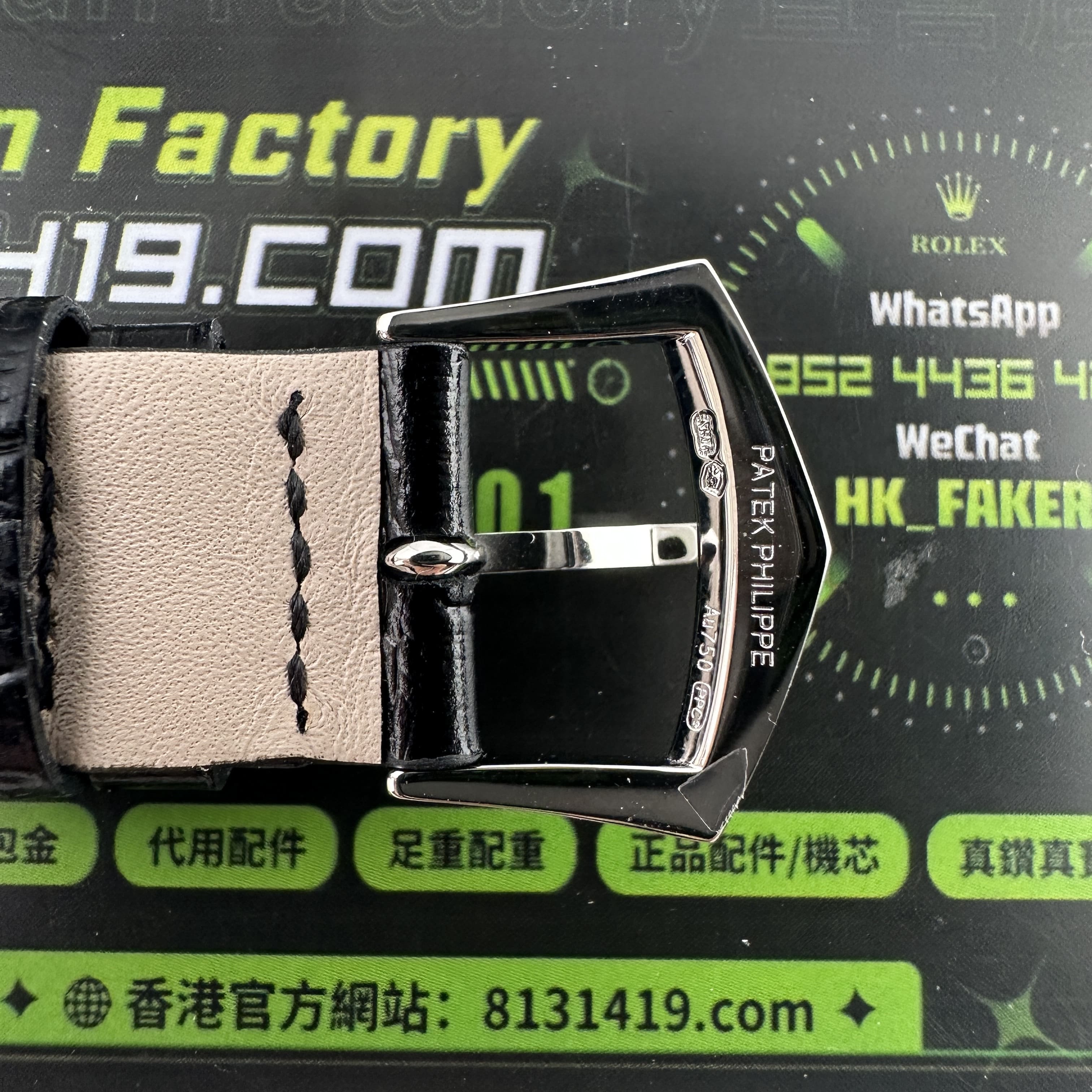 整錶尺寸40mm,厚度11.36mm基本上是同步原版尺寸.錶殼材質使用904L精鋼,外加PVD電鍍工藝達到與原版一致的白金色值,基本無色差! 藍水晶高透鏡片與錶殼貼合部分完全沒有白邊瑕疵.整張黑灰錶盤配備了多功能顯示.一共有5種功能顯示.GR廠PP5205G在功能還原上也是實現一比一還原使用.盤面顯示有日期-星期-月份和年曆顯示,包括月相部分,具體功能使用是通過錶殼四周有功能暗鍵,需要通過頂針調教,每一隻GR廠5205G都會配備.錶帶為小牛皮質純手工縫線,舒適度極致.錶扣可選擇針扣和PP蝴蝶釦.