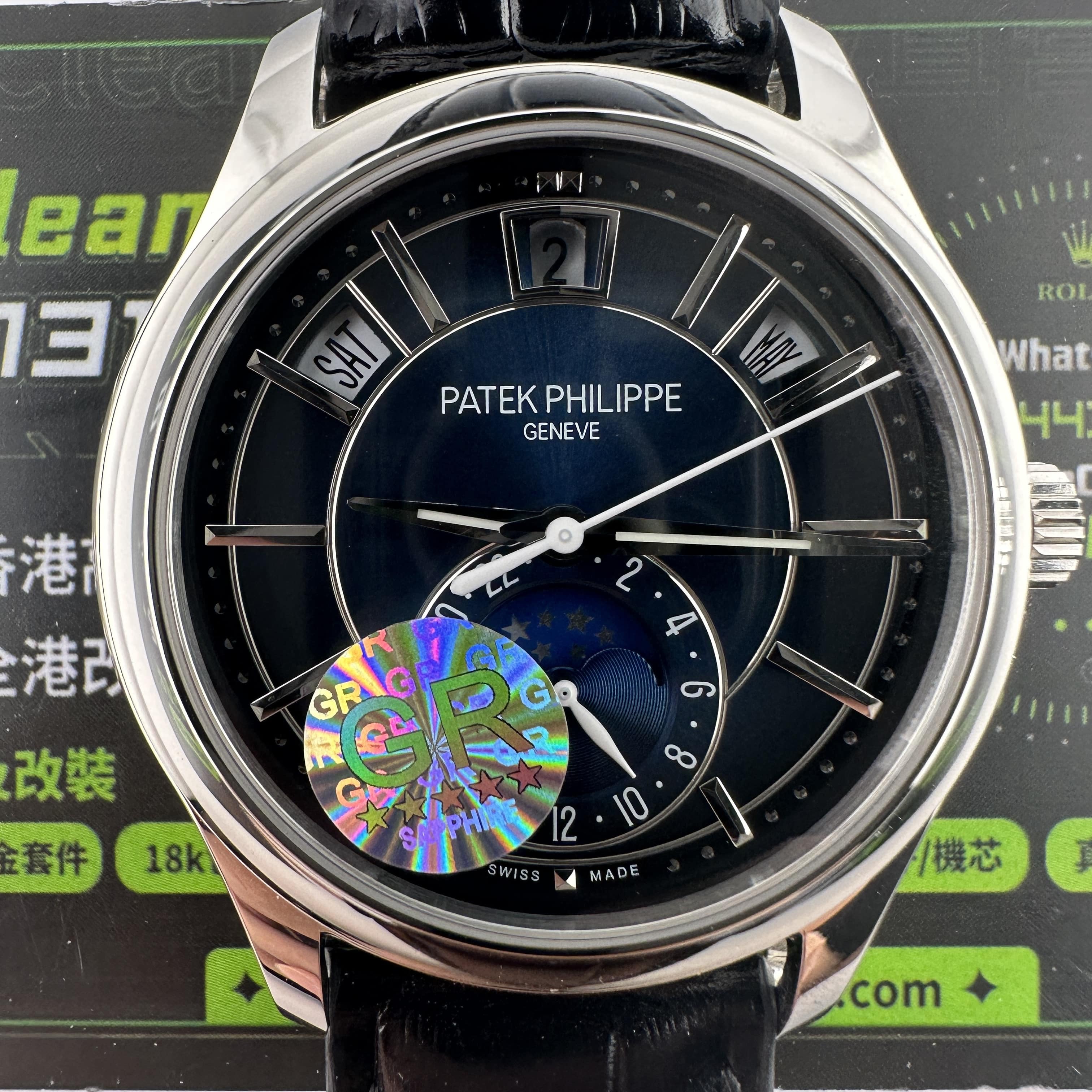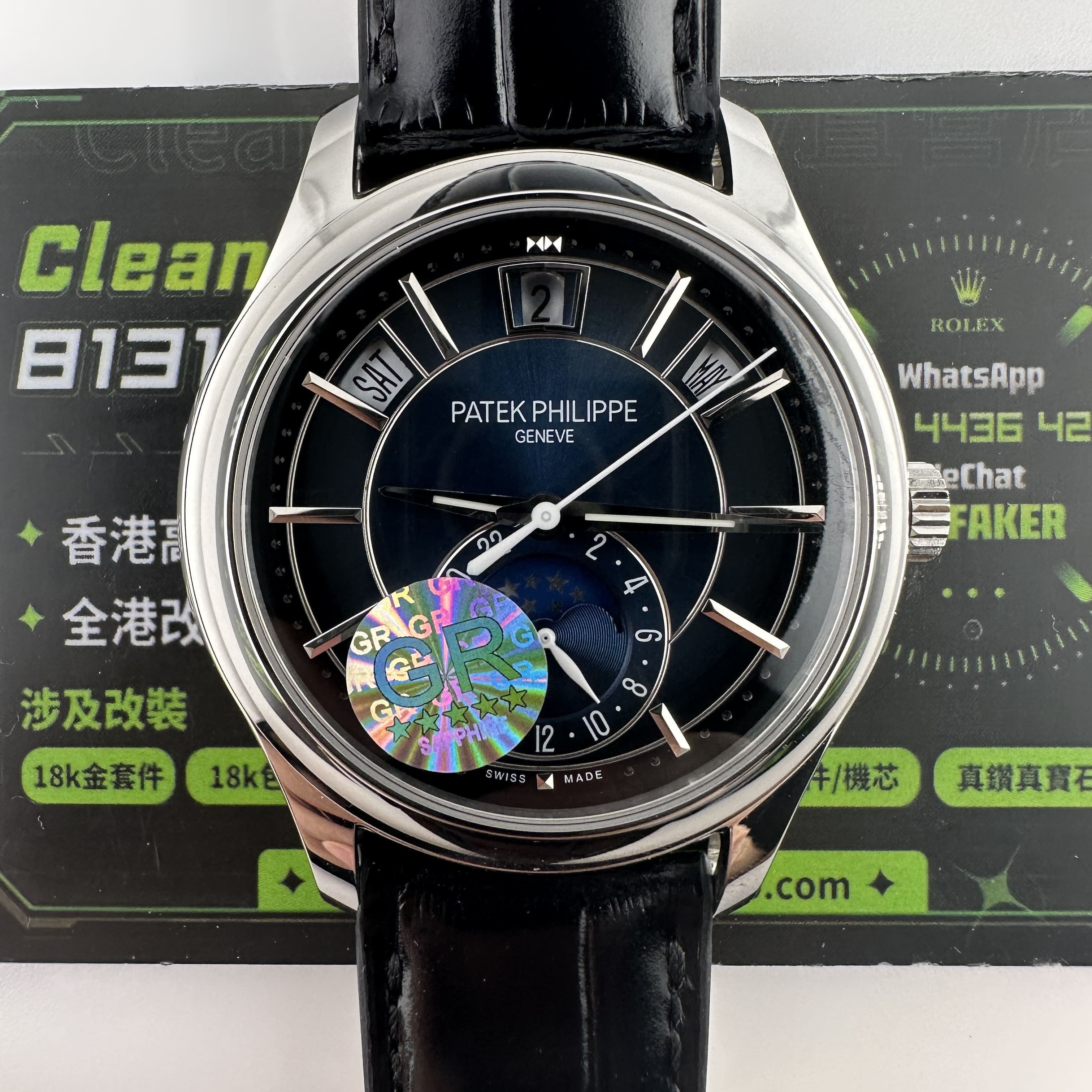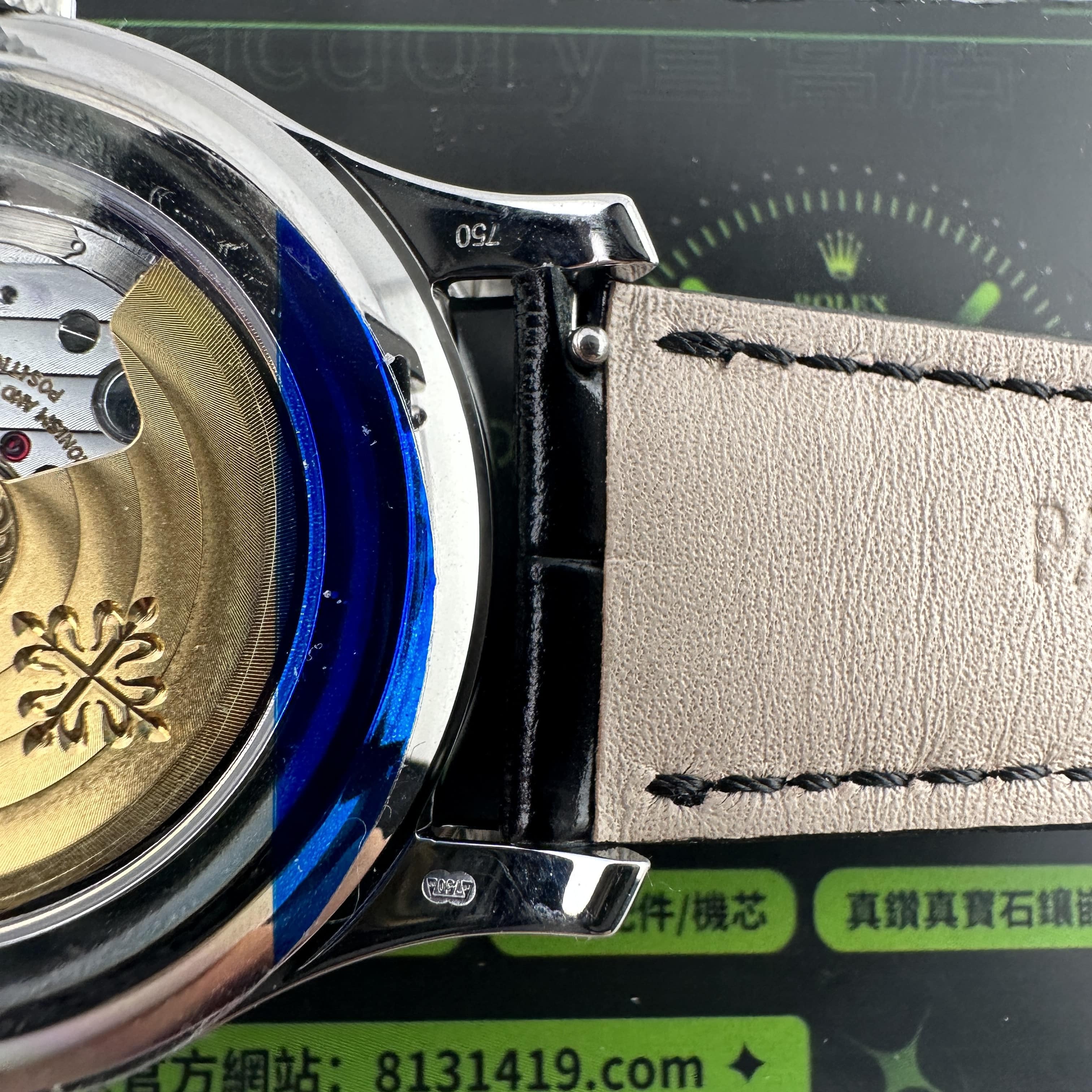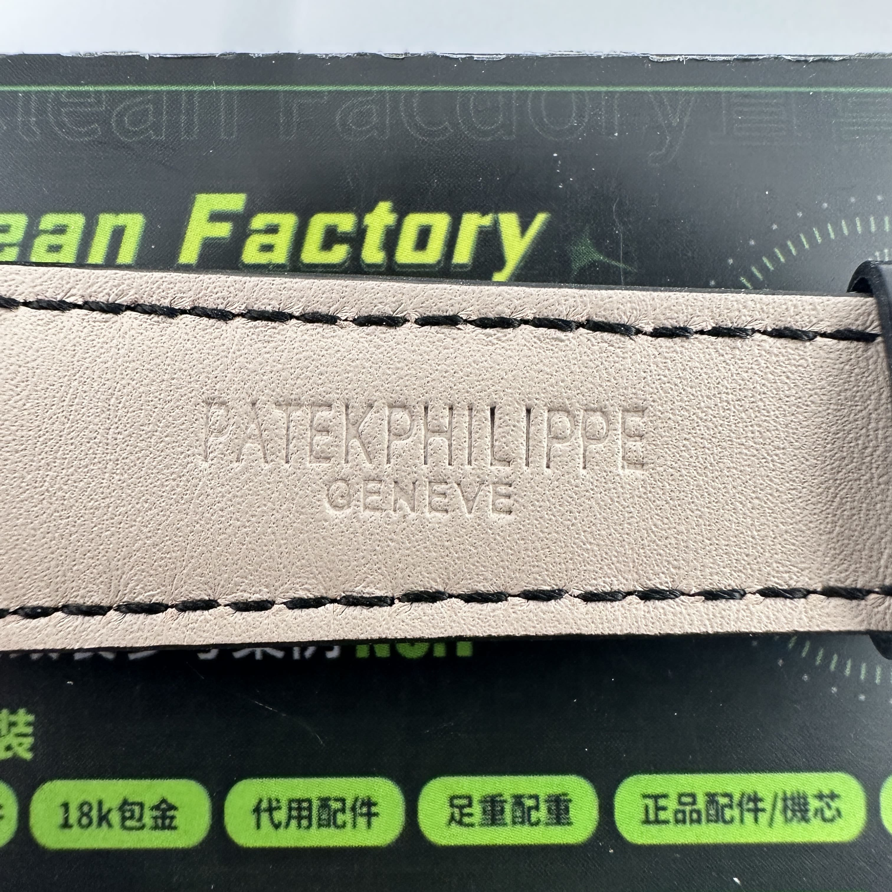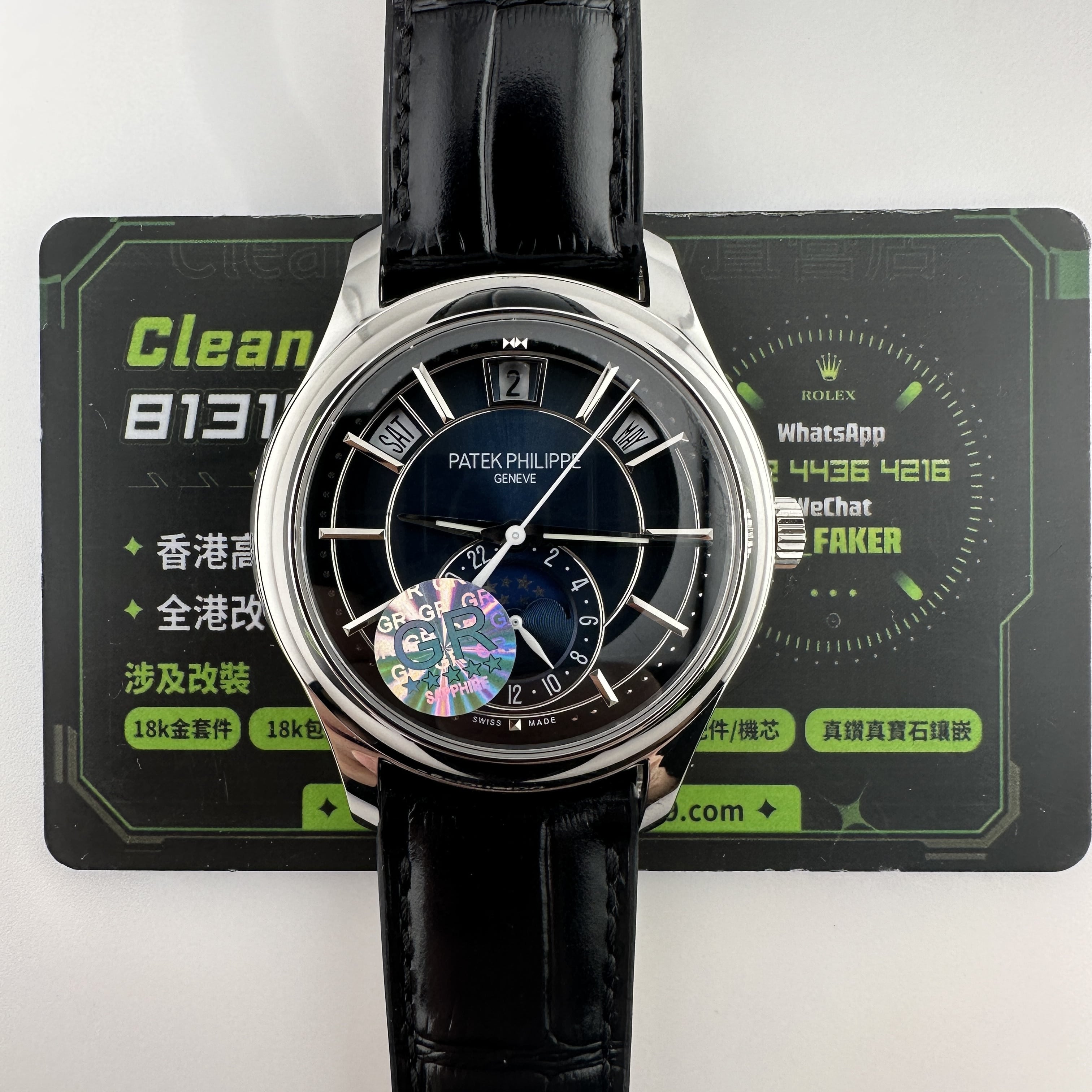 整錶尺寸40mm,厚度11.36mm基本上是同步原版尺寸.錶殼材質使用904L精鋼,外加PVD電鍍工藝達到與原版一致的白金色值,基本無色差! 藍水晶高透鏡片與錶殼貼合部分完全沒有白邊瑕疵.整張黑灰錶盤配備了多功能顯示.一共有5種功能顯示.GR廠PP5205G在功能還原上也是實現一比一還原使用.盤面顯示有日期-星期-月份和年曆顯示,包括月相部分,具體功能使用是通過錶殼四周有功能暗鍵,需要通過頂針調教,每一隻GR廠5205G都會配備.錶帶為小牛皮質純手工縫線,舒適度極致.錶扣可選擇針扣和PP蝴蝶釦.