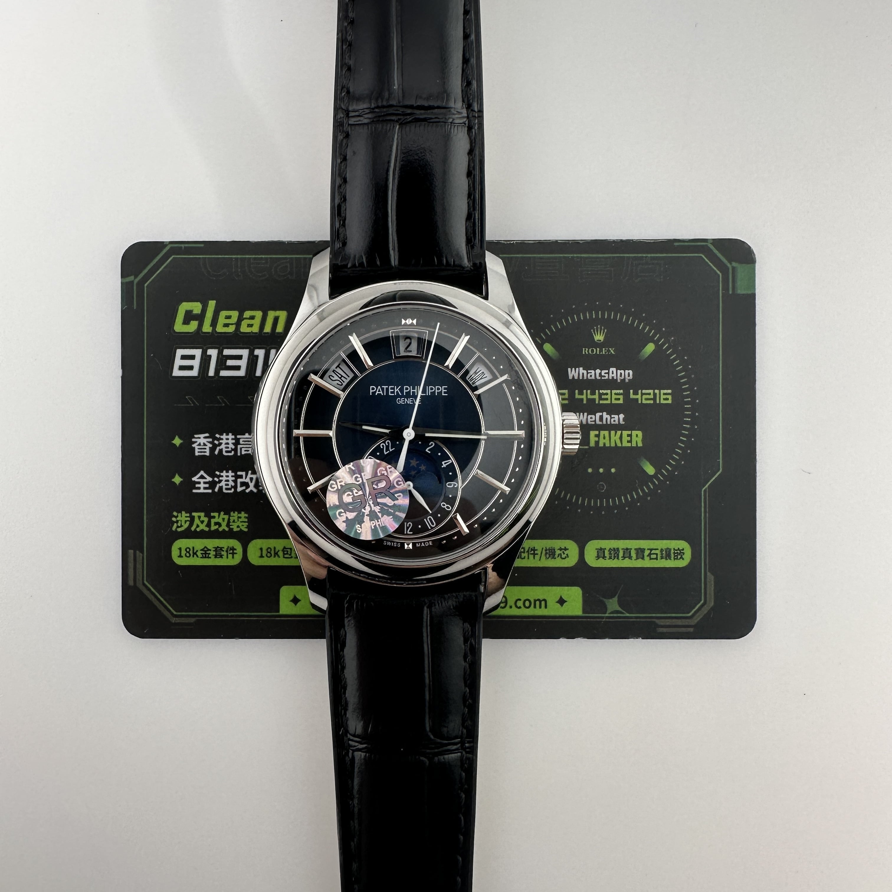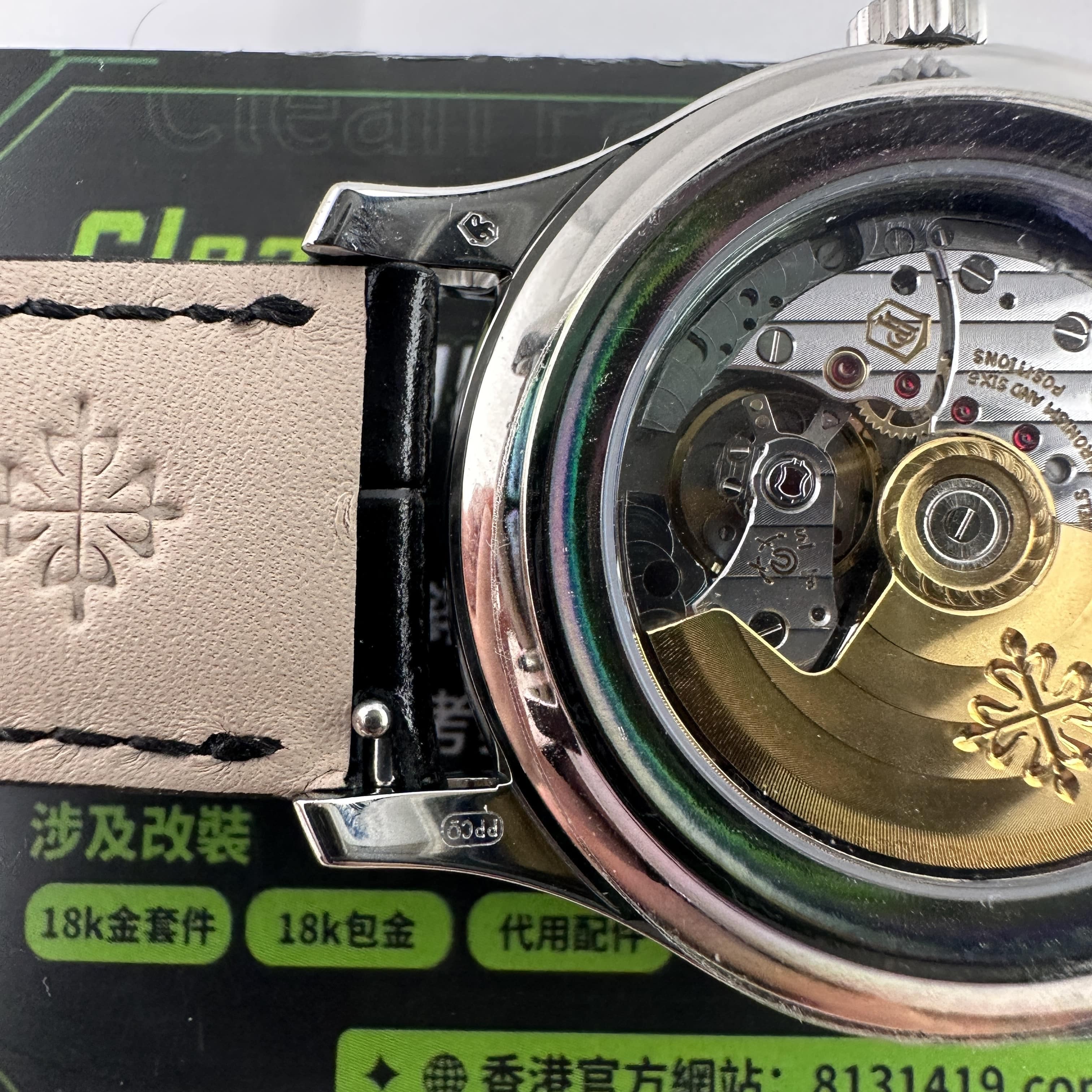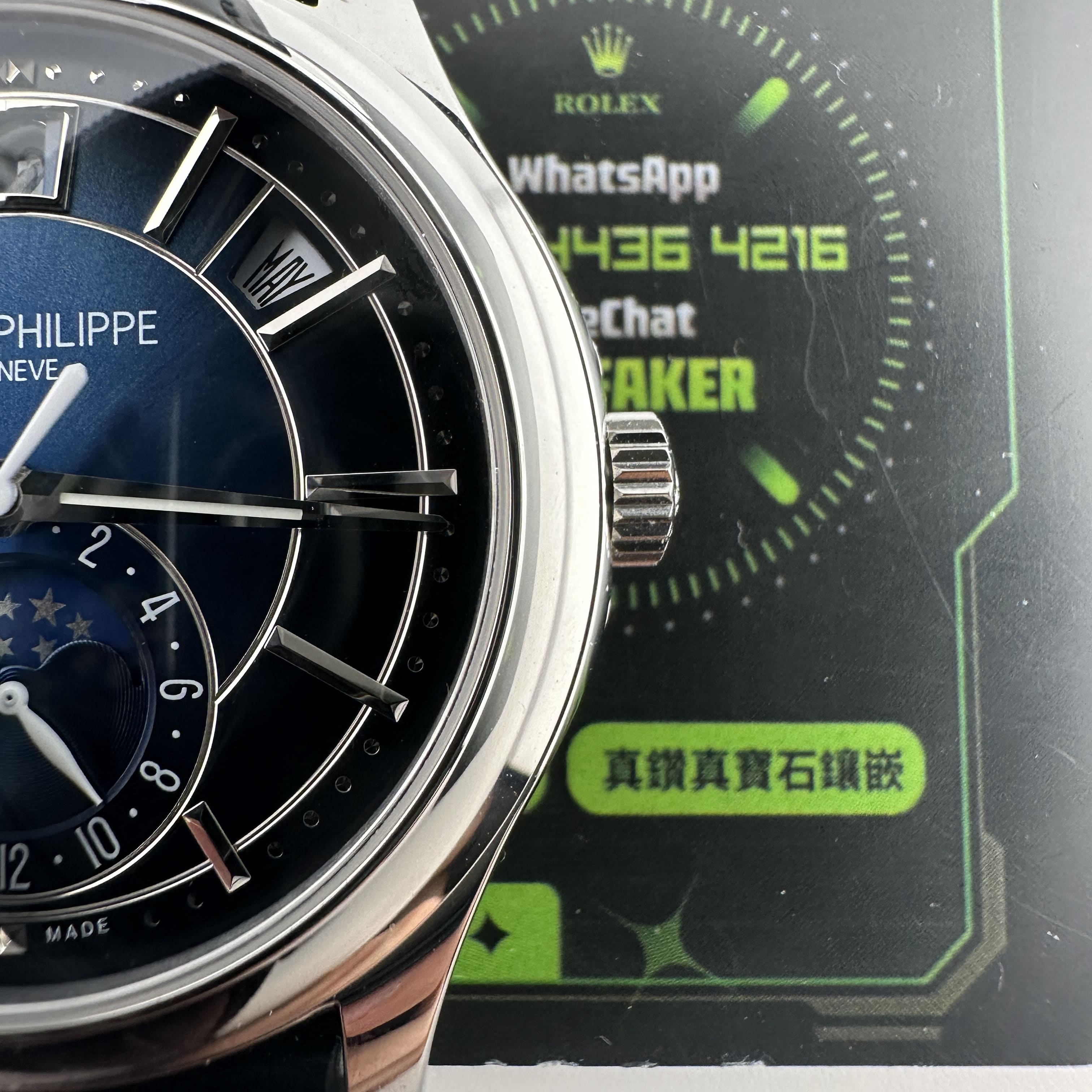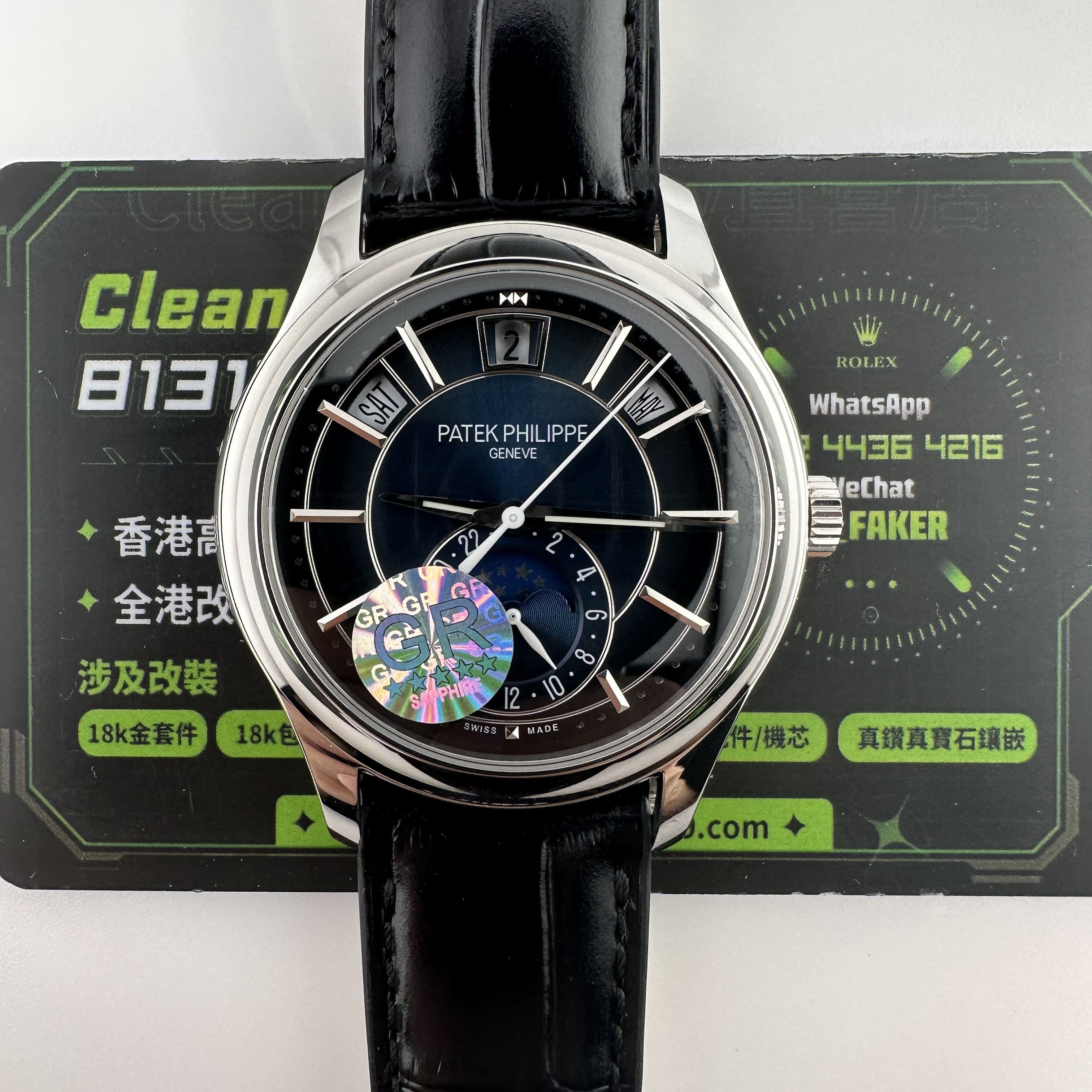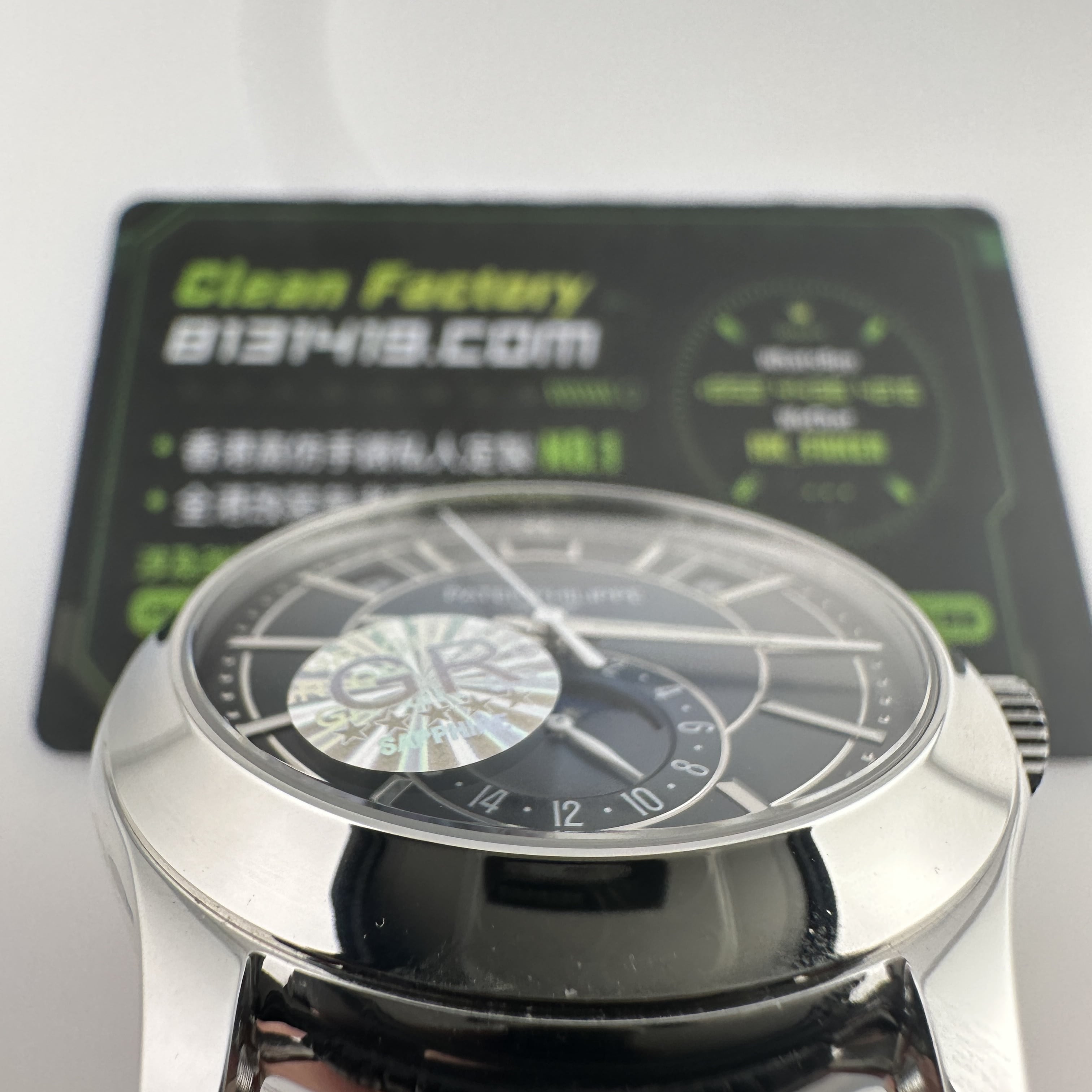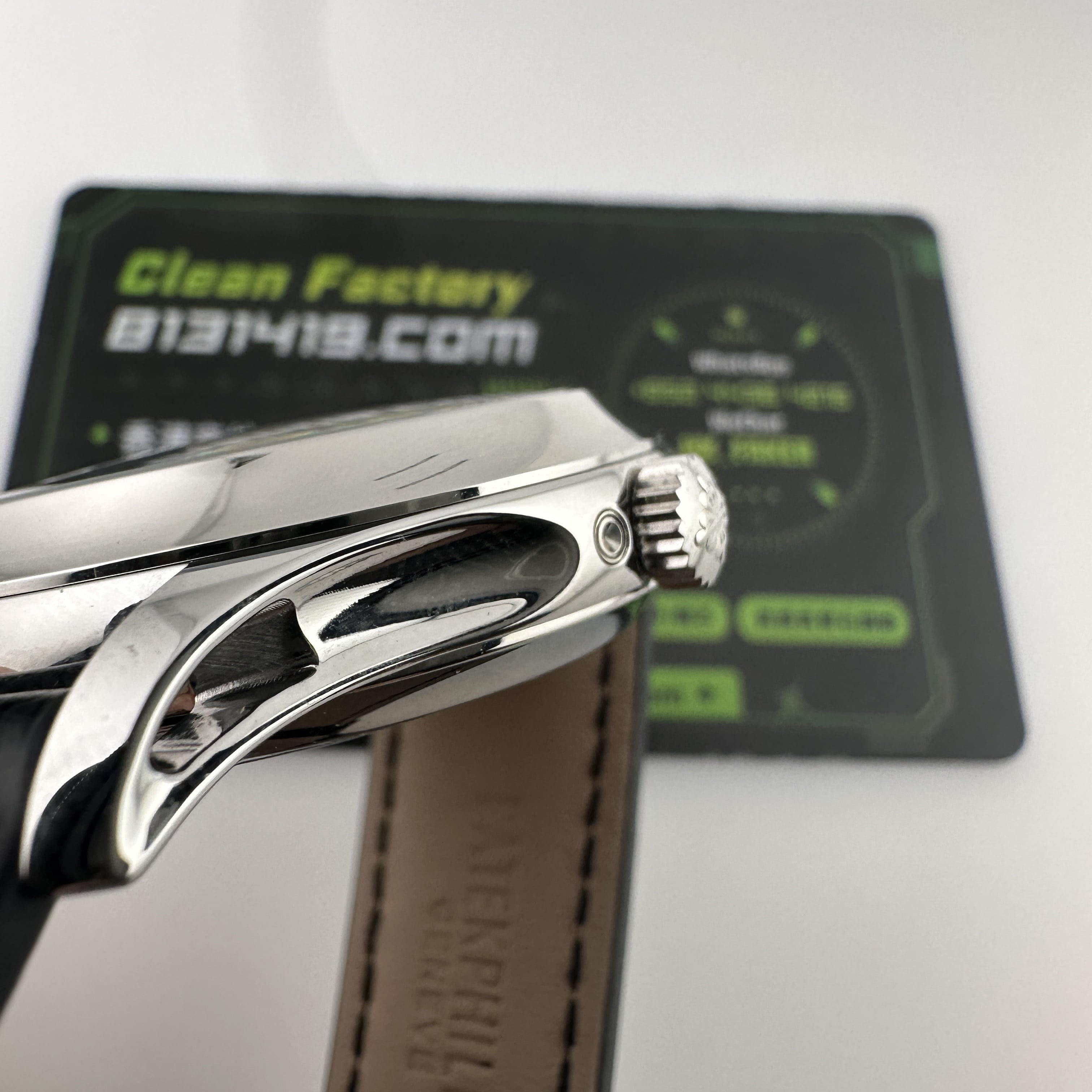 整錶尺寸40mm,厚度11.36mm基本上是同步原版尺寸.錶殼材質使用904L精鋼,外加PVD電鍍工藝達到與原版一致的白金色值,基本無色差! 藍水晶高透鏡片與錶殼貼合部分完全沒有白邊瑕疵.整張黑灰錶盤配備了多功能顯示.一共有5種功能顯示.GR廠PP5205G在功能還原上也是實現一比一還原使用.盤面顯示有日期-星期-月份和年曆顯示,包括月相部分,具體功能使用是通過錶殼四周有功能暗鍵,需要通過頂針調教,每一隻GR廠5205G都會配備.錶帶為小牛皮質純手工縫線,舒適度極致.錶扣可選擇針扣和PP蝴蝶釦.