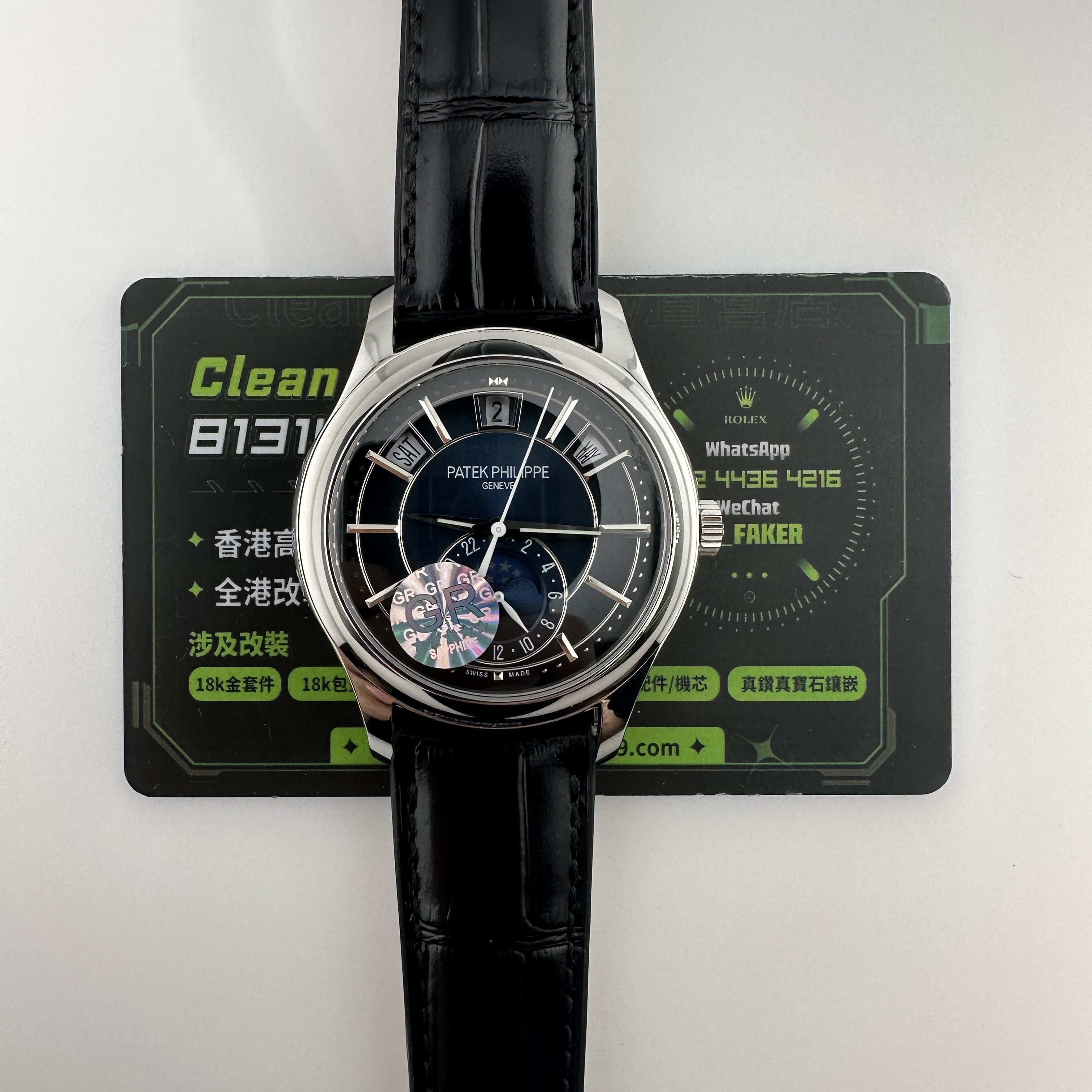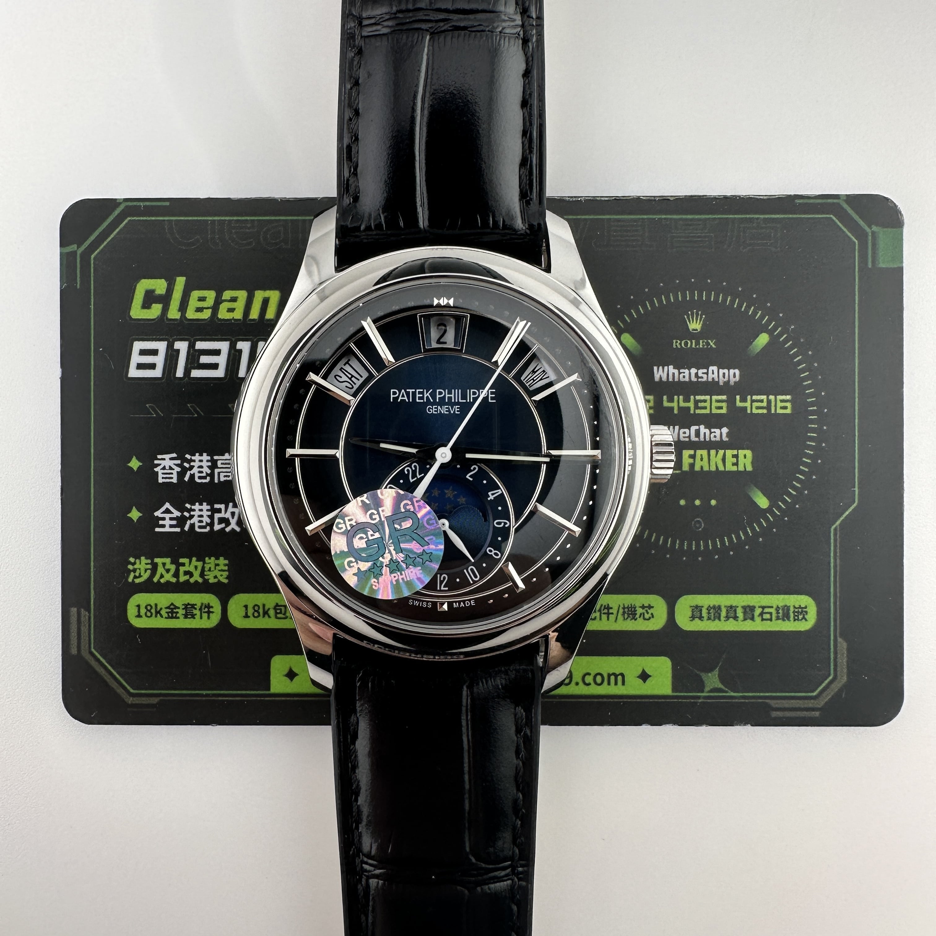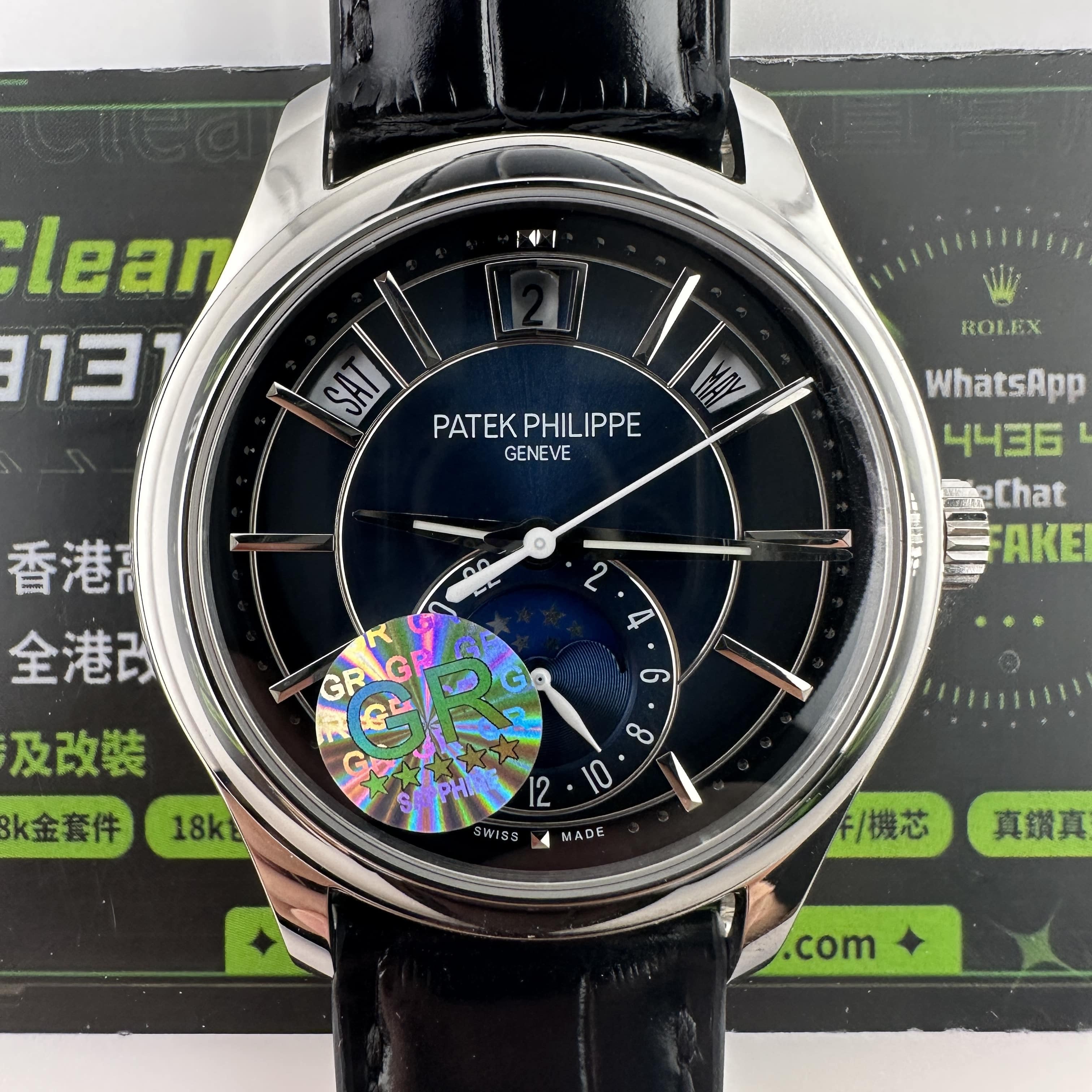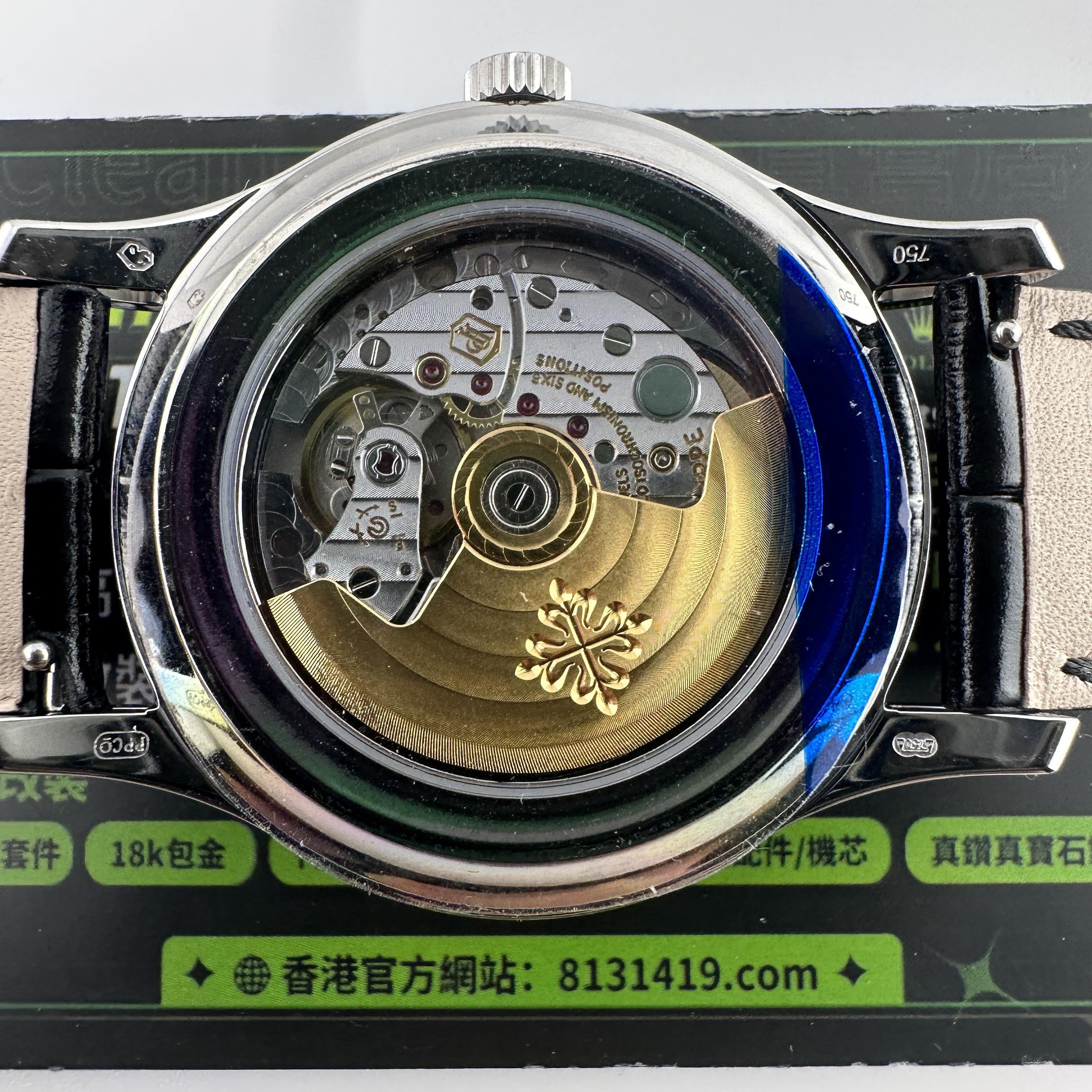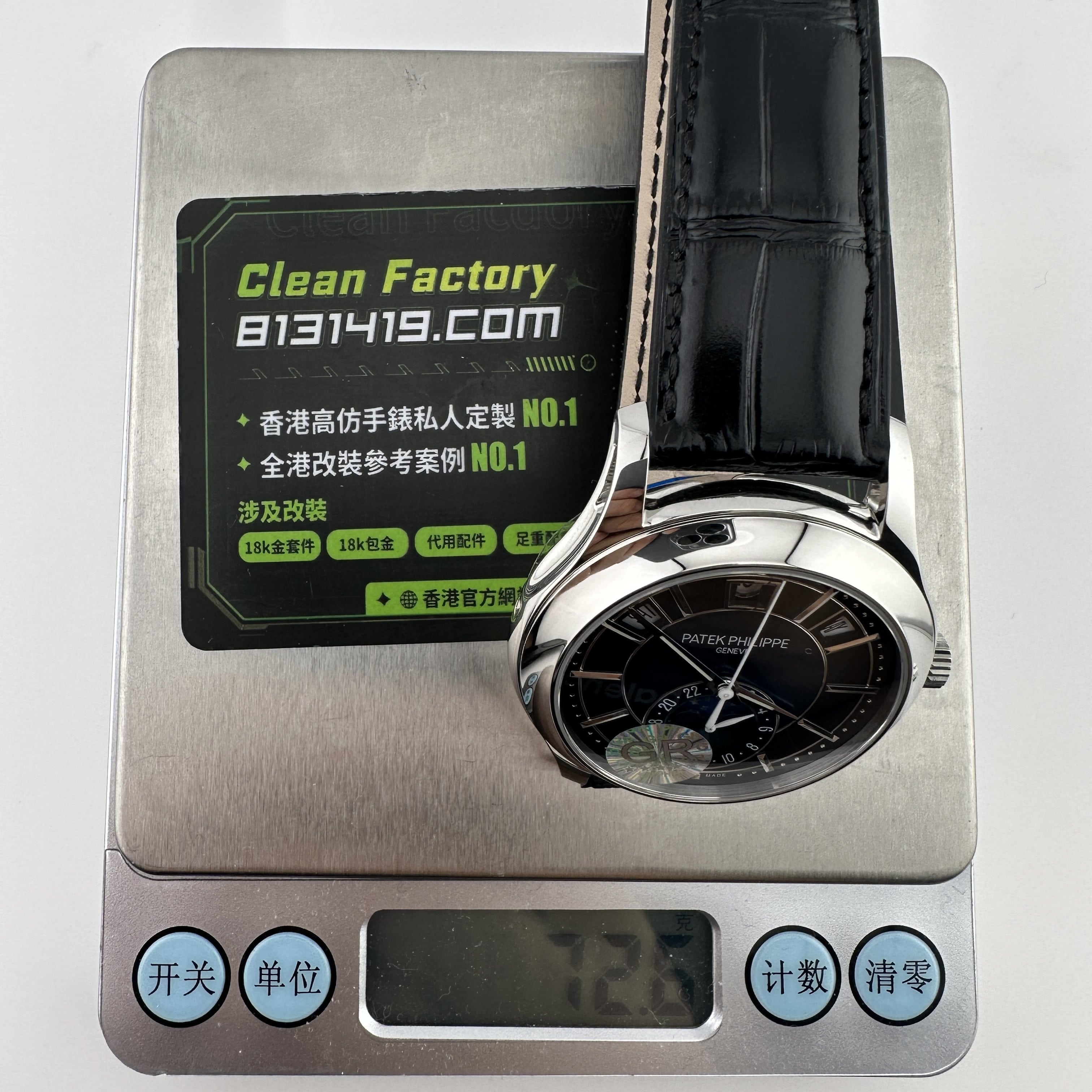 整錶尺寸40mm,厚度11.36mm基本上是同步原版尺寸.錶殼材質使用904L精鋼,外加PVD電鍍工藝達到與原版一致的白金色值,基本無色差! 藍水晶高透鏡片與錶殼貼合部分完全沒有白邊瑕疵.整張黑灰錶盤配備了多功能顯示.一共有5種功能顯示.GR廠PP5205G在功能還原上也是實現一比一還原使用.盤面顯示有日期-星期-月份和年曆顯示,包括月相部分,具體功能使用是通過錶殼四周有功能暗鍵,需要通過頂針調教,每一隻GR廠5205G都會配備.錶帶為小牛皮質純手工縫線,舒適度極致.錶扣可選擇針扣和PP蝴蝶釦.