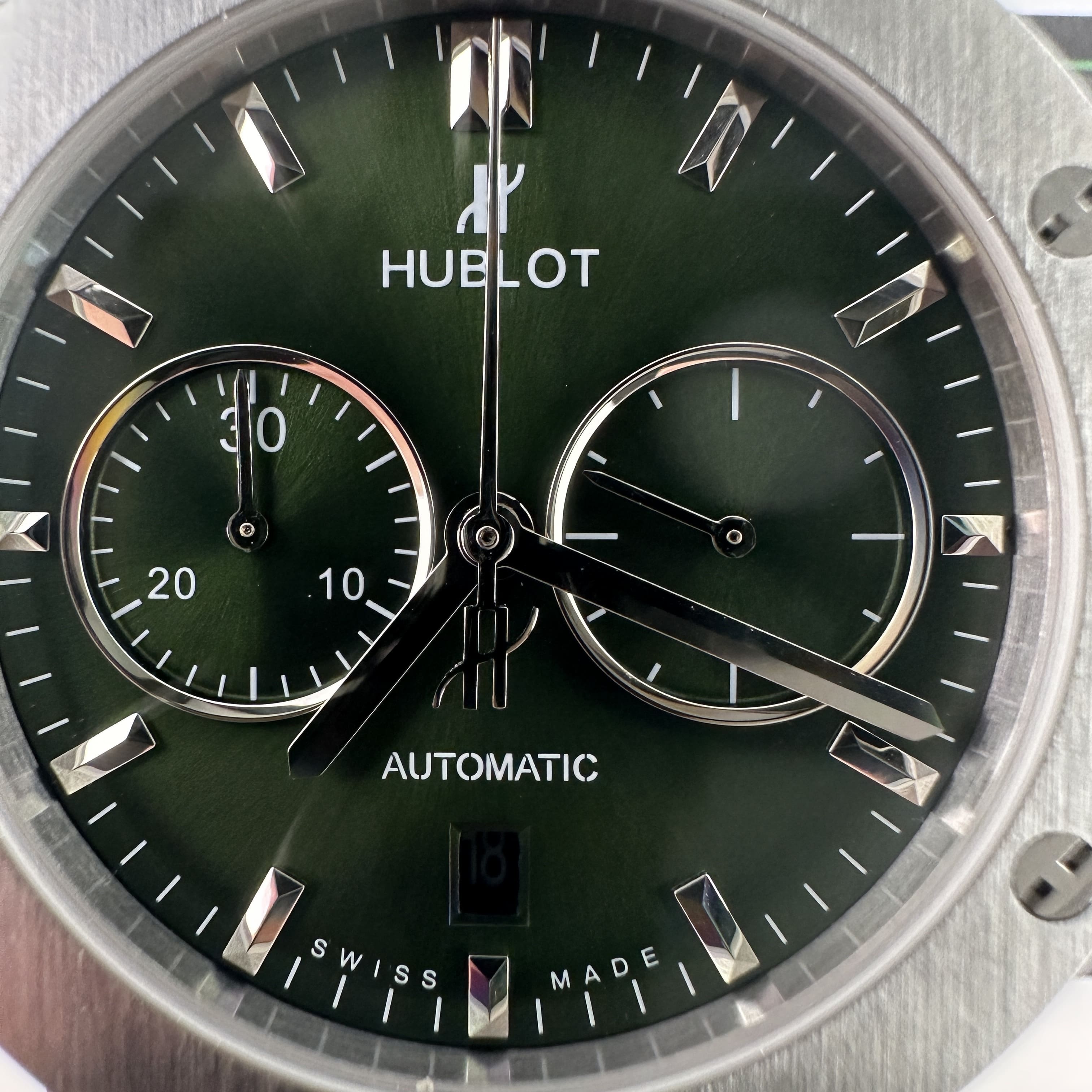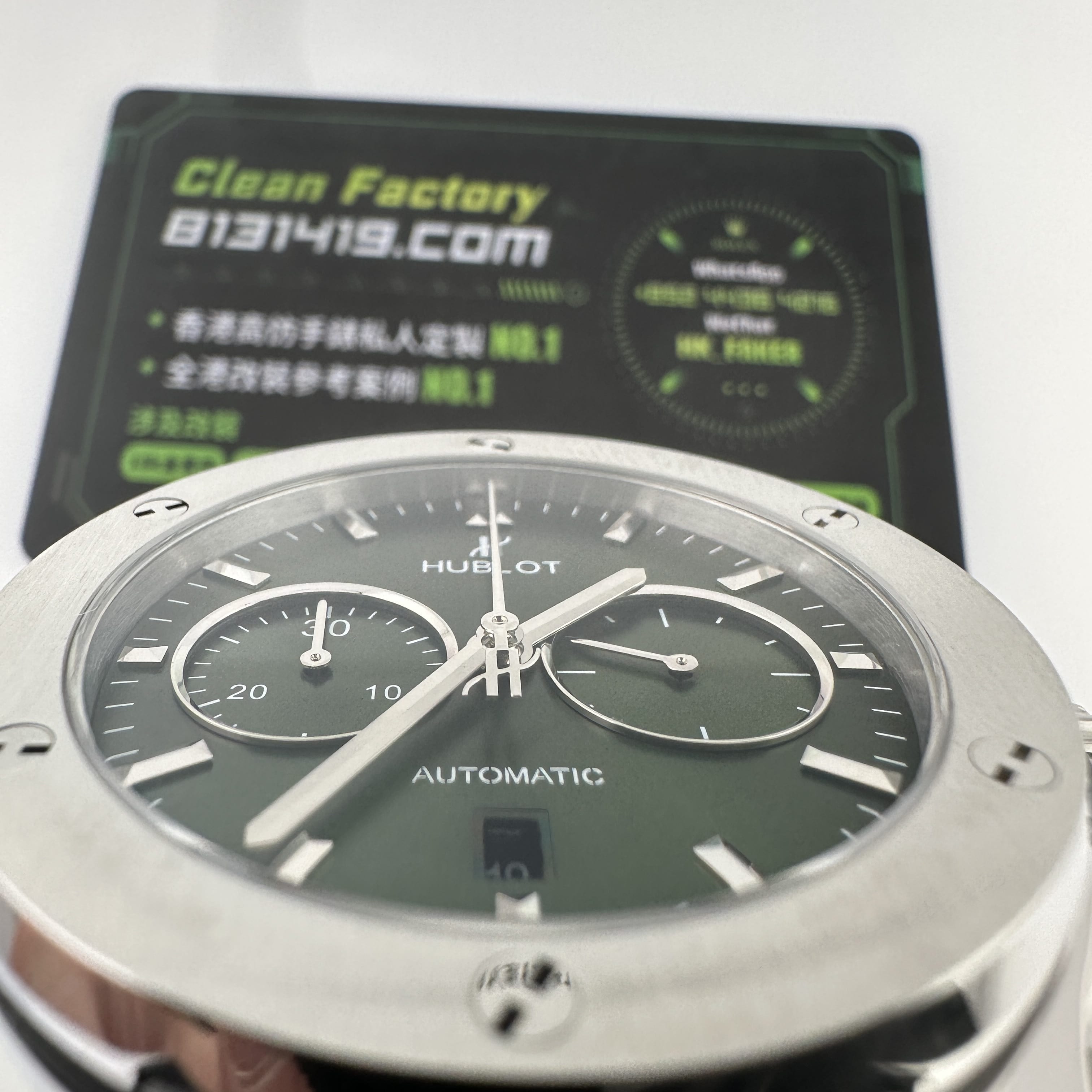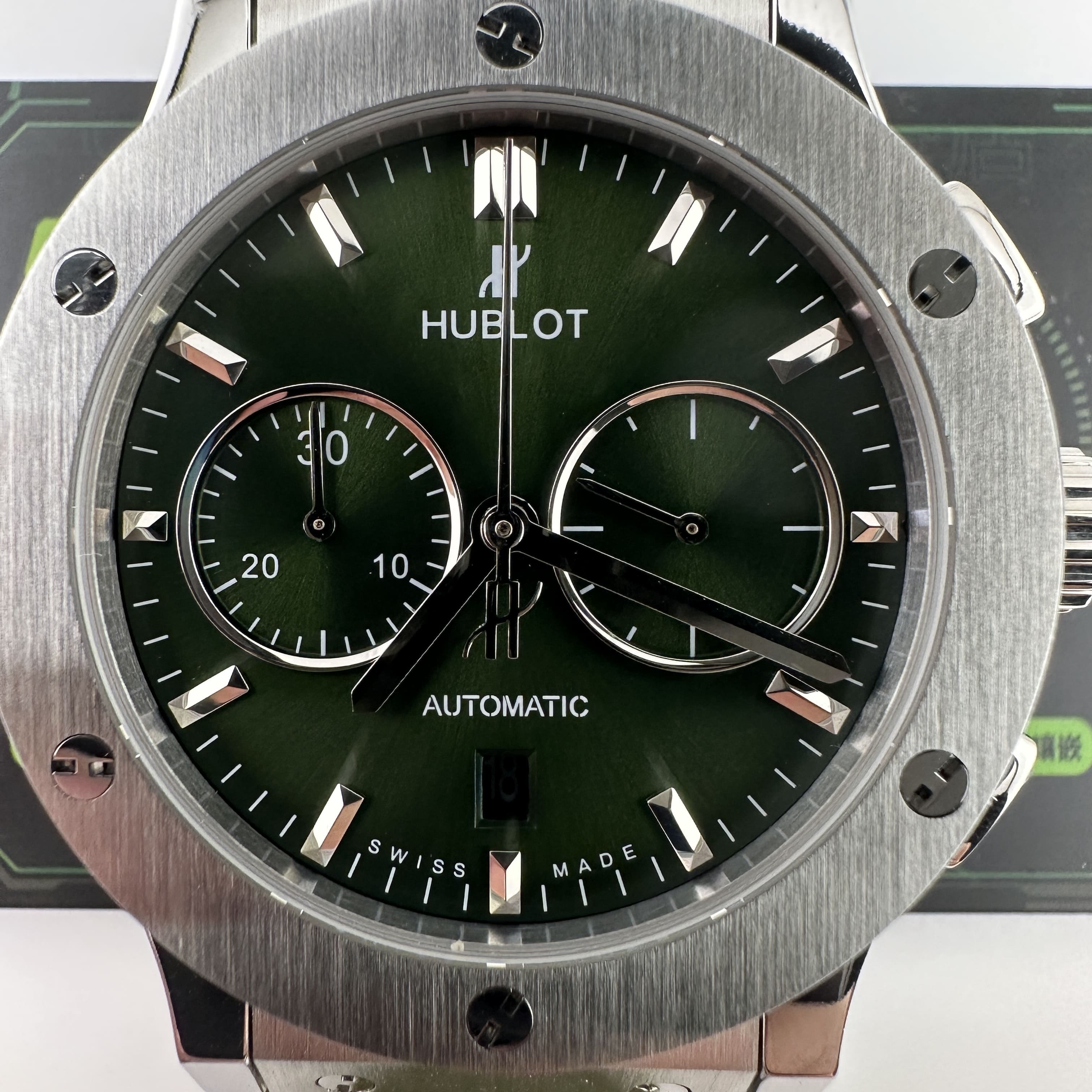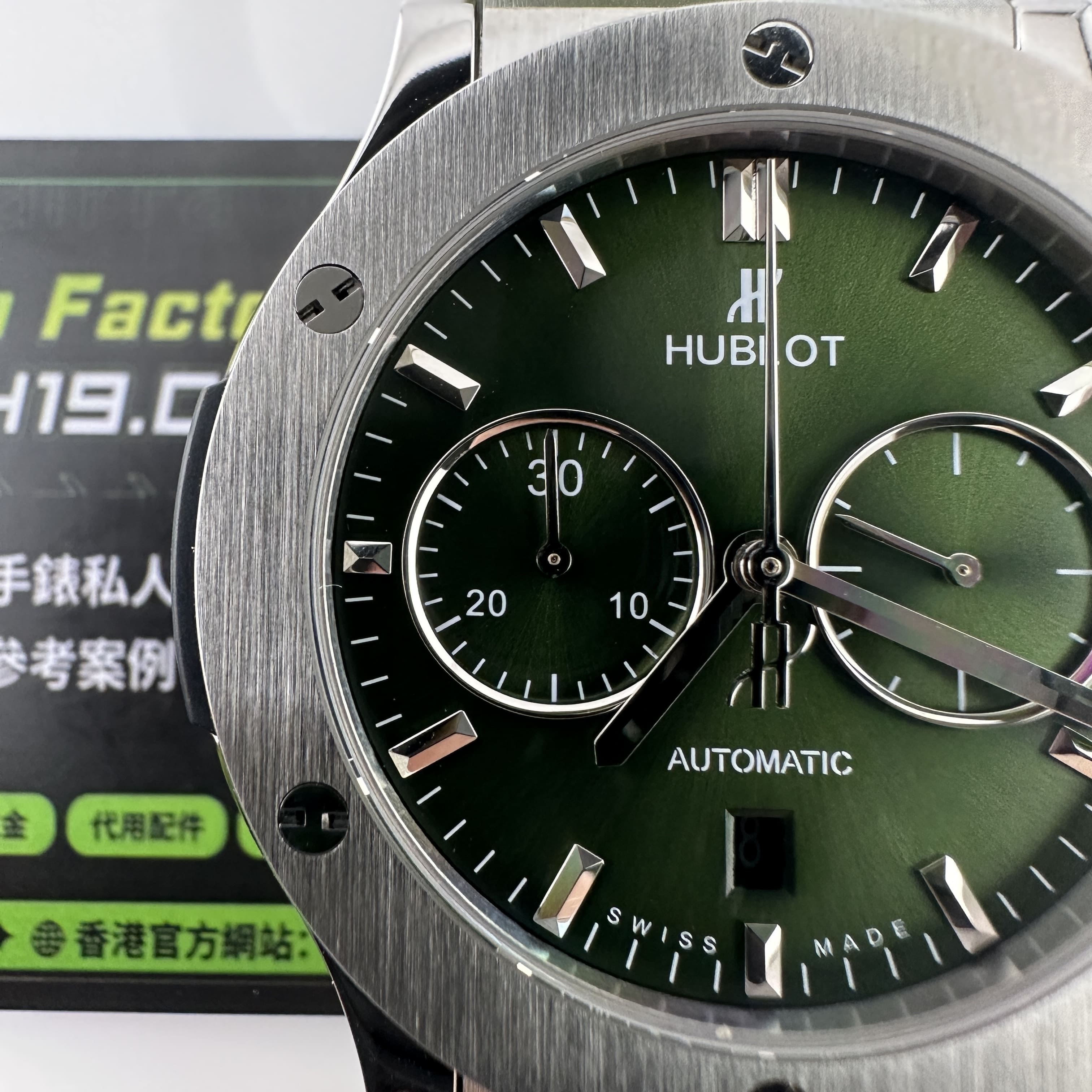 HB廠全新推出HUBLOT經典融合系列計時腕錶,雖然只有30分鐘計時功能卻彰顯了錶盤在功能層面上融入了機械運作魅力.綠色的盤面HB廠宇舶做到了對應的放射紋理,在不同環境光感以及自然光角度中都可以呈現出紋理的自然.指針構造部分是HUBLOT經典的LOGO結尾,純手工打磨的指針沒有夜光效果,但反射角度比較飽滿.包括時間刻度部分的條丁也是使用了金屬材質構造而成.