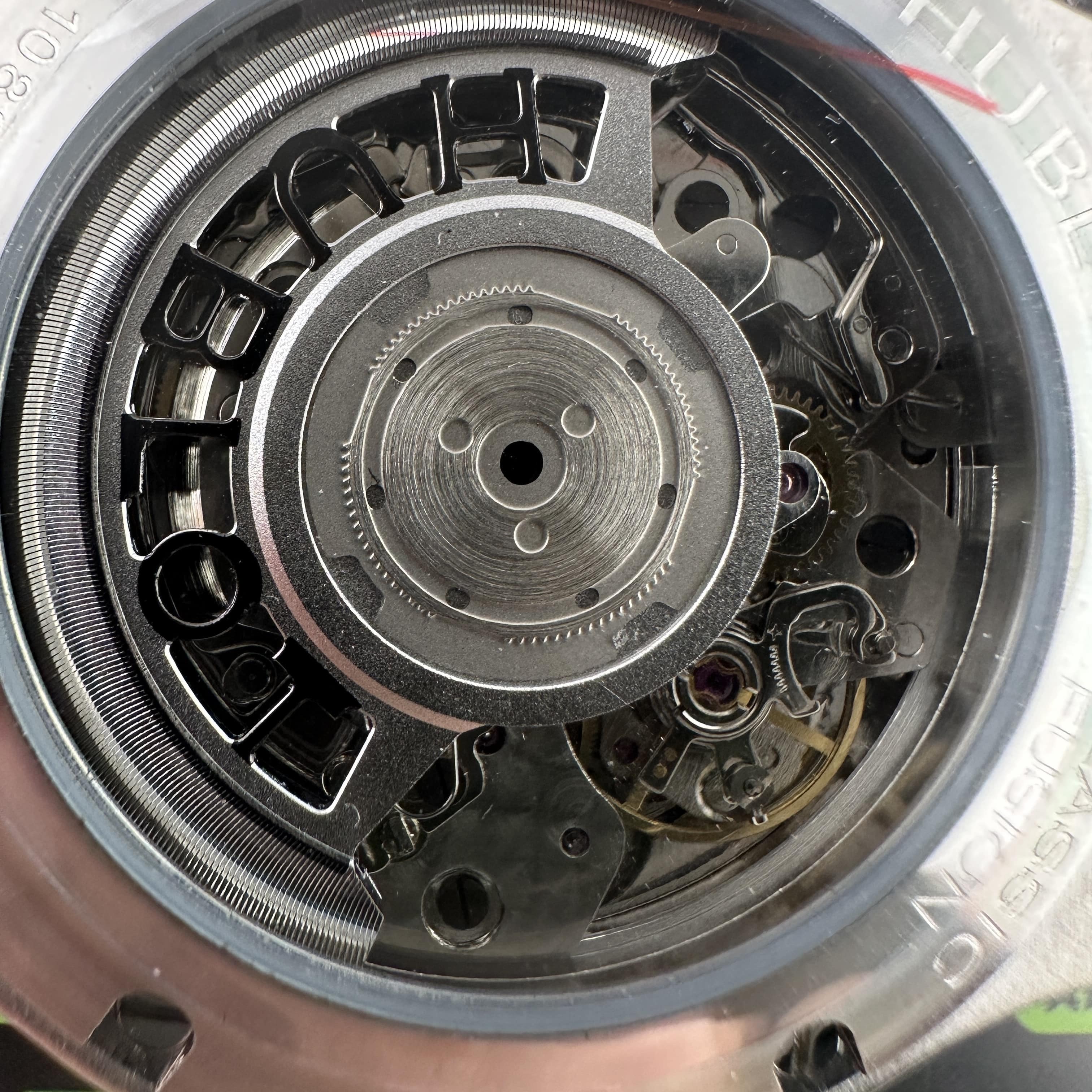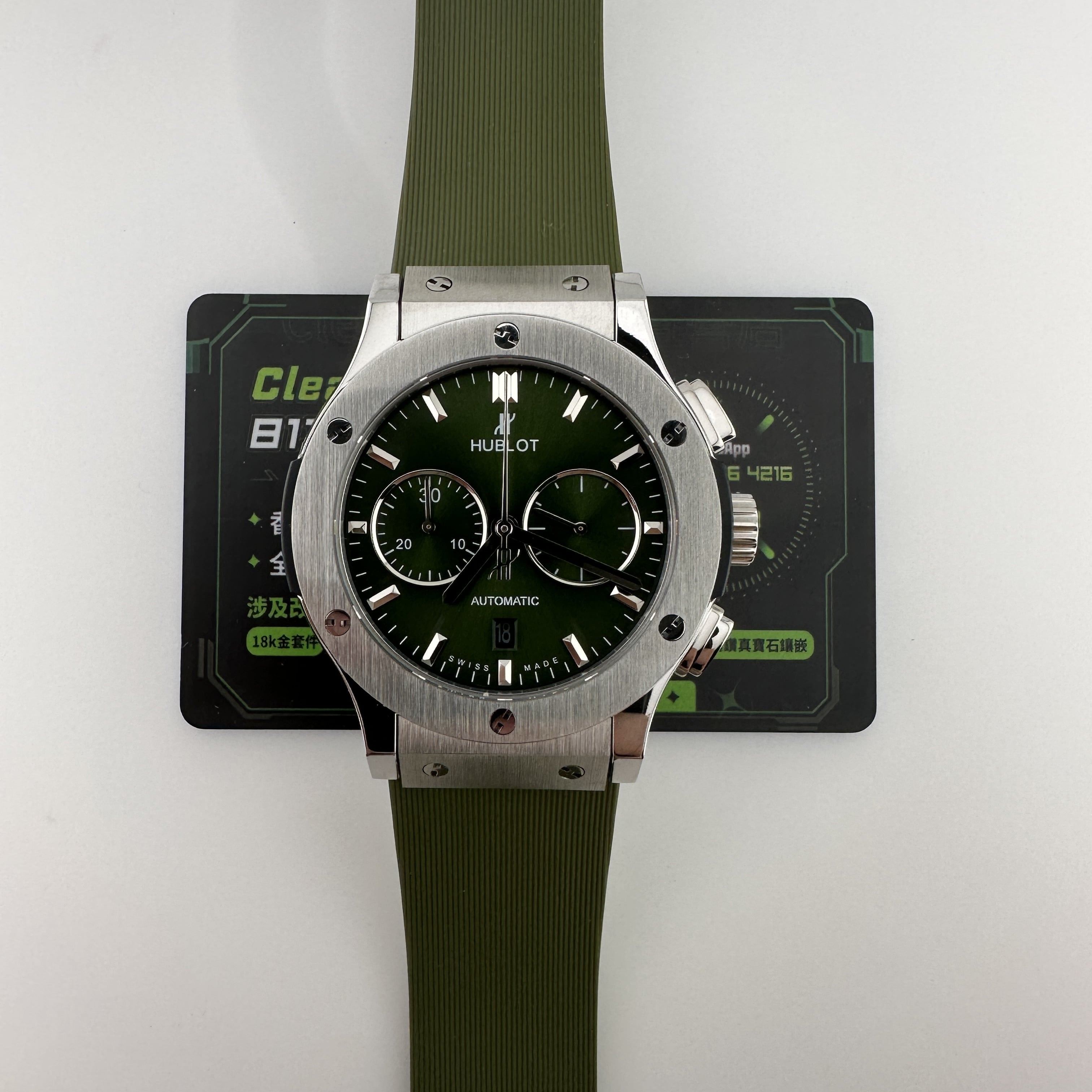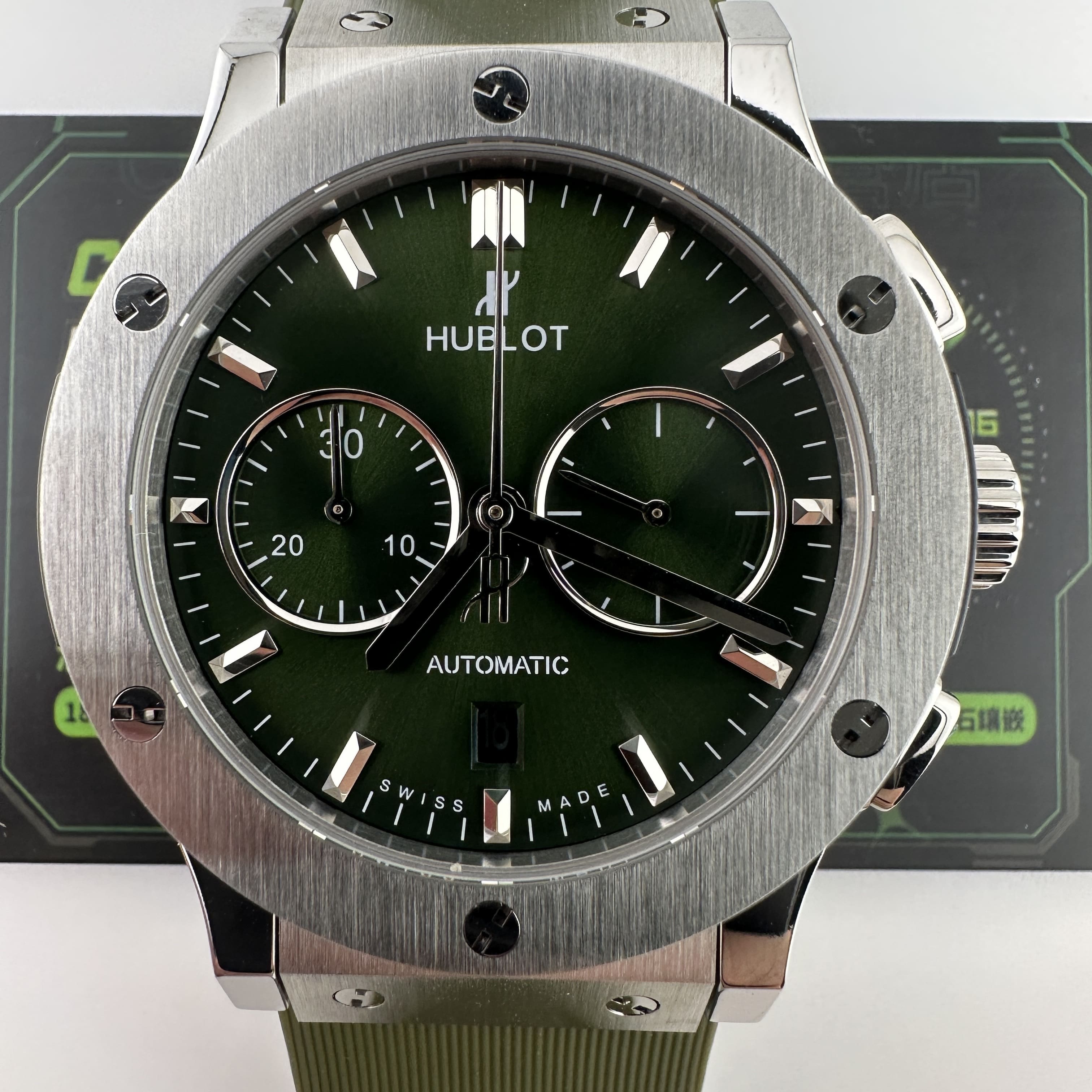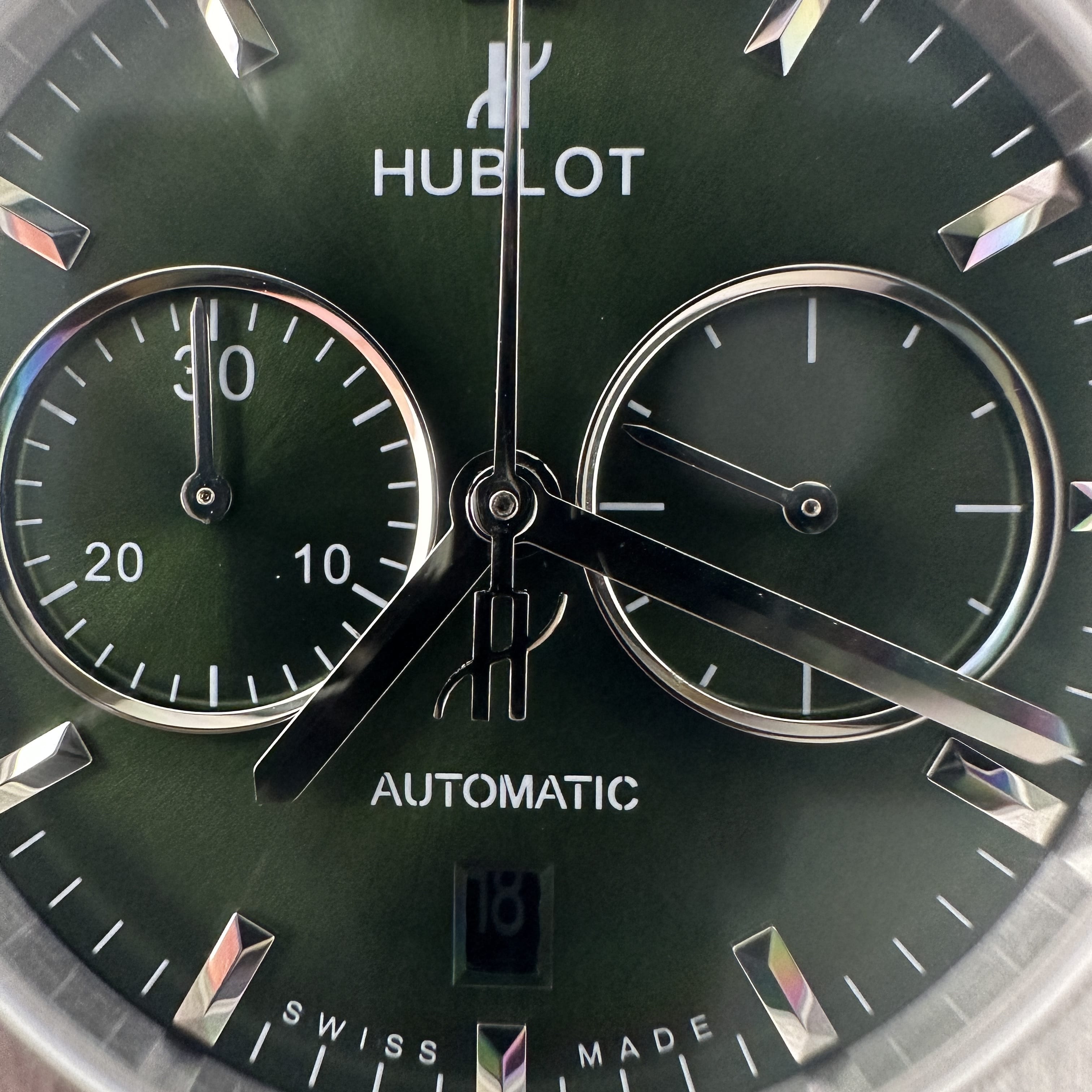 HB廠全新推出HUBLOT經典融合系列計時腕錶,雖然只有30分鐘計時功能卻彰顯了錶盤在功能層面上融入了機械運作魅力.綠色的盤面HB廠宇舶做到了對應的放射紋理,在不同環境光感以及自然光角度中都可以呈現出紋理的自然.指針構造部分是HUBLOT經典的LOGO結尾,純手工打磨的指針沒有夜光效果,但反射角度比較飽滿.包括時間刻度部分的條丁也是使用了金屬材質構造而成.