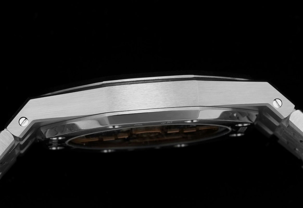 KM—超級力作皇家橡樹15202腕表尺寸39mm超級兩針機械機芯藍寶石水晶玻璃鏡面原版Cal. 2121自動機芯。 錶殼緞面和拋光潤飾完美相融錶帶側面的倒角一致性高,每一節錶帶都保持統一的角度。 防眩光處理藍寶石水晶玻璃鏡面原版Cal. 2121自動機芯夾板倒角,螺絲頭拋光,日內瓦條紋-提供動力儲備長達40小時。
